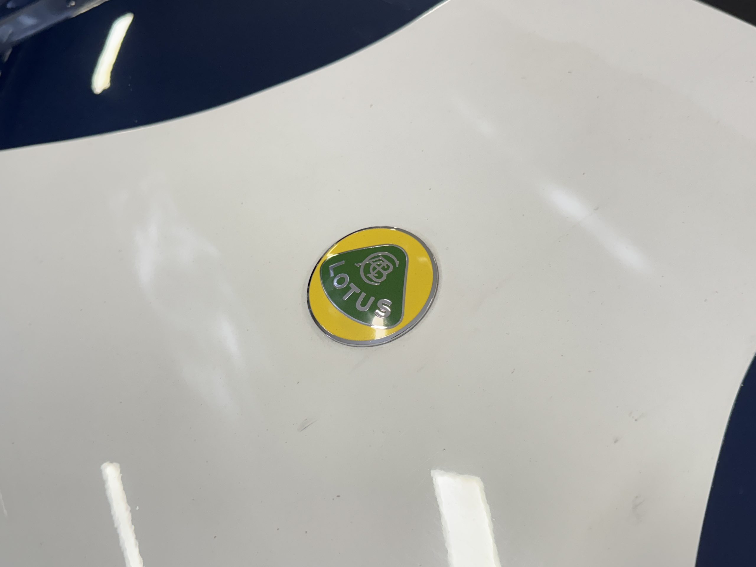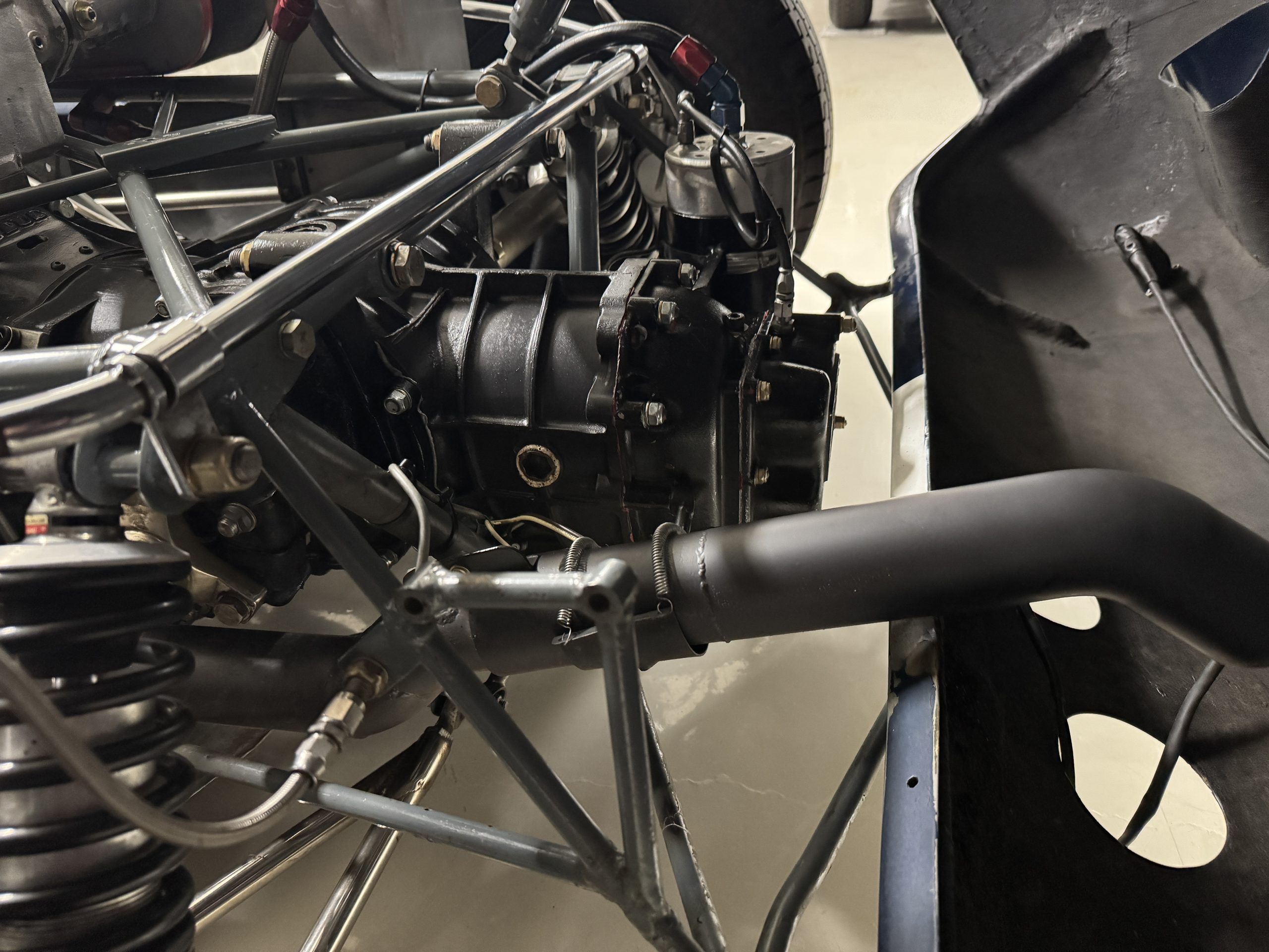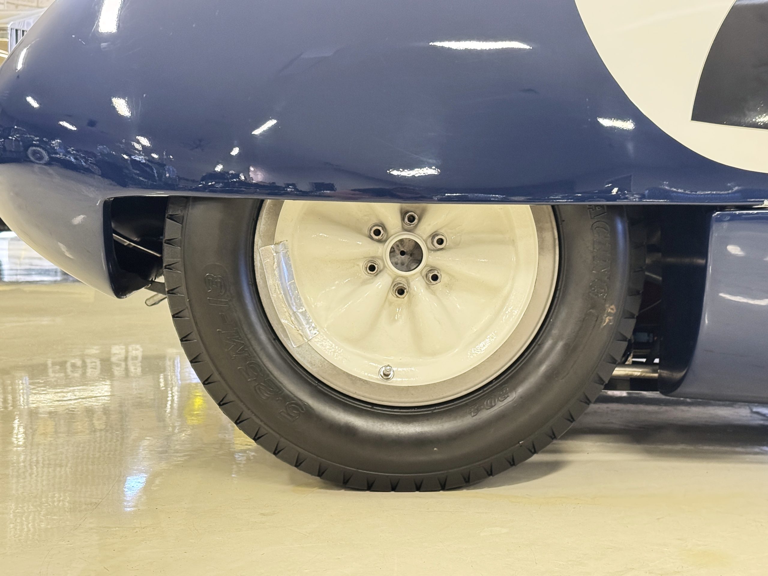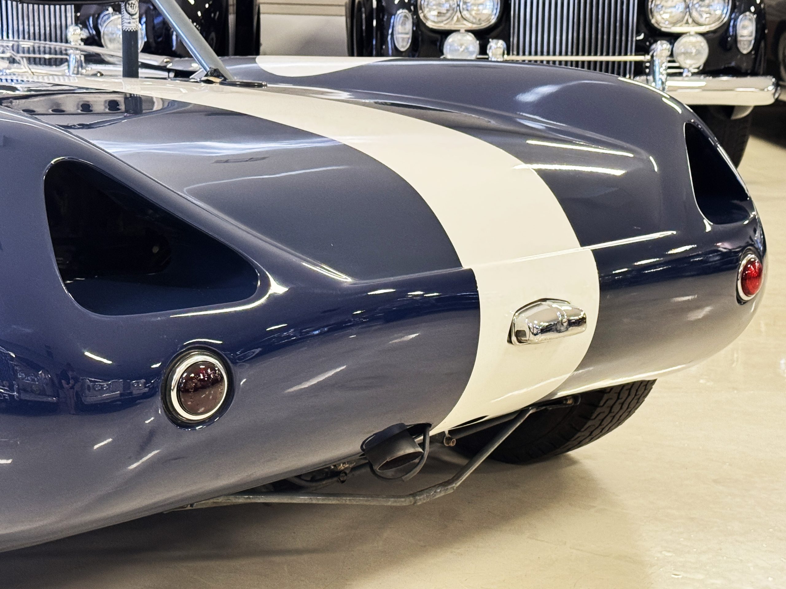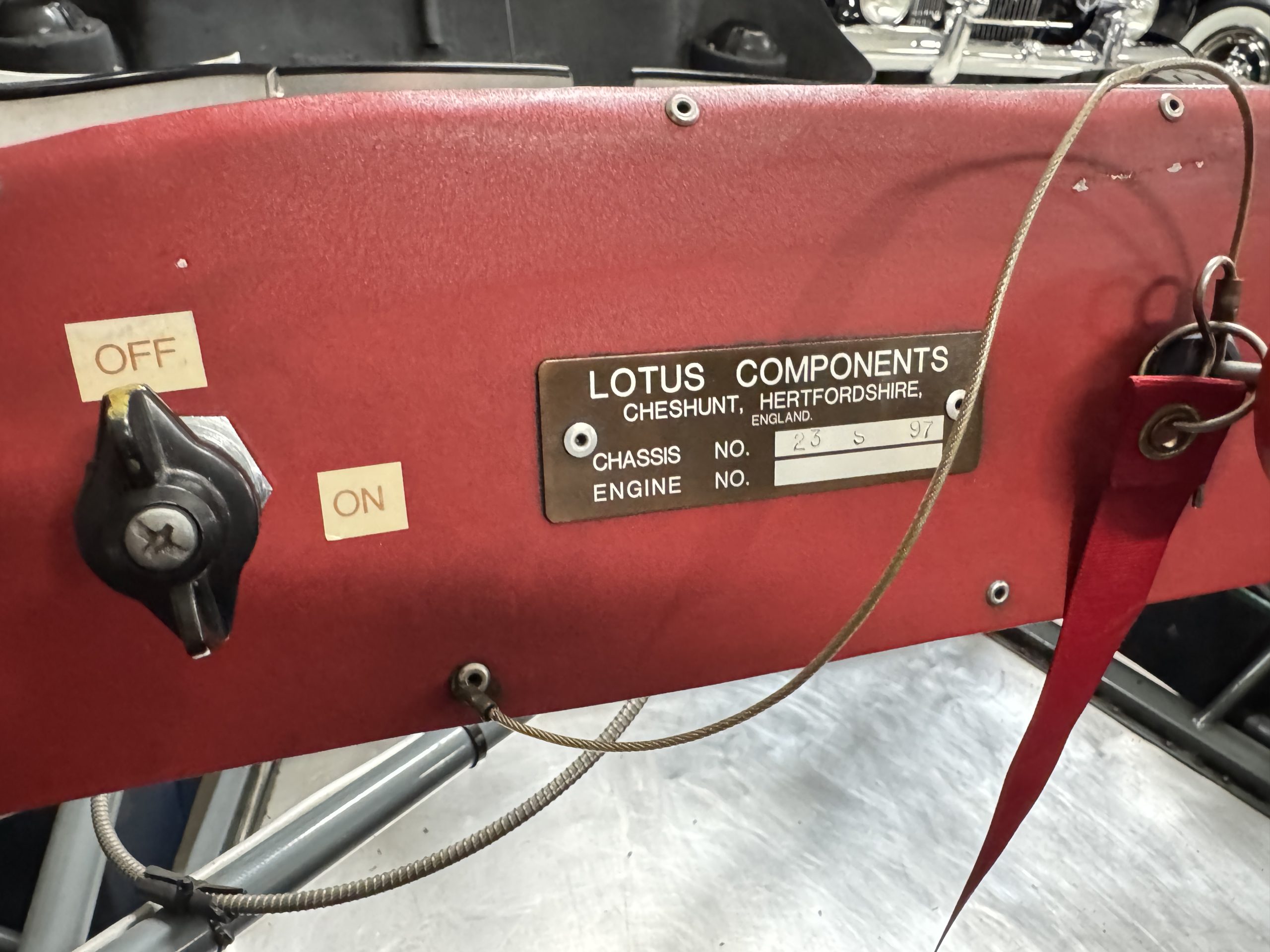 Inside, the Lotus retains its original minimalist focus on function. The right-hand-drive cockpit features a single black carbon fiber racing bucket seat with a five-point harness alongside a dark blue upholstered passenger seat in period correct presentation, functional Smiths instrumentation, a Hobbs engine hour meter, and a right-mounted gear lever, all configured for balance and immediate feedback. The simplicity of the cockpit underscores the Lotus’ singular purpose: connecting driver to machine with no excess. Dual side mirrors and a three-point chrome roll bar with an integrated dark blue headrest provide both practicality and safety without detracting from the period-correct presentation.