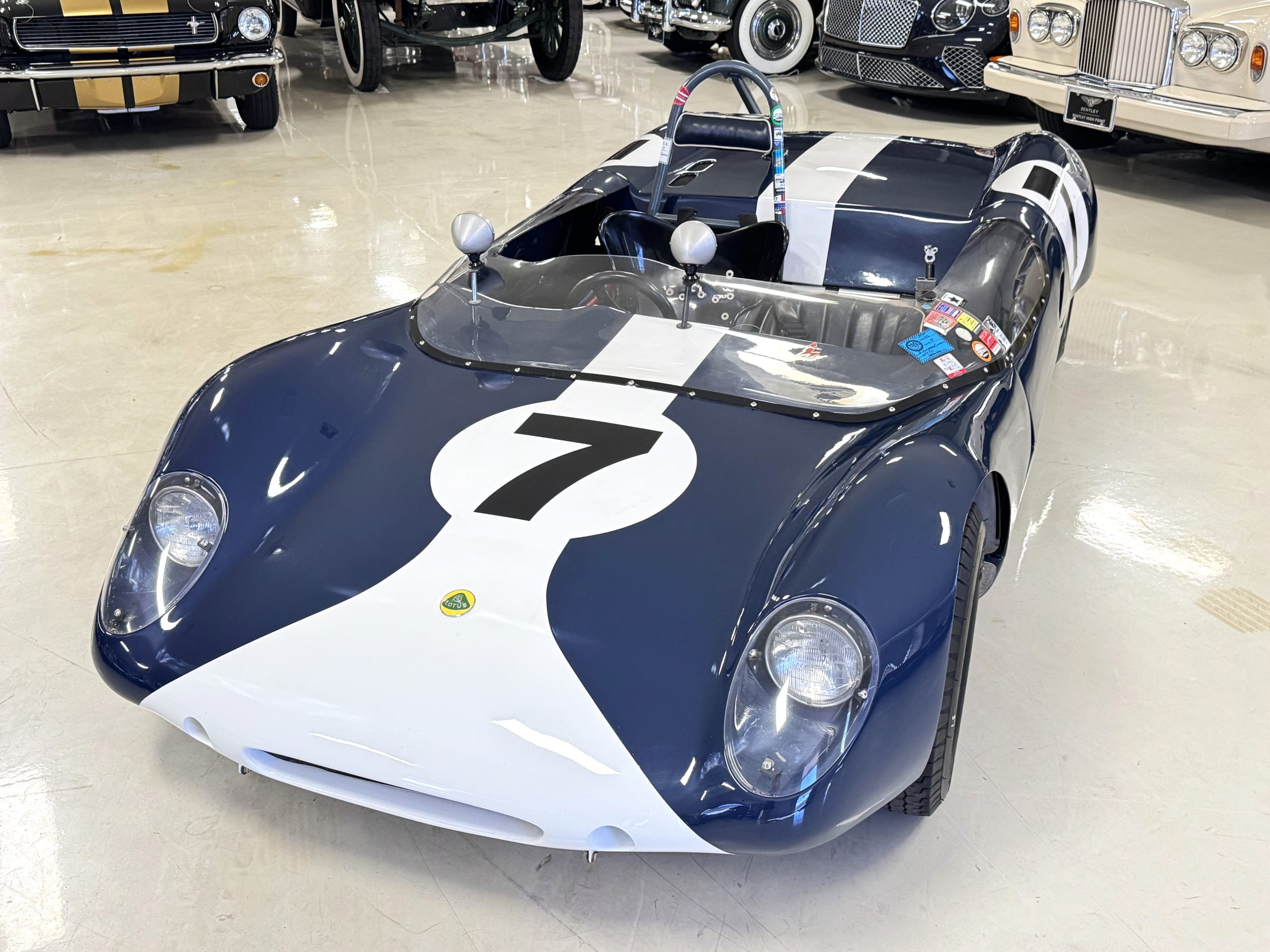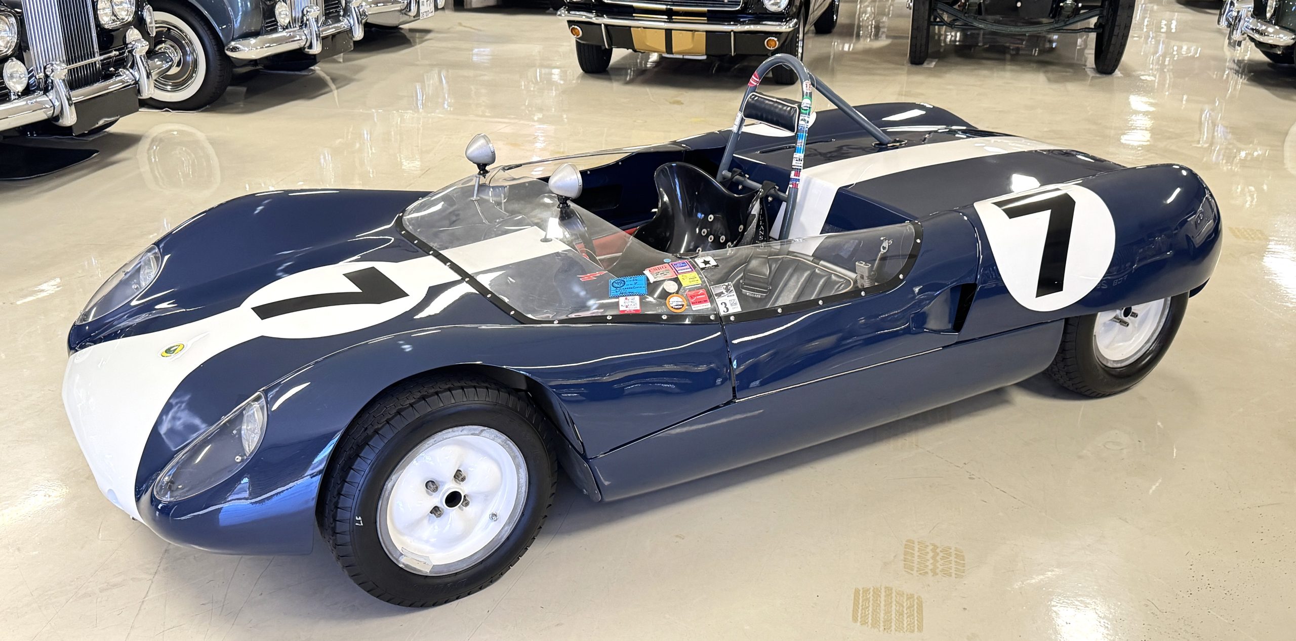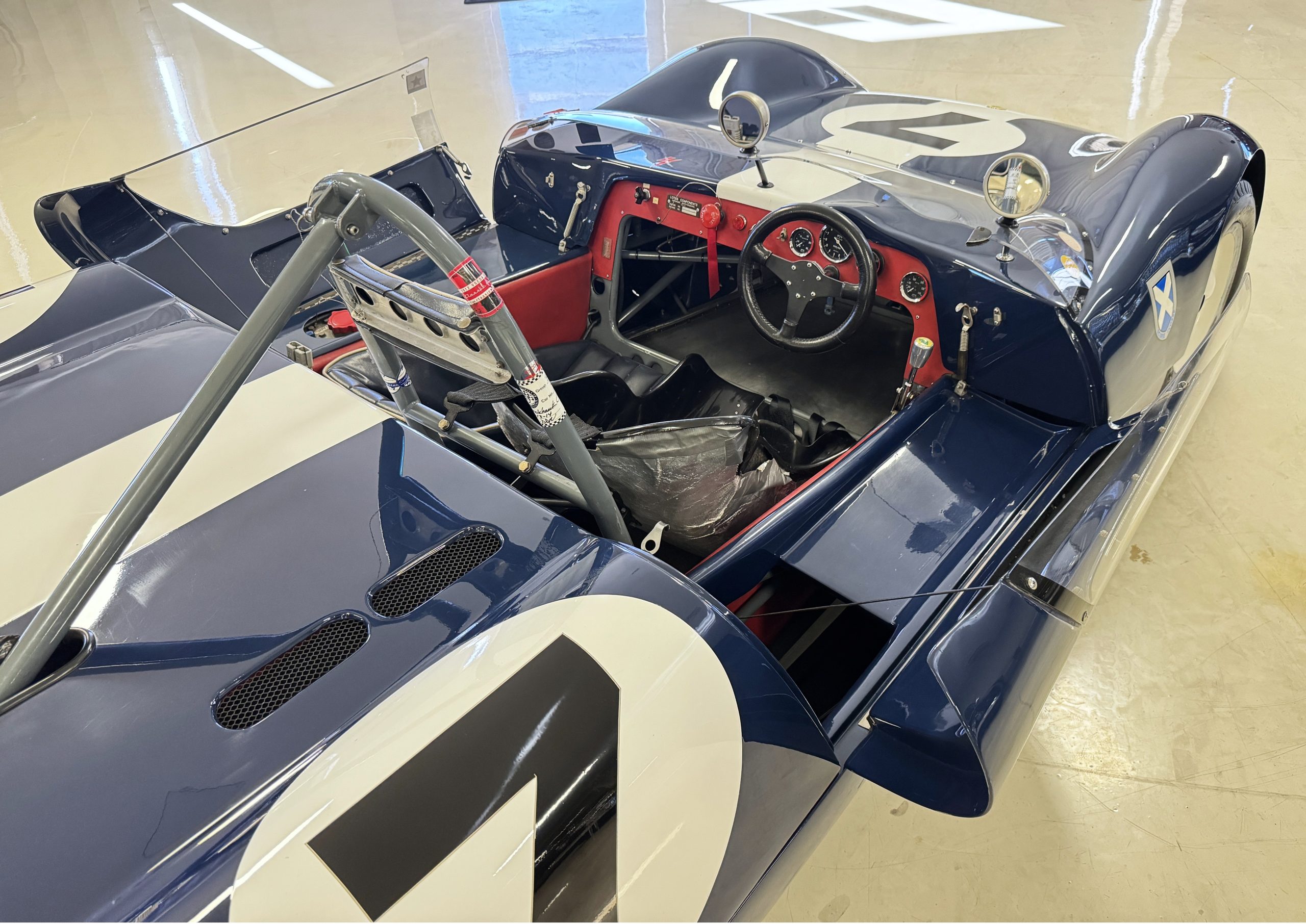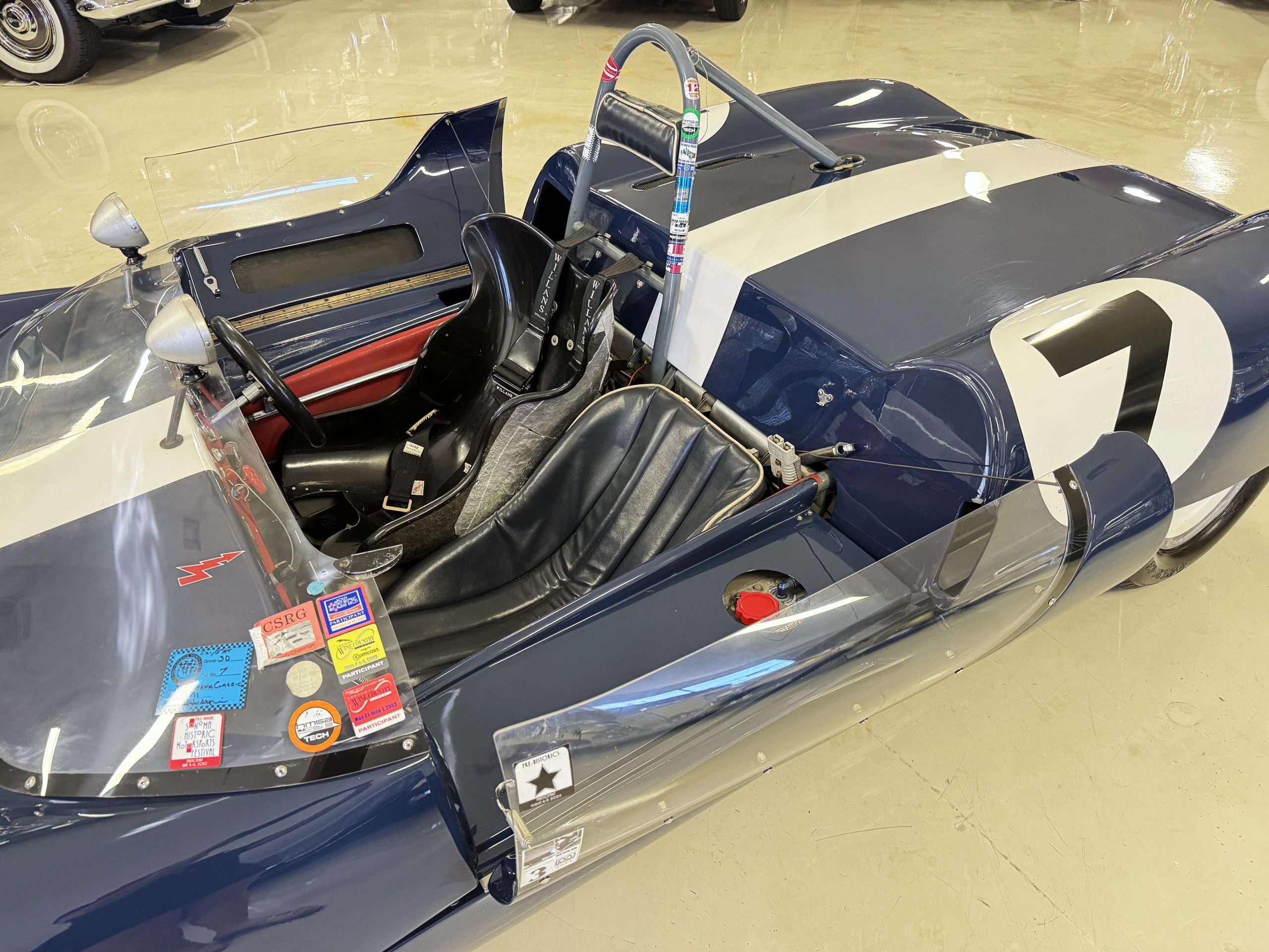 The exterior presents in vivid Dark Blue, accented by a wide central white stripe and racing number “7,” immediately recognizable in the paddock and on track. The color-infused fiberglass body remains in excellent condition, with securely fitted panels over the lightweight spaceframe chassis. The Lotus’ bodywork design is both elegant and purposeful: large front and rear sections hinge open for full mechanical access, while the low-profile doors blend seamlessly with the wrap-around windscreen. A collection of historic race event decals on the windscreen and roll bar reflects the car’s active participation in significant motorsport gatherings, reinforcing its authenticity. Completing the period look are the distinctive 13-inch white Wobbly Web wheels, fitted with four lugs up front and six at the rear, true to Chapman’s original configuration.