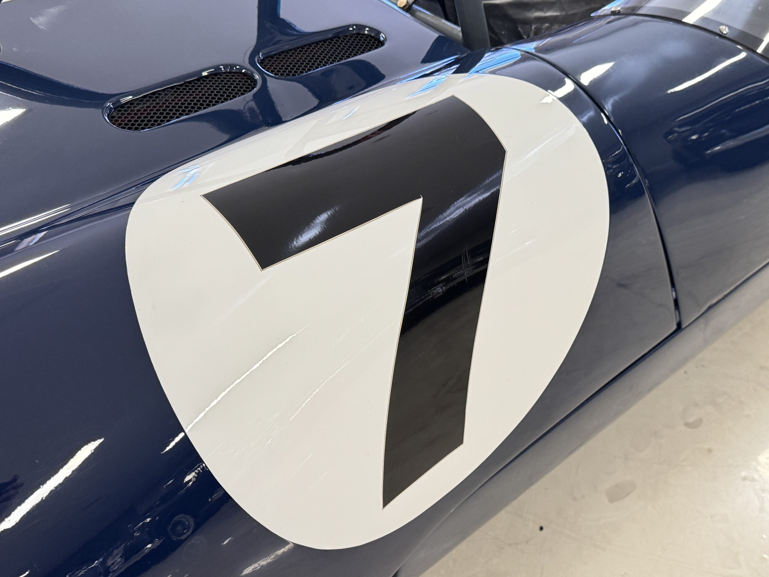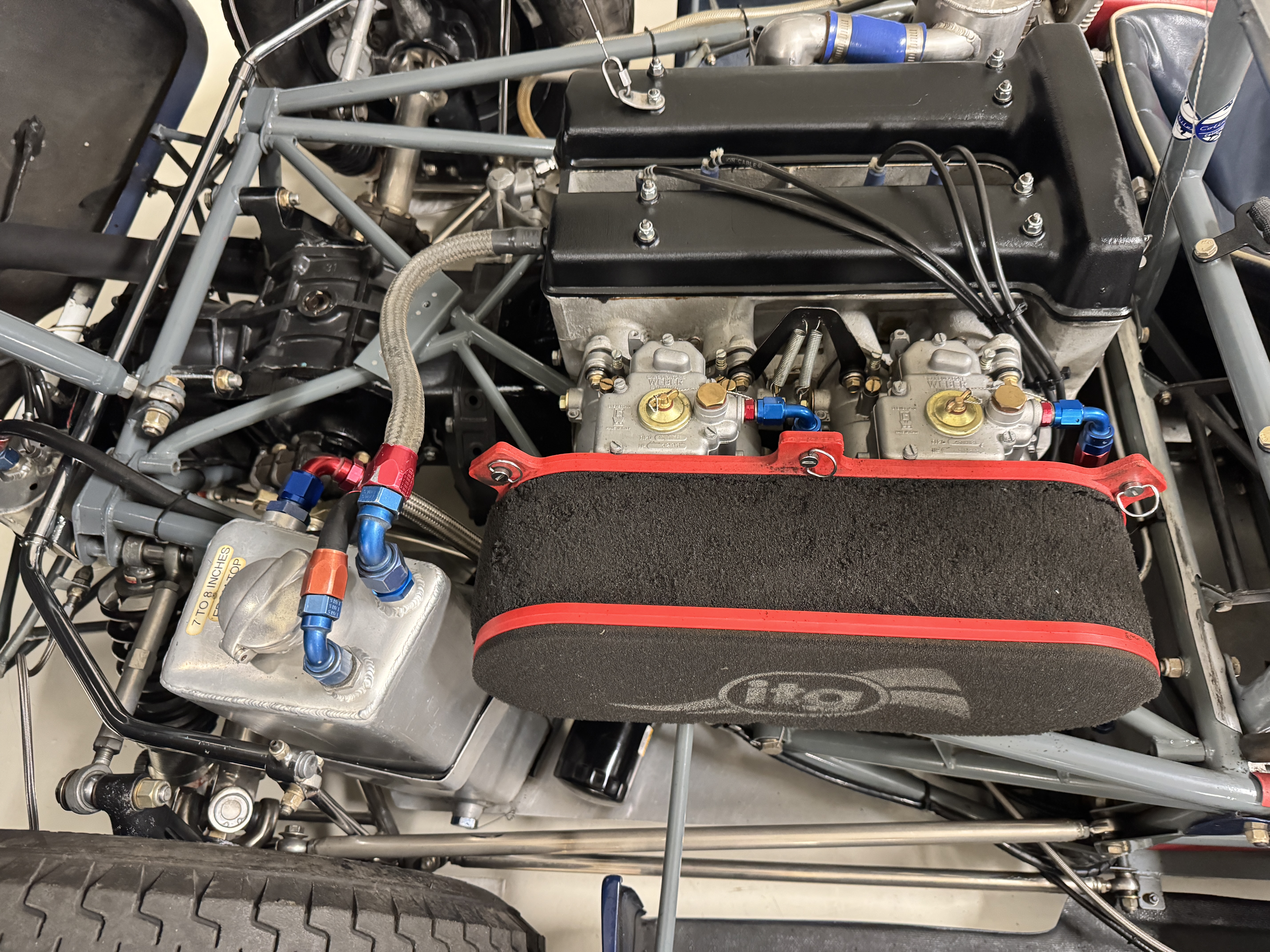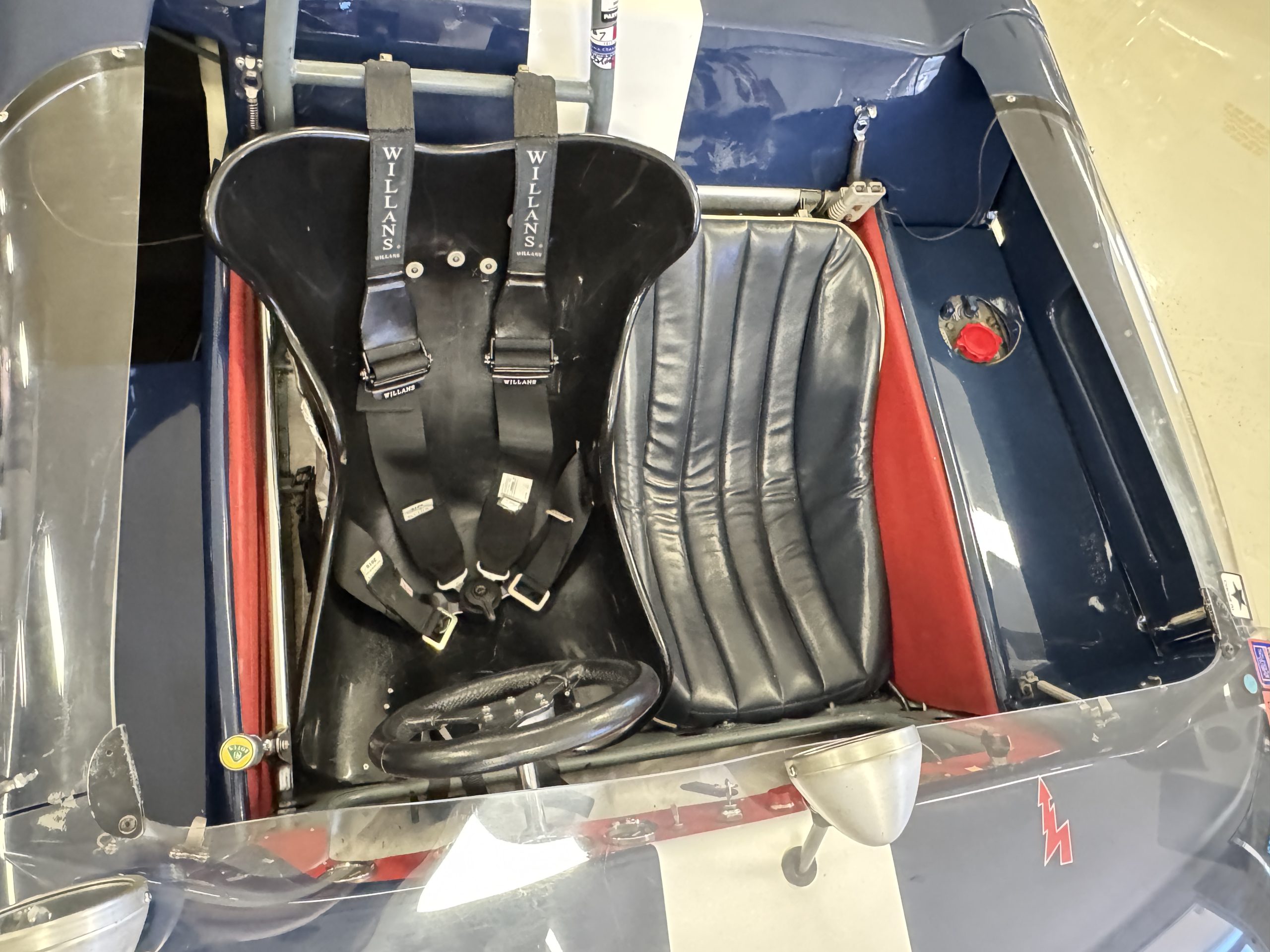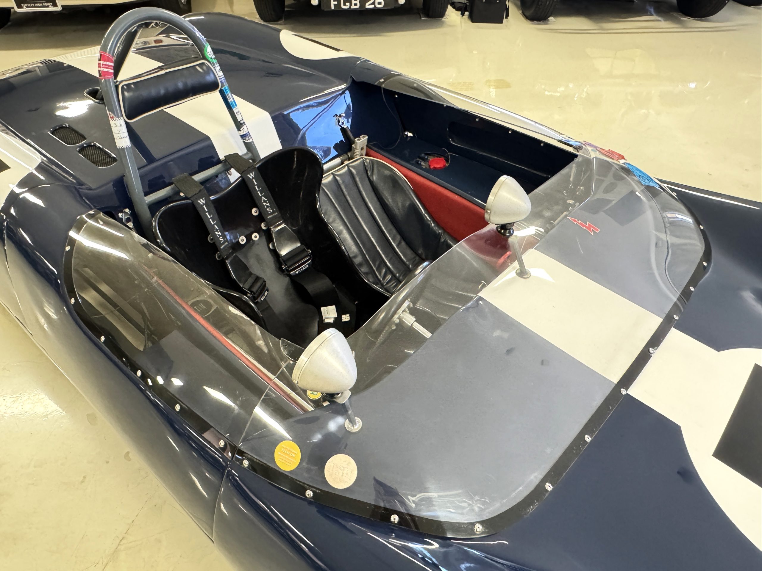 The exterior presents in vivid Dark Blue, accented by a wide central white stripe and racing number “7,” immediately recognizable in the paddock and on track. The color-infused fiberglass body remains in excellent condition, with securely fitted panels over the lightweight spaceframe chassis. The Lotus’ bodywork design is both elegant and purposeful: large front and rear sections hinge open for full mechanical access, while the low-profile doors blend seamlessly with the wrap-around windscreen. A collection of historic race event decals on the windscreen and roll bar reflects the car’s active participation in significant motorsport gatherings, reinforcing its authenticity. Completing the period look are the distinctive 13-inch white Wobbly Web wheels, fitted with four lugs up front and six at the rear, true to Chapman’s original configuration.