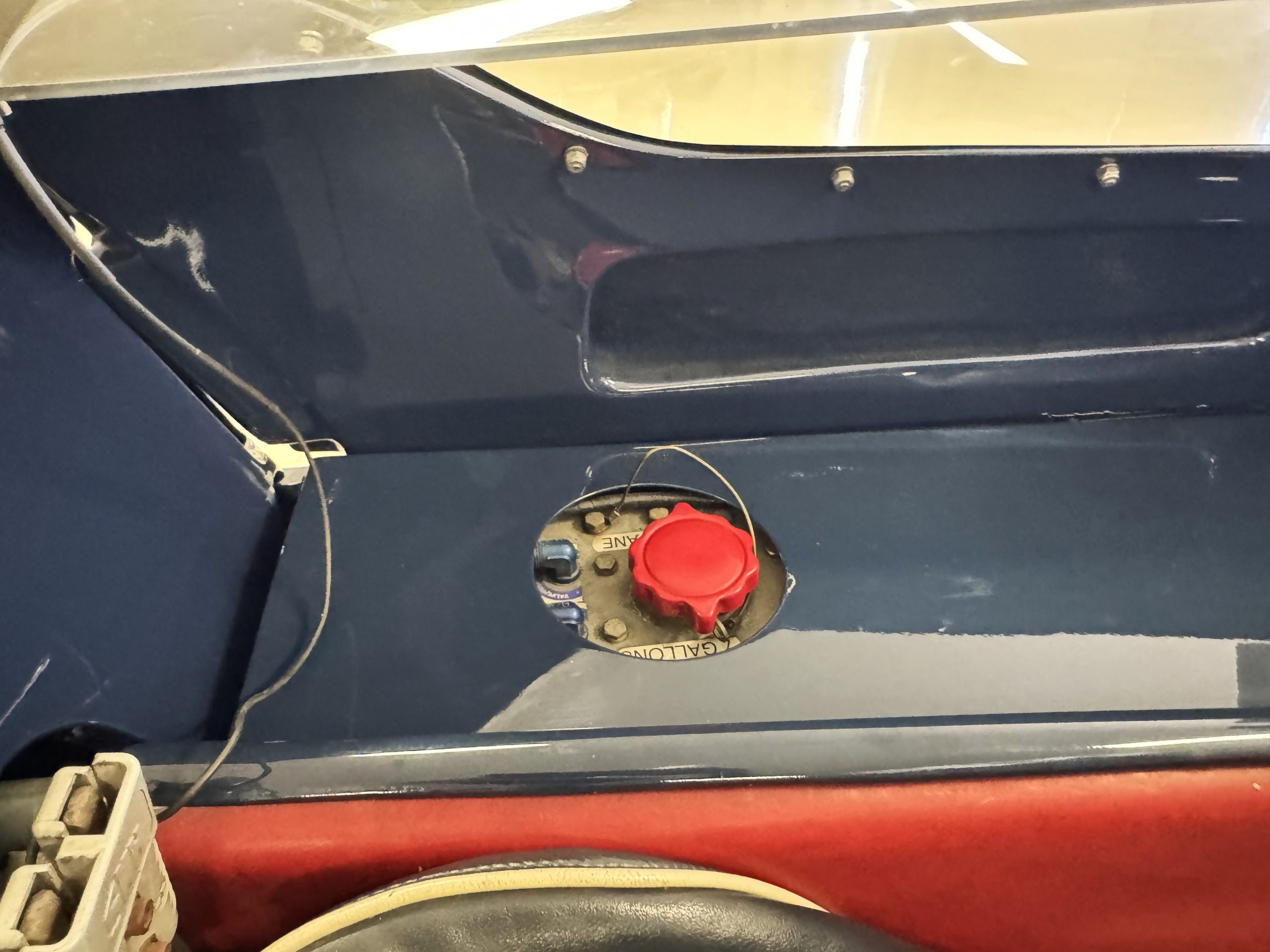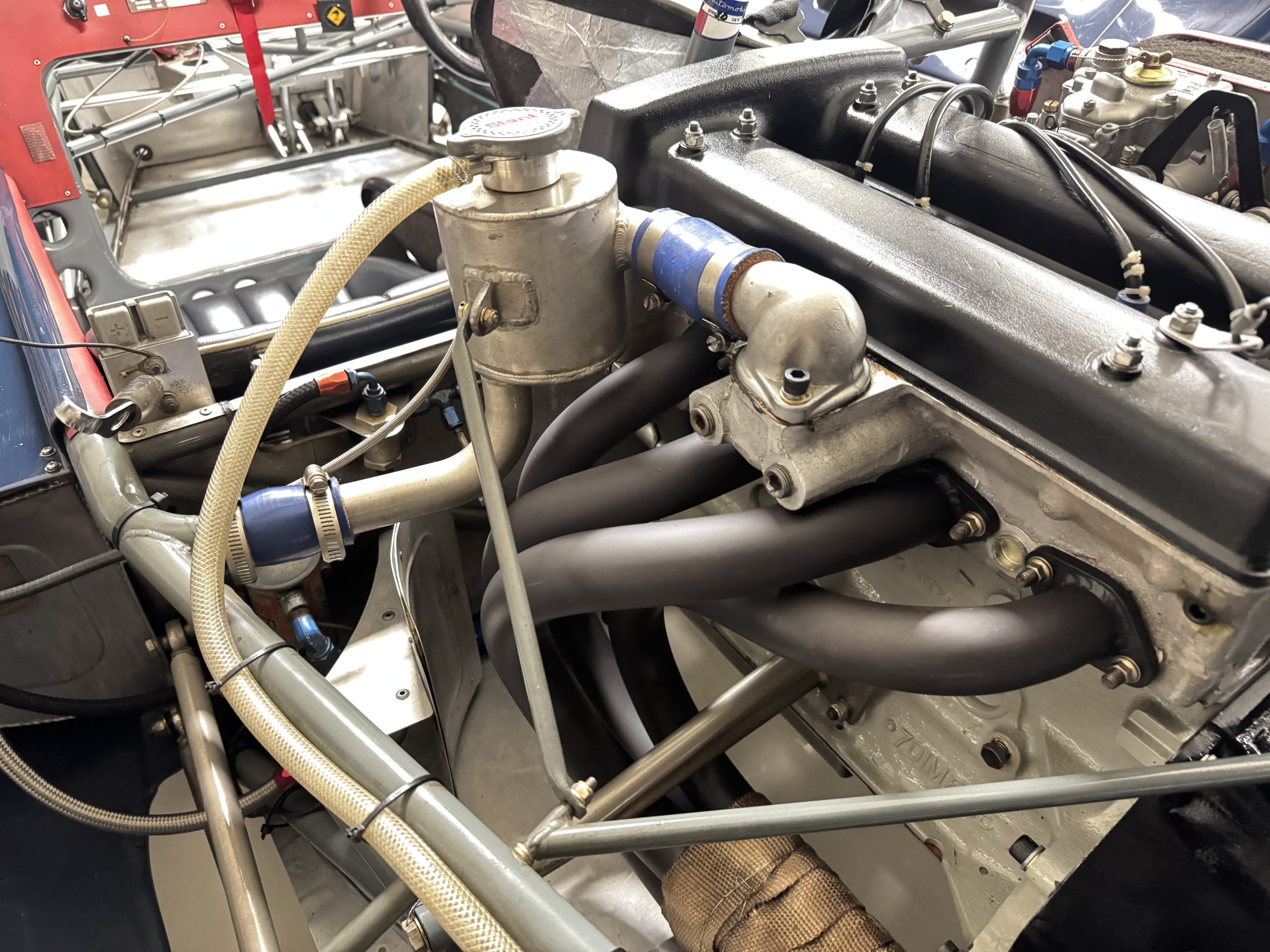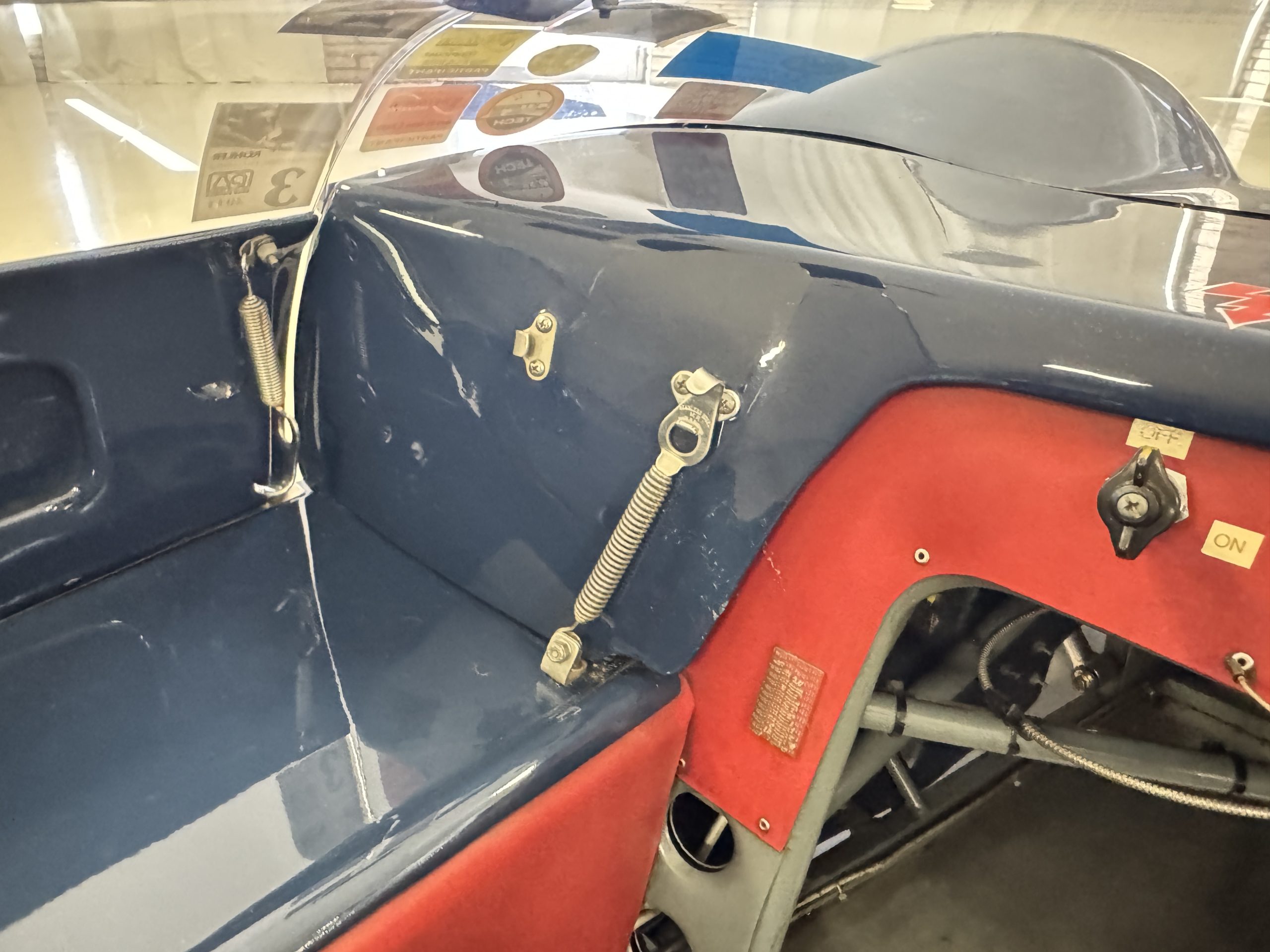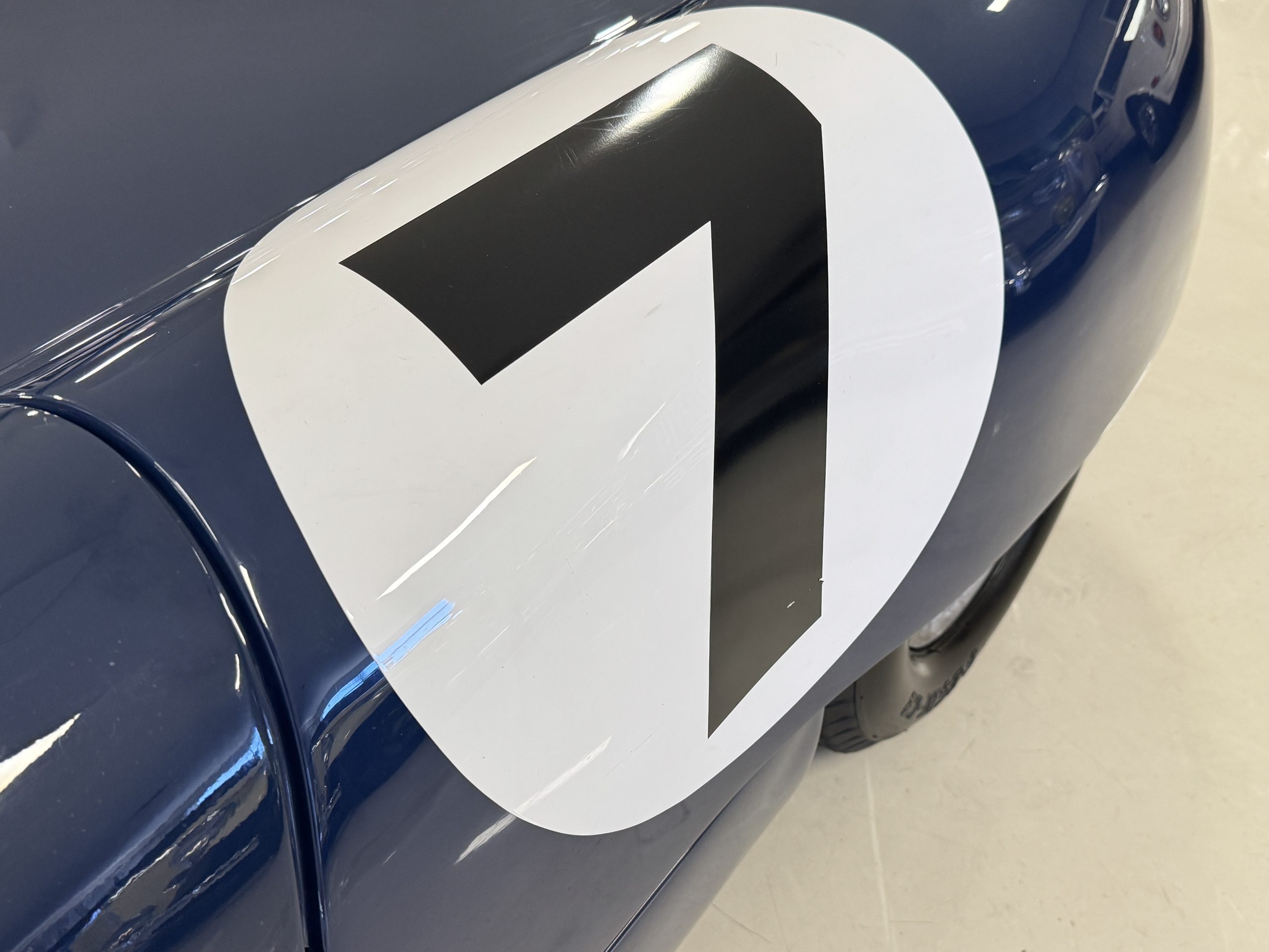 The exterior presents in vivid Dark Blue, accented by a wide central white stripe and racing number “7,” immediately recognizable in the paddock and on track. The color-infused fiberglass body remains in excellent condition, with securely fitted panels over the lightweight spaceframe chassis. The Lotus’ bodywork design is both elegant and purposeful: large front and rear sections hinge open for full mechanical access, while the low-profile doors blend seamlessly with the wrap-around windscreen. A collection of historic race event decals on the windscreen and roll bar reflects the car’s active participation in significant motorsport gatherings, reinforcing its authenticity. Completing the period look are the distinctive 13-inch white Wobbly Web wheels, fitted with four lugs up front and six at the rear, true to Chapman’s original configuration.