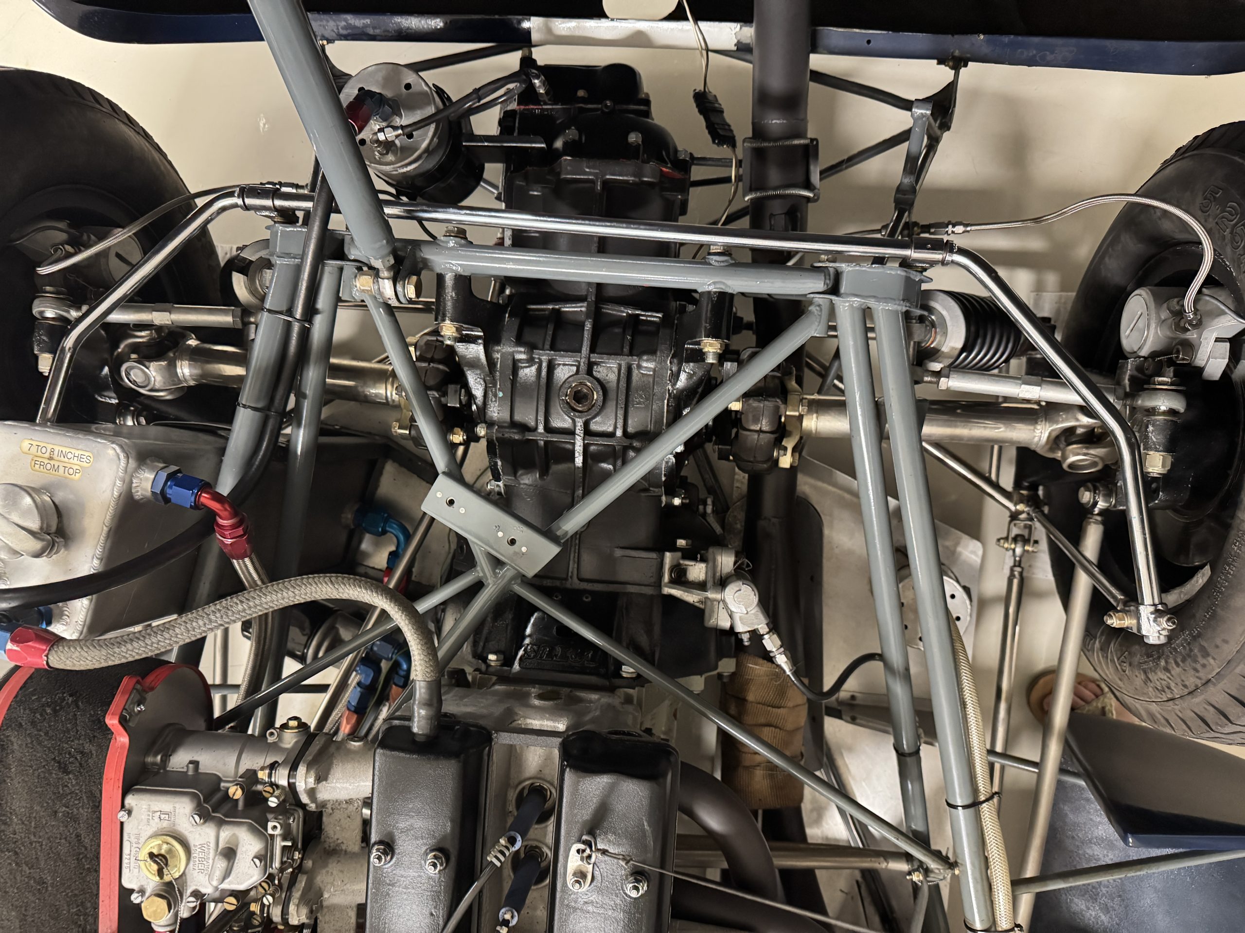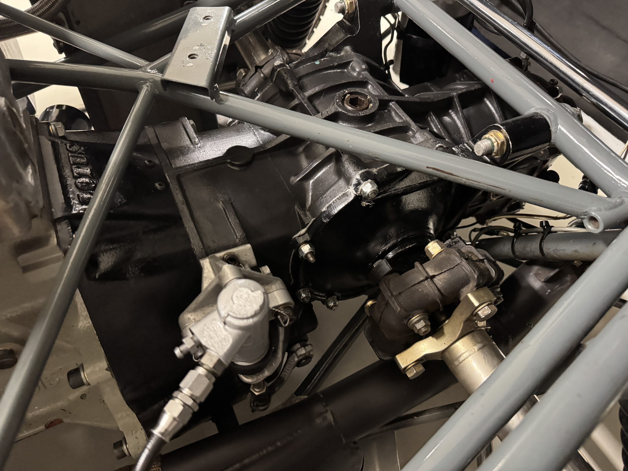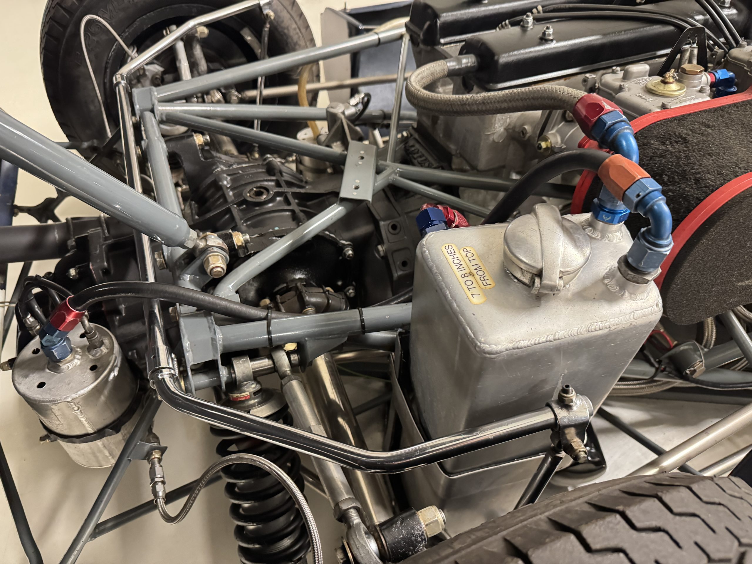 Mechanically, the 23B remains an exceptional example of Chapman’s engineering brilliance. The 1.6-liter Lotus-Ford Twin Cam engine, fitted with Weber carburetors and rebuilt by Slade Engines in Salinas, California, produces approximately 135 horsepower, transmitted through a five-speed Hewland transaxle. The spaceframe chassis, engineered for lightness and rigidity, uses widened tubes to accommodate the increased torque of the upgraded engine. Suspension geometry features double wishbones, rack-and-pinion steering, and fully independent coil-spring setups, with Girling disc brakes at all four corners. The battery is new, but this Lotus will need new tires, new seatbelts and a fluid change before being ready to hit the track again. The car’s frame tubes serve as coolant and oil conduits, reducing plumbing weight and complexity. The result is a 950-pound machine with sharp reflexes and remarkable composure, capable of outperforming larger-displacement competitors on technical circuits.