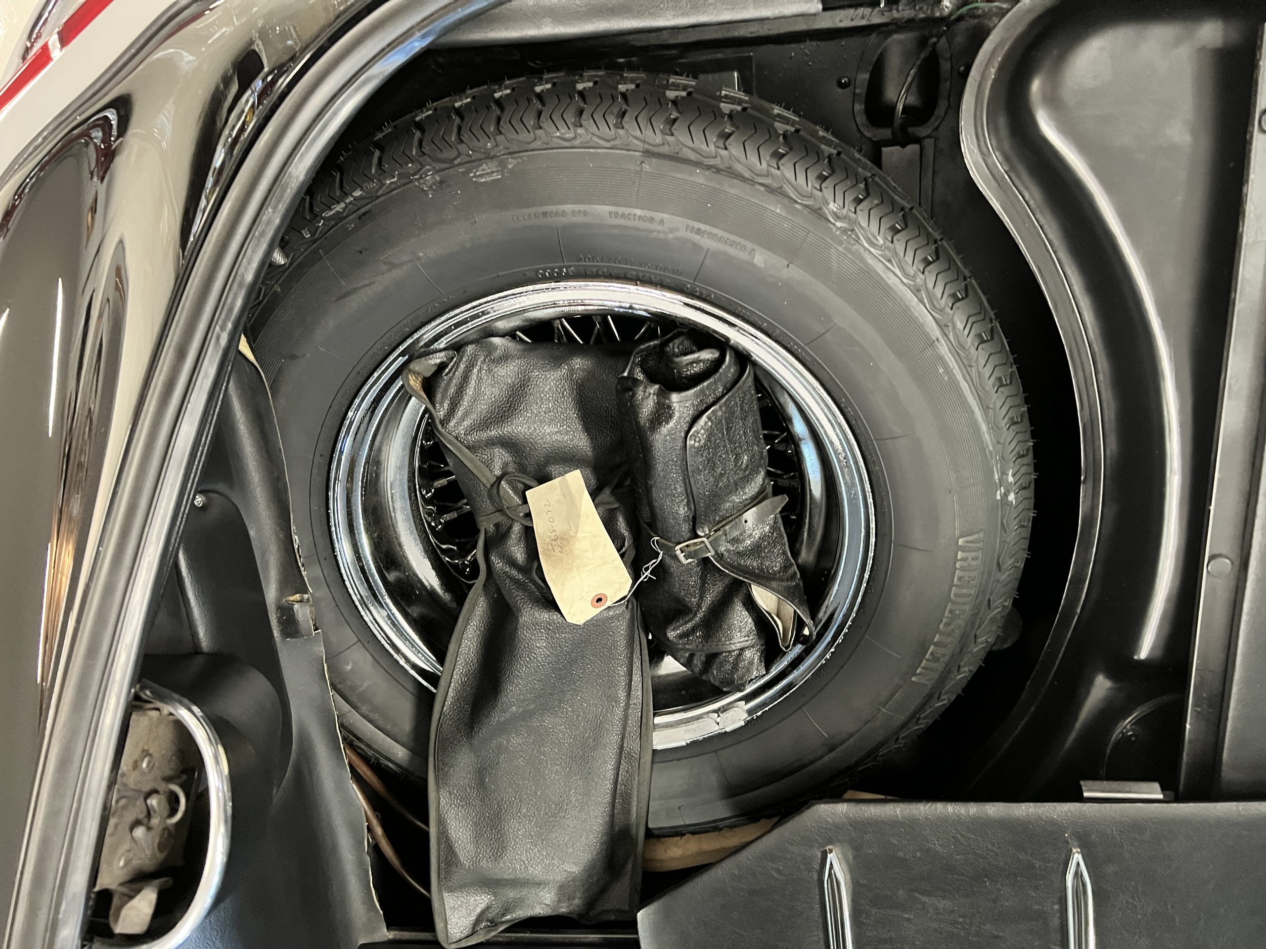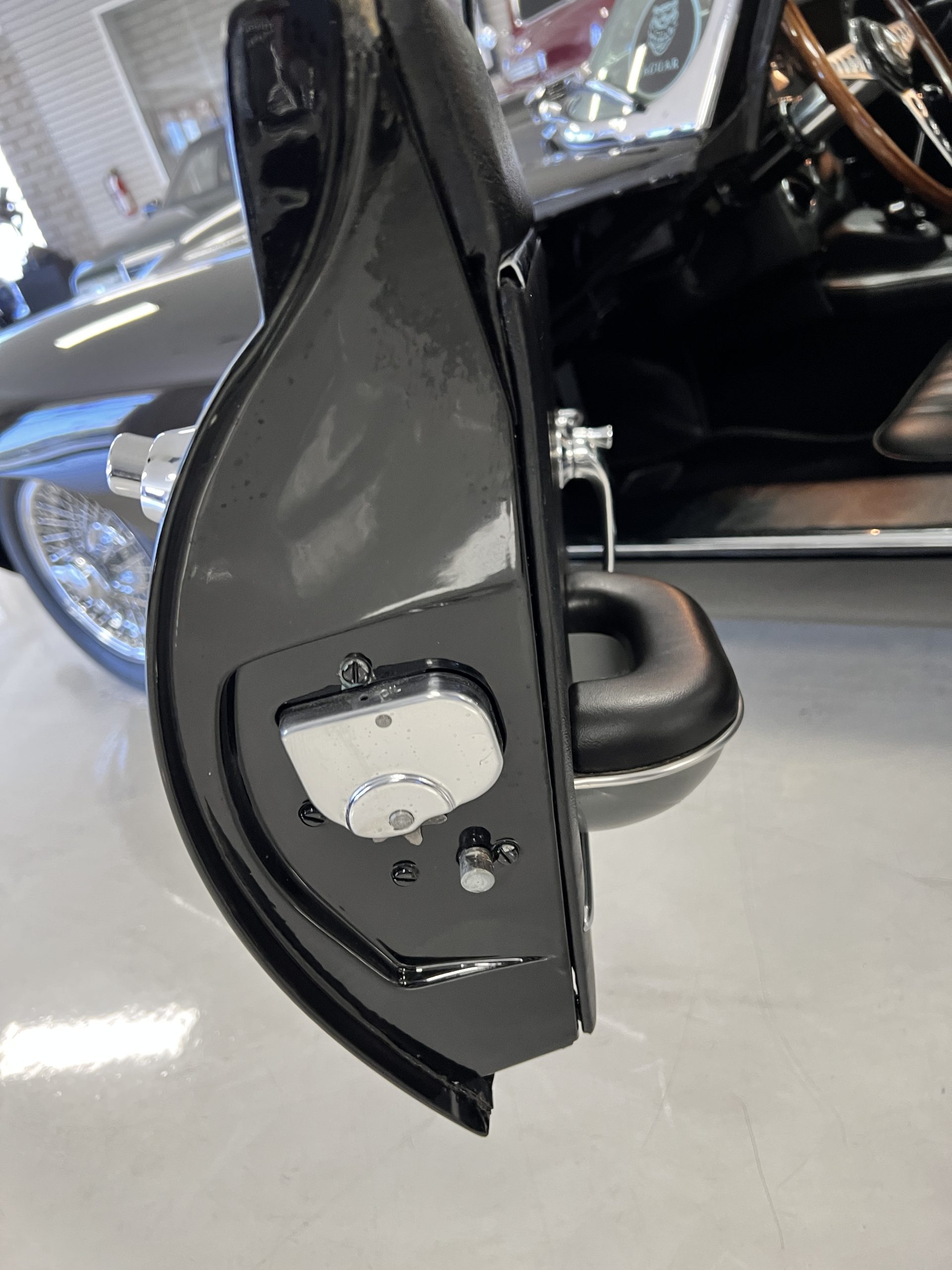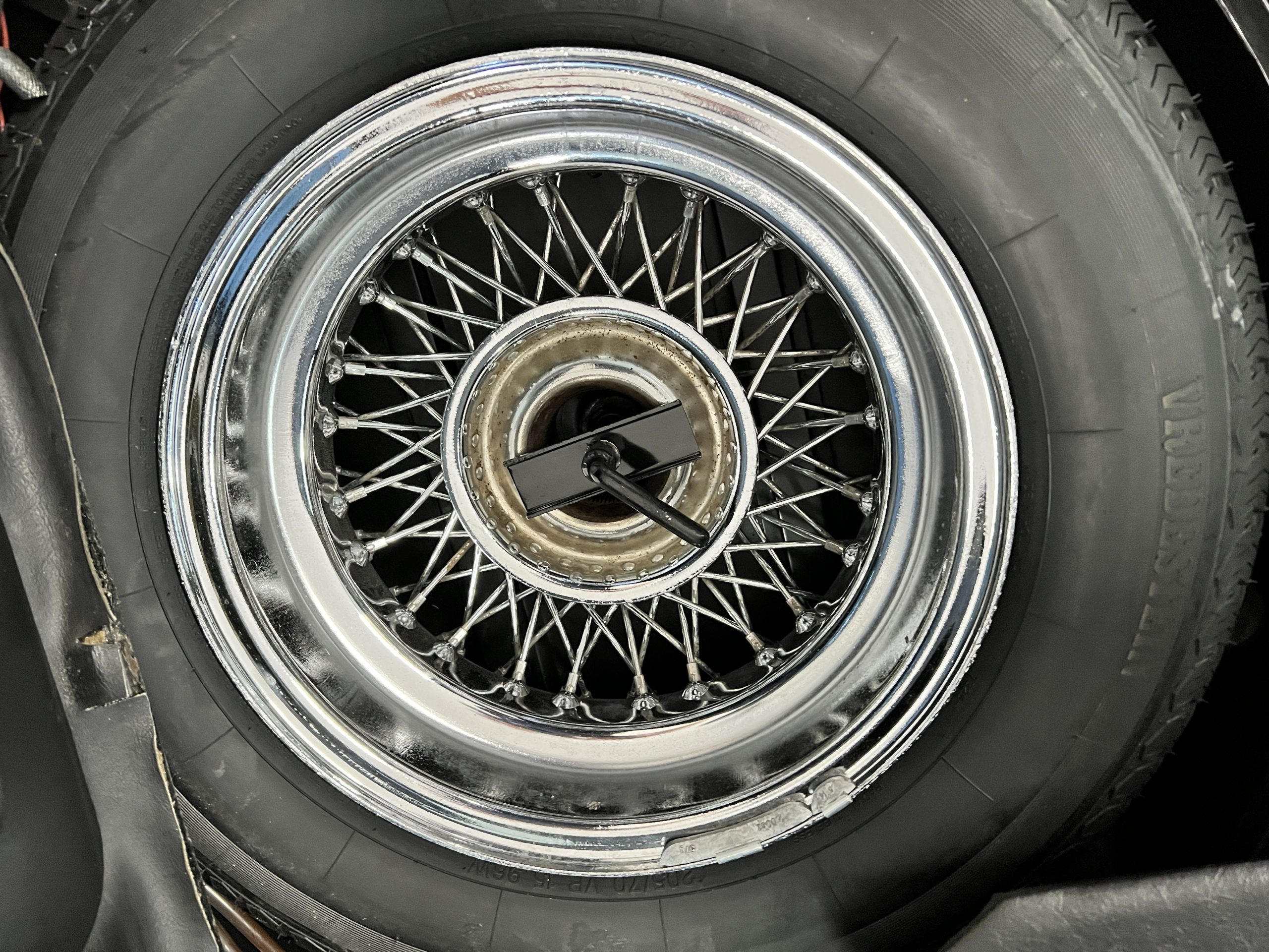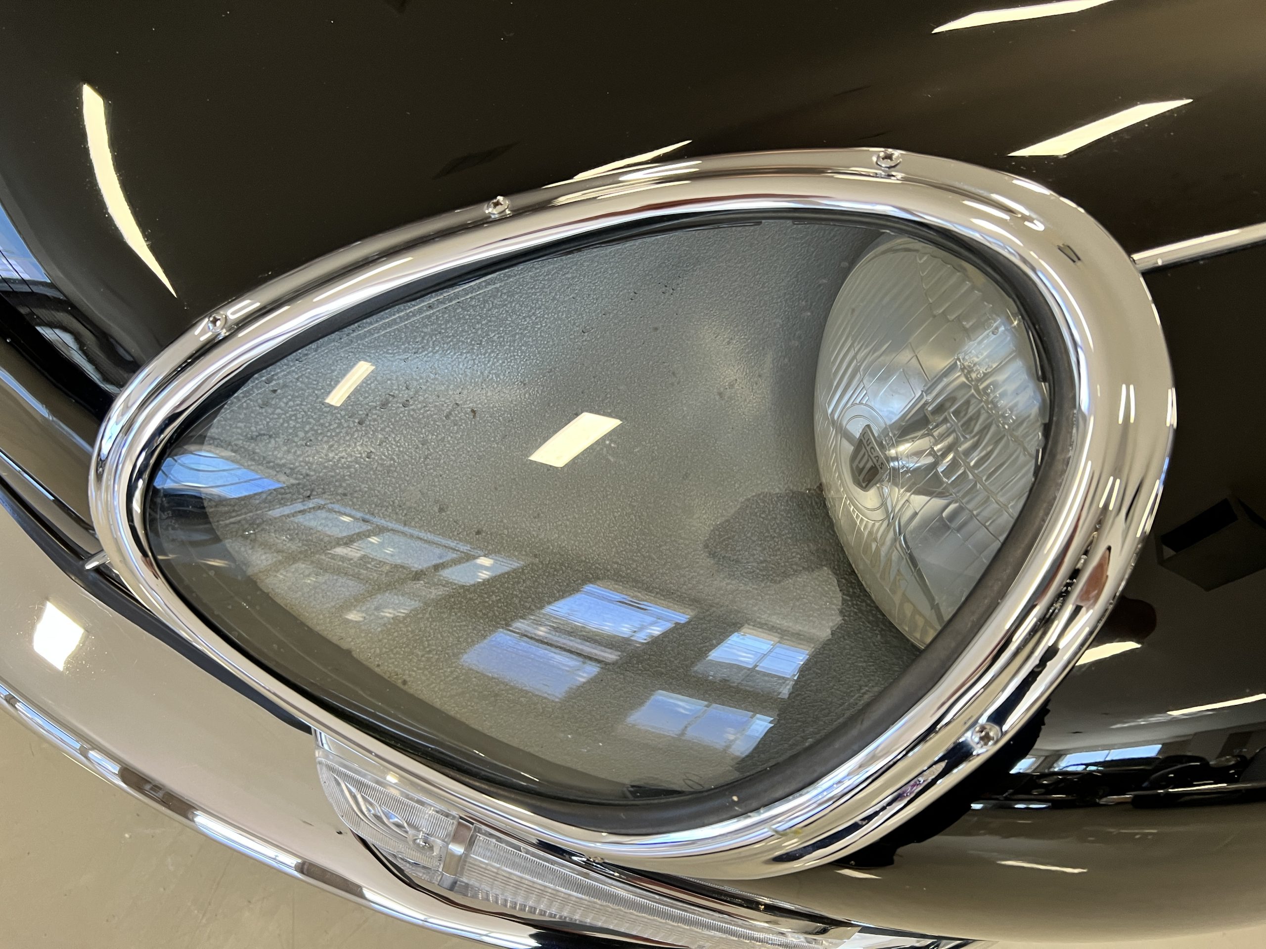 The black livery today is simply stunning. It is polished brilliantly and contrasted with perfect chrome and stainless-steel trim. The panel gaps are all perfect and the panels are straight and true. The chrome wire wheels with proper knock offs are as-new in all respects. We love the classic look of the covered headlight covers.