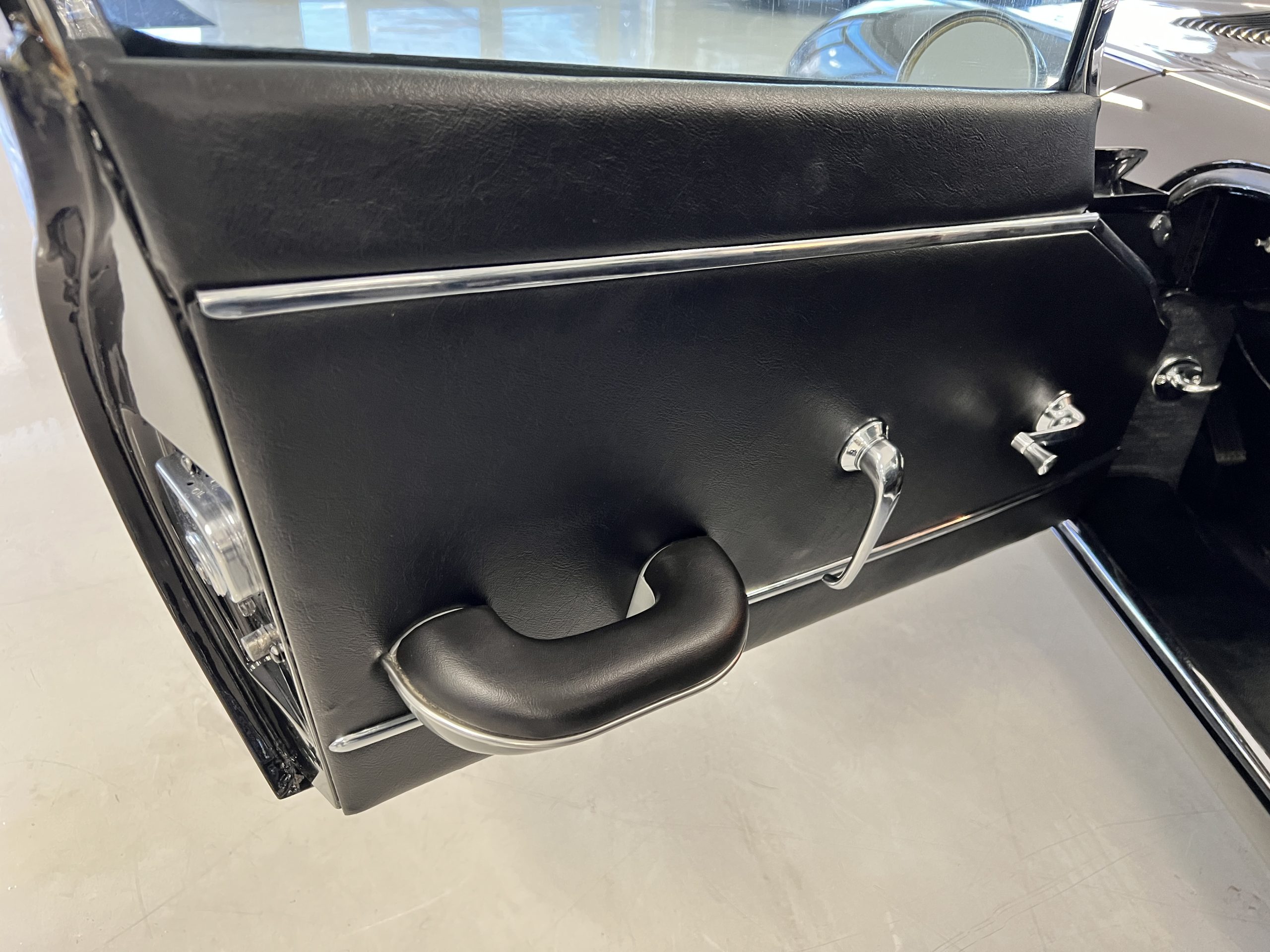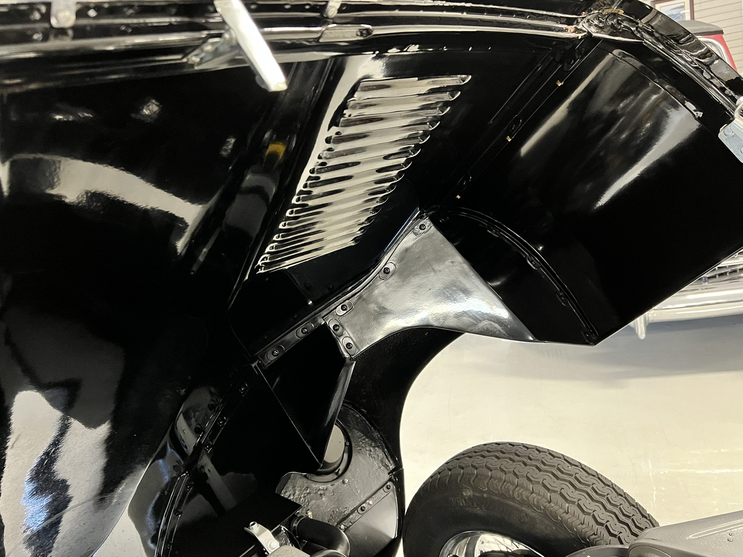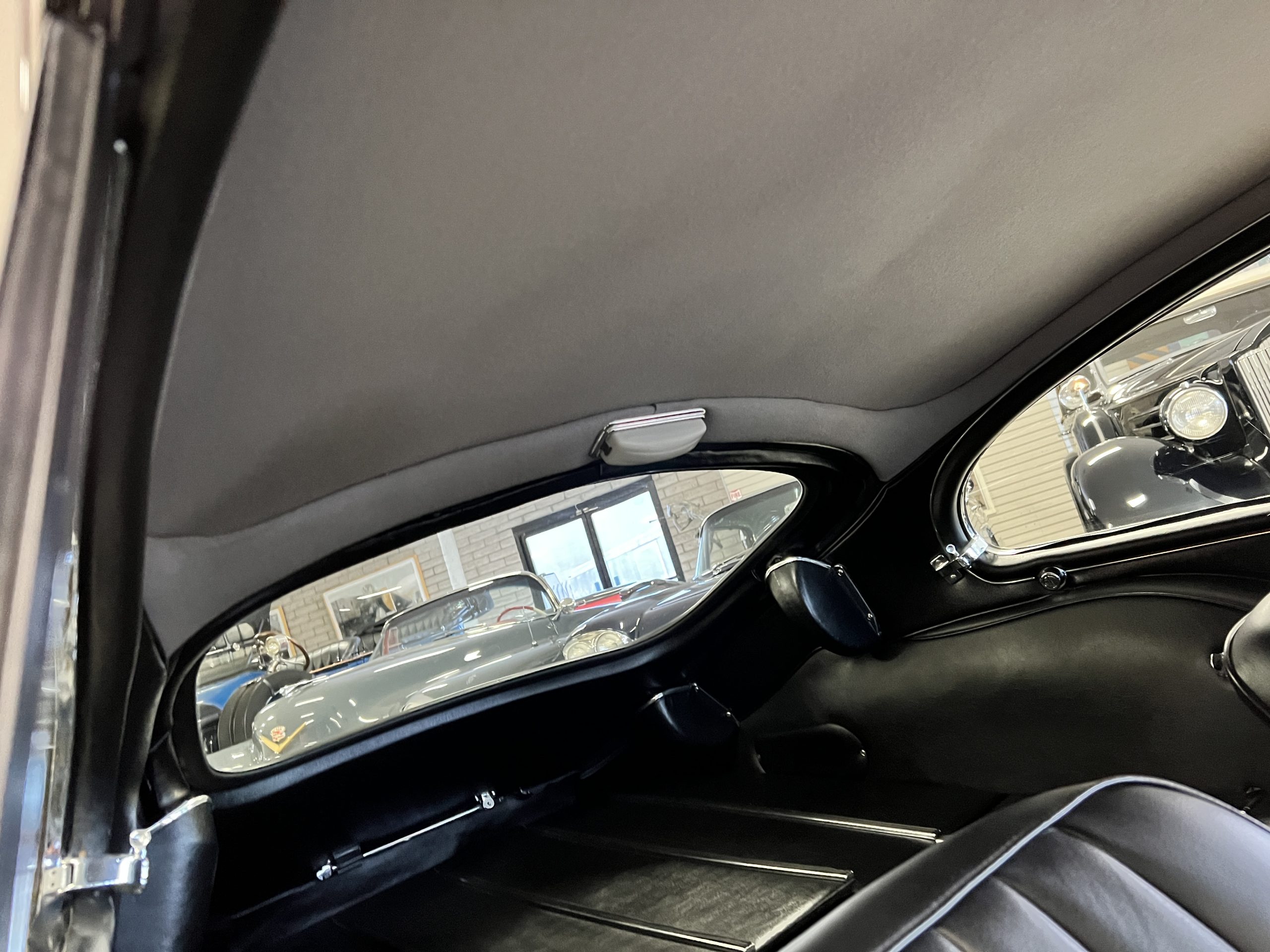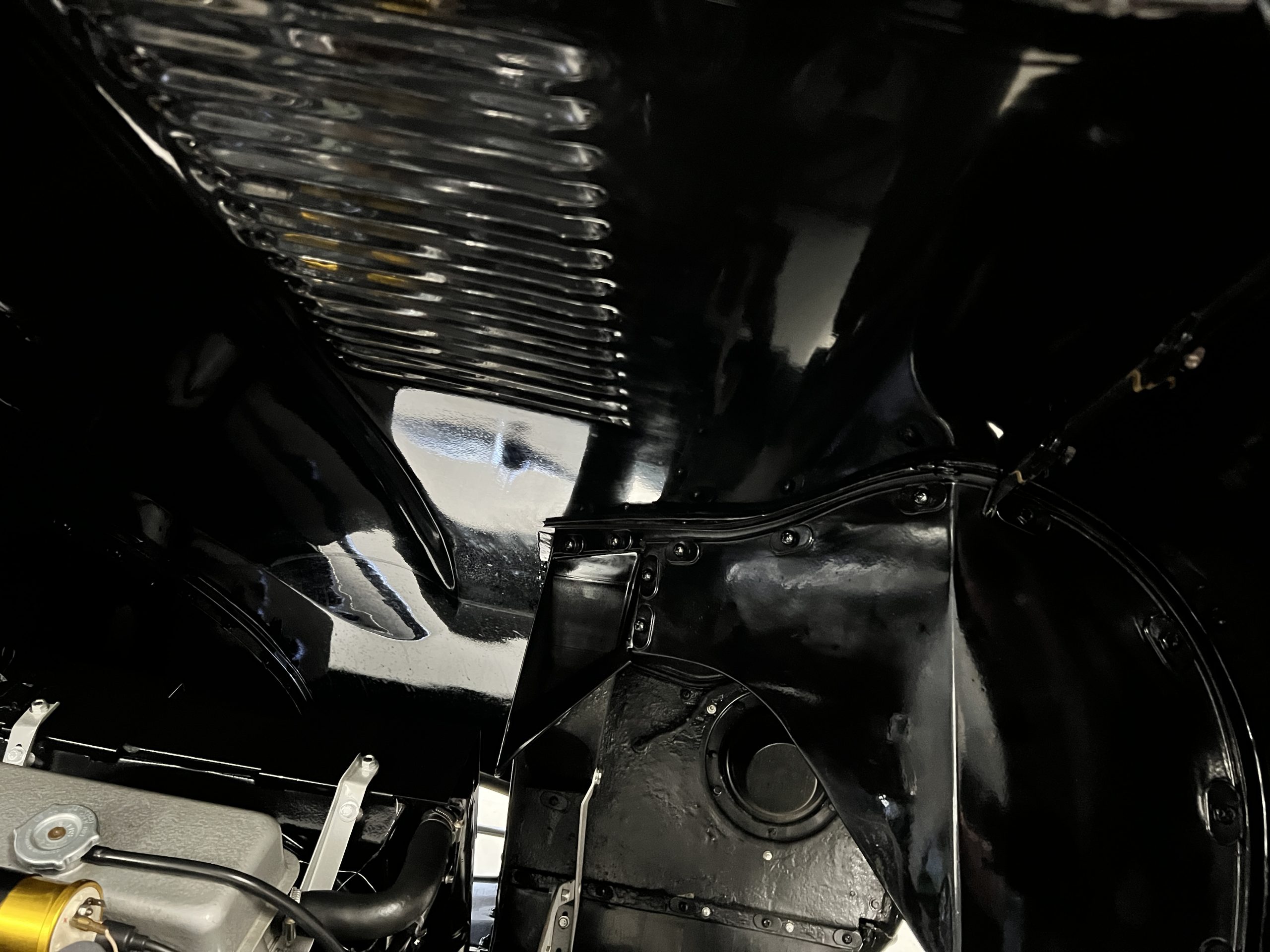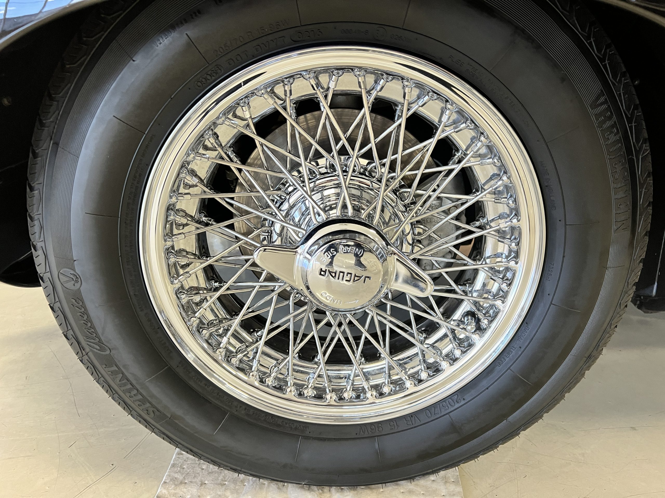 The black livery today is simply stunning. It is polished brilliantly and contrasted with perfect chrome and stainless-steel trim. The panel gaps are all perfect and the panels are straight and true. The chrome wire wheels with proper knock offs are as-new in all respects. We love the classic look of the covered headlight covers.