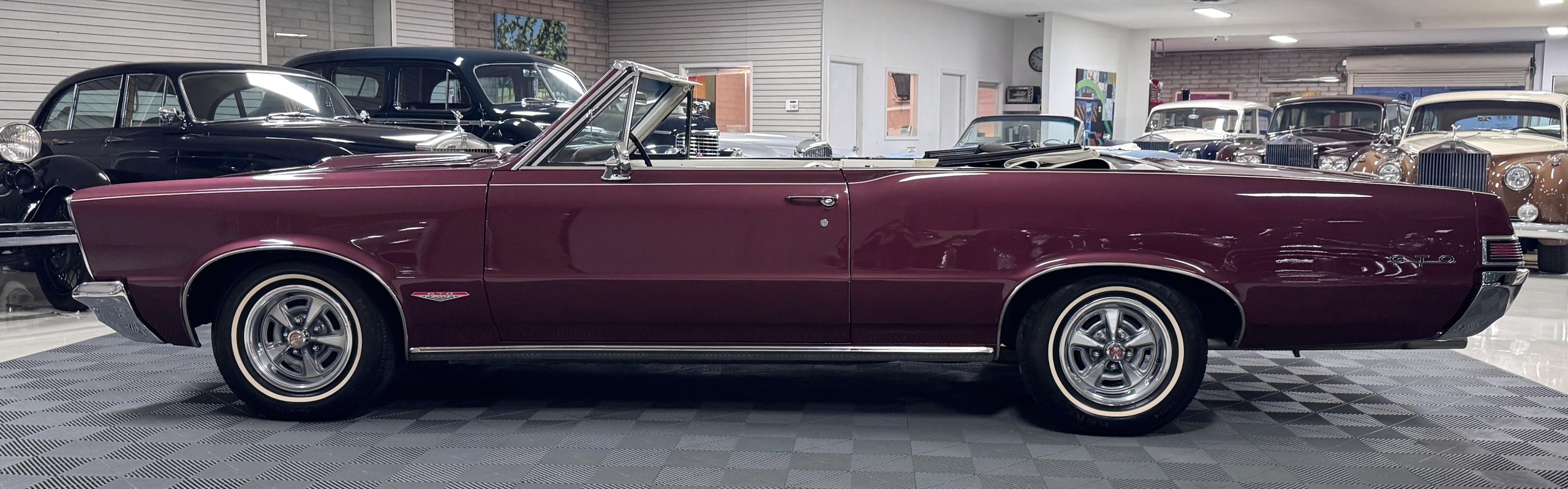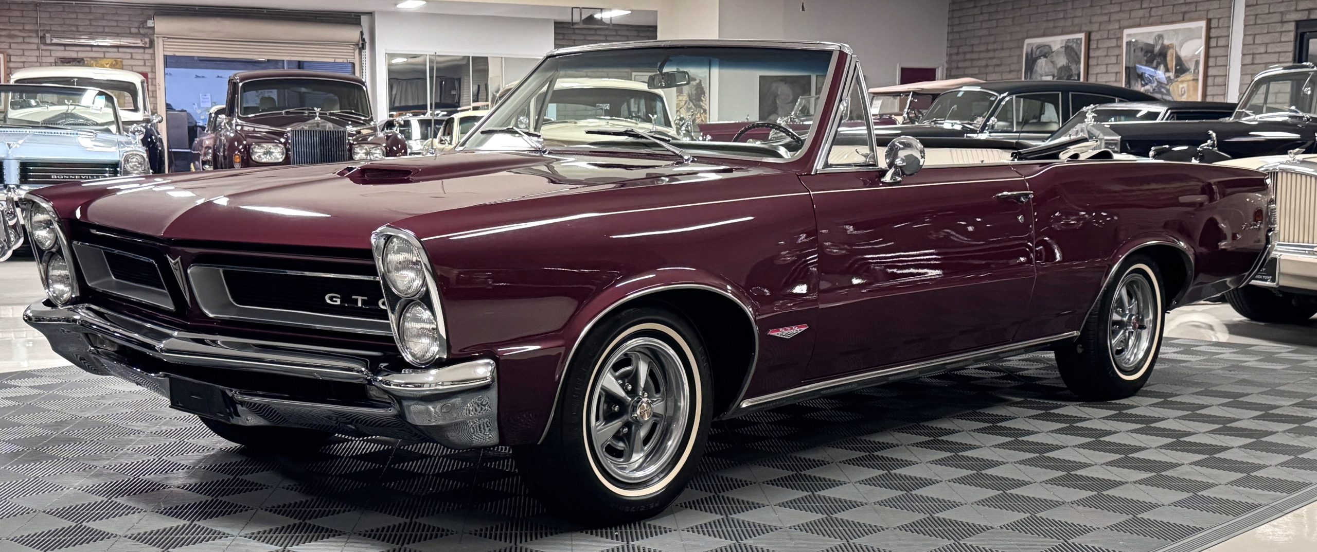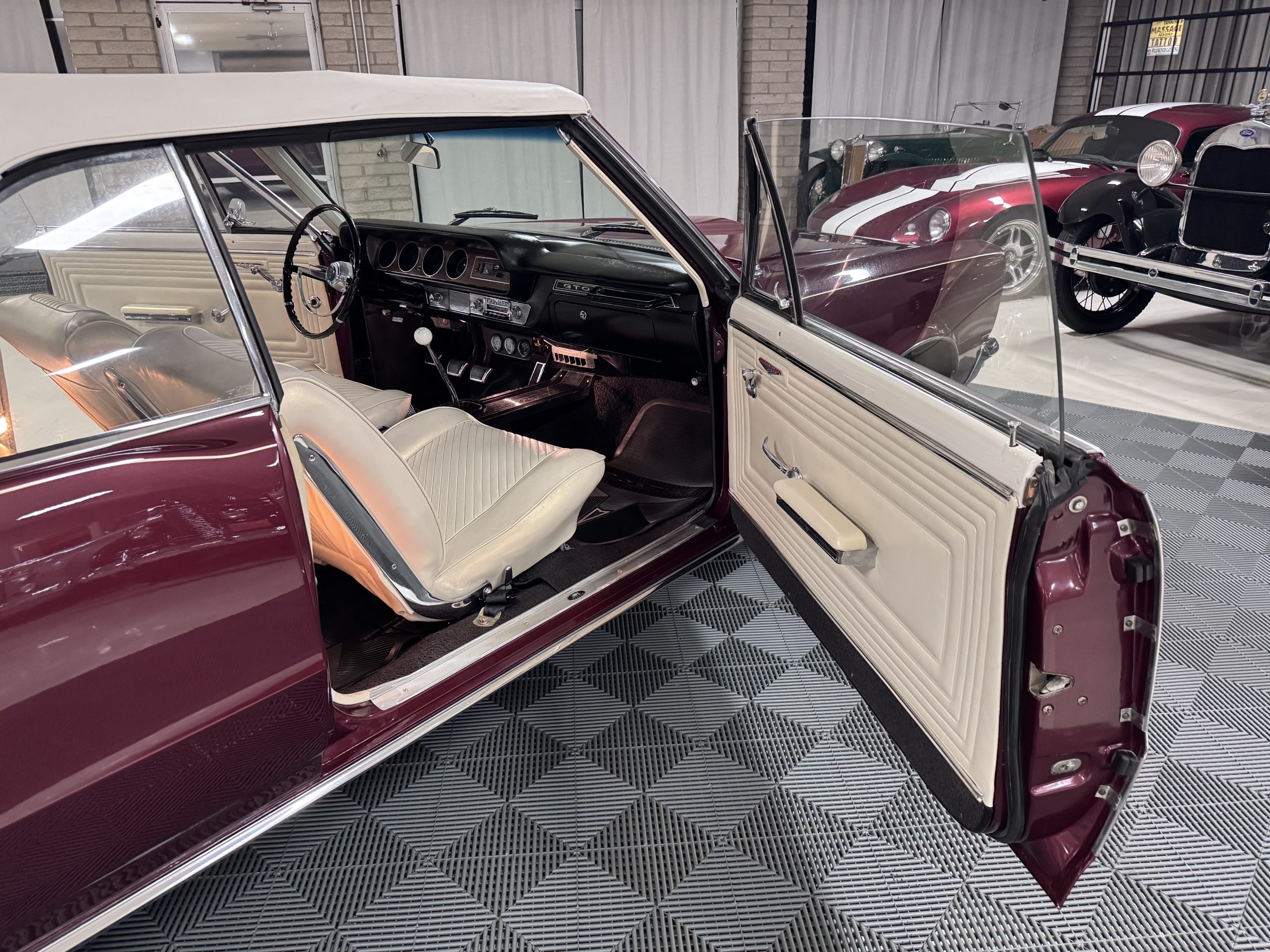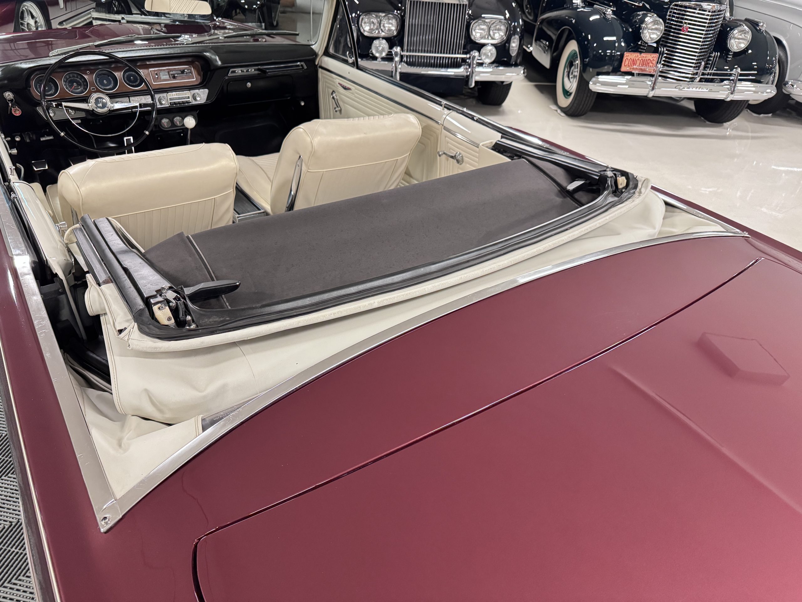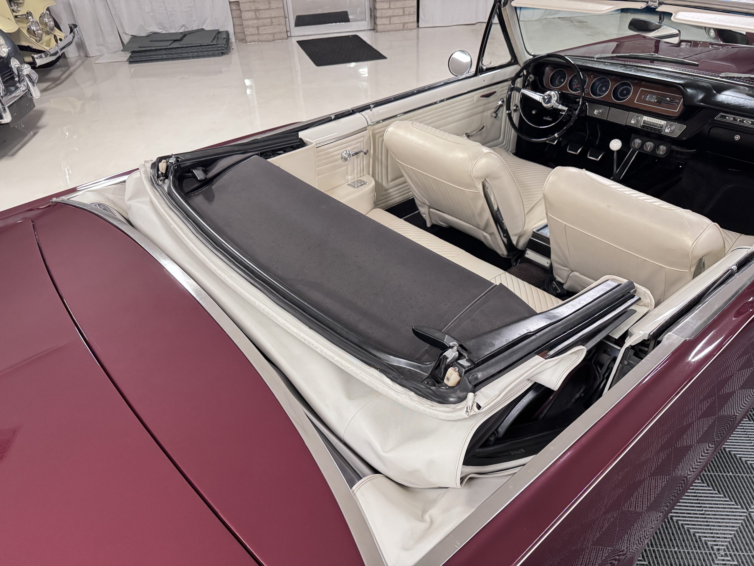 SOLD! This 1965 Pontiac GTO Convertible is a beautiful restored, WT engine, well-documented example that is in excellent mechanical condition with only 32,000 miles! The GTO is in excellent condition finished in Burgundy Red Poly over a Parchment interior with a white power-retractable top. The engine is the desirable original 389ci V-8 with Tri-Power paired to the four-speed manual synchromesh transmission. The GTO underwent a frame-off restoration to factory specifications and is in excellent overall condition. This GTO is ready to wow at any local car show and is a collector’s gem based on its low mileage, excellent overall condition and documentation!