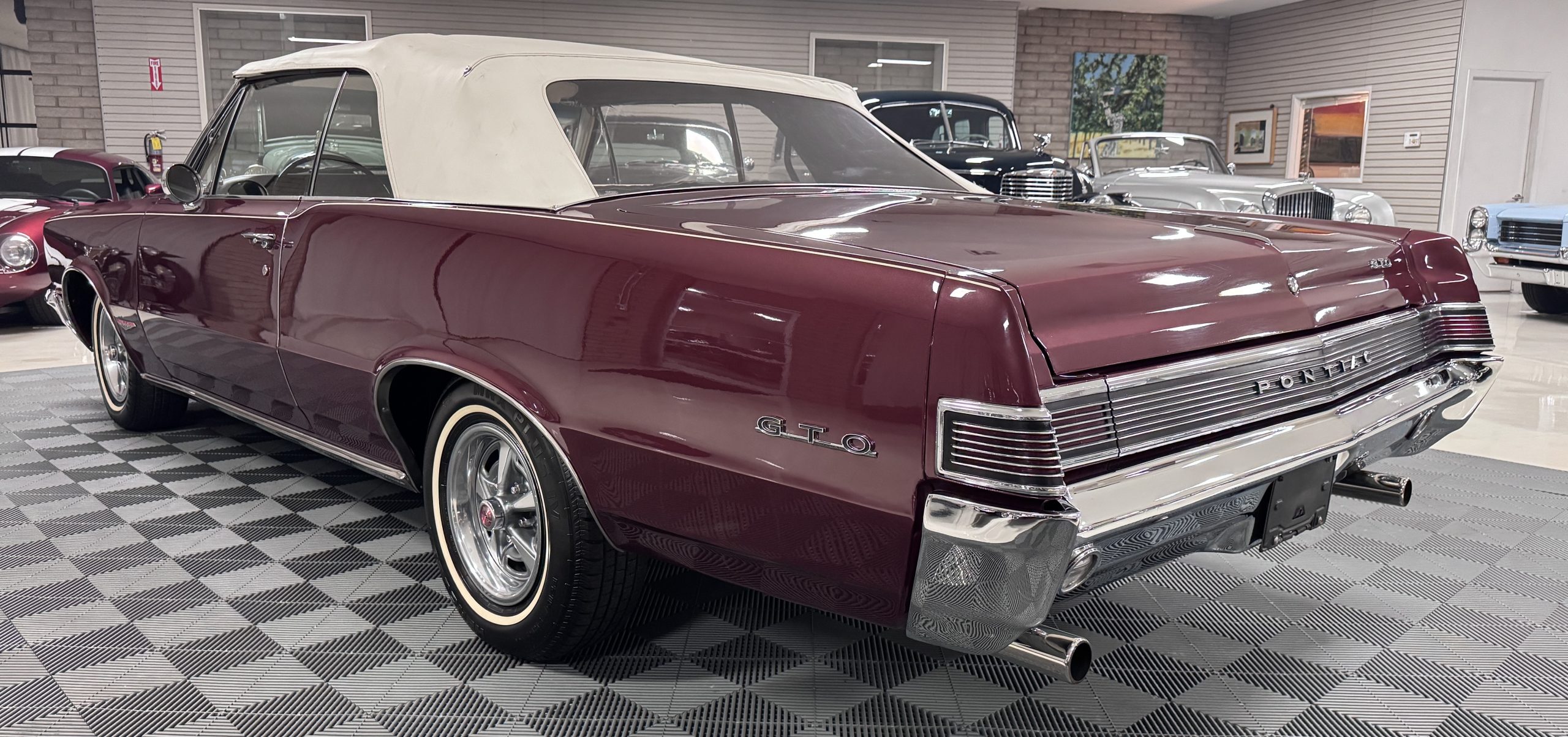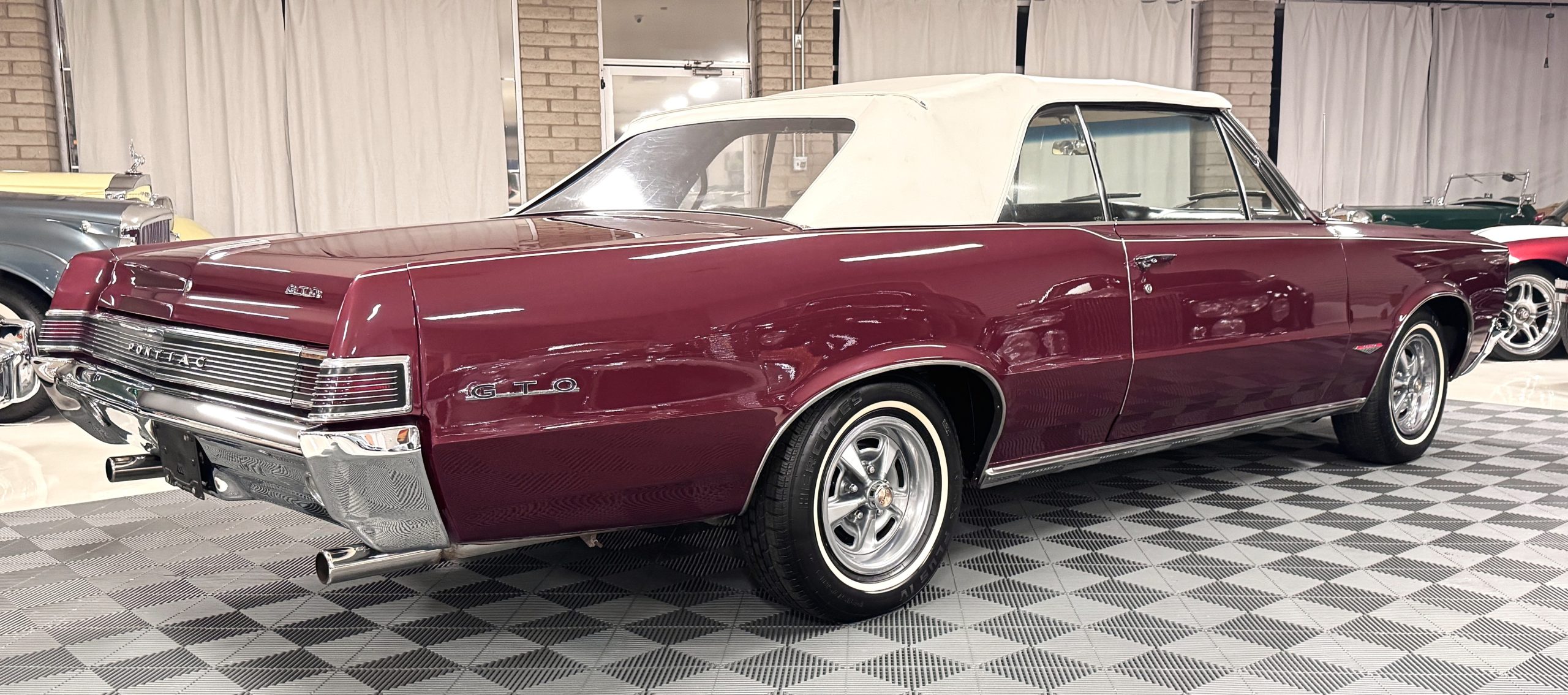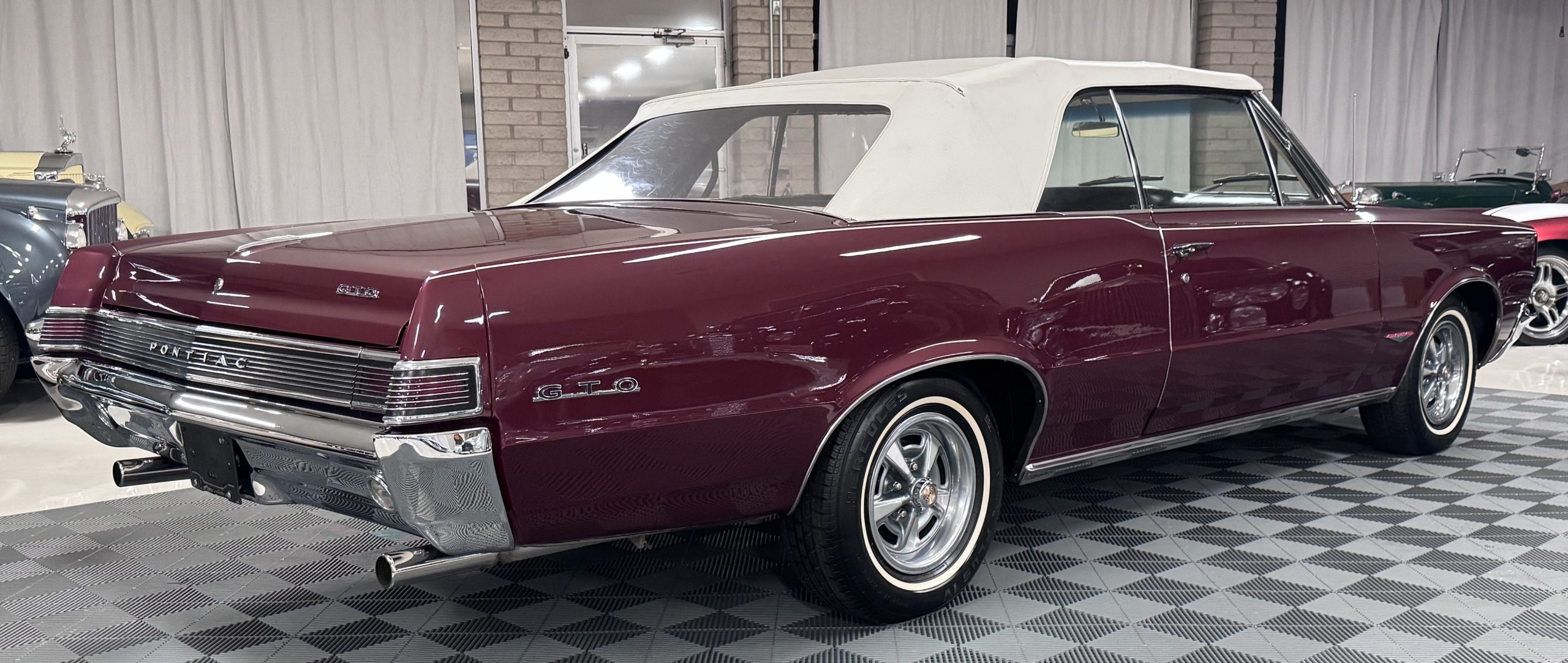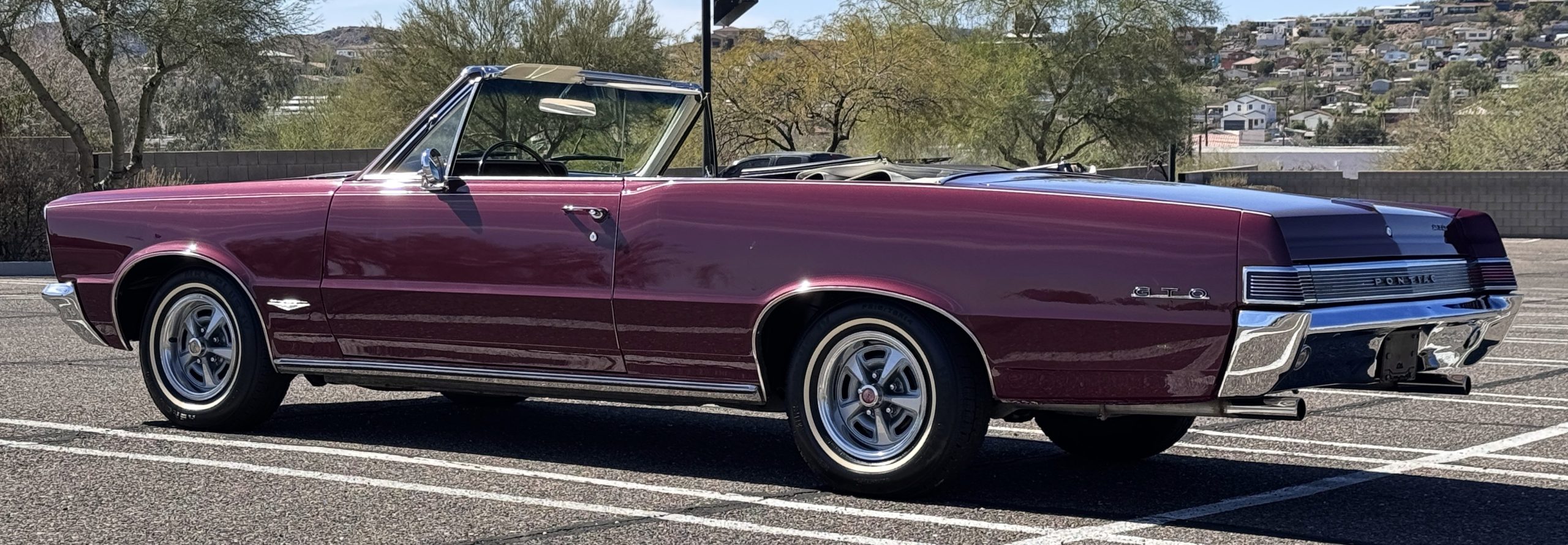 SOLD! This 1965 Pontiac GTO Convertible is a beautiful restored, WT engine, well-documented example that is in excellent mechanical condition with only 32,000 miles! The GTO is in excellent condition finished in Burgundy Red Poly over a Parchment interior with a white power-retractable top. The engine is the desirable original 389ci V-8 with Tri-Power paired to the four-speed manual synchromesh transmission. The GTO underwent a frame-off restoration to factory specifications and is in excellent overall condition. This GTO is ready to wow at any local car show and is a collector’s gem based on its low mileage, excellent overall condition and documentation!