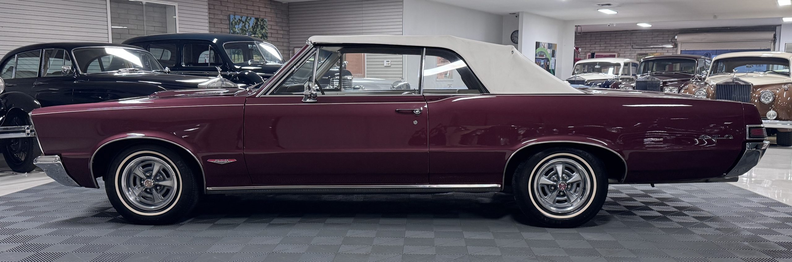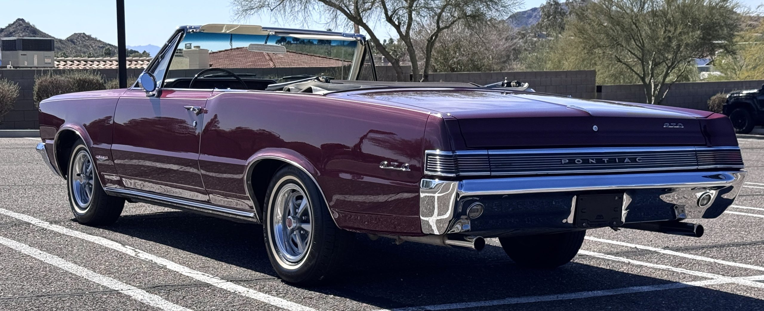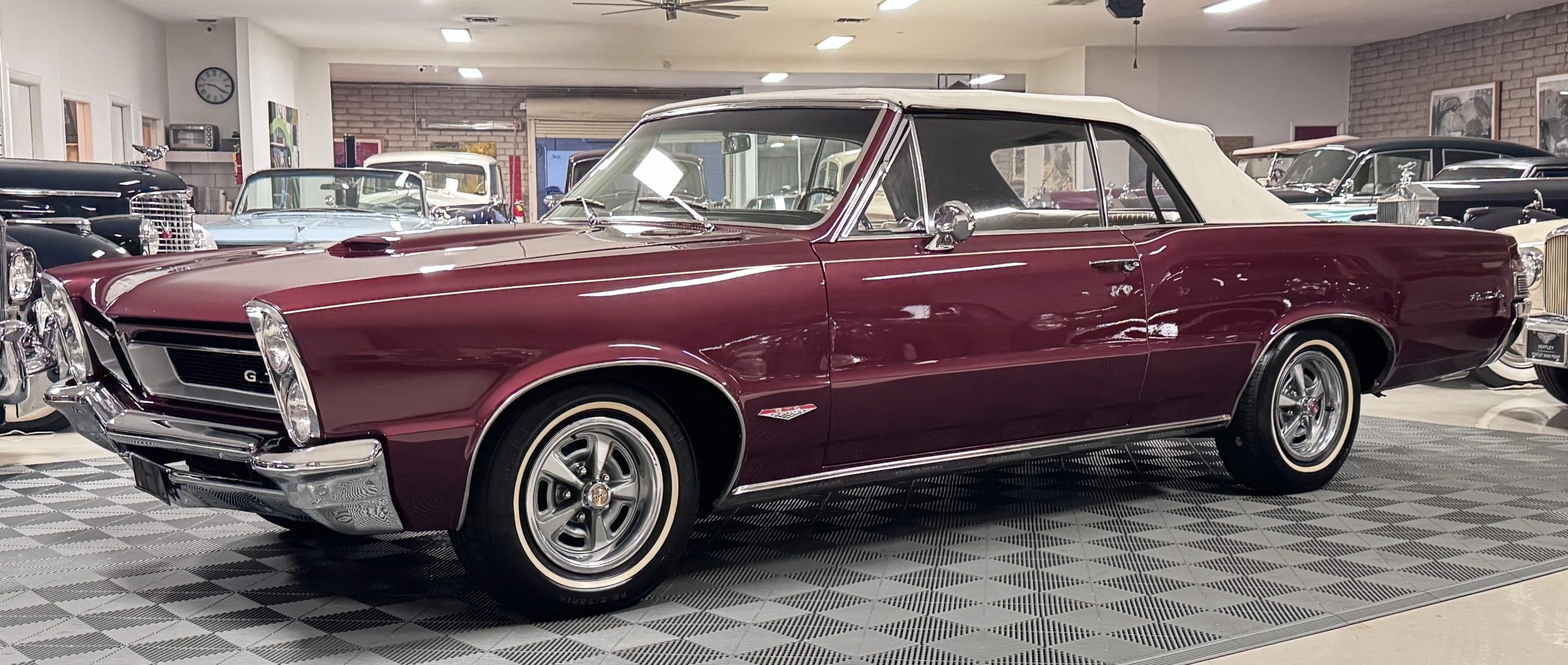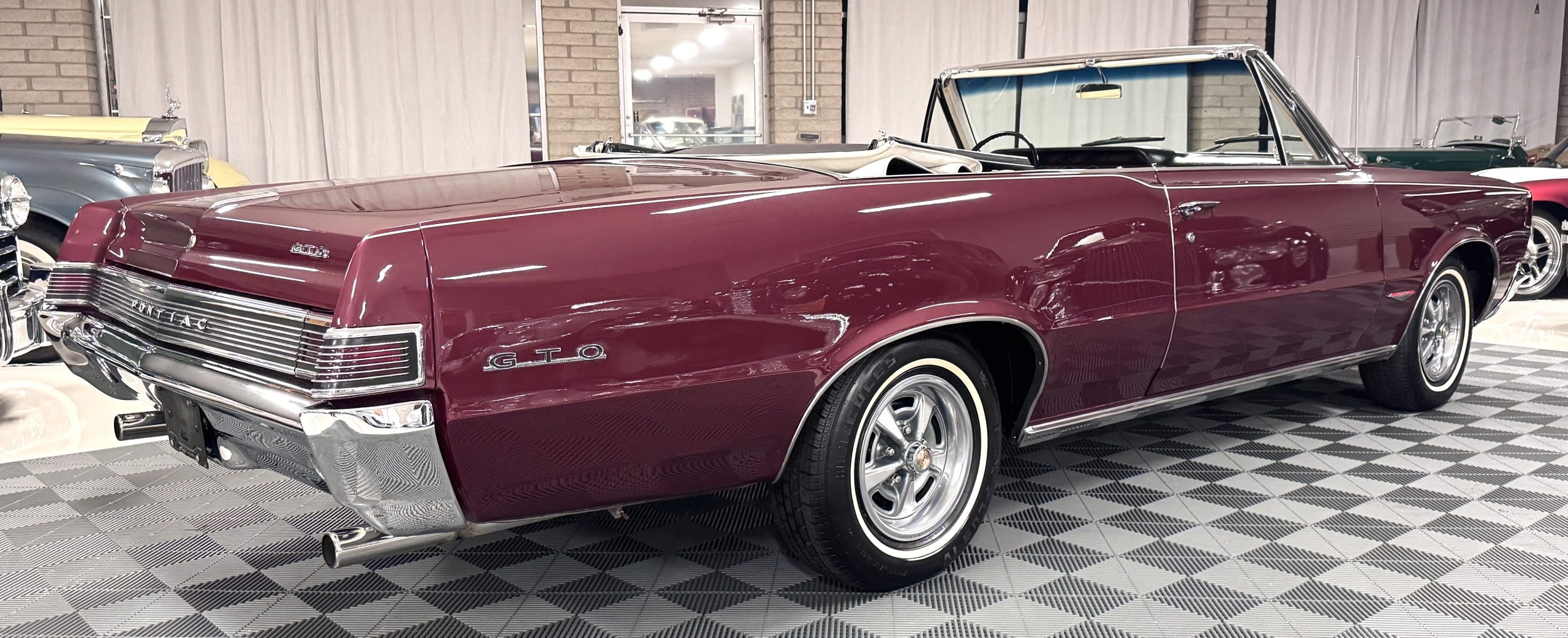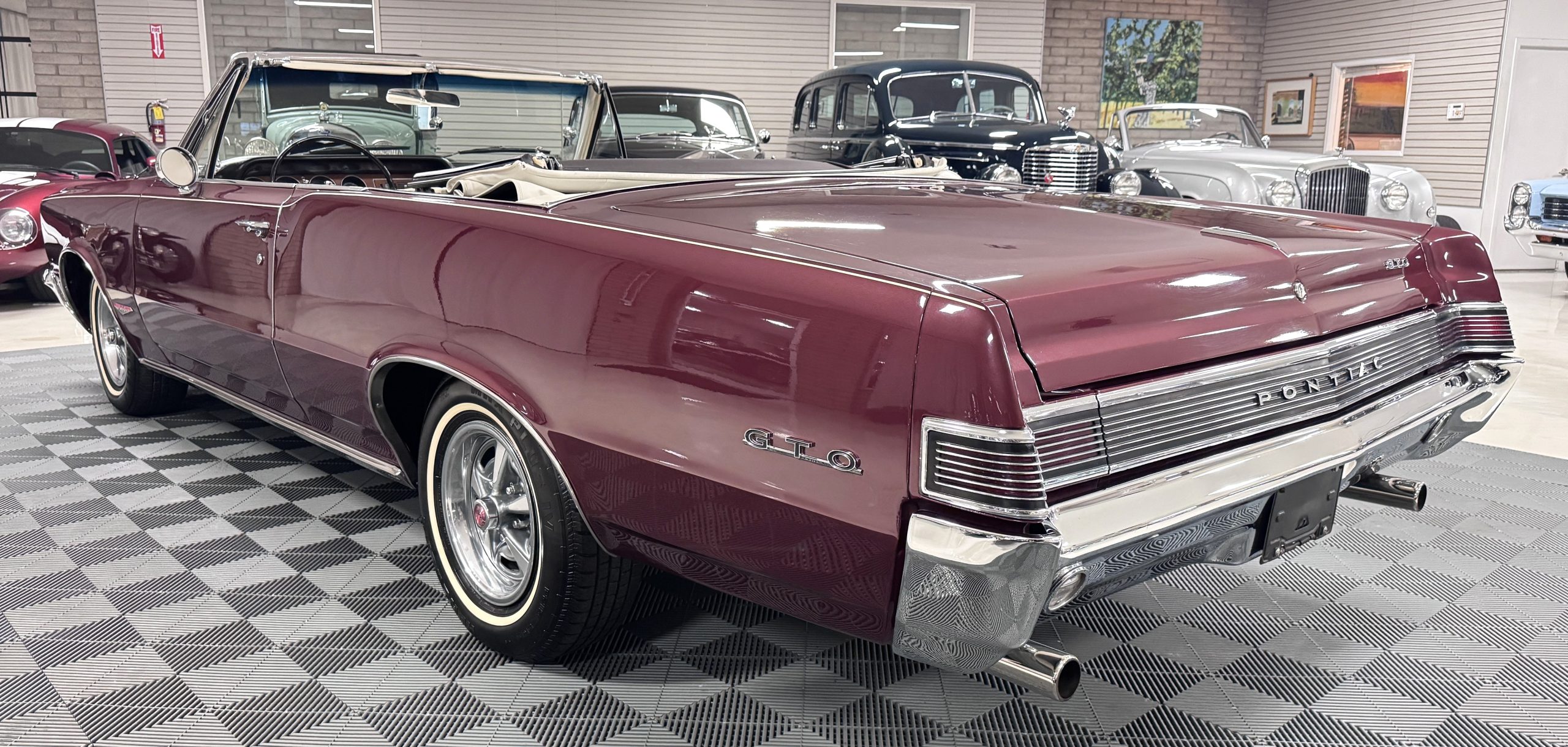 SOLD! This 1965 Pontiac GTO Convertible is a beautiful restored, WT engine, well-documented example that is in excellent mechanical condition with only 32,000 miles! The GTO is in excellent condition finished in Burgundy Red Poly over a Parchment interior with a white power-retractable top. The engine is the desirable original 389ci V-8 with Tri-Power paired to the four-speed manual synchromesh transmission. The GTO underwent a frame-off restoration to factory specifications and is in excellent overall condition. This GTO is ready to wow at any local car show and is a collector’s gem based on its low mileage, excellent overall condition and documentation!