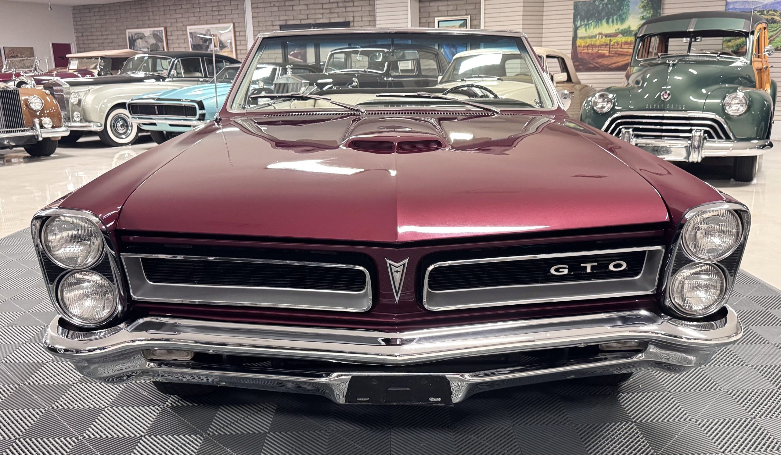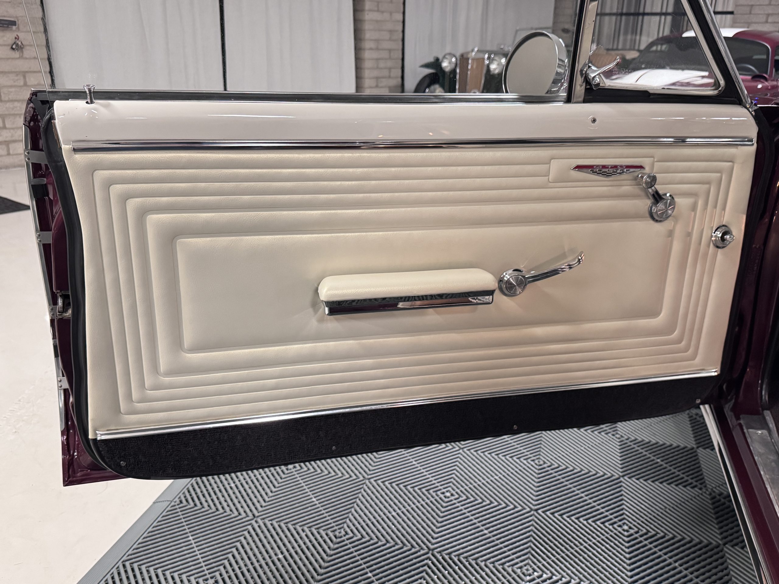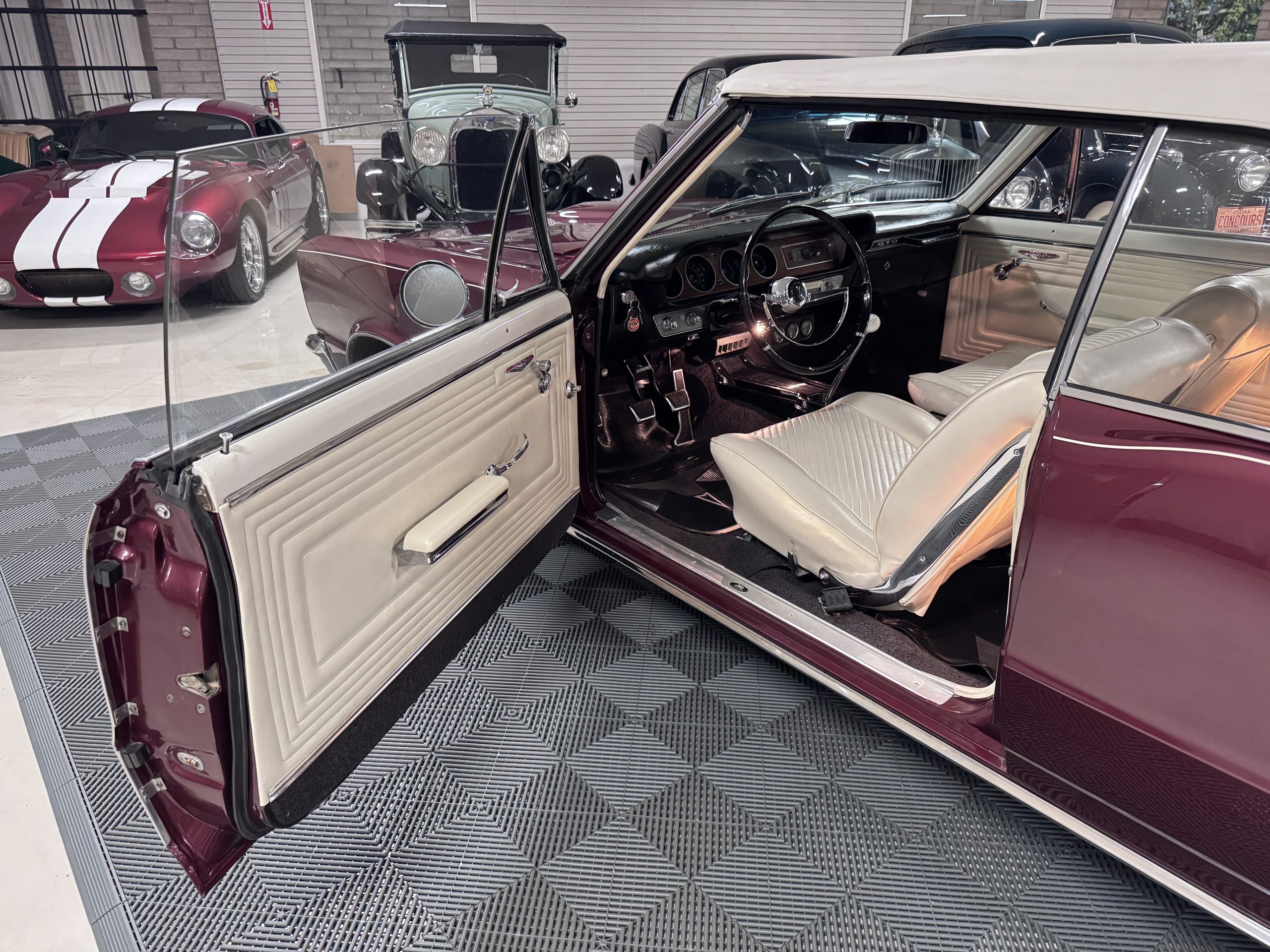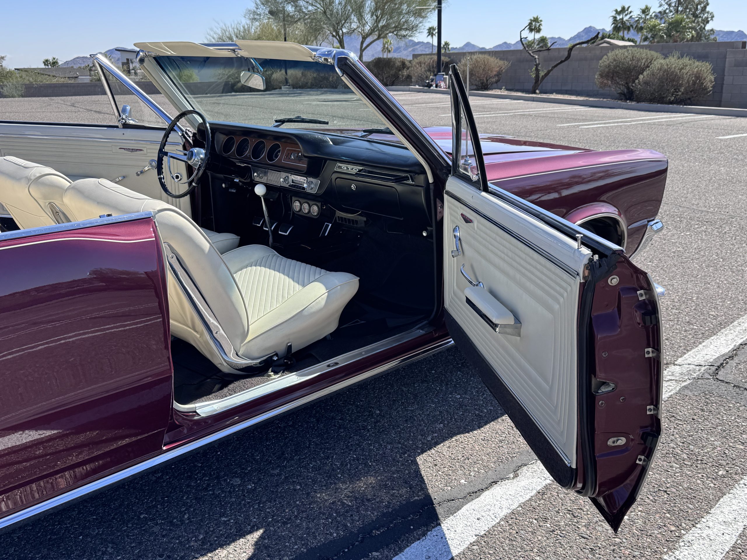 The GTO was assembled at the Fremont, California plant in December 1965 and was originally sold in Placerville, California. This GTO was one of 11,311 GTO convertibles produced for the model year. This GTO was built with the 389ci “WT Code” V8, optioned with the four speed fully synchronized transmission, dual exhausts, deluxe wheel discs, special 7 blade fan and fan clutch, chrome air cleaner covers, chrome rocker arm covers, and the Safe-T-Track rear axle. Additional options include windshield washer & dual speed wipers, visor vanity, inside tilt mirror, outside remote control mirror, door edge guards, soft ray windshield, and back up lamps. A comprehensive frame-off restoration was completed in 2001 to original specifications, including a rebuilt engine and gearbox that had additional transmission and clutch refurbishment in 2006. The current owner purchased the GTO in 2007 adding about 7,000 miles and meticulously maintained the GTO. The Pontiac is accompanied by the original ownership manual, window sticker, history card, maintenance records, and a spare tire.