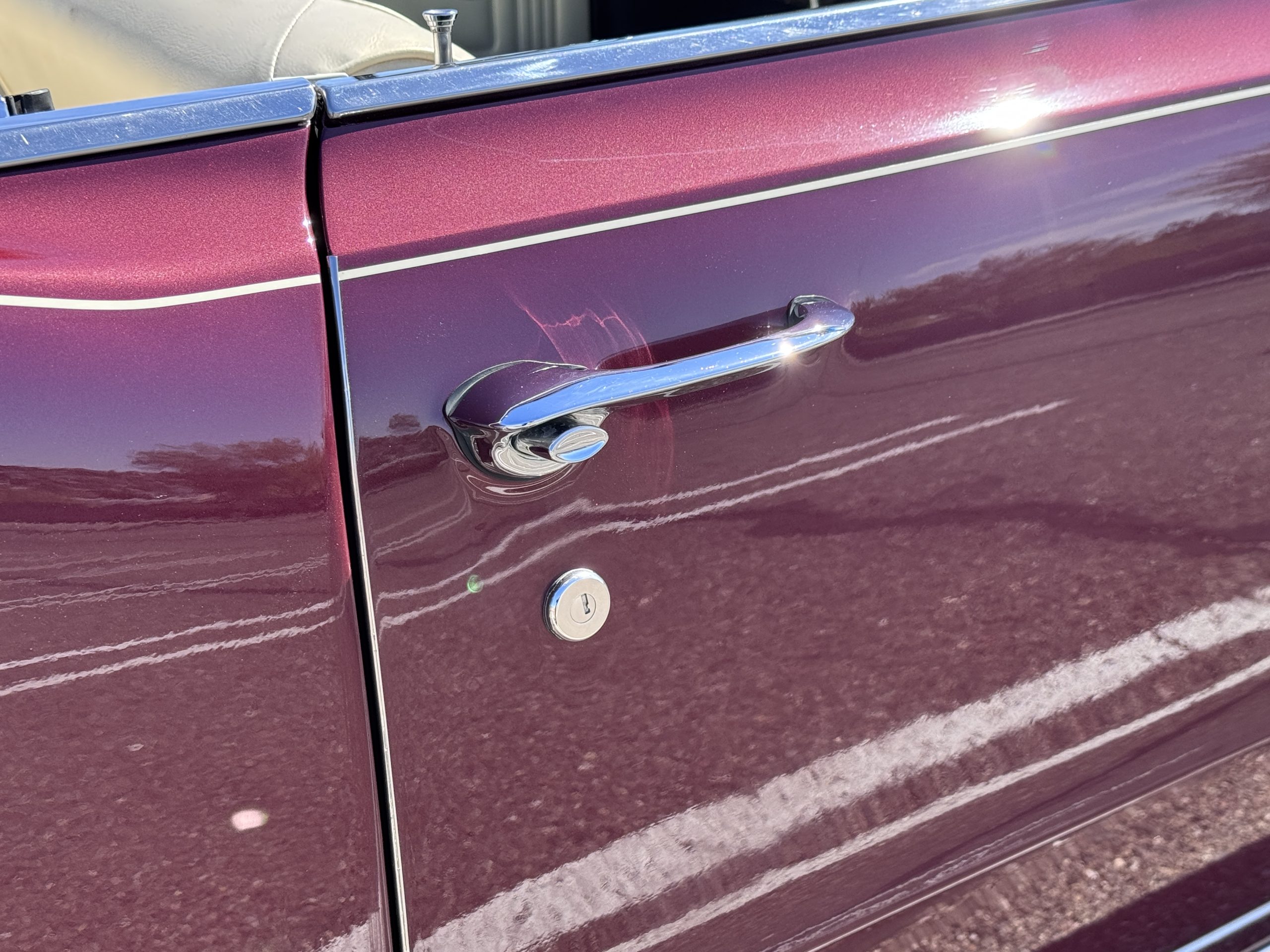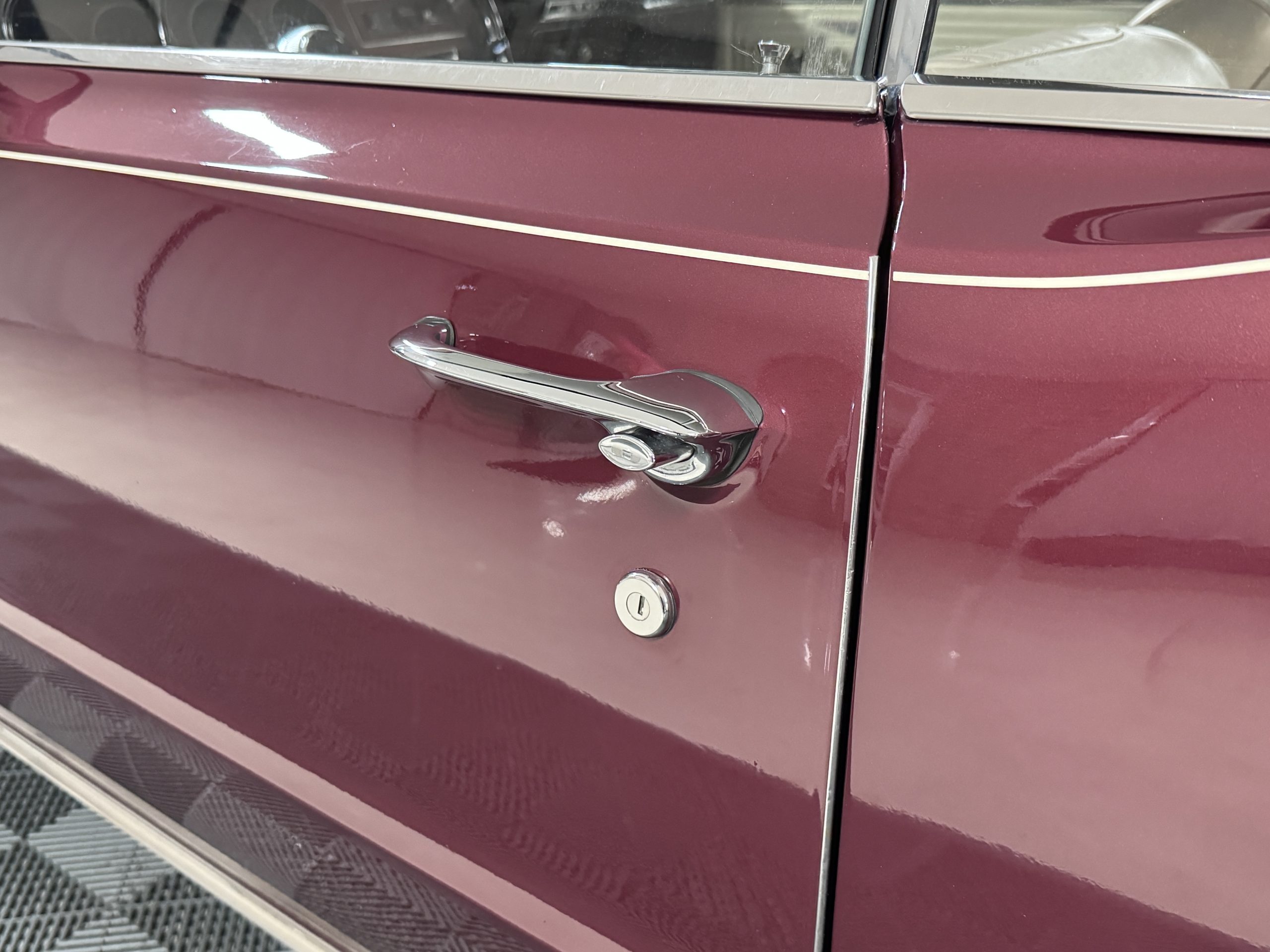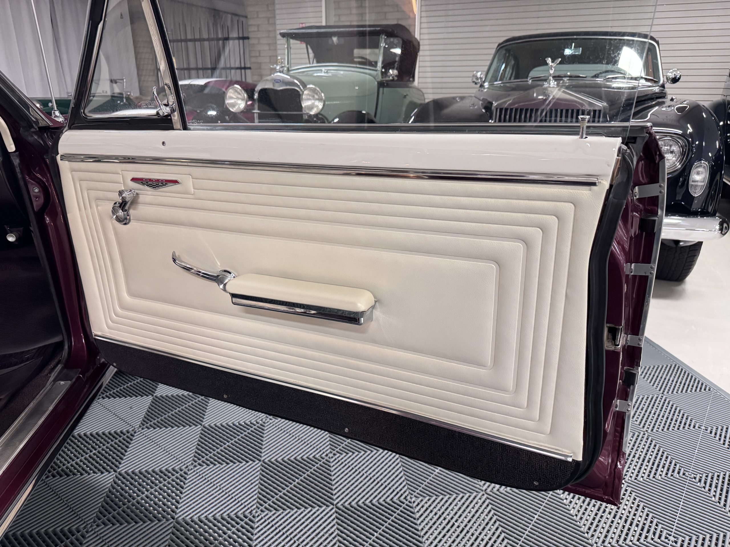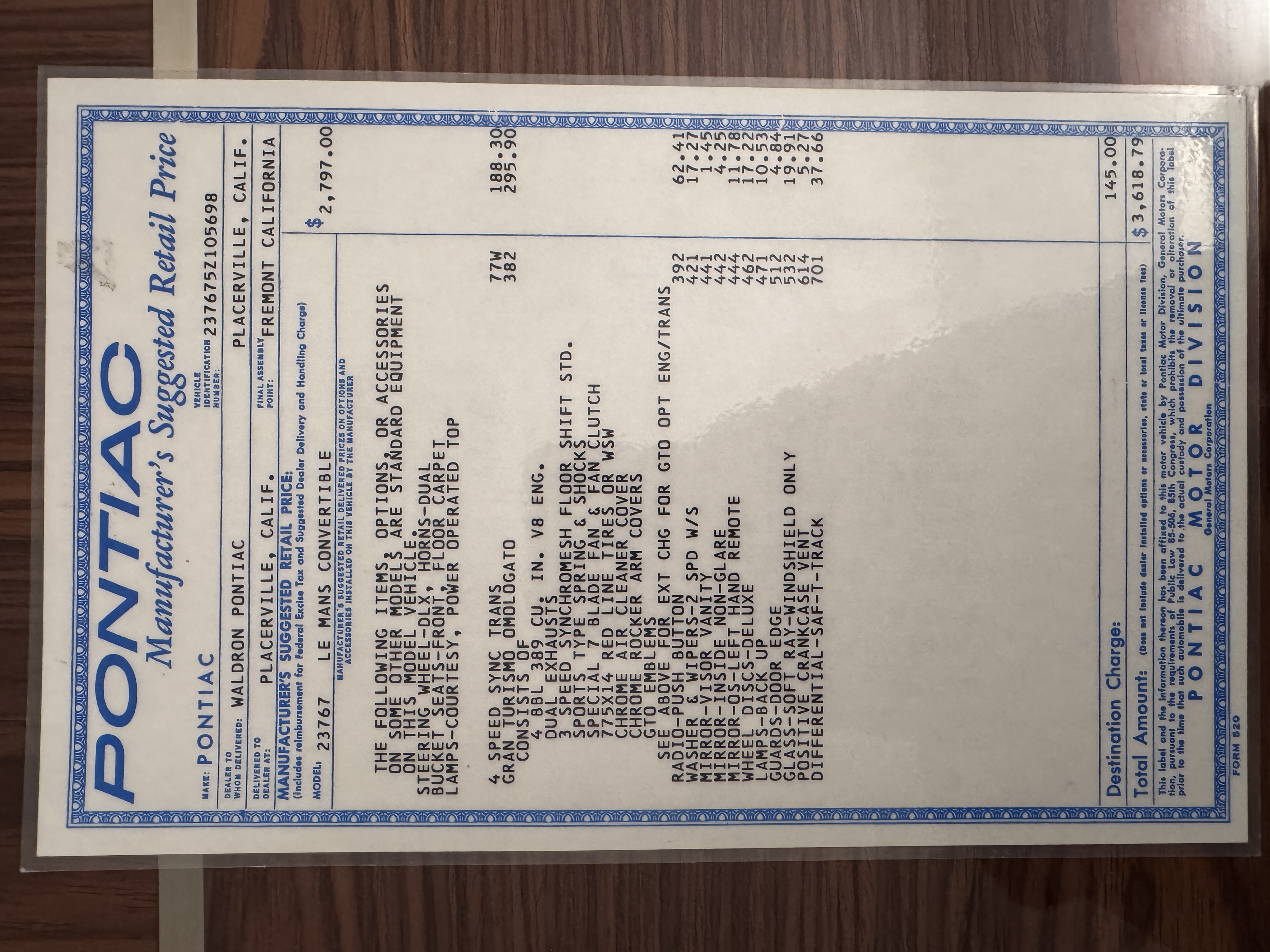 The GTO was assembled at the Fremont, California plant in December 1965 and was originally sold in Placerville, California. This GTO was one of 11,311 GTO convertibles produced for the model year. This GTO was built with the 389ci “WT Code” V8, optioned with the four speed fully synchronized transmission, dual exhausts, deluxe wheel discs, special 7 blade fan and fan clutch, chrome air cleaner covers, chrome rocker arm covers, and the Safe-T-Track rear axle. Additional options include windshield washer & dual speed wipers, visor vanity, inside tilt mirror, outside remote control mirror, door edge guards, soft ray windshield, and back up lamps. A comprehensive frame-off restoration was completed in 2001 to original specifications, including a rebuilt engine and gearbox that had additional transmission and clutch refurbishment in 2006. The current owner purchased the GTO in 2007 adding about 7,000 miles and meticulously maintained the GTO. The Pontiac is accompanied by the original ownership manual, window sticker, history card, maintenance records, and a spare tire.