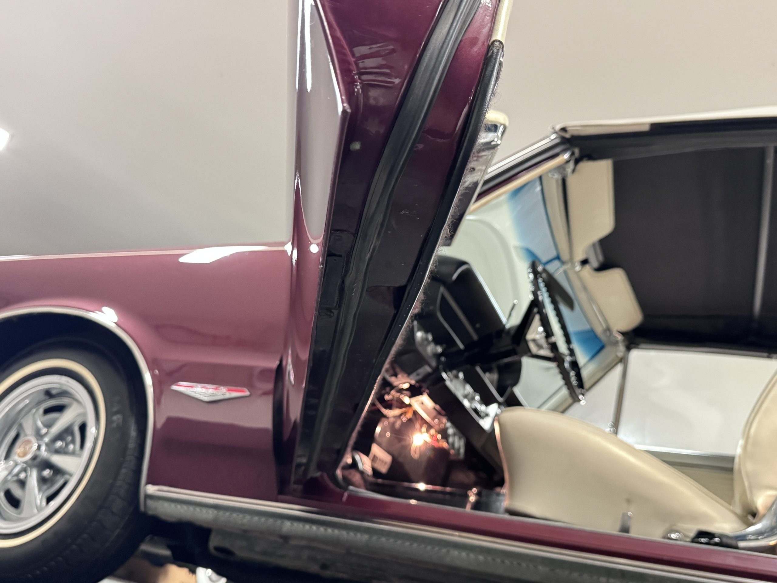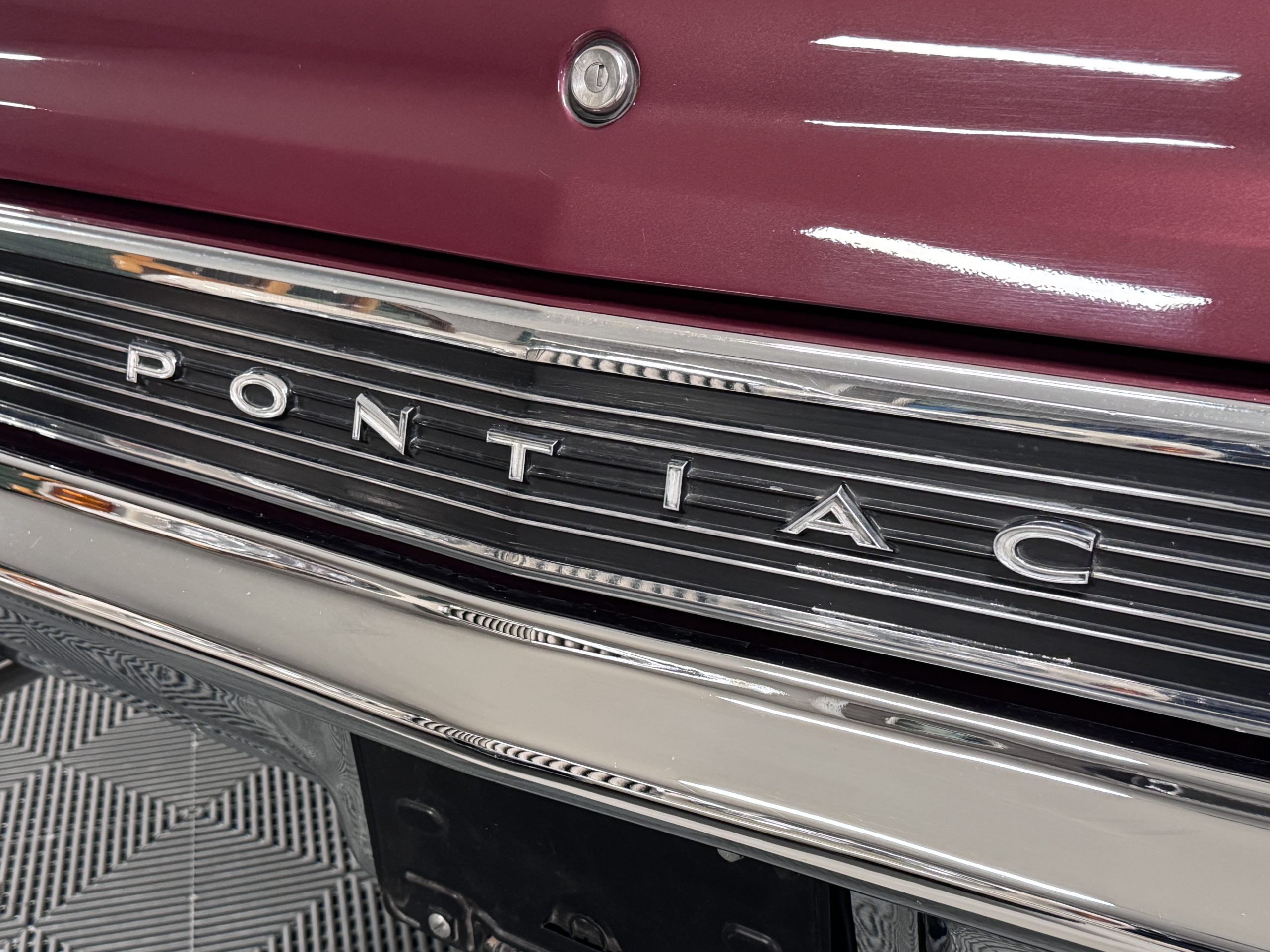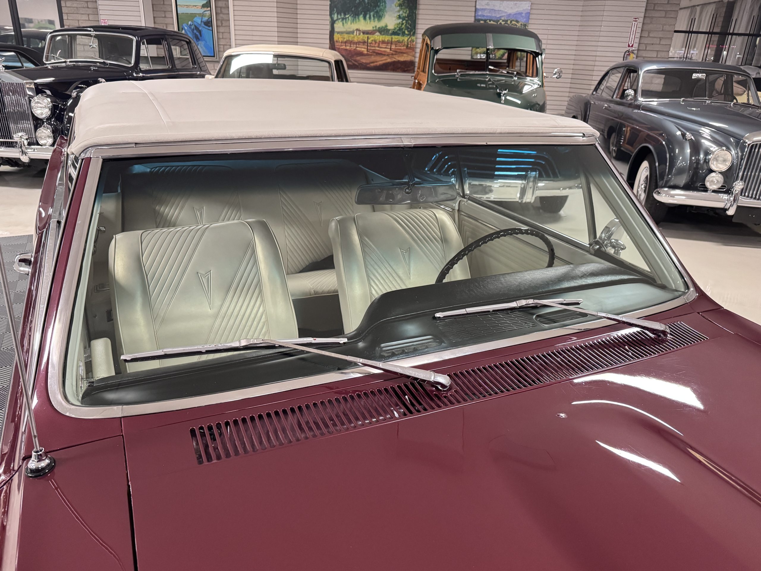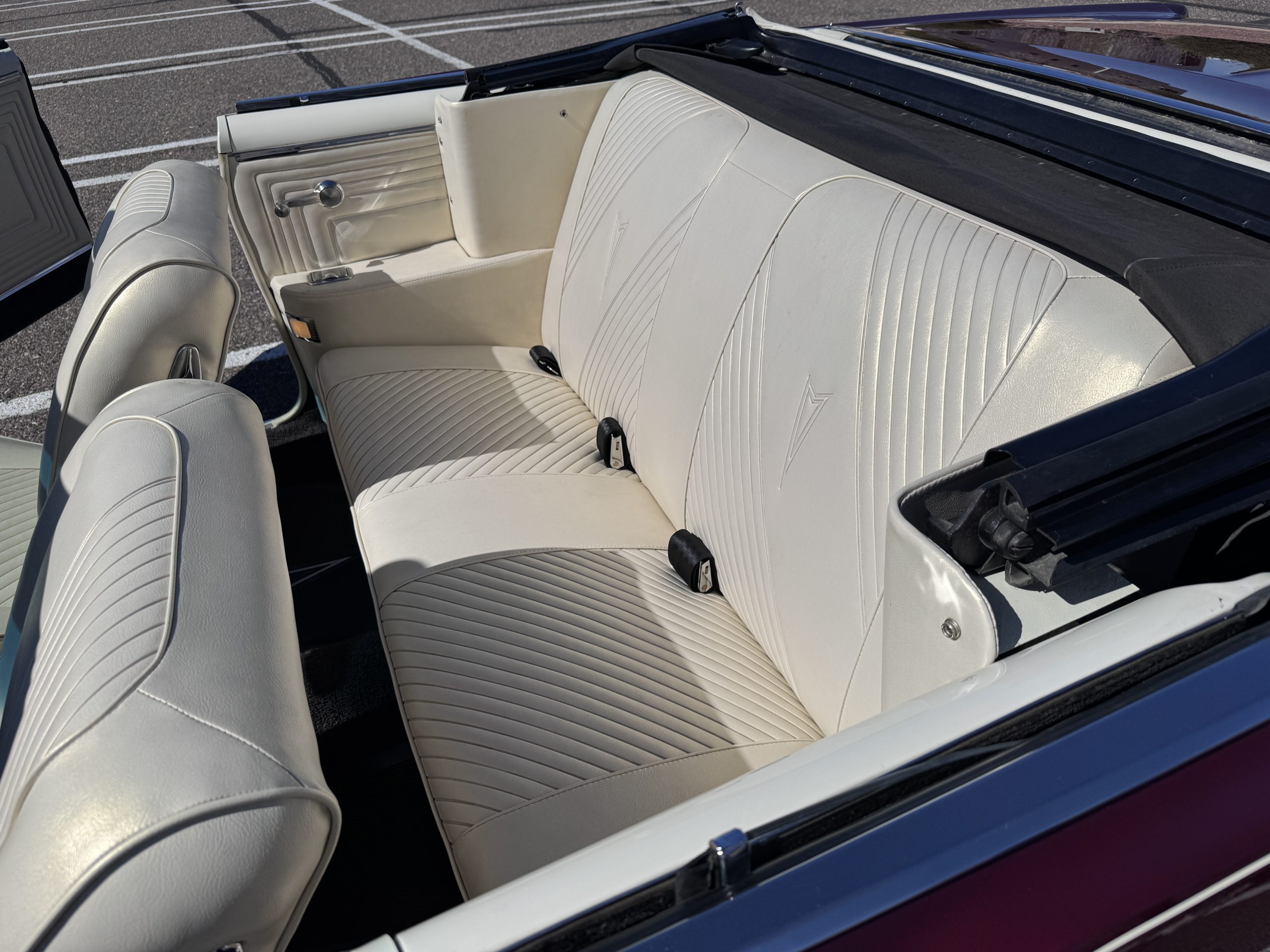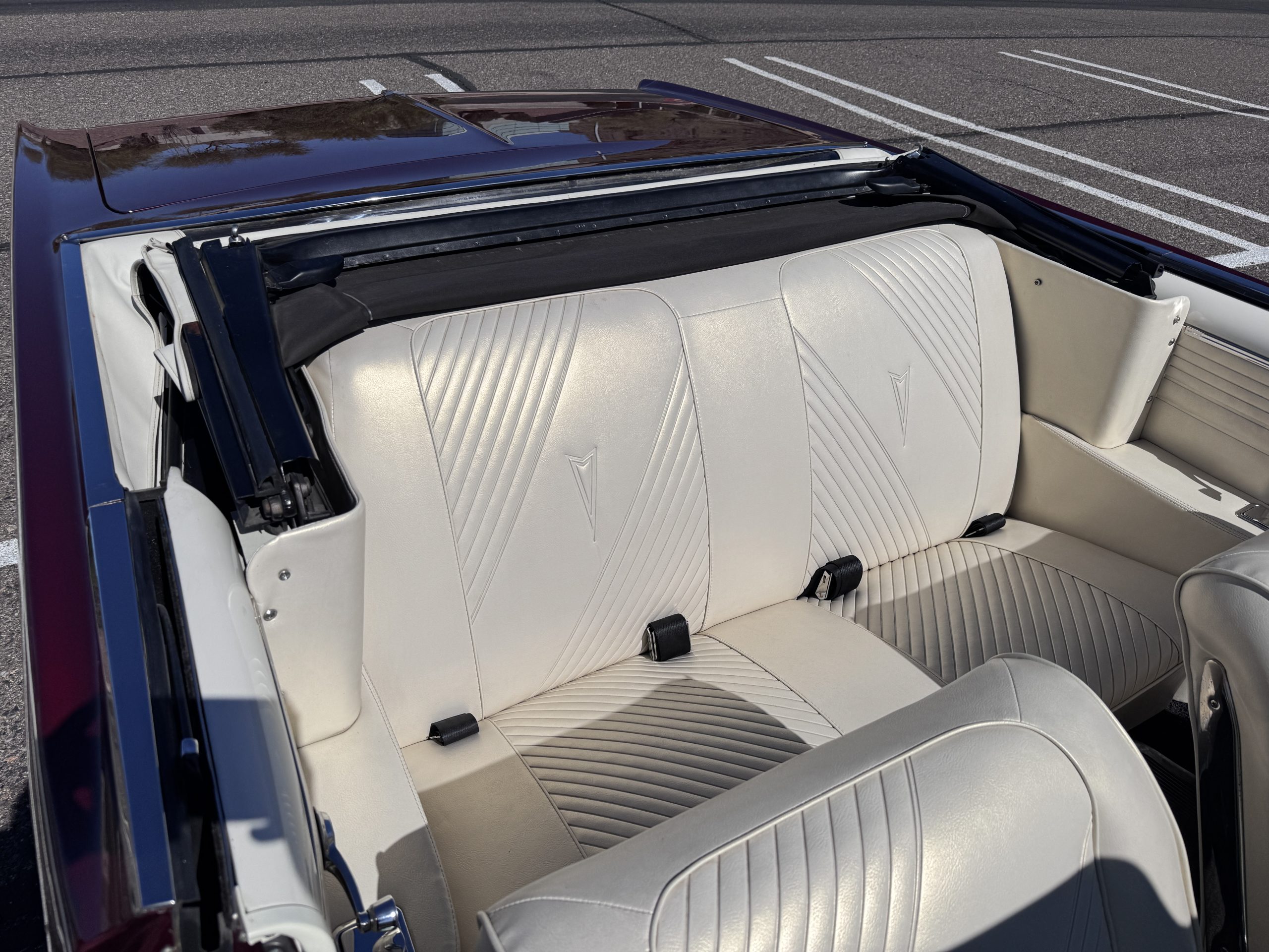 The Pontiac wears Burgundy Red Poly paint (code N) with good gloss and depth, presenting in great overall condition with only minimal areas of wear from normal use. Signature stacked headlights and the split recessed grille are in very good condition, reinforcing the model’s instantly recognizable front-end design. The white convertible top operates via power retraction and presents in great condition, complementing the single hood intake and wraparound taillights, which function as intended. The overall exterior presentation reflects careful stewardship and restoration quality that enhances long-term value.