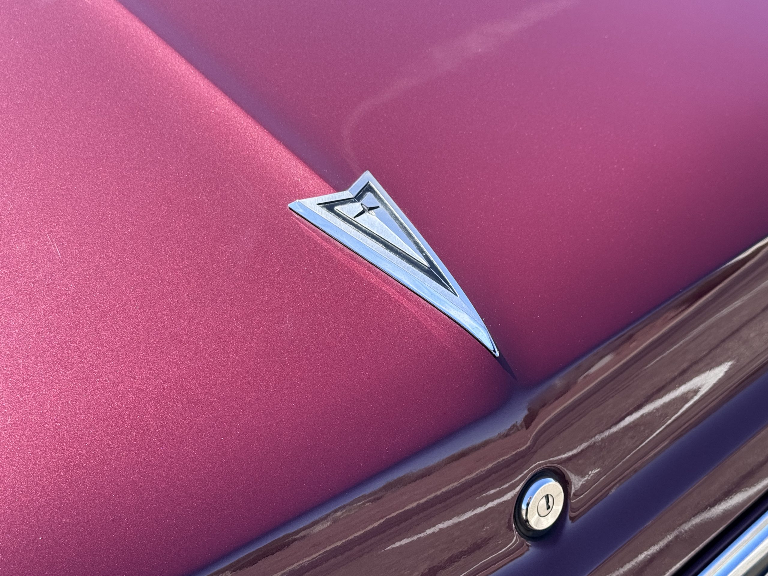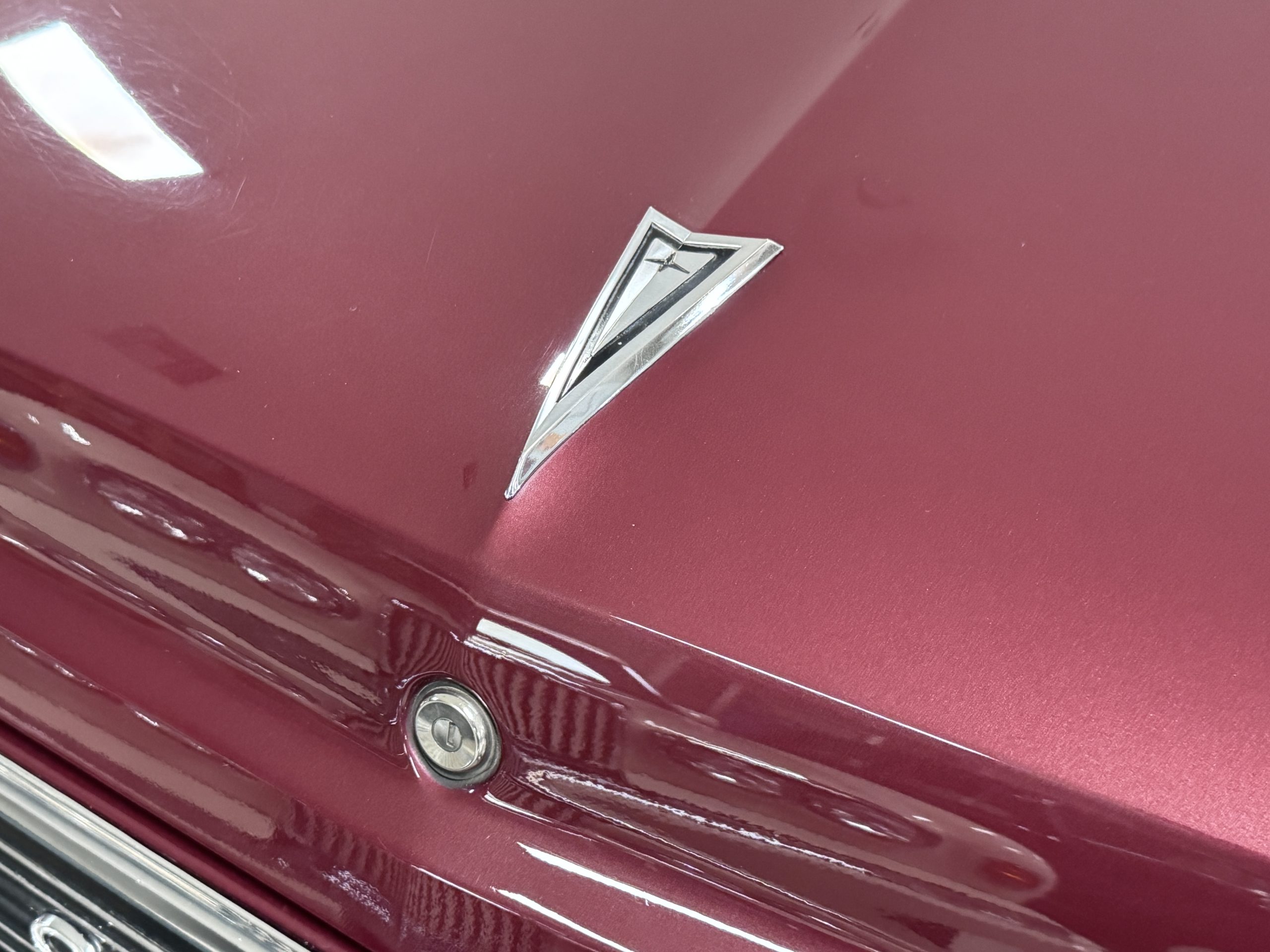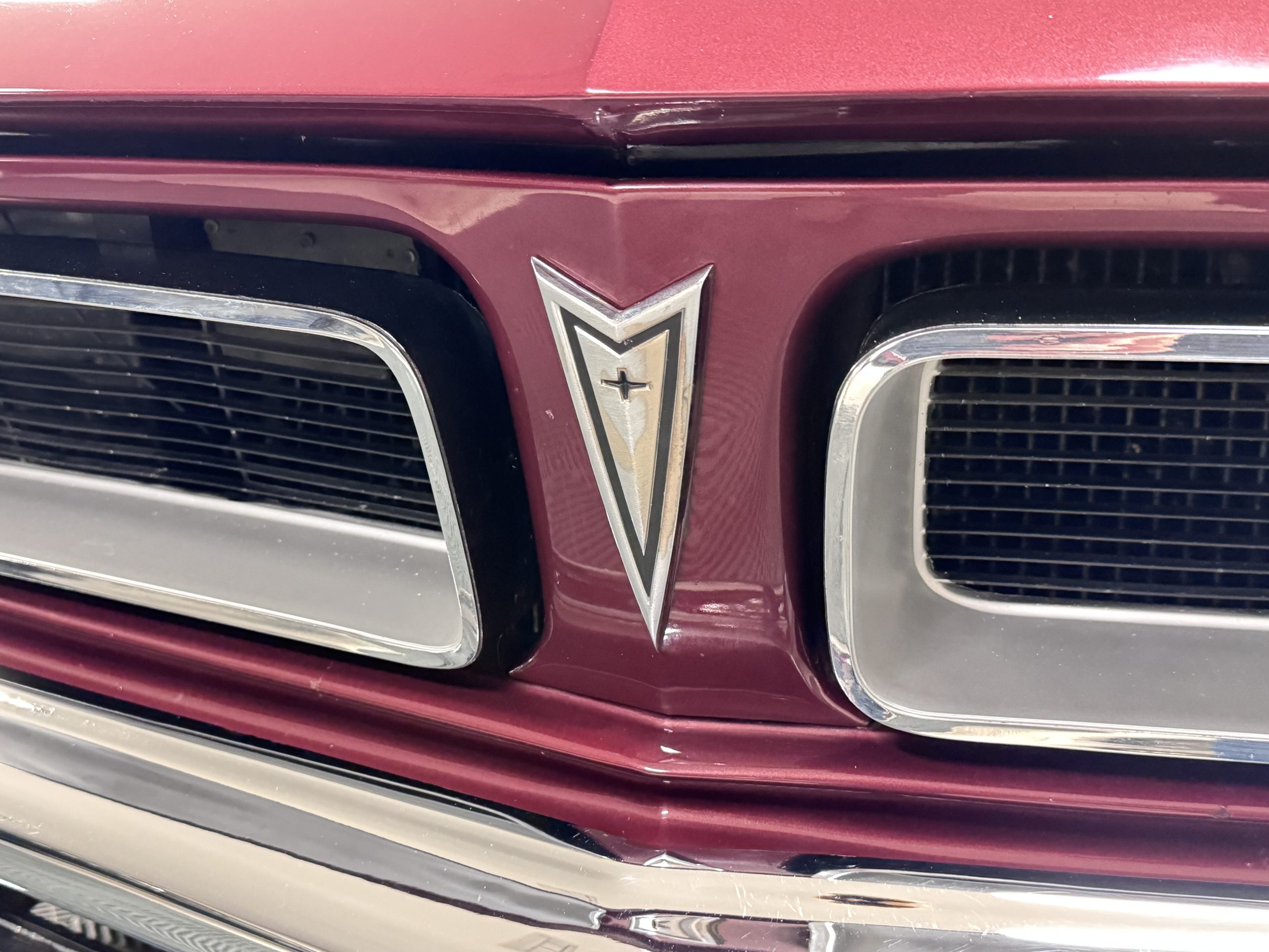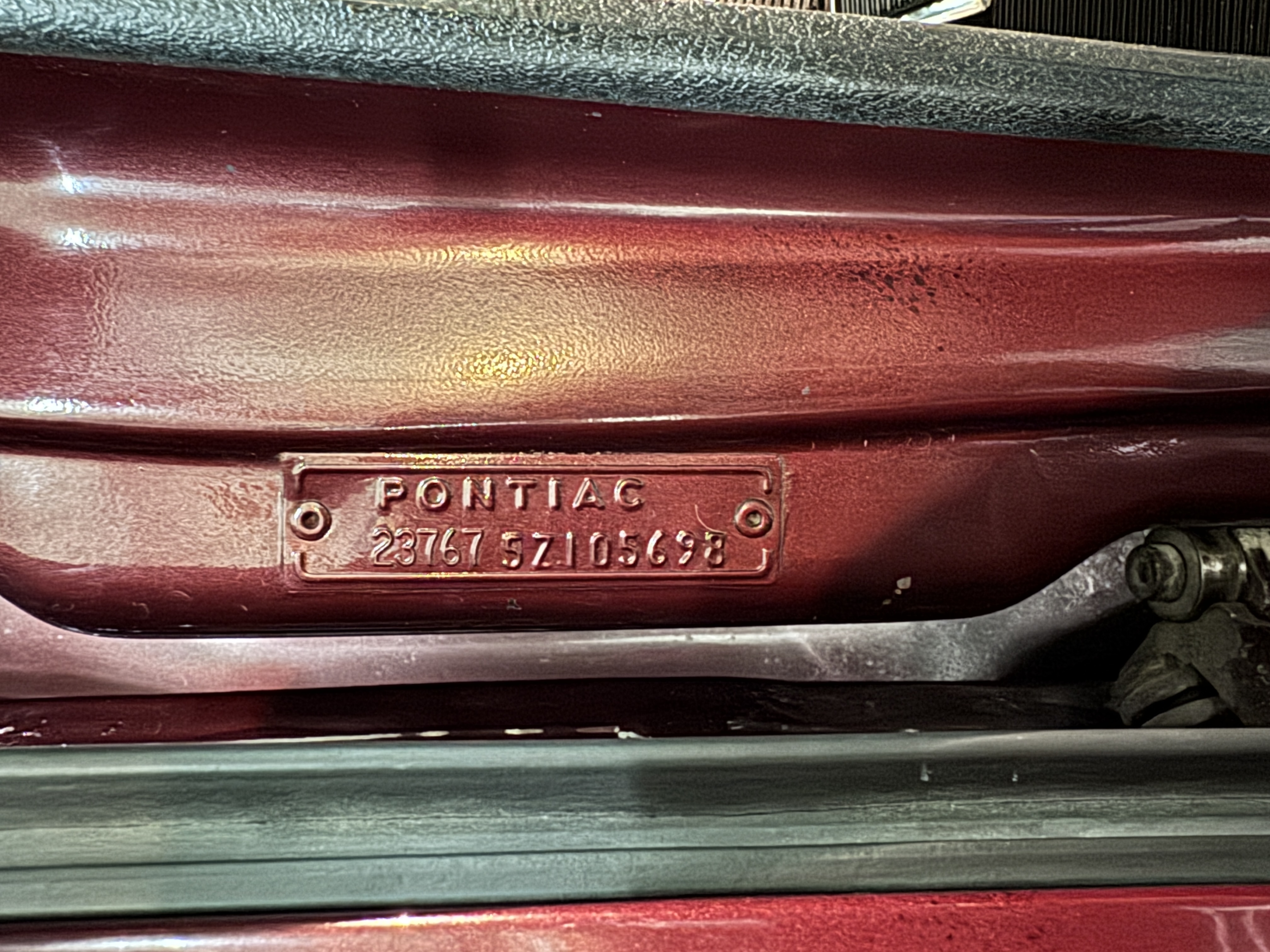 The Pontiac wears Burgundy Red Poly paint (code N) with good gloss and depth, presenting in great overall condition with only minimal areas of wear from normal use. Signature stacked headlights and the split recessed grille are in very good condition, reinforcing the model’s instantly recognizable front-end design. The white convertible top operates via power retraction and presents in great condition, complementing the single hood intake and wraparound taillights, which function as intended. The overall exterior presentation reflects careful stewardship and restoration quality that enhances long-term value.