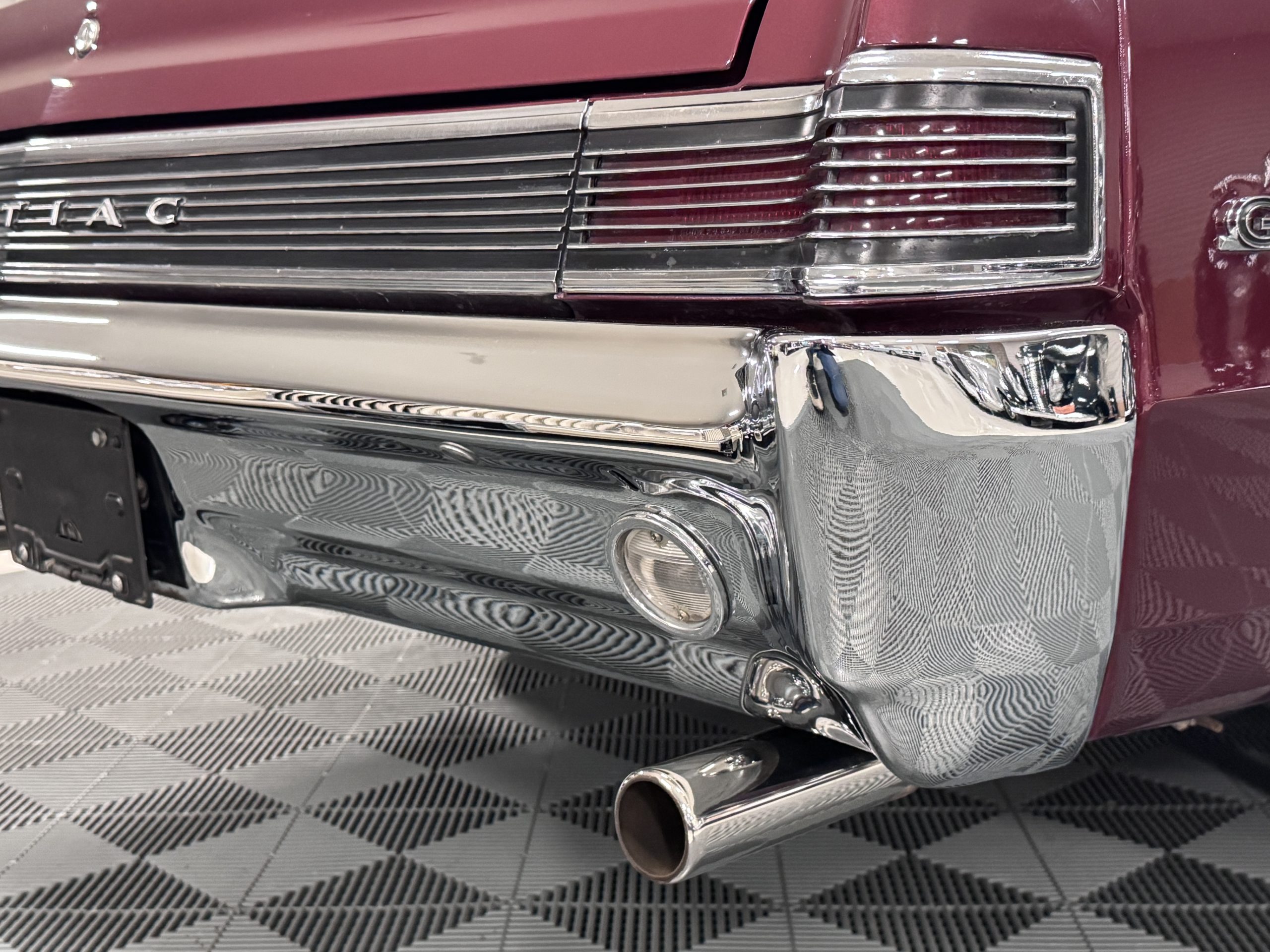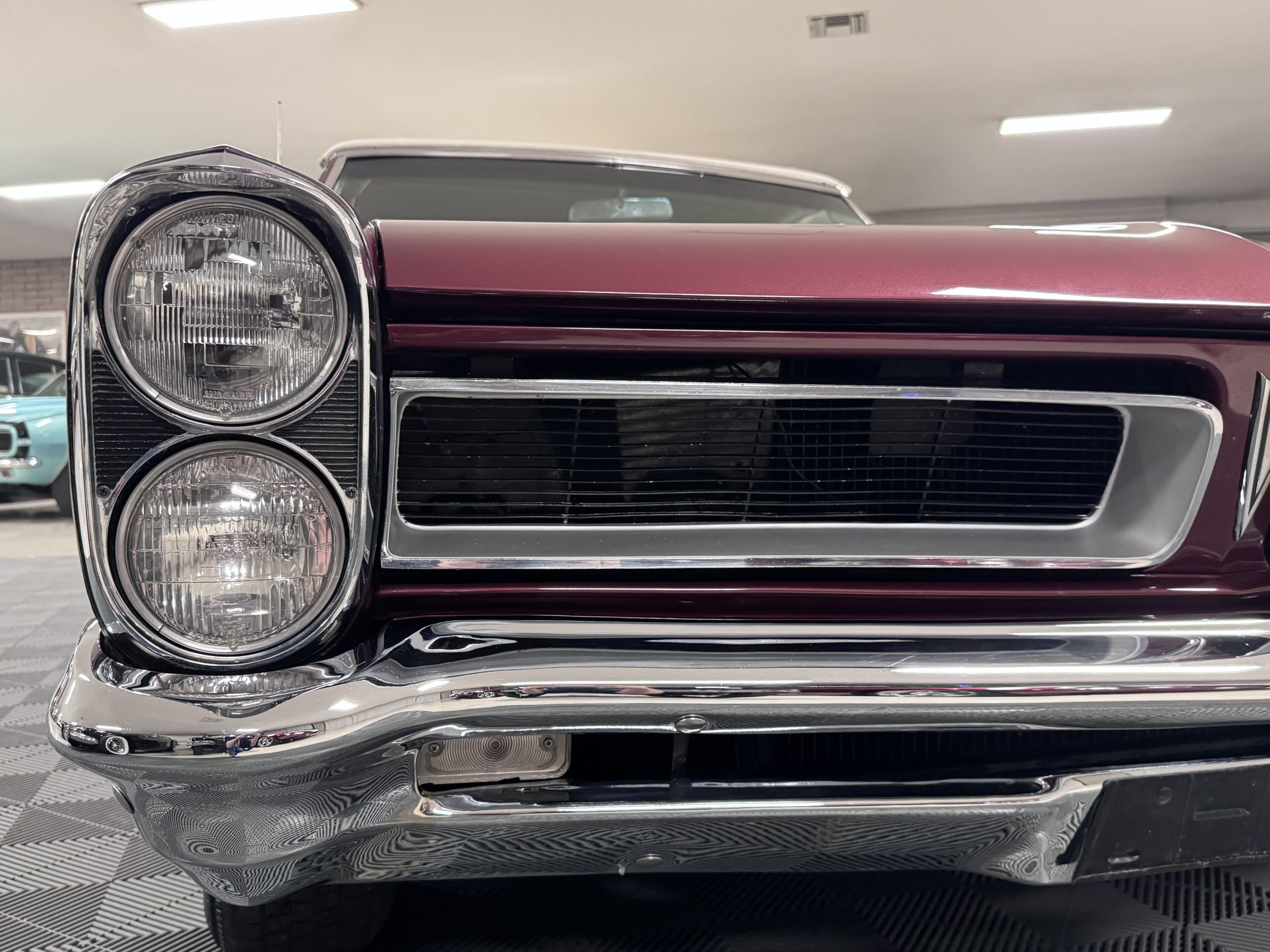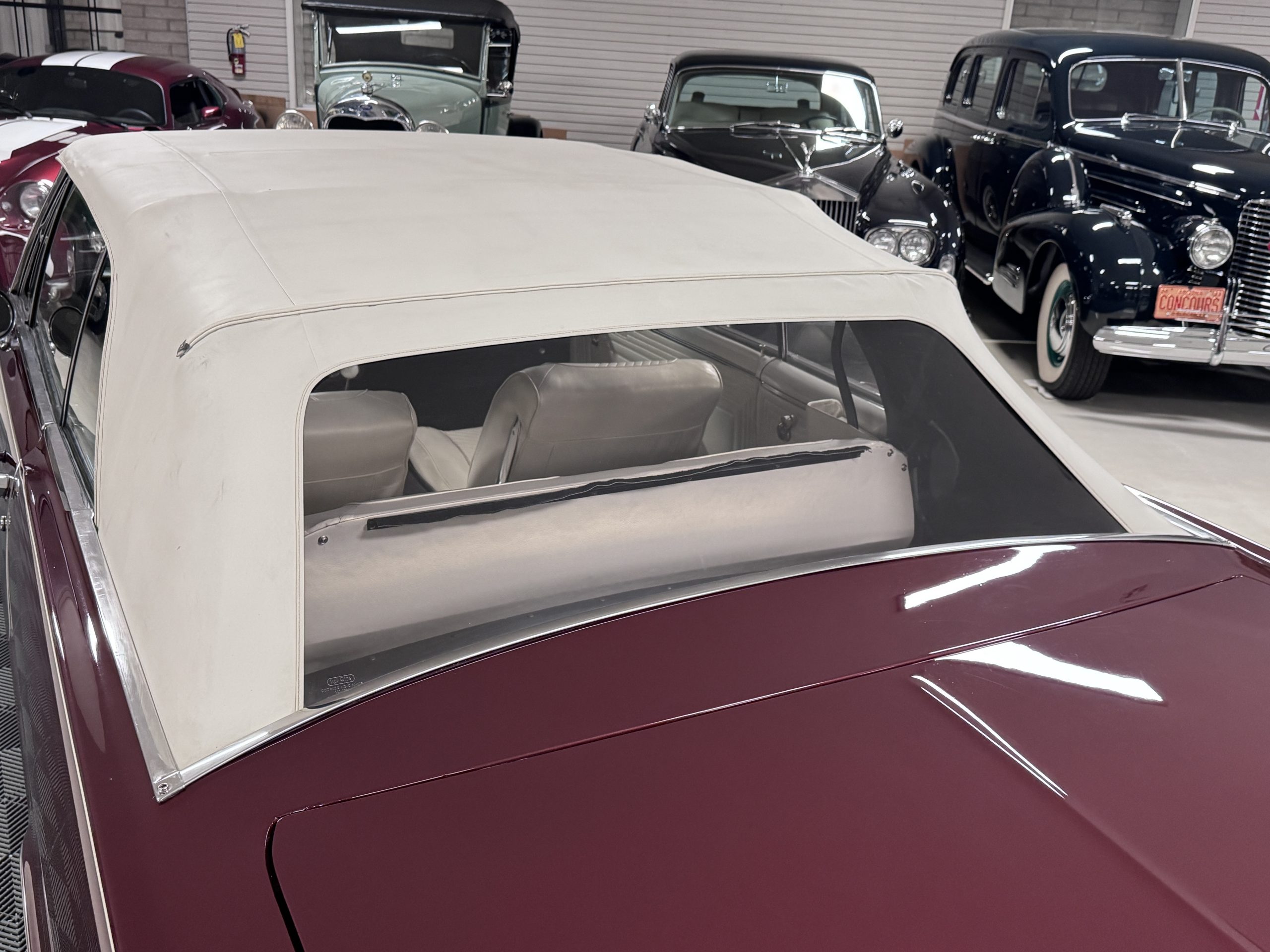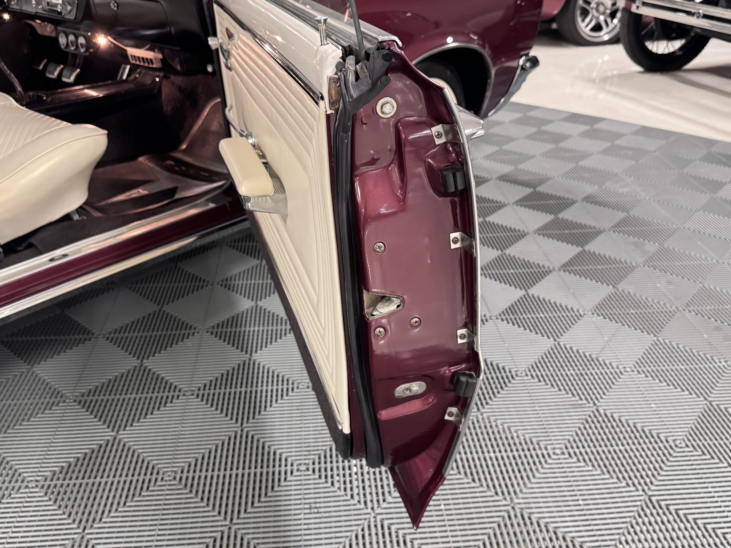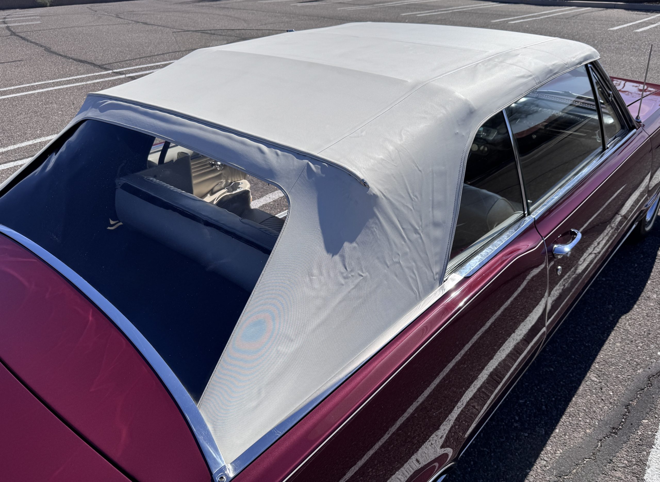 The Pontiac wears Burgundy Red Poly paint (code N) with good gloss and depth, presenting in great overall condition with only minimal areas of wear from normal use. Signature stacked headlights and the split recessed grille are in very good condition, reinforcing the model’s instantly recognizable front-end design. The white convertible top operates via power retraction and presents in great condition, complementing the single hood intake and wraparound taillights, which function as intended. The overall exterior presentation reflects careful stewardship and restoration quality that enhances long-term value.