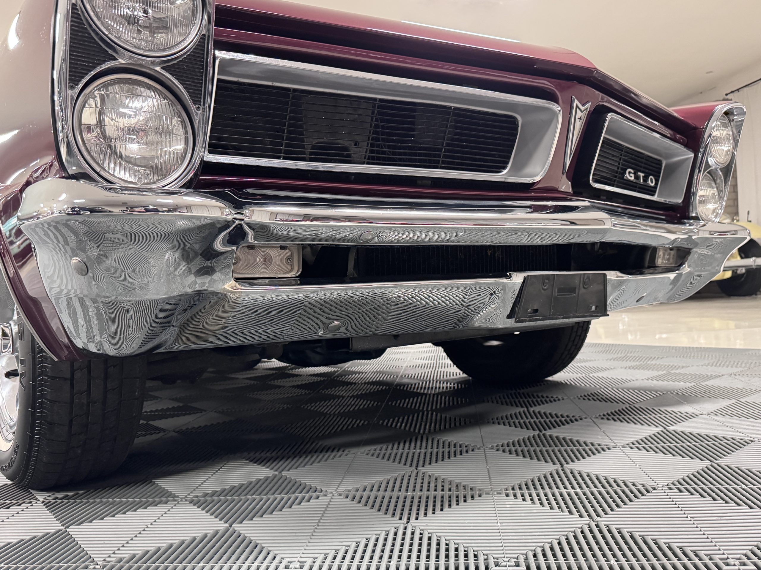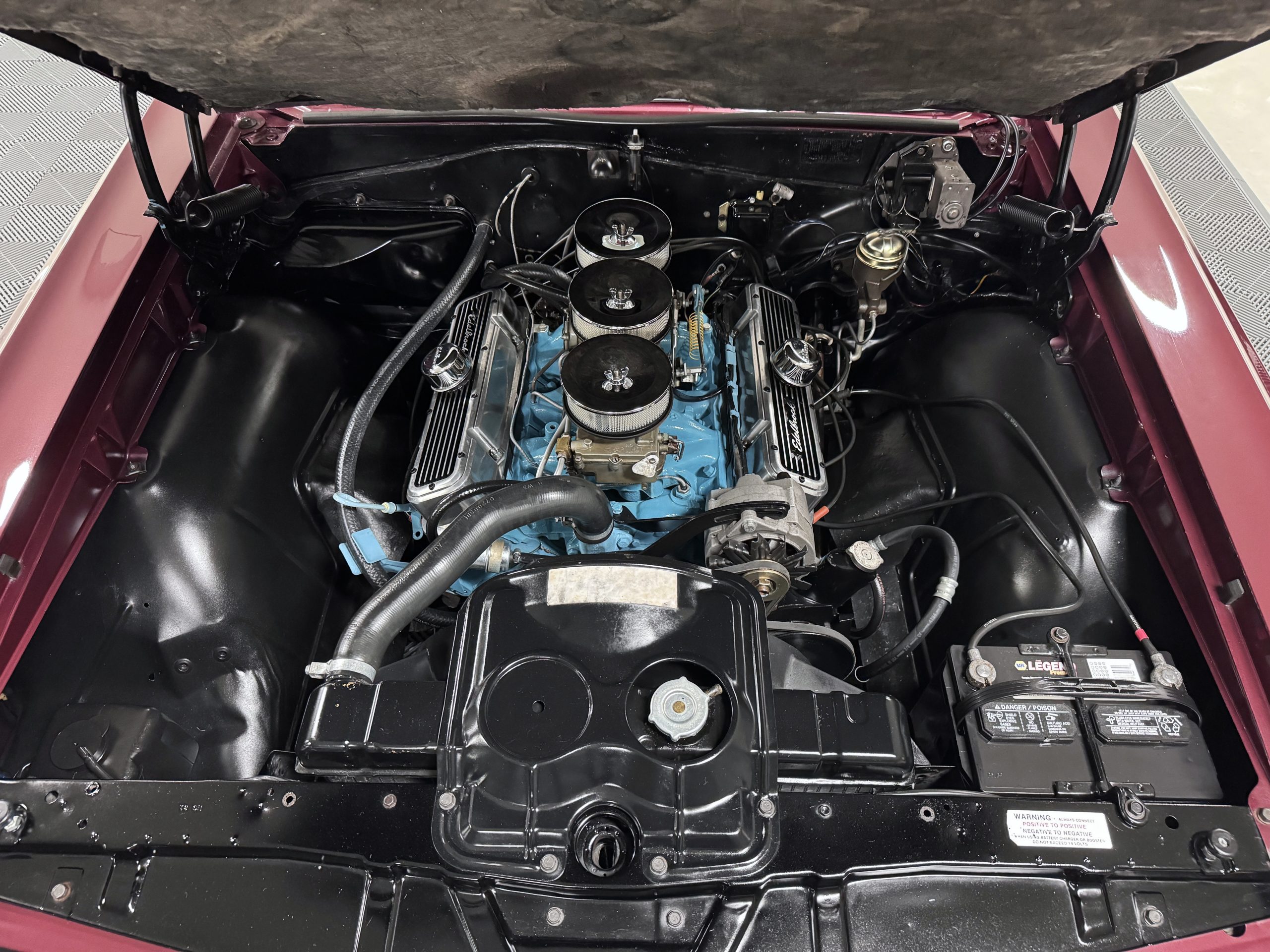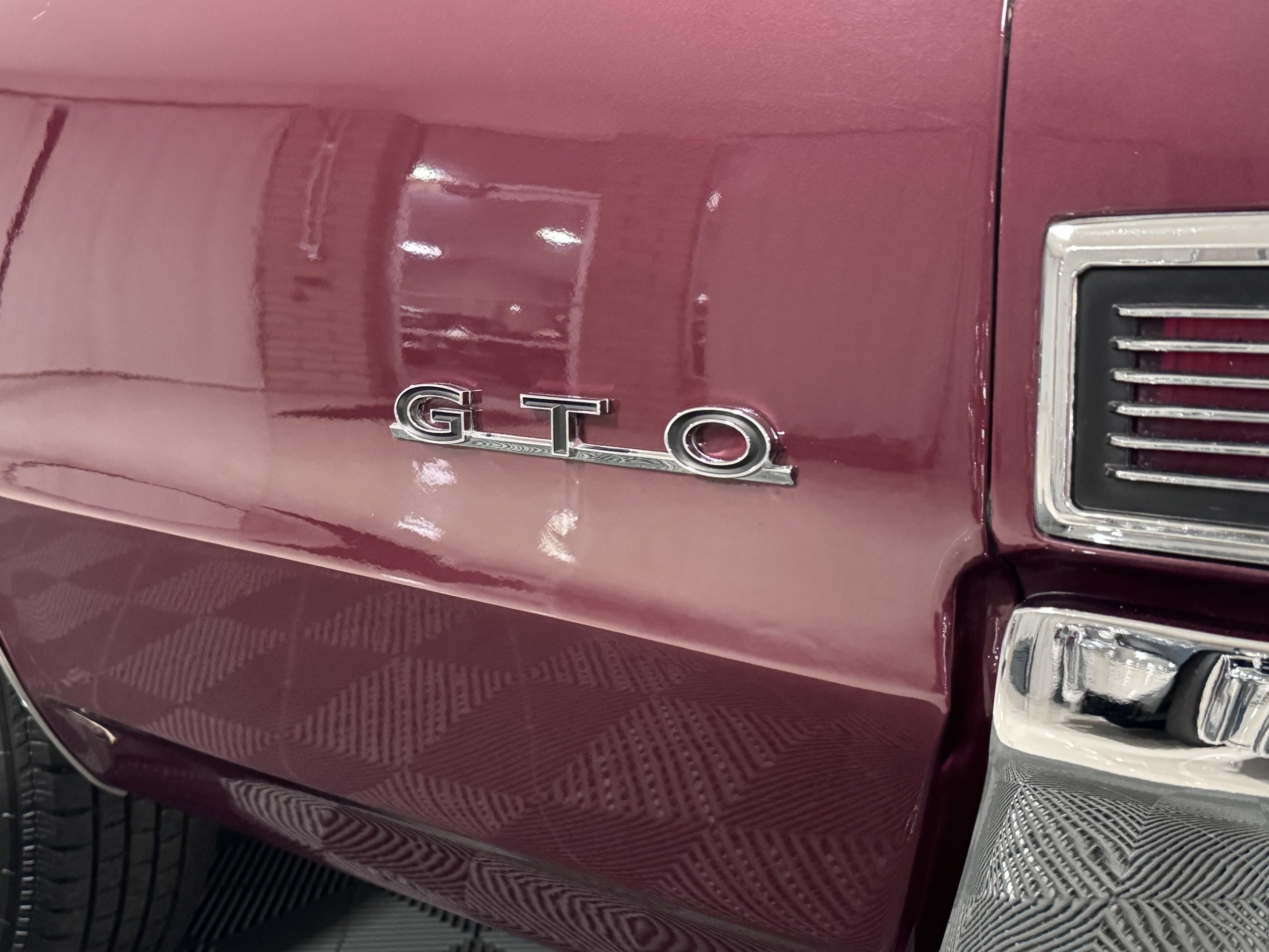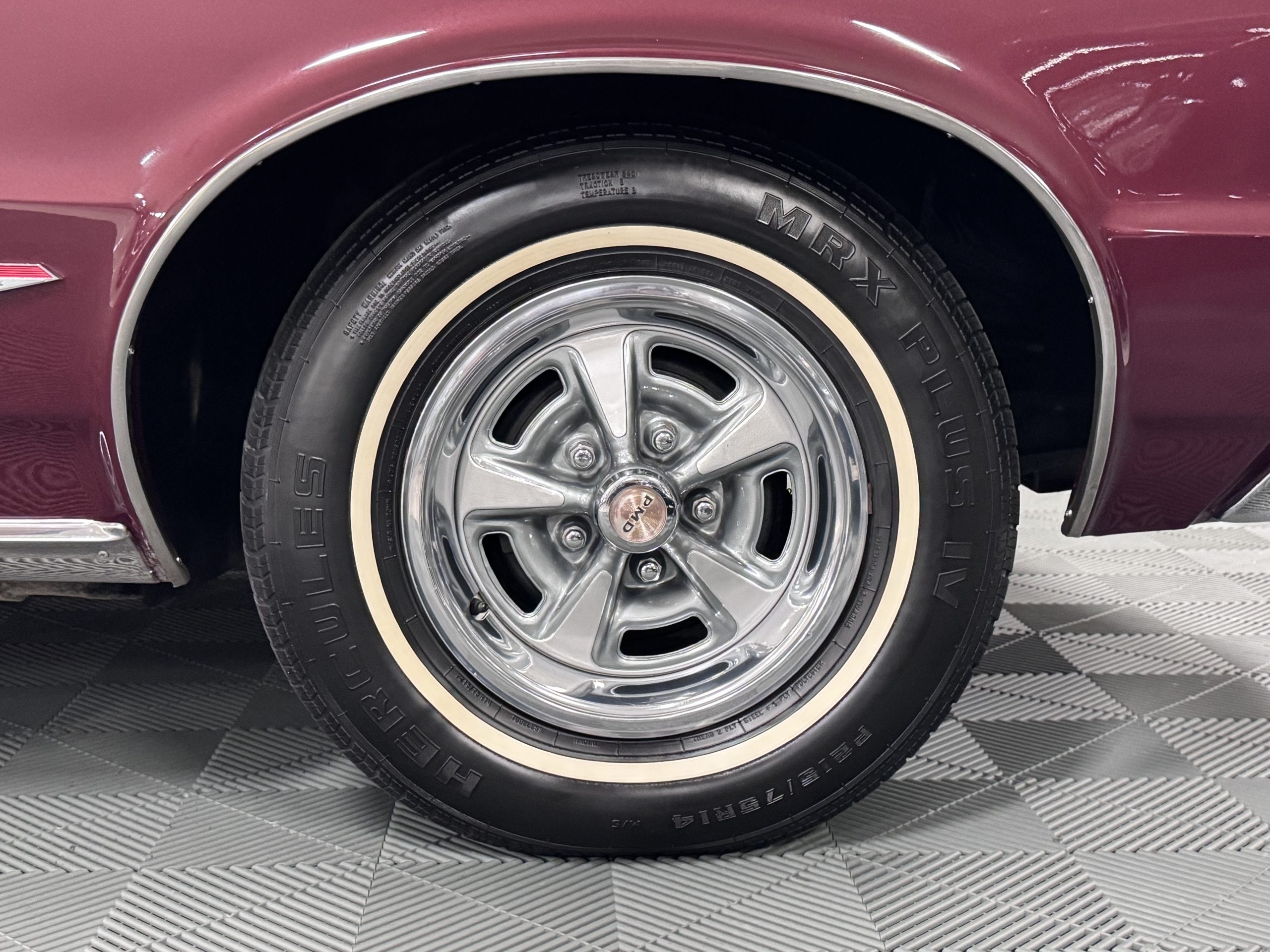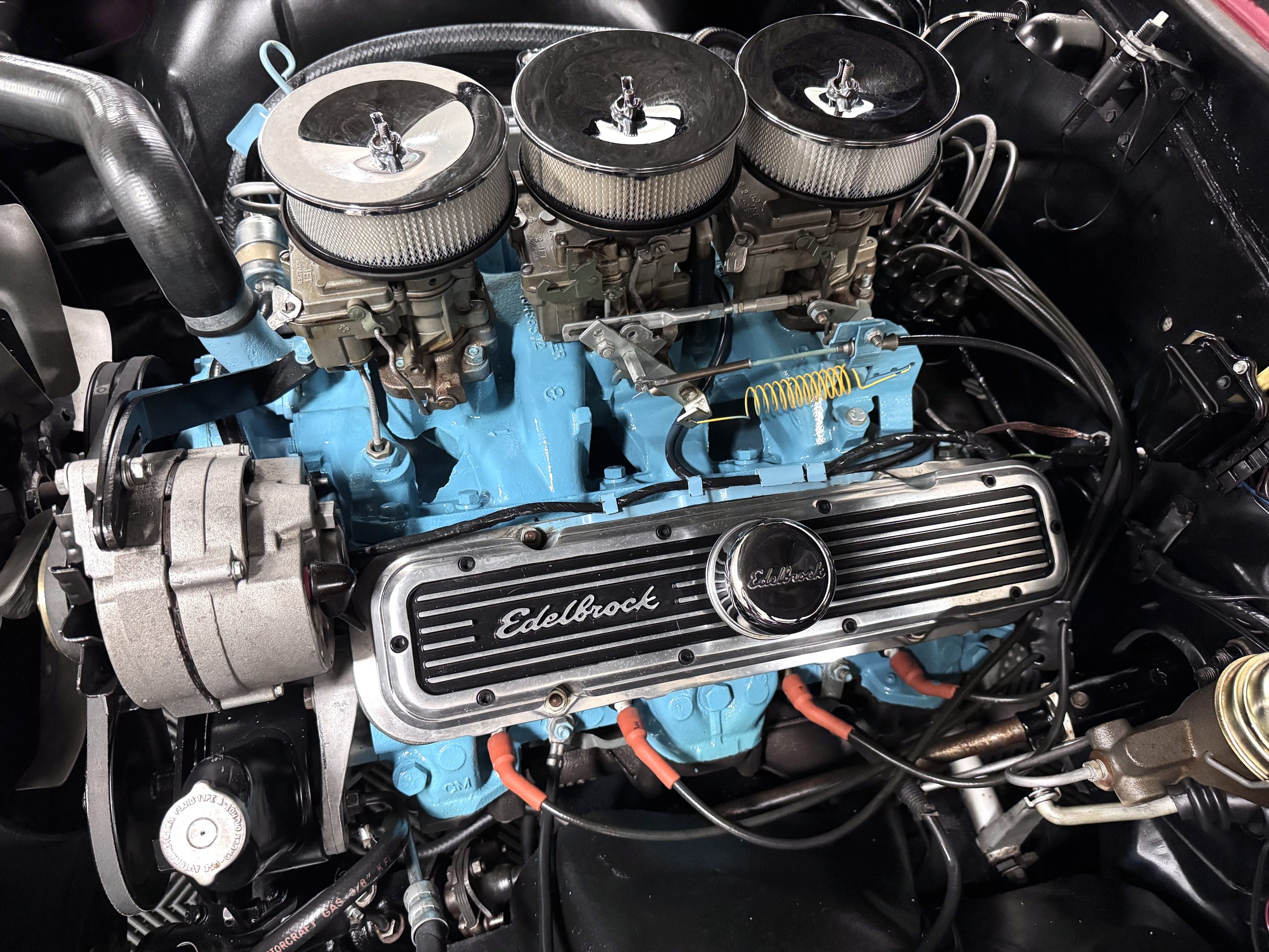 The Pontiac is powered by a WT-code 389 c.i. in V-8 engine with the coveted Tri-Power induction, rated at approximately 335 horsepower. The engine serial number is 633211 with WT stamped on the front of the block and the casting number shows correctly as 9778789. Power is delivered through a four-speed manual synchromesh transmission with Hurst shifter. This GTO has a Flowmaster dual exhaust and an Edelbrock manifold with chrome valve covers and air cleaners. The GTO has its original 3:23 Safe-T-Track limited-slip differential, and the GTO has Delco Moraine self-adjusting drum brakes for all four wheels. The tires are Hercules MRX IV 215/75R14. February 2026 inspection confirms the Pontiac remains in great mechanical order. The restoration work and subsequent servicing position the Pontiac as a strong-driving example that balances authenticity with usability.