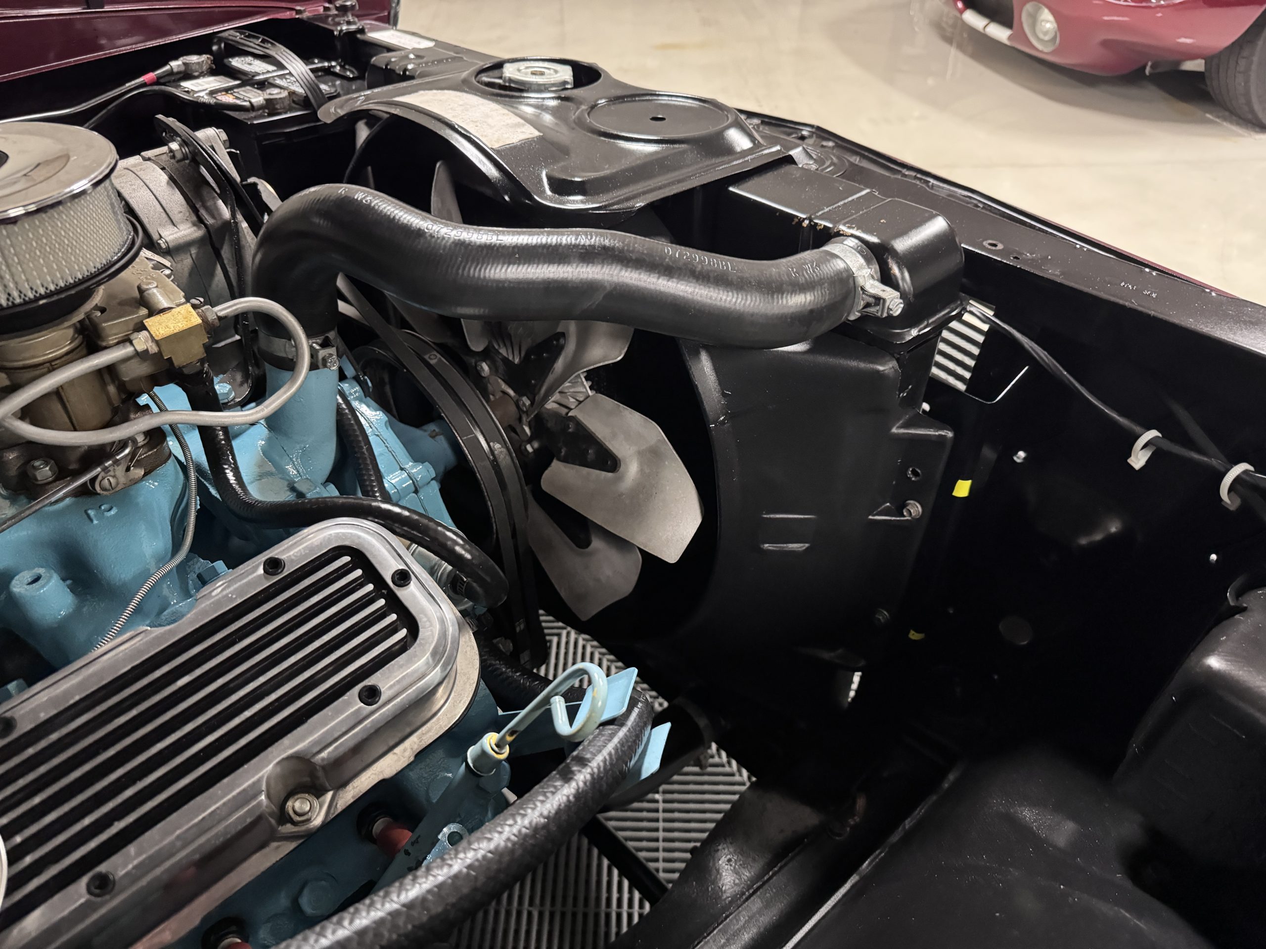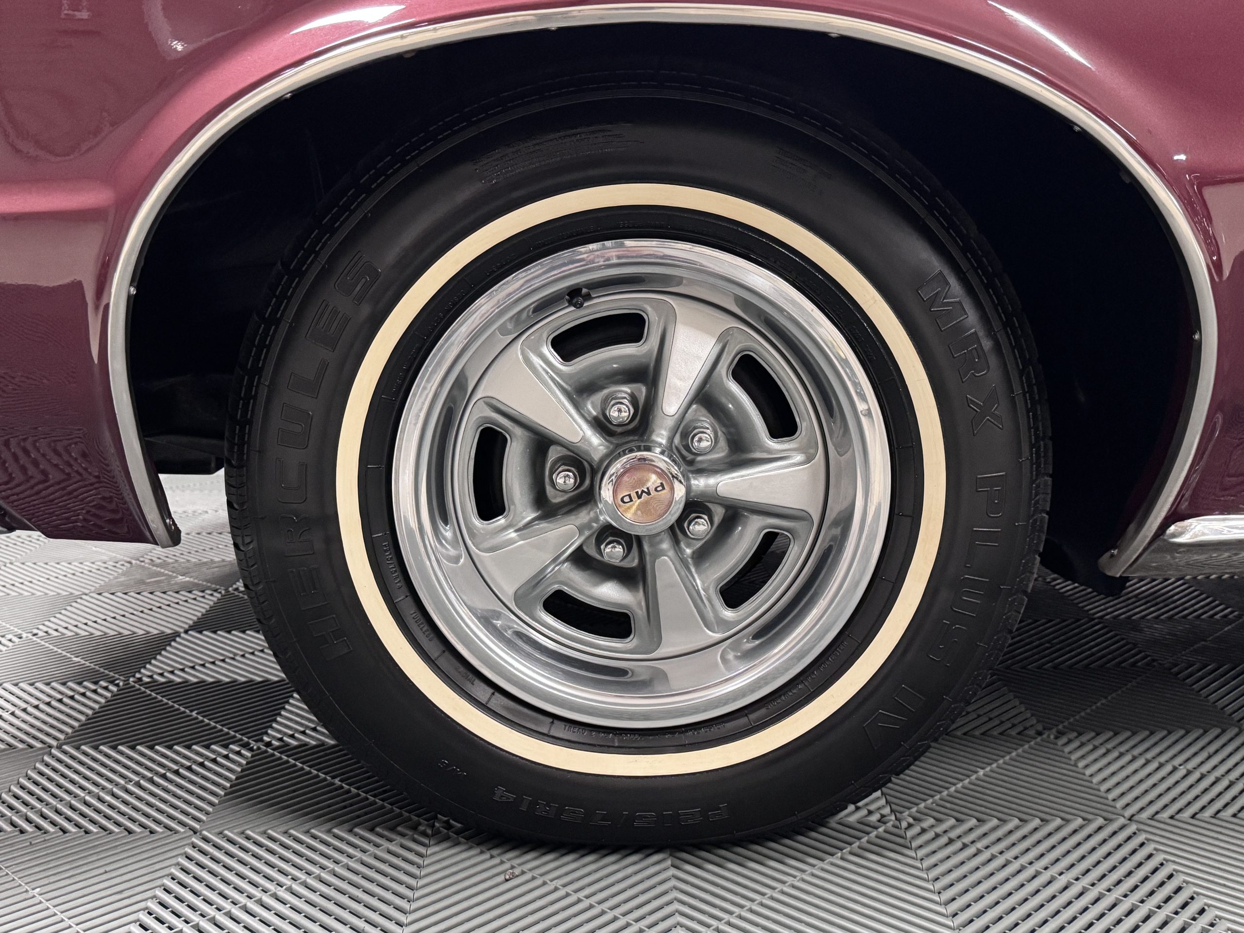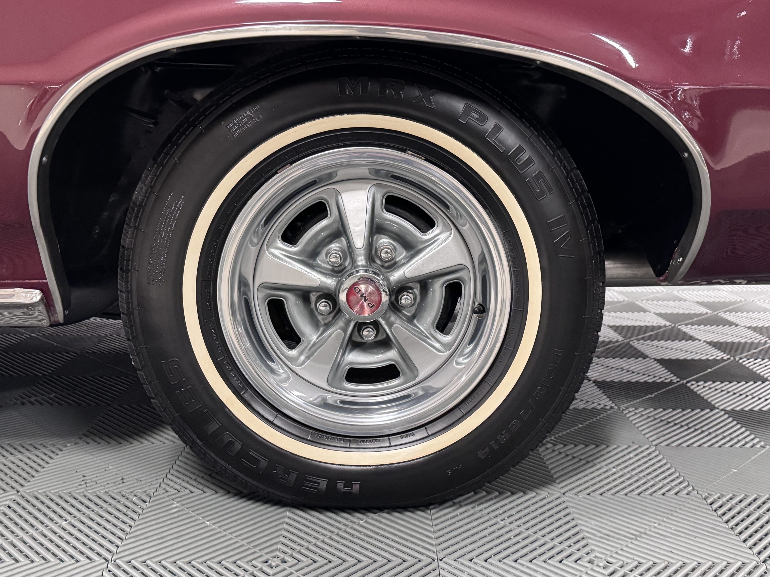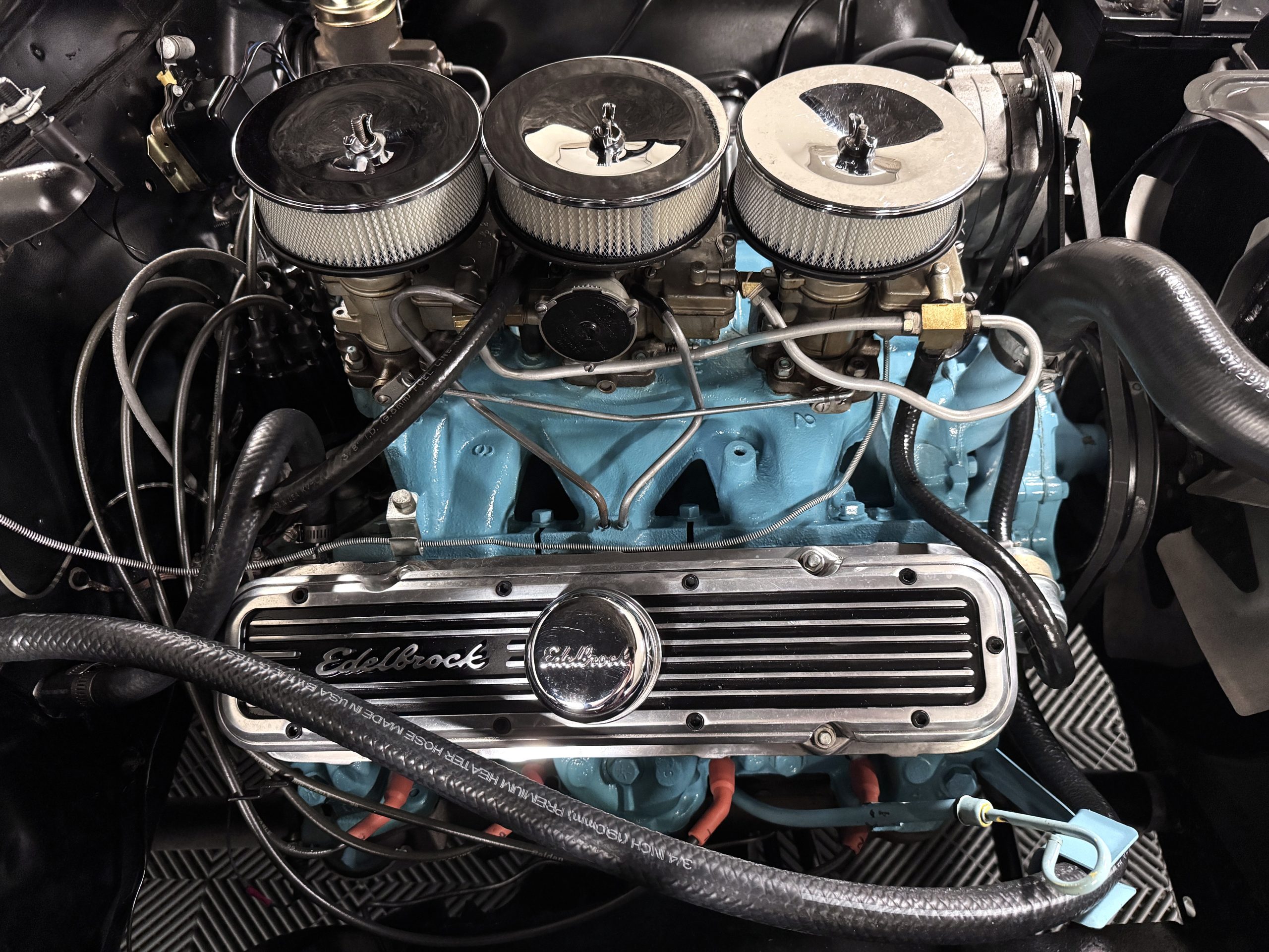 The Pontiac is powered by a WT-code 389 c.i. in V-8 engine with the coveted Tri-Power induction, rated at approximately 335 horsepower. The engine serial number is 633211 with WT stamped on the front of the block and the casting number shows correctly as 9778789. Power is delivered through a four-speed manual synchromesh transmission with Hurst shifter. This GTO has a Flowmaster dual exhaust and an Edelbrock manifold with chrome valve covers and air cleaners. The GTO has its original 3:23 Safe-T-Track limited-slip differential, and the GTO has Delco Moraine self-adjusting drum brakes for all four wheels. The tires are Hercules MRX IV 215/75R14. February 2026 inspection confirms the Pontiac remains in great mechanical order. The restoration work and subsequent servicing position the Pontiac as a strong-driving example that balances authenticity with usability.