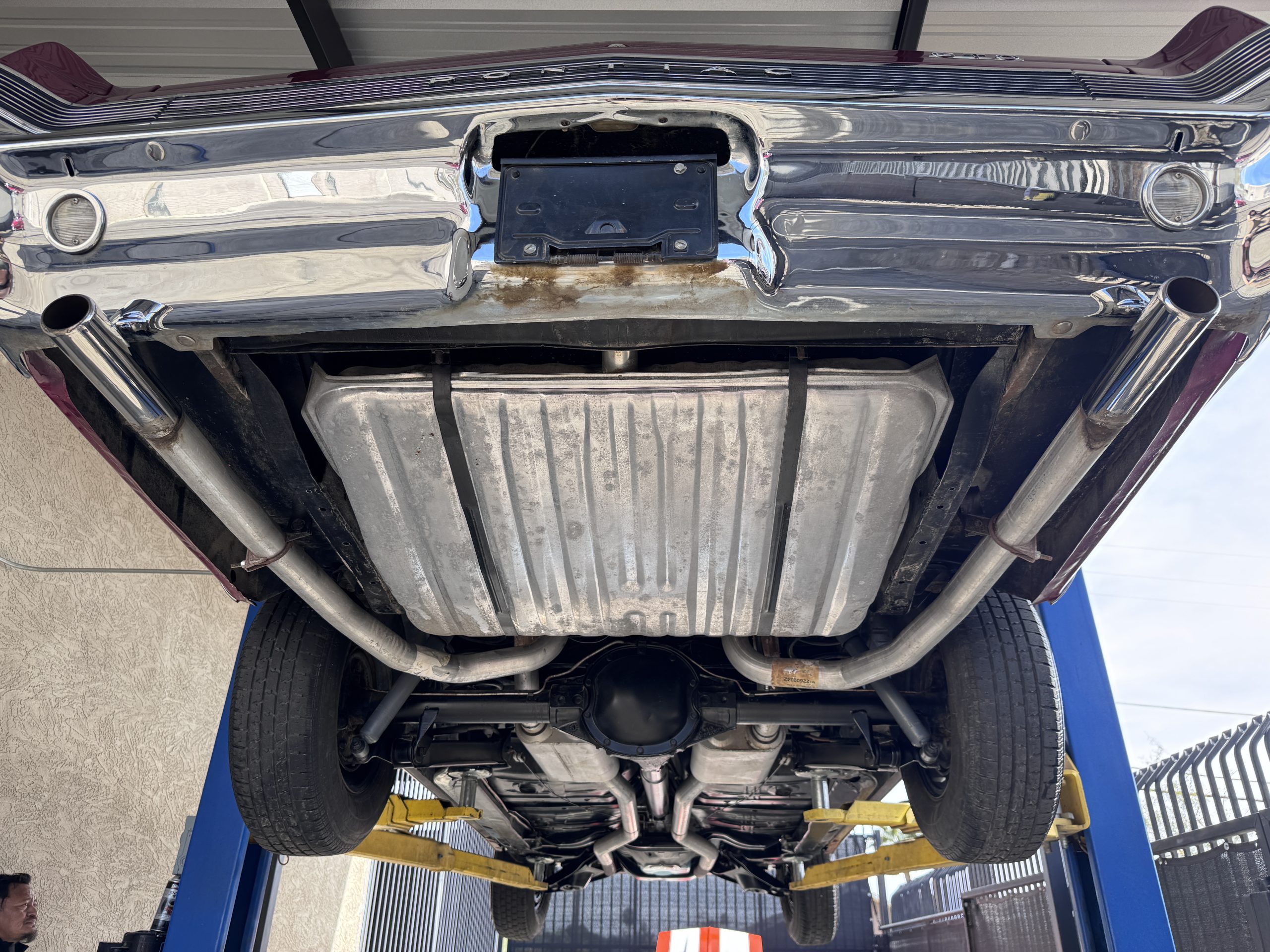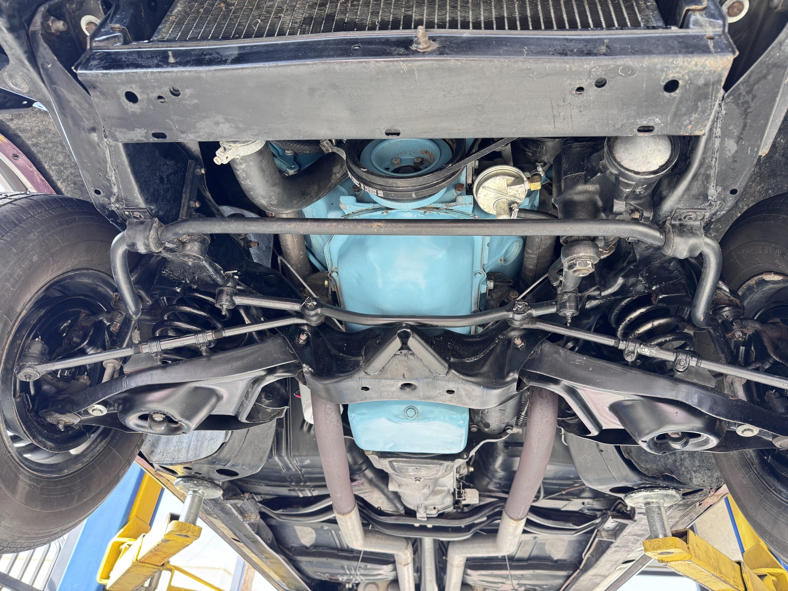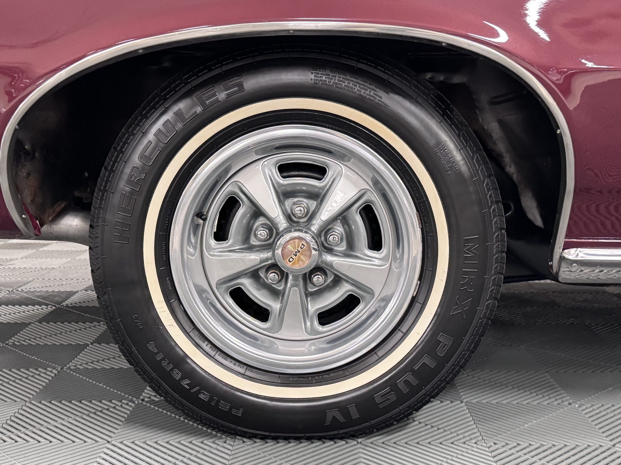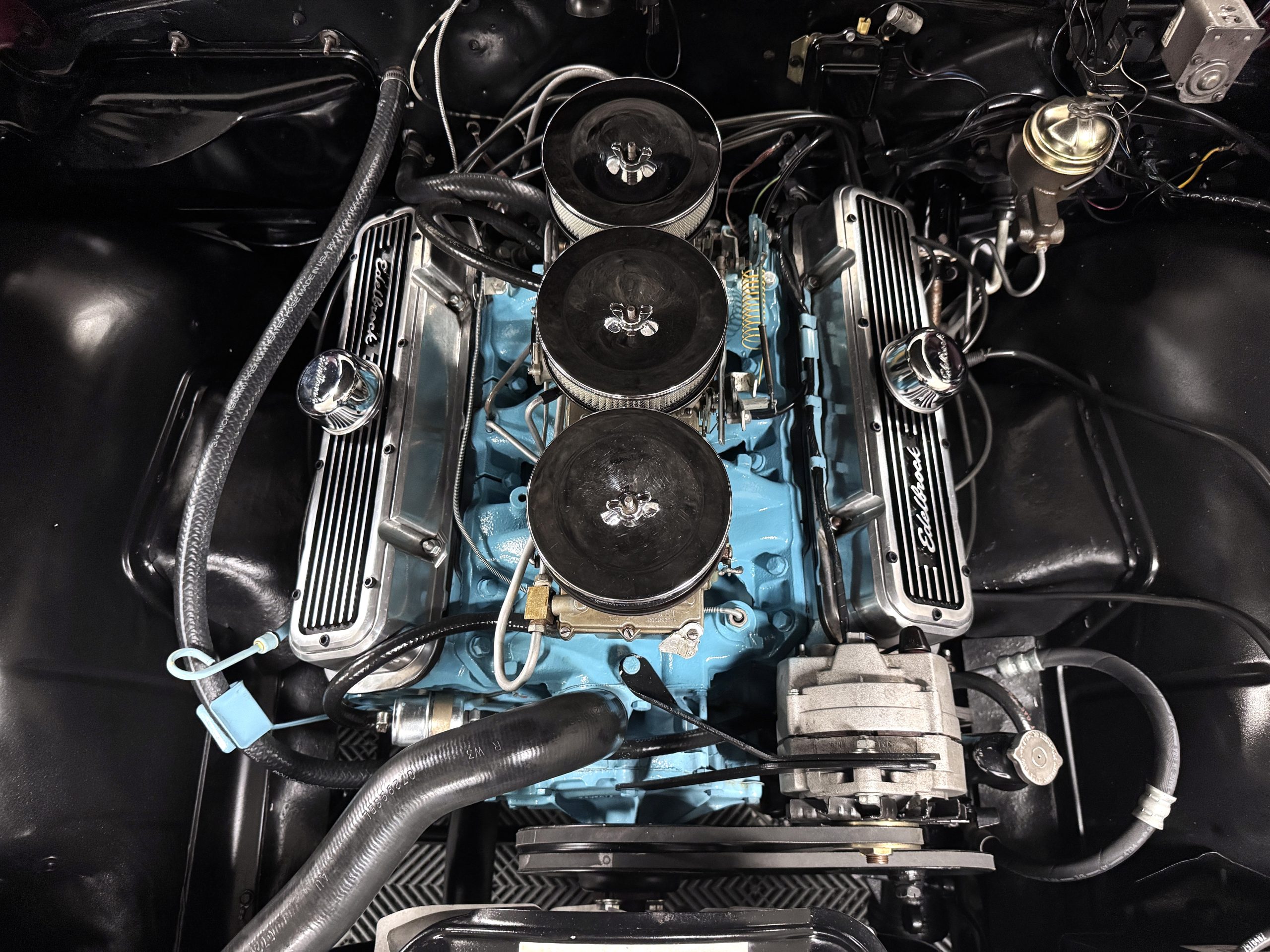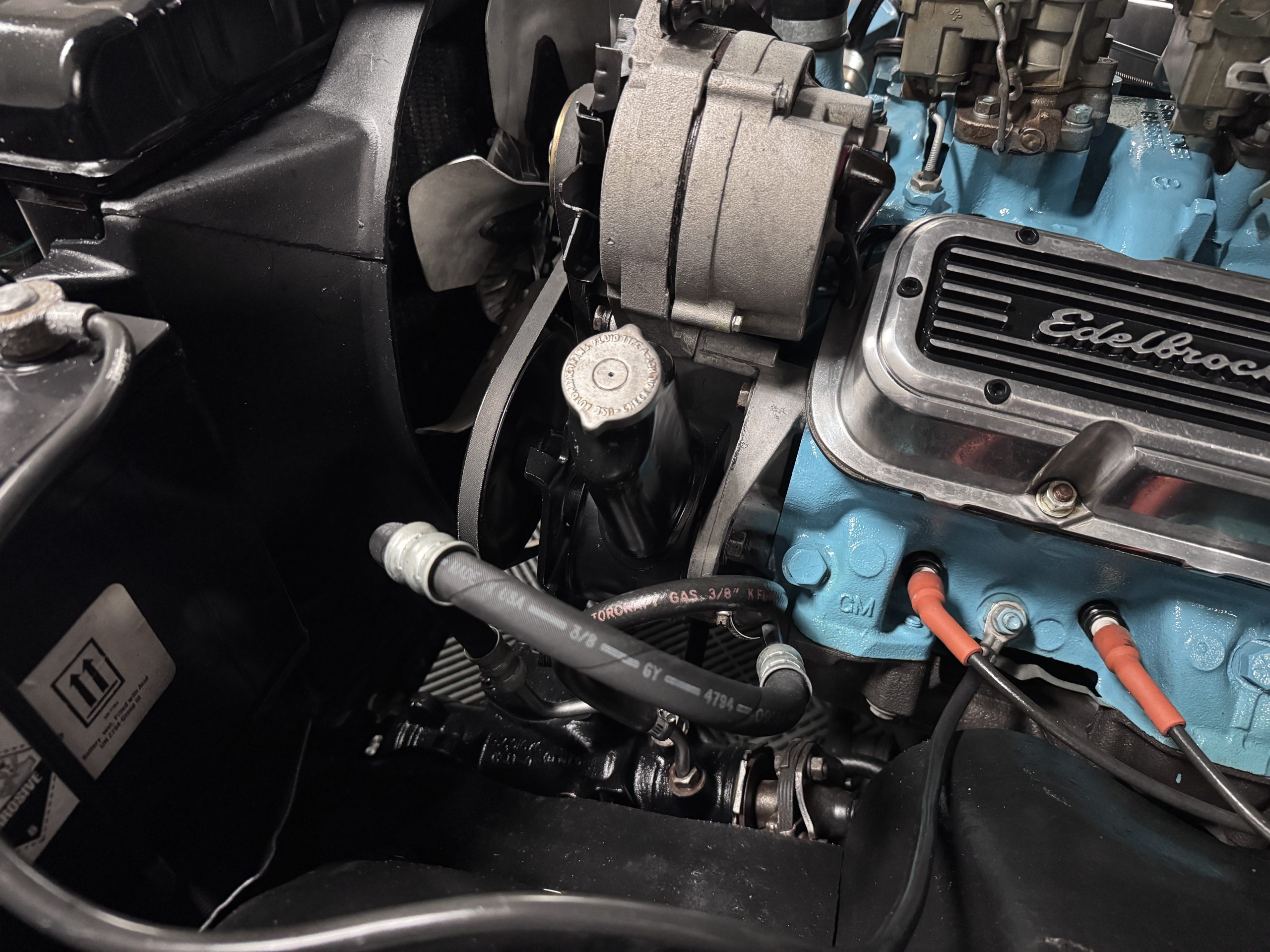 The Pontiac is powered by a WT-code 389 c.i. in V-8 engine with the coveted Tri-Power induction, rated at approximately 335 horsepower. The engine serial number is 633211 with WT stamped on the front of the block and the casting number shows correctly as 9778789. Power is delivered through a four-speed manual synchromesh transmission with Hurst shifter. This GTO has a Flowmaster dual exhaust and an Edelbrock manifold with chrome valve covers and air cleaners. The GTO has its original 3:23 Safe-T-Track limited-slip differential, and the GTO has Delco Moraine self-adjusting drum brakes for all four wheels. The tires are Hercules MRX IV 215/75R14. February 2026 inspection confirms the Pontiac remains in great mechanical order. The restoration work and subsequent servicing position the Pontiac as a strong-driving example that balances authenticity with usability.