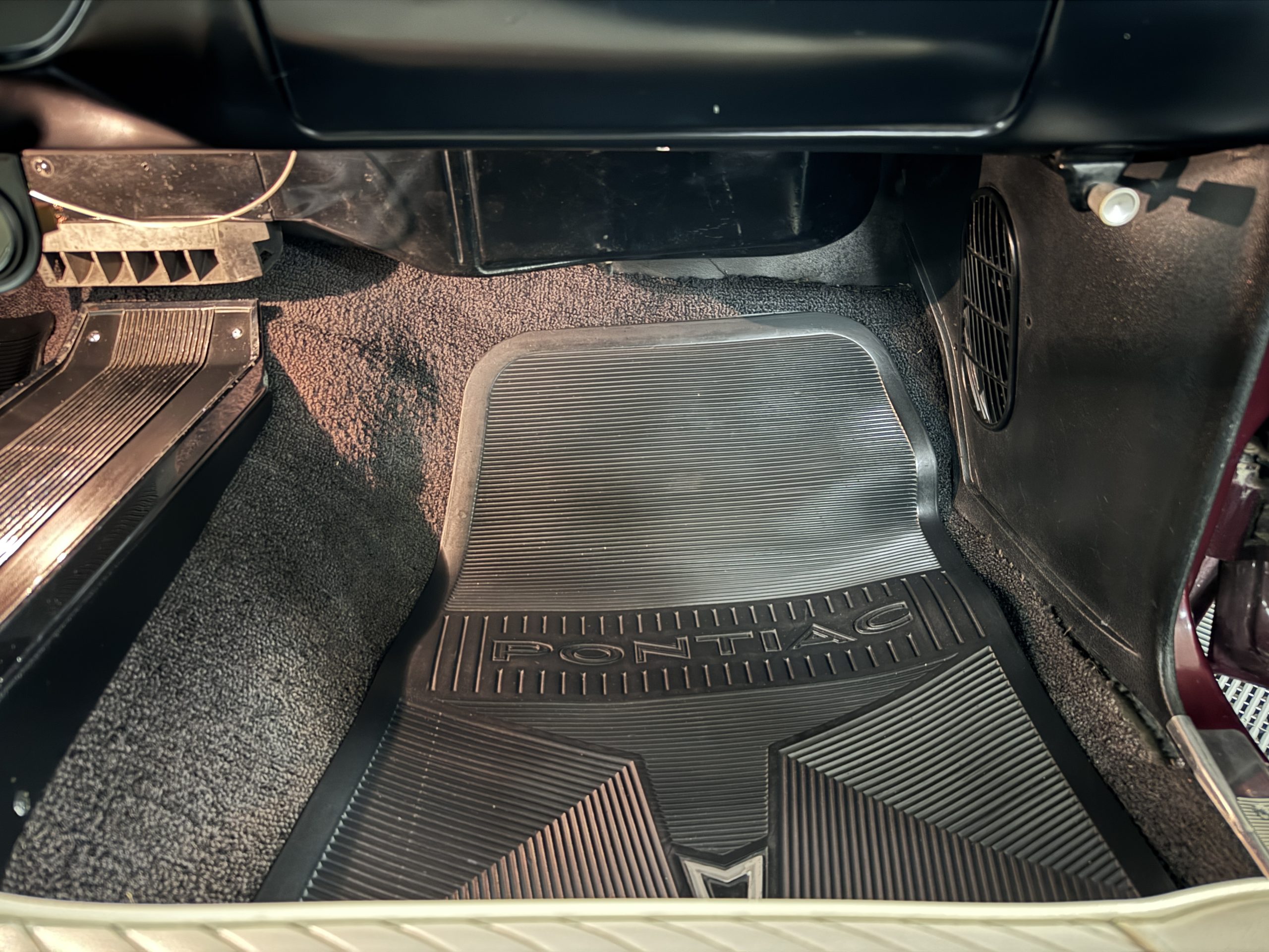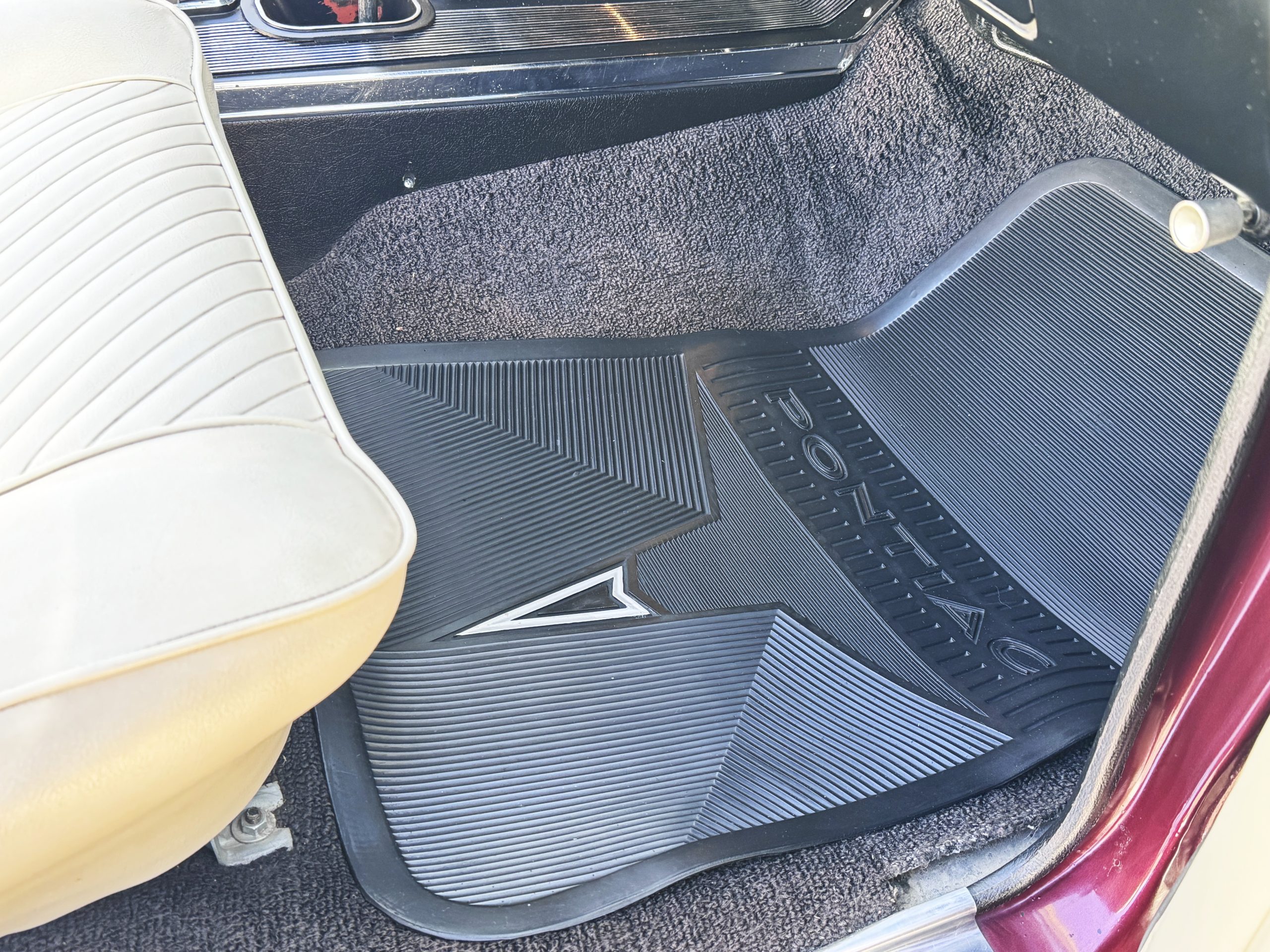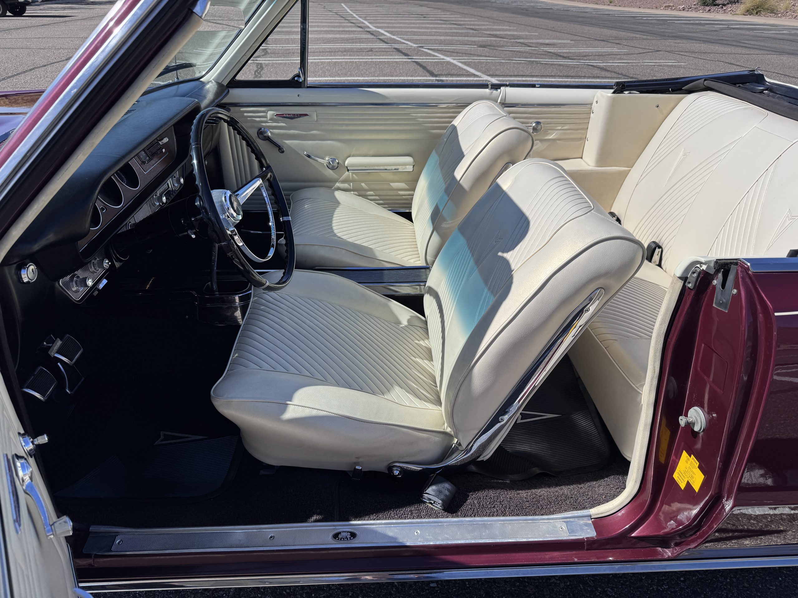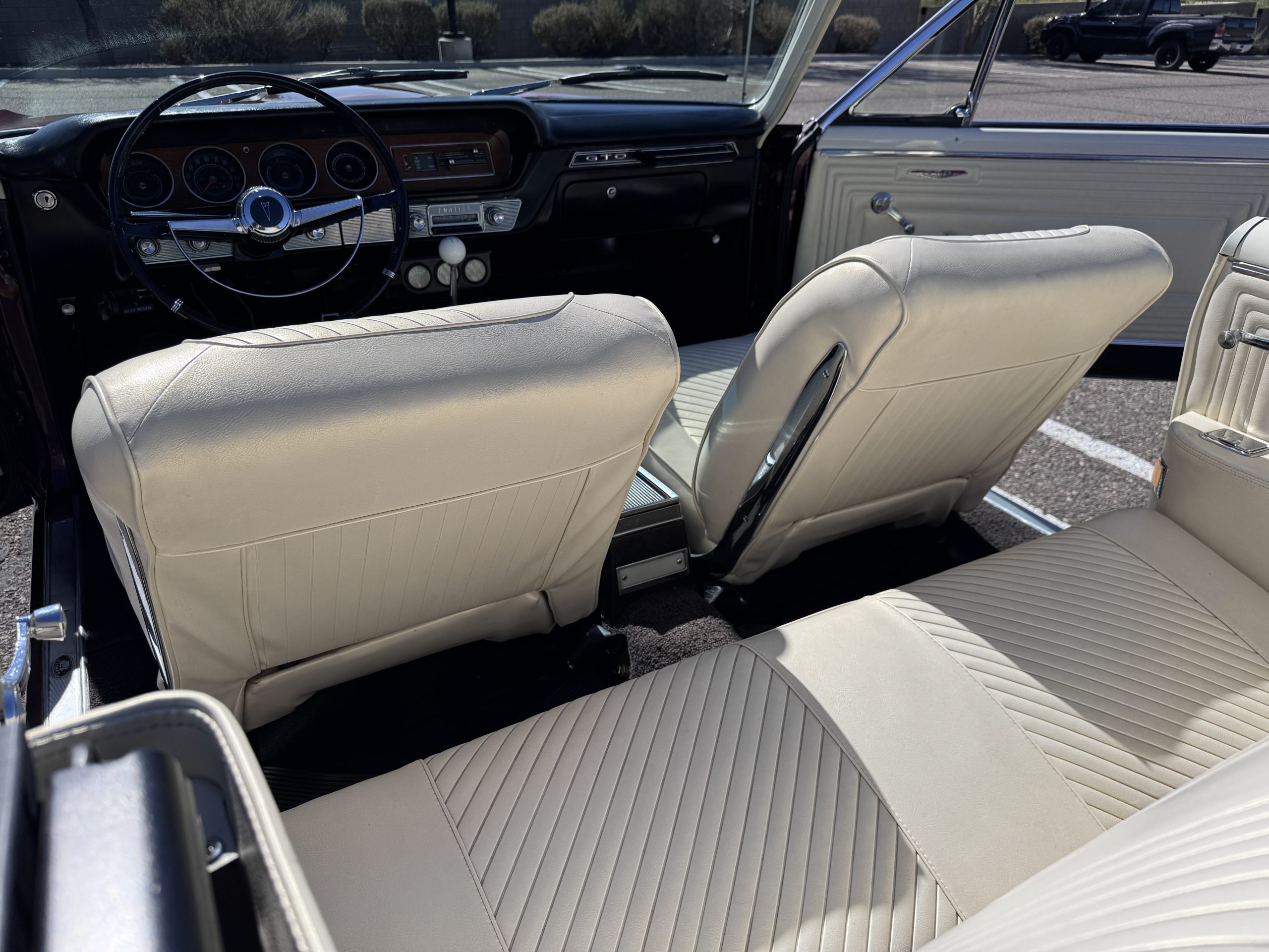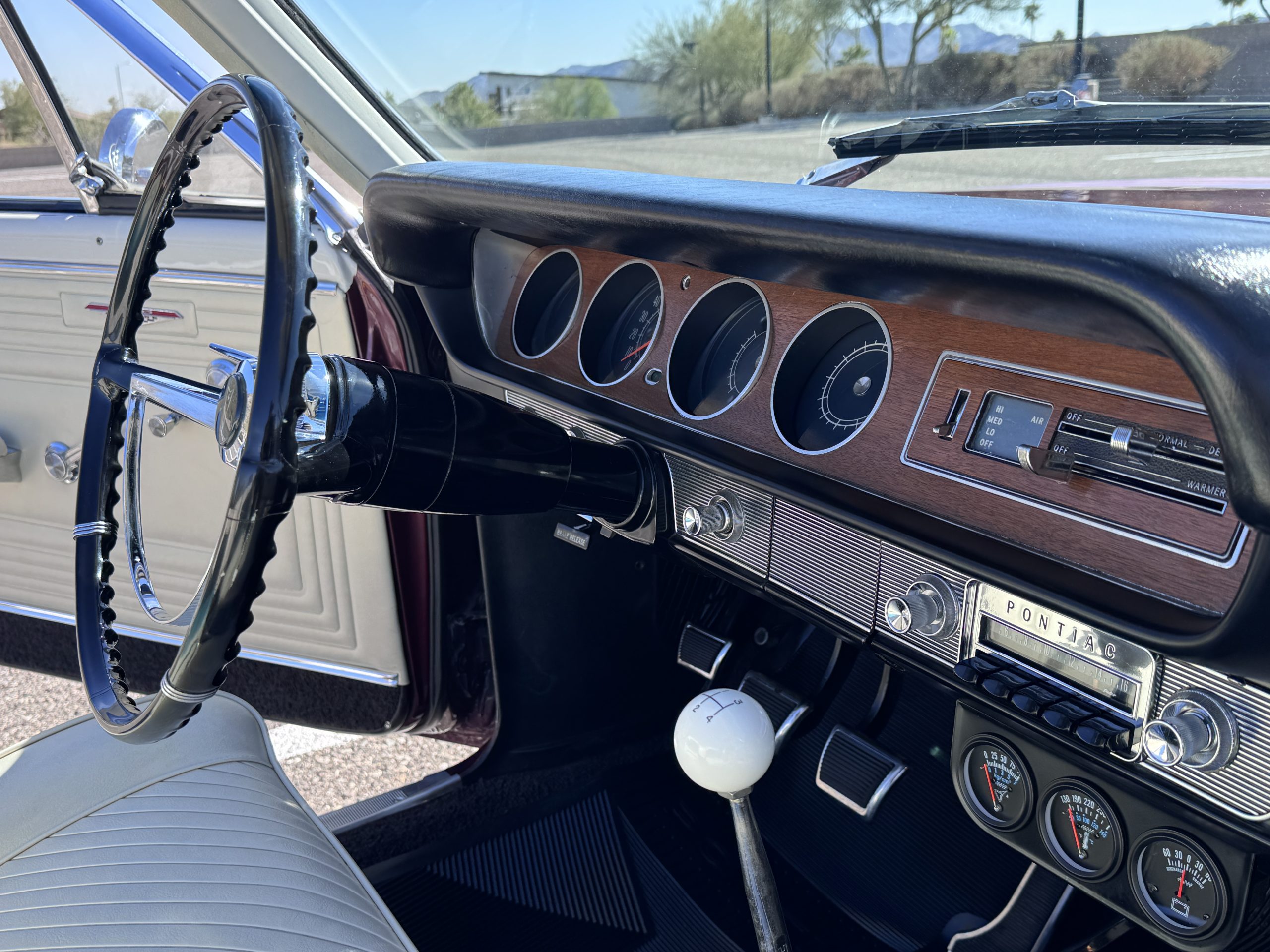 The Pontiac features Parchment front bucket seats and a rear bench in excellent condition, paired with black carpet and black rubber floor mats that are in excellent condition. The wood veneer dash and a period-correct Pontiac AM radio. The Pontiac is equipped with a power-adjustable driver’s seat, deluxe steering wheel, center console, dual horns, and fully functioning fan, heater, and courtesy lighting. The cohesive interior presentation supports the Pontiac’s dual appeal for show presentation and enjoyable open-air touring.