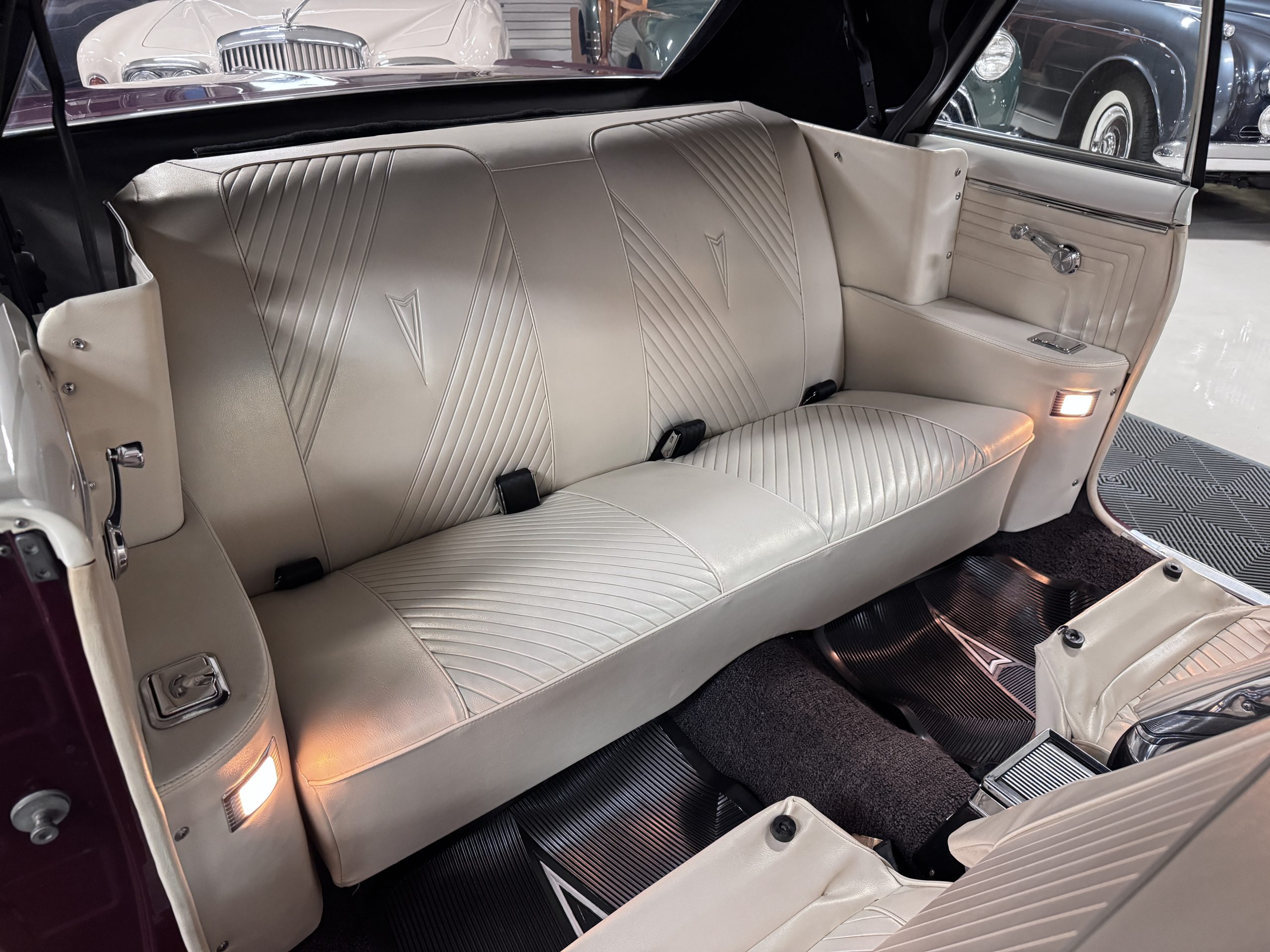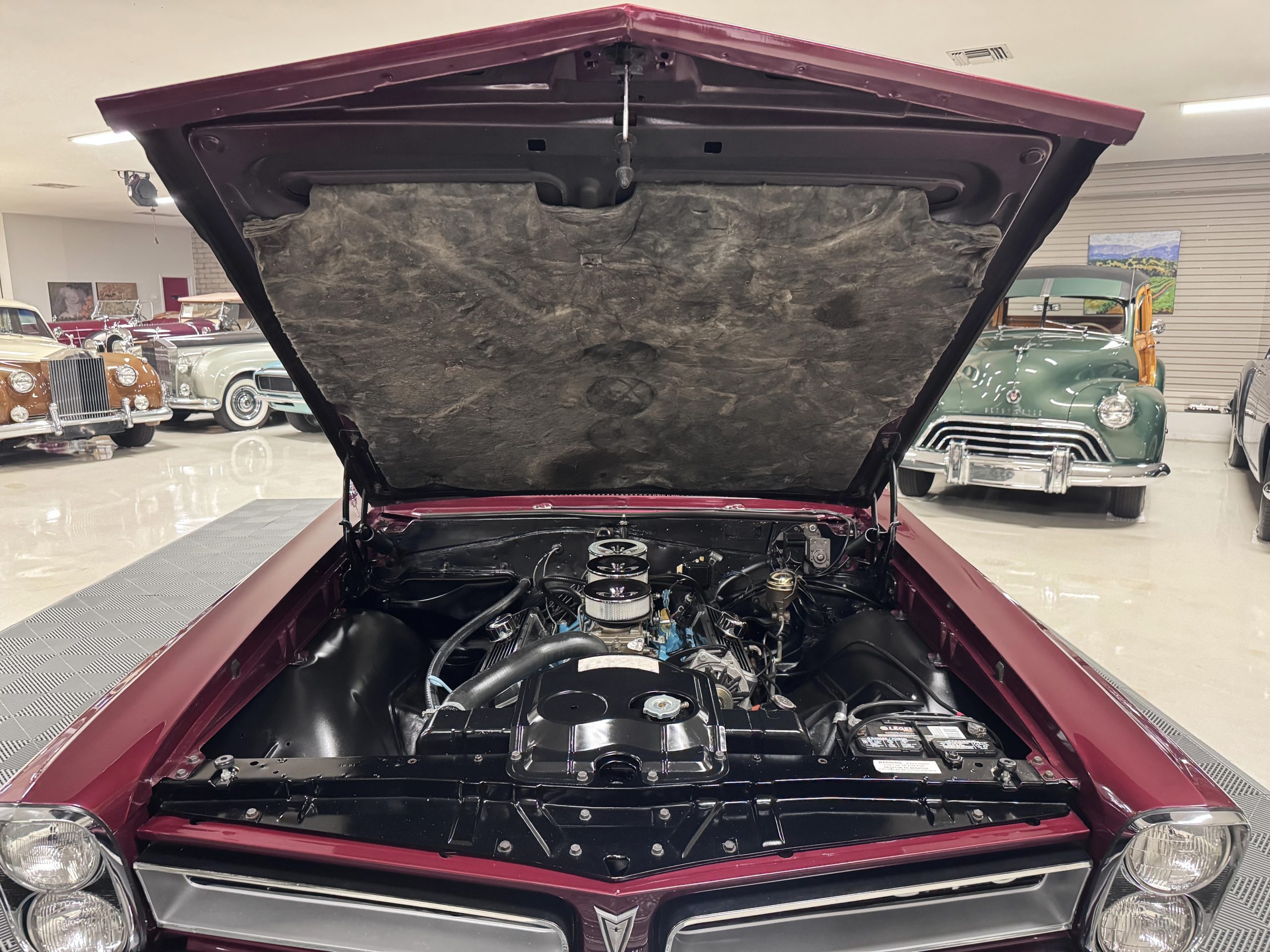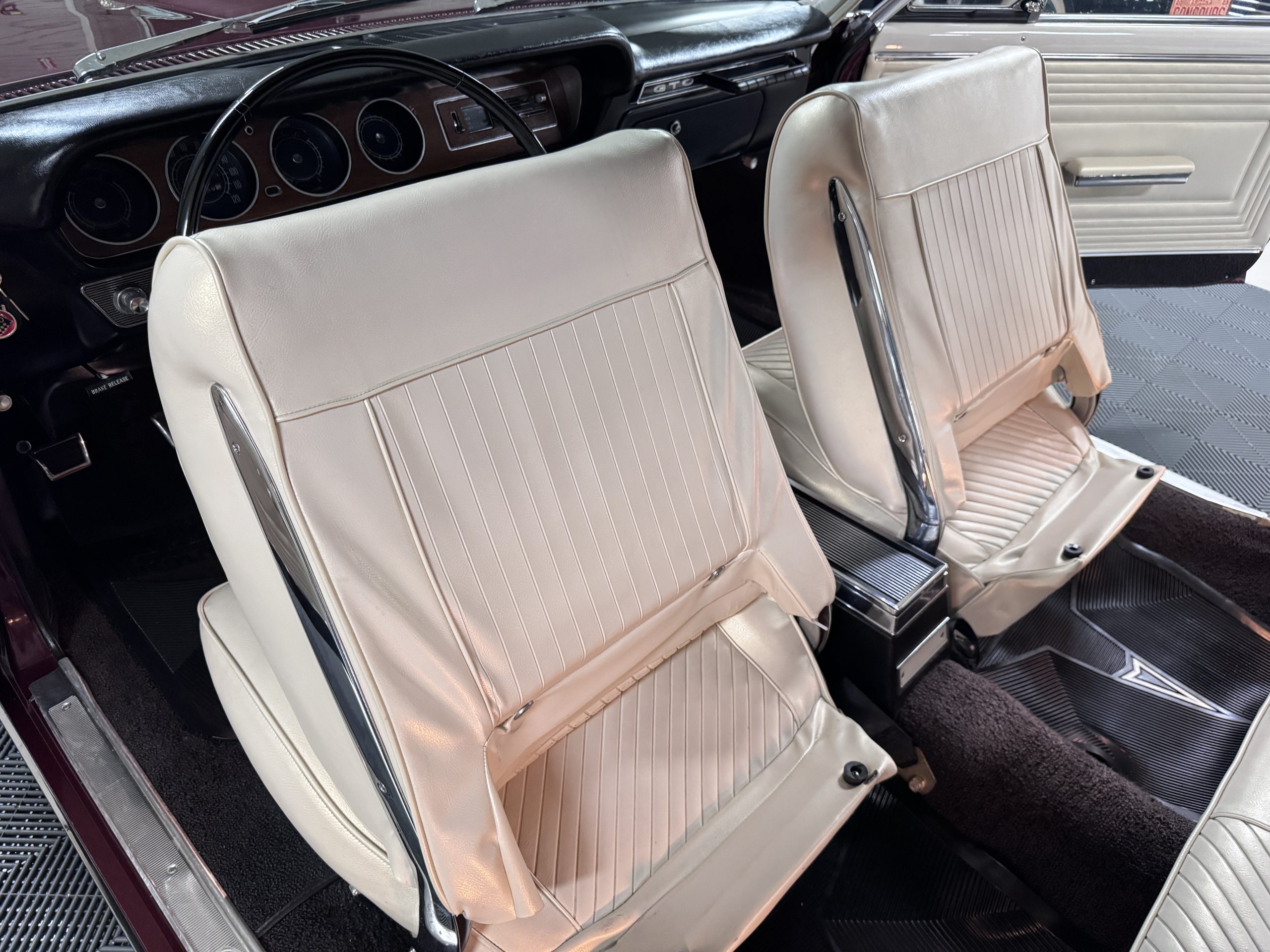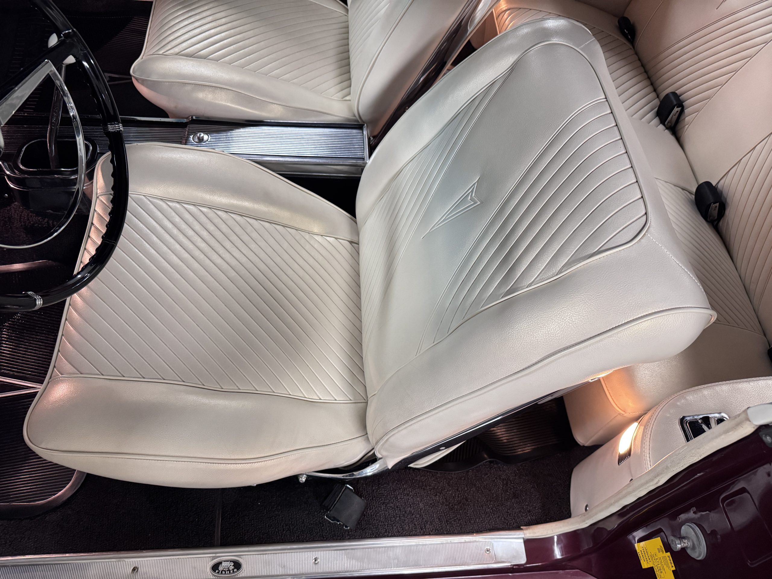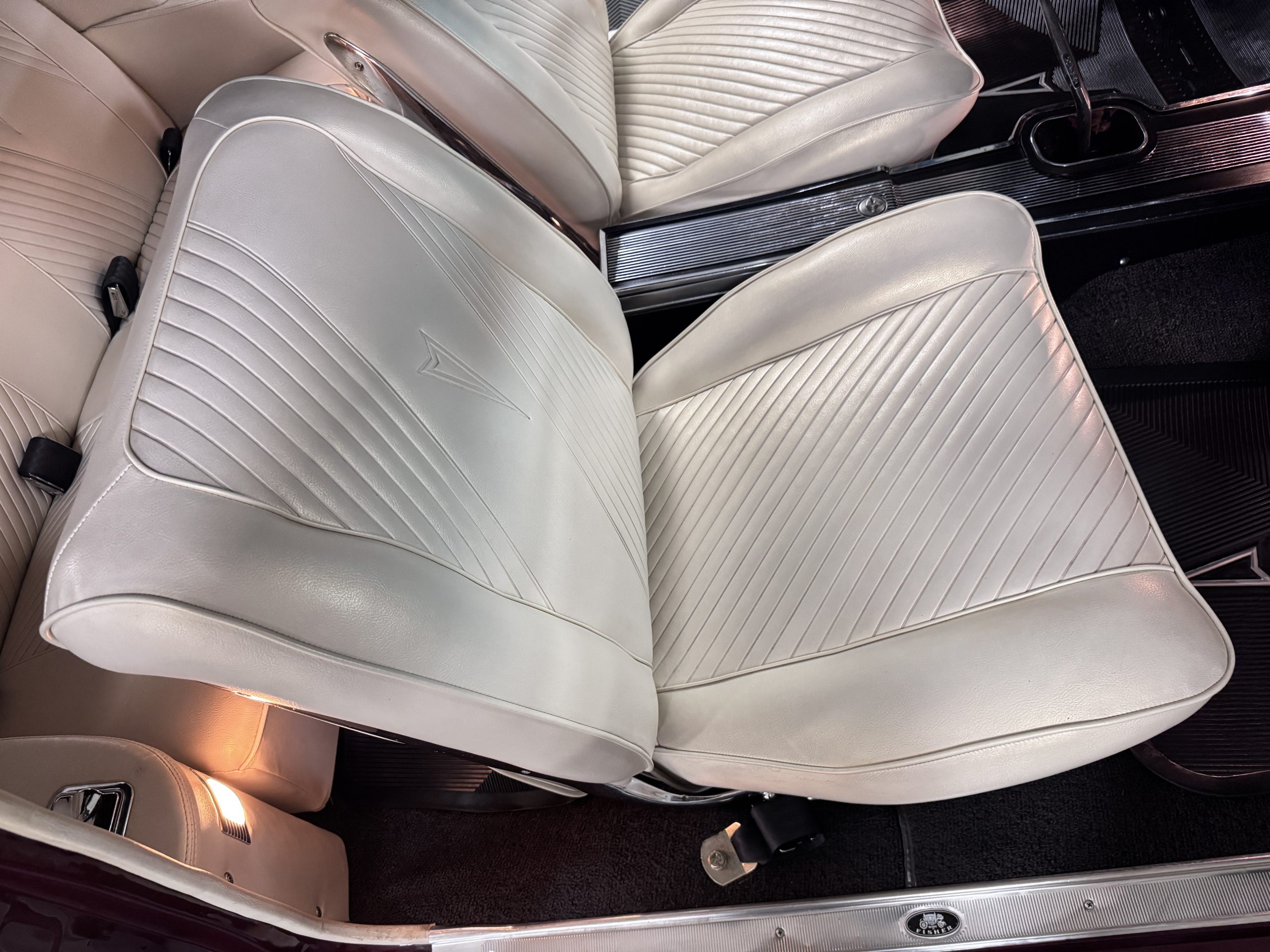 The Pontiac features Parchment front bucket seats and a rear bench in excellent condition, paired with black carpet and black rubber floor mats that are in excellent condition. The wood veneer dash and a period-correct Pontiac AM radio. The Pontiac is equipped with a power-adjustable driver’s seat, deluxe steering wheel, center console, dual horns, and fully functioning fan, heater, and courtesy lighting. The cohesive interior presentation supports the Pontiac’s dual appeal for show presentation and enjoyable open-air touring.