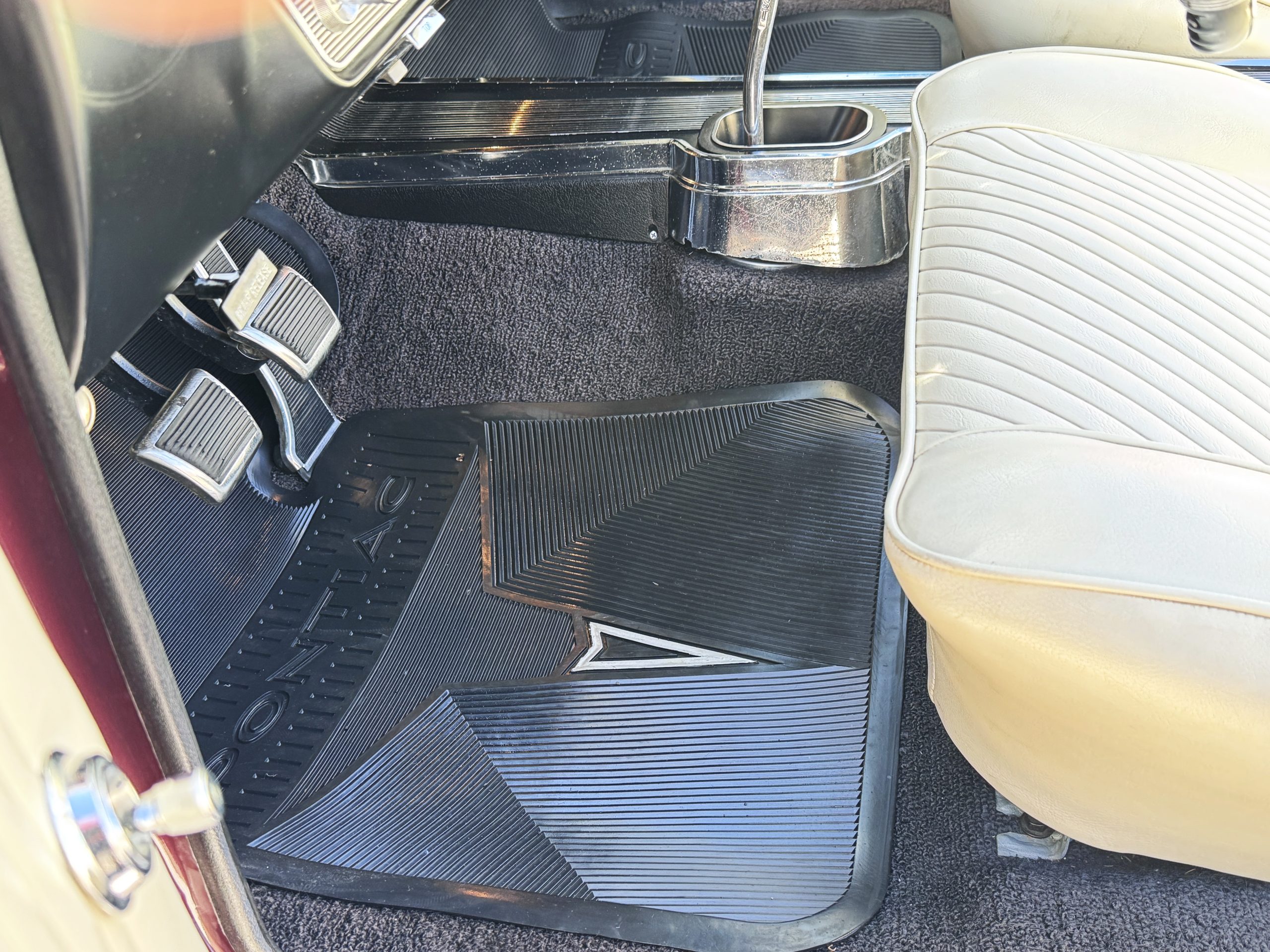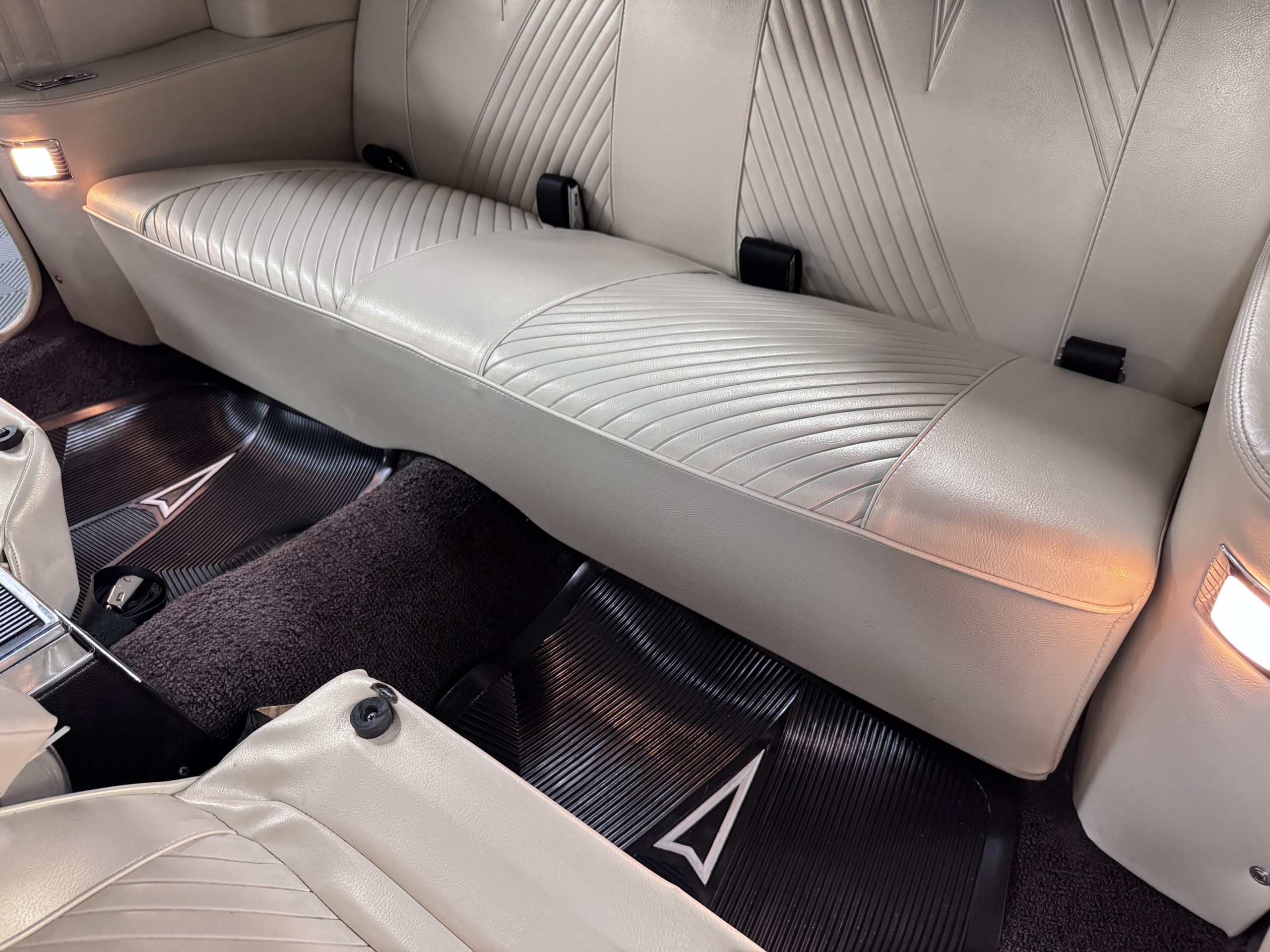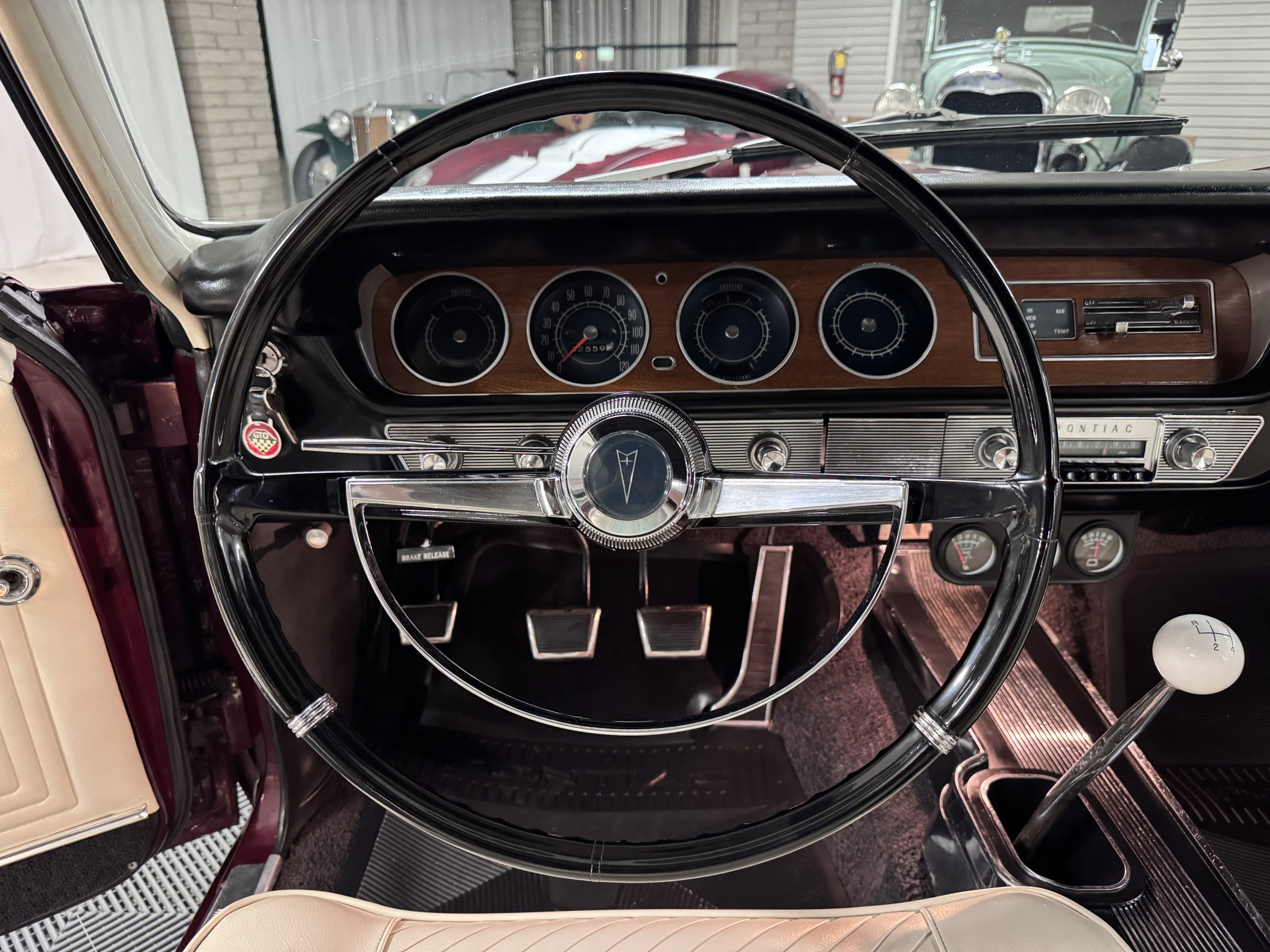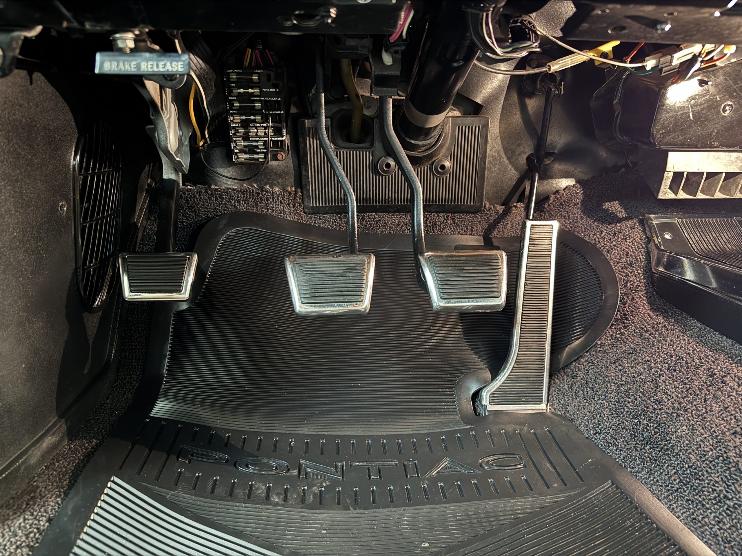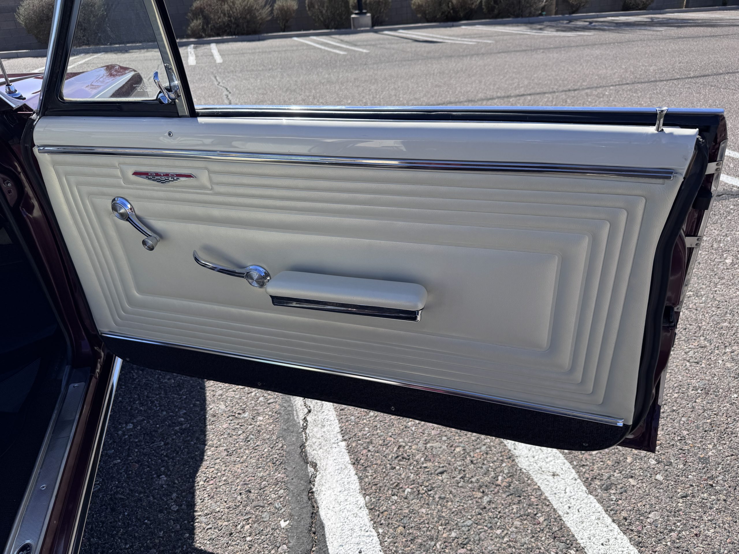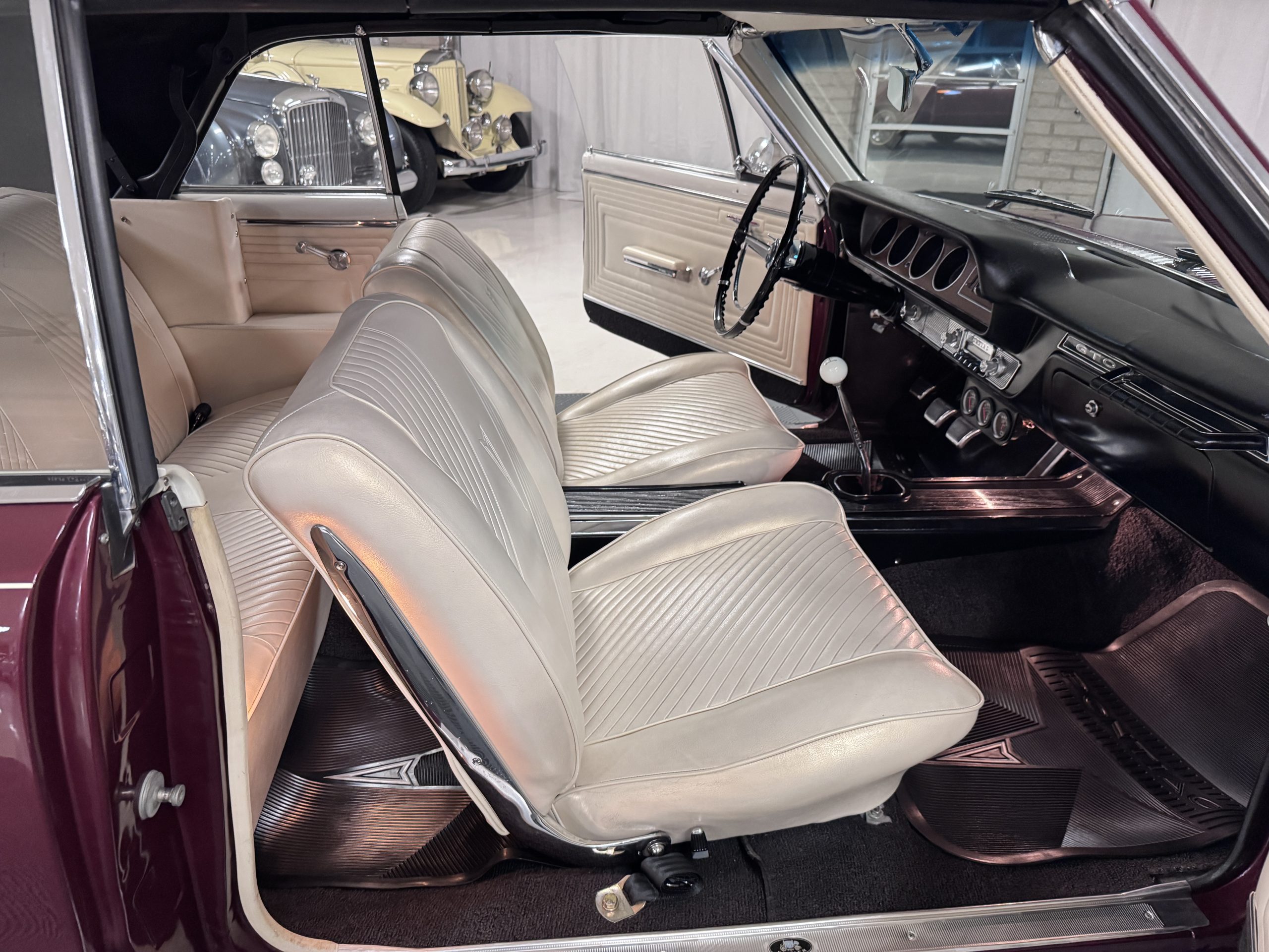 The Pontiac features Parchment front bucket seats and a rear bench in excellent condition, paired with black carpet and black rubber floor mats that are in excellent condition. The wood veneer dash and a period-correct Pontiac AM radio. The Pontiac is equipped with a power-adjustable driver’s seat, deluxe steering wheel, center console, dual horns, and fully functioning fan, heater, and courtesy lighting. The cohesive interior presentation supports the Pontiac’s dual appeal for show presentation and enjoyable open-air touring.