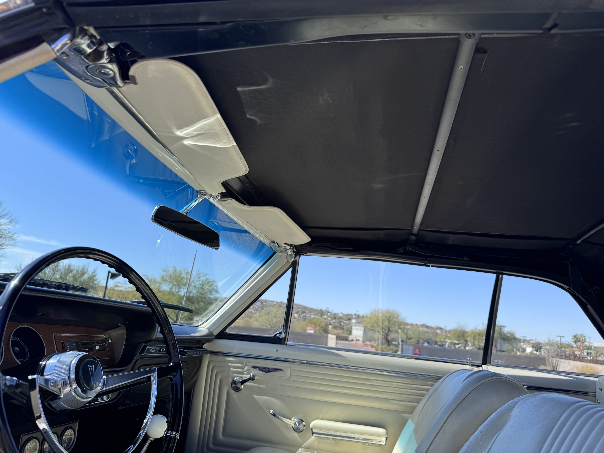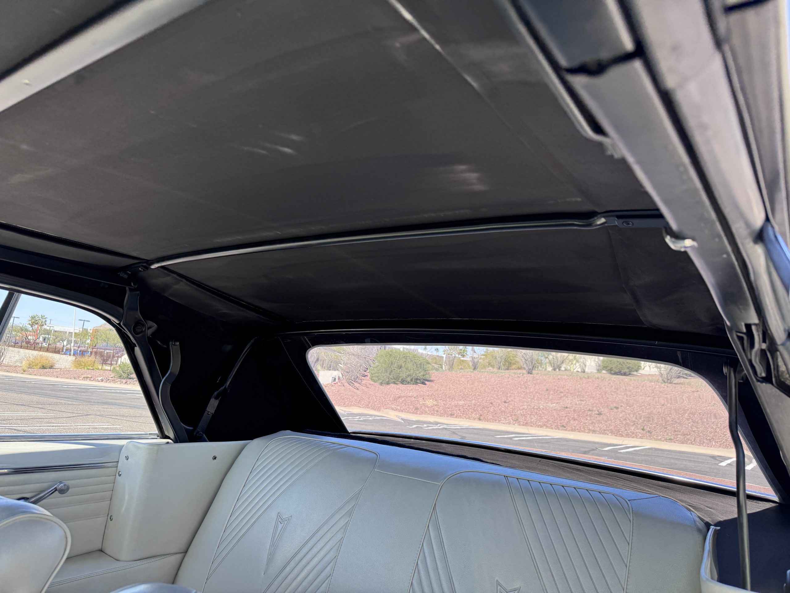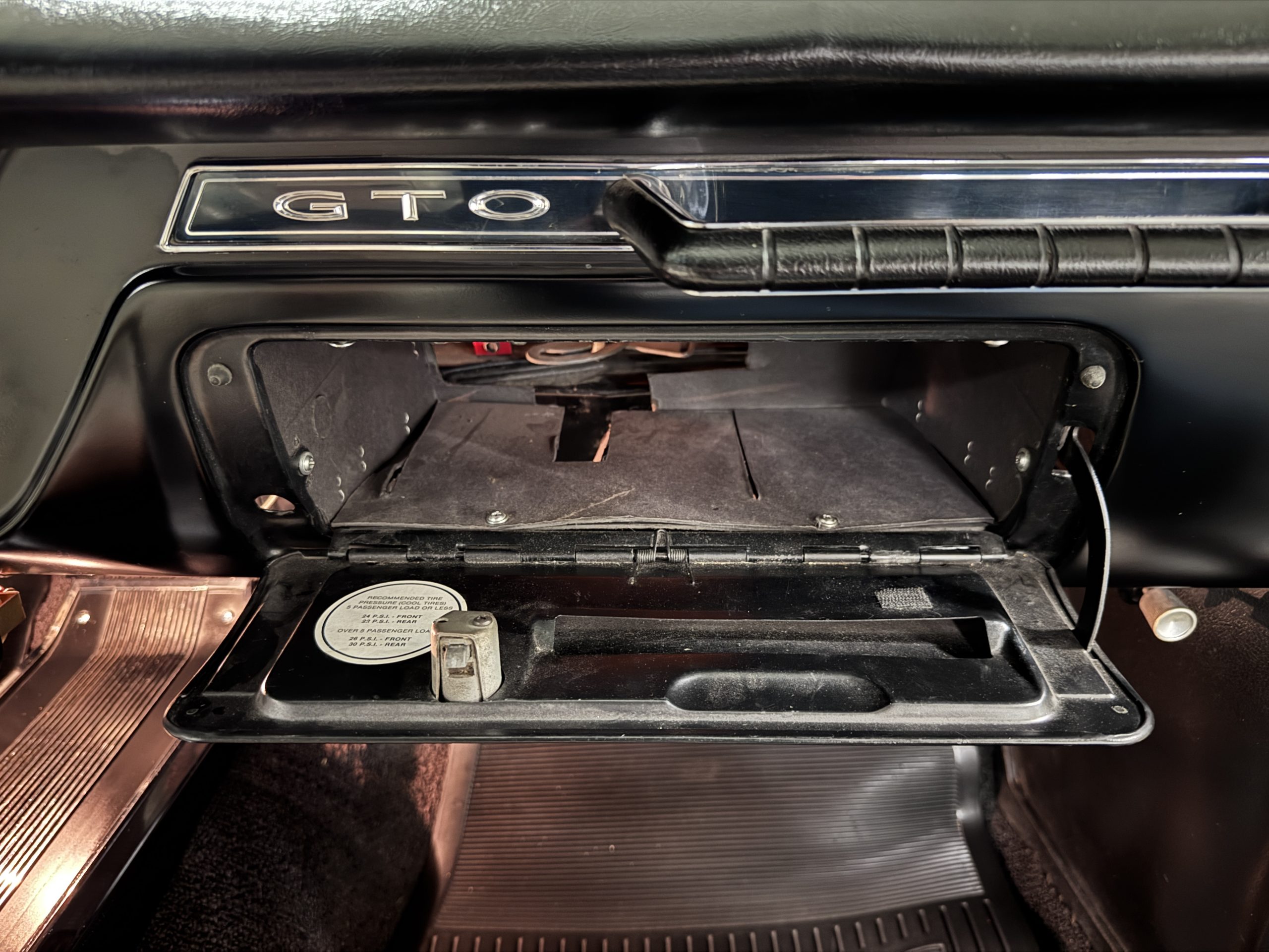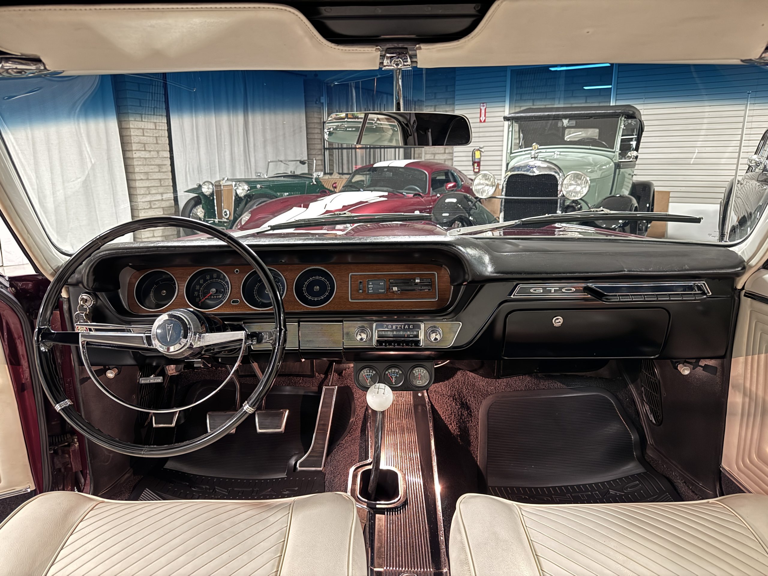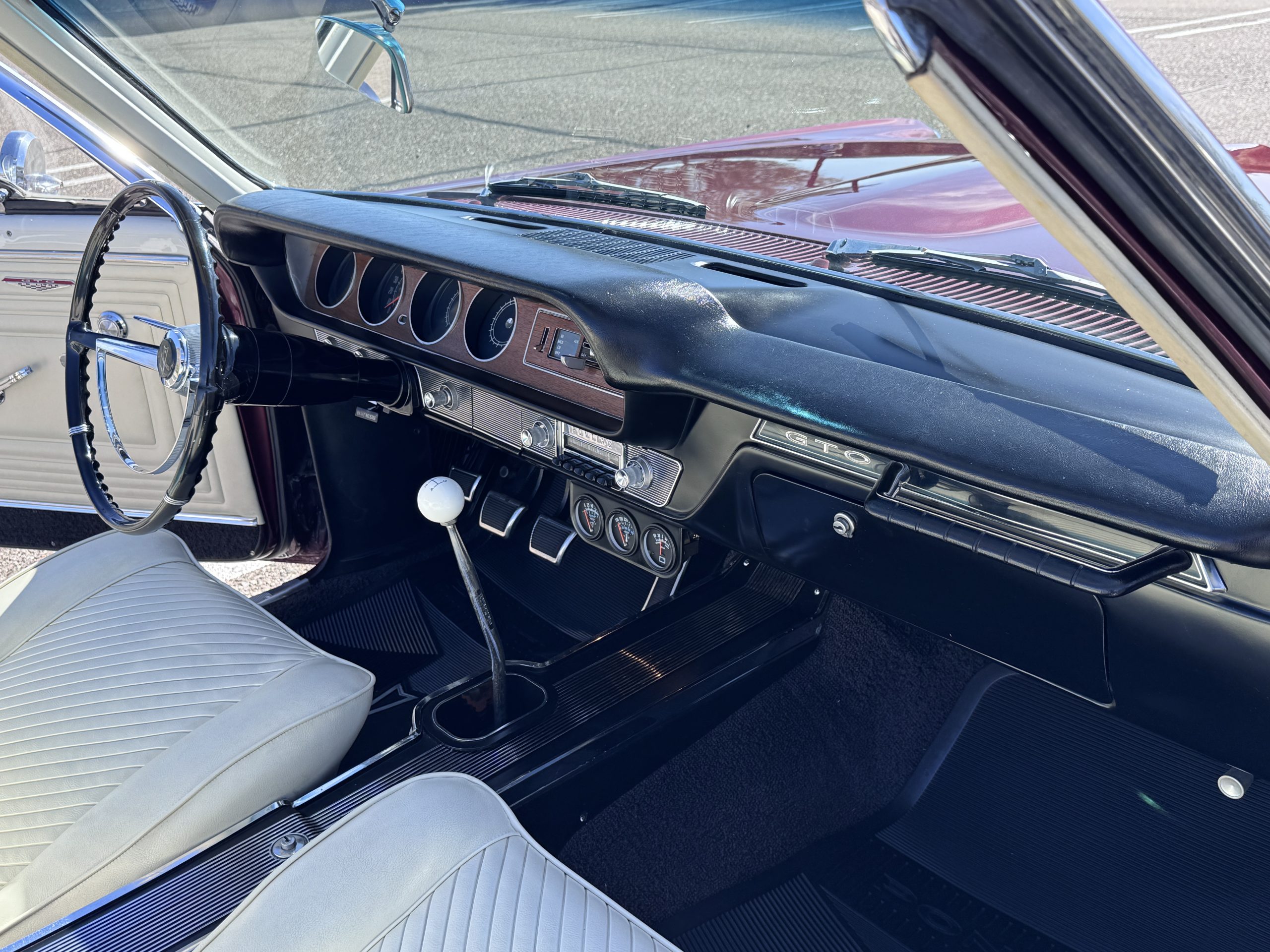 The Pontiac features Parchment front bucket seats and a rear bench in excellent condition, paired with black carpet and black rubber floor mats that are in excellent condition. The wood veneer dash and a period-correct Pontiac AM radio. The Pontiac is equipped with a power-adjustable driver’s seat, deluxe steering wheel, center console, dual horns, and fully functioning fan, heater, and courtesy lighting. The cohesive interior presentation supports the Pontiac’s dual appeal for show presentation and enjoyable open-air touring.