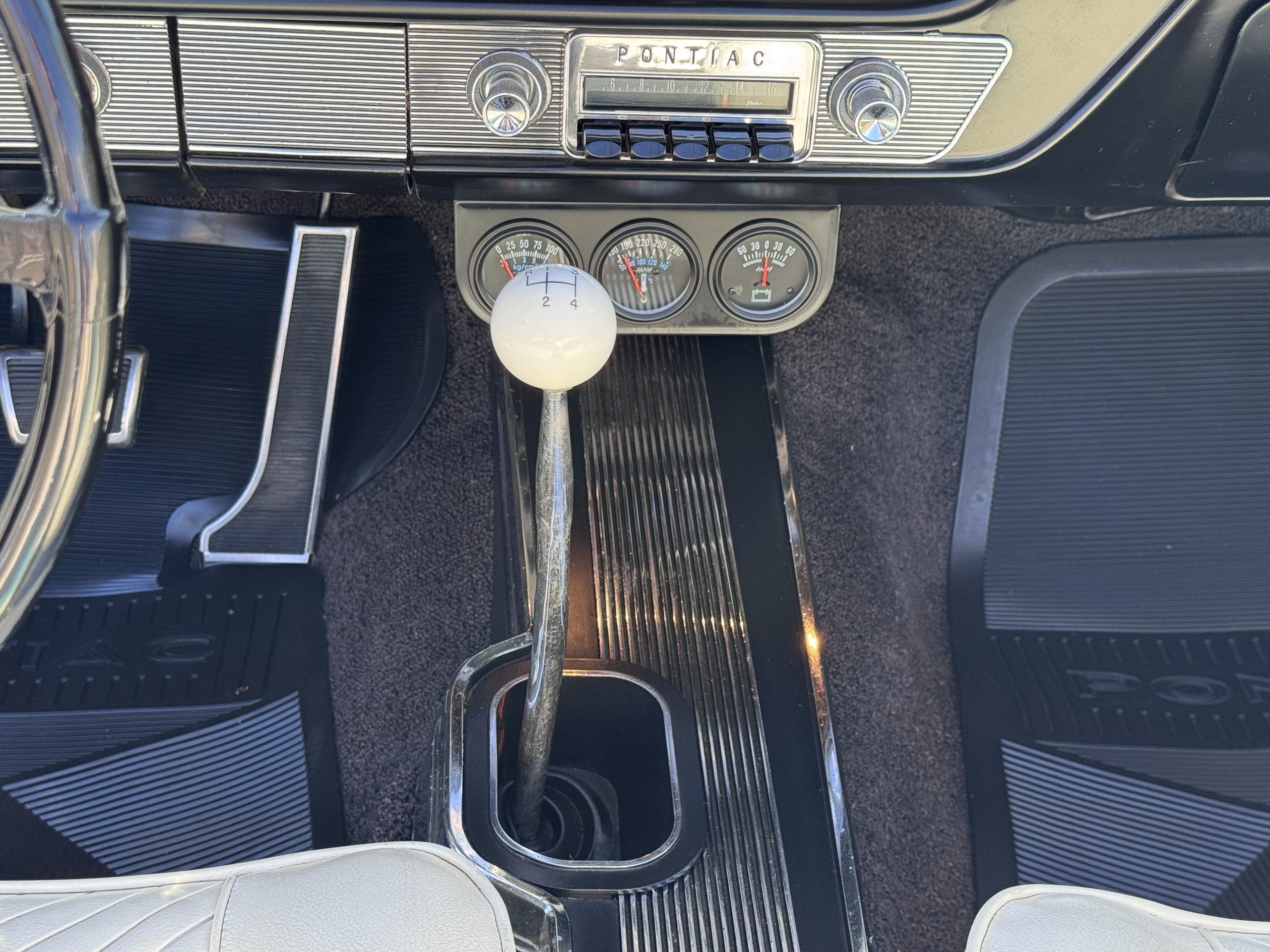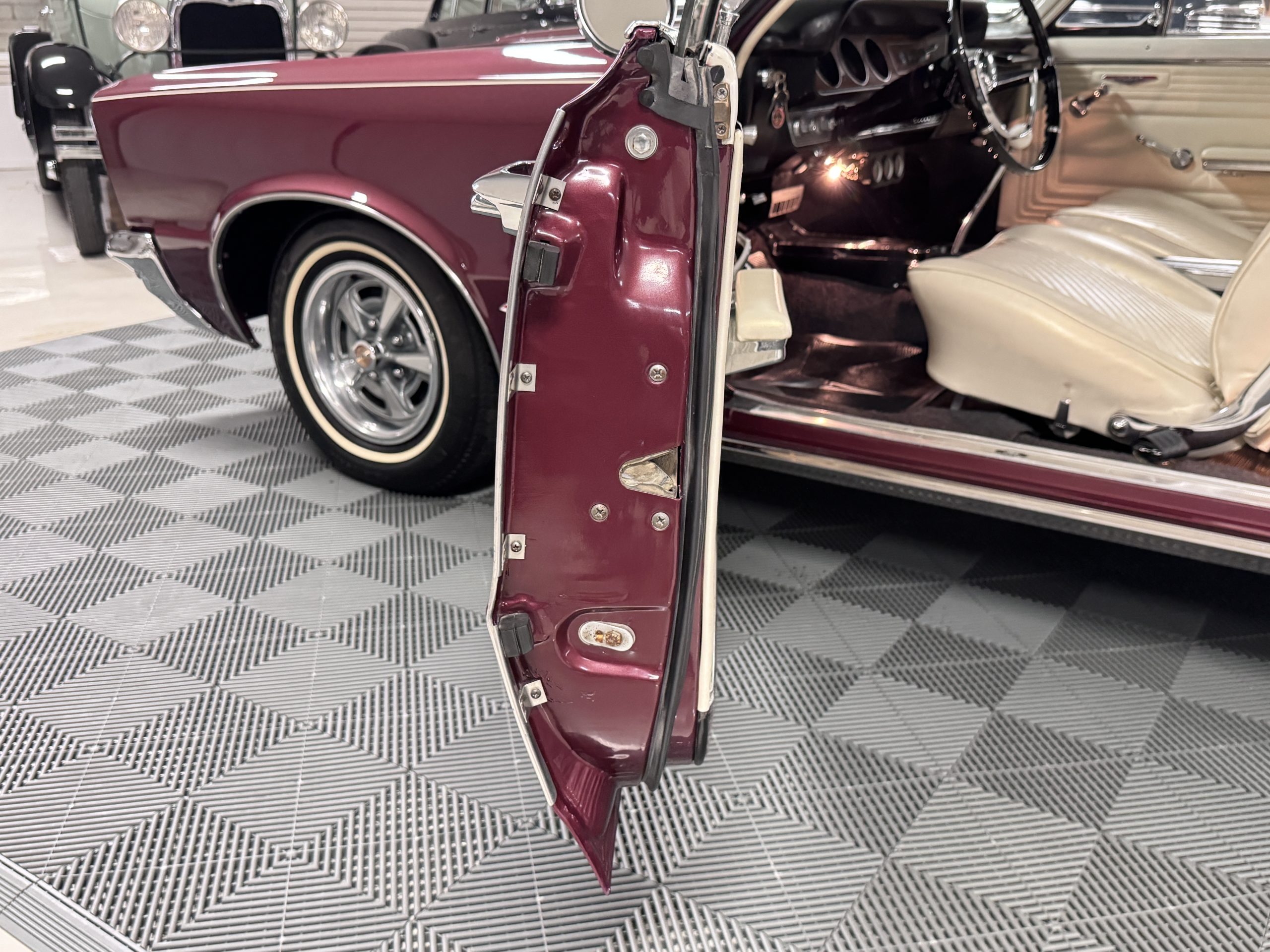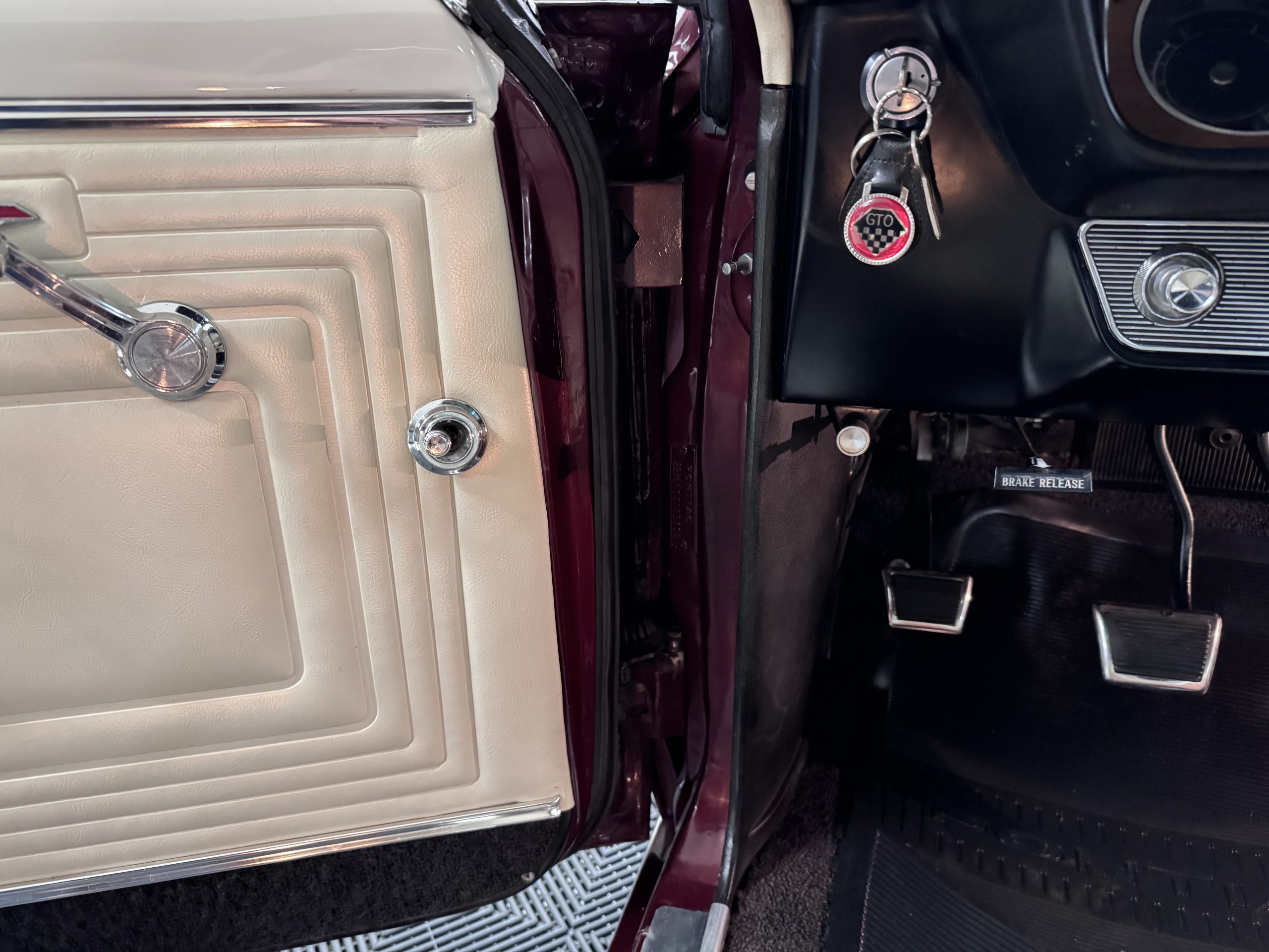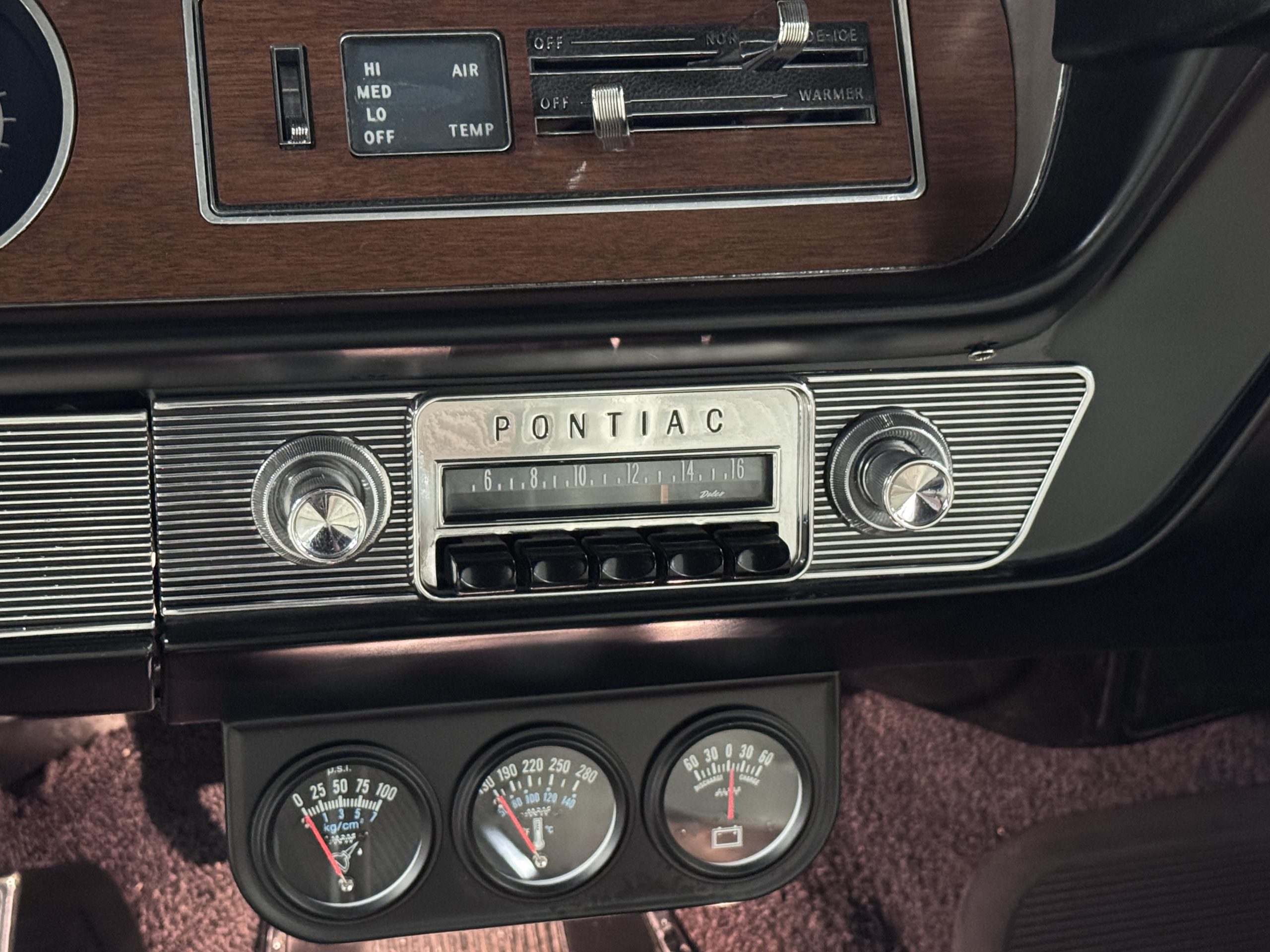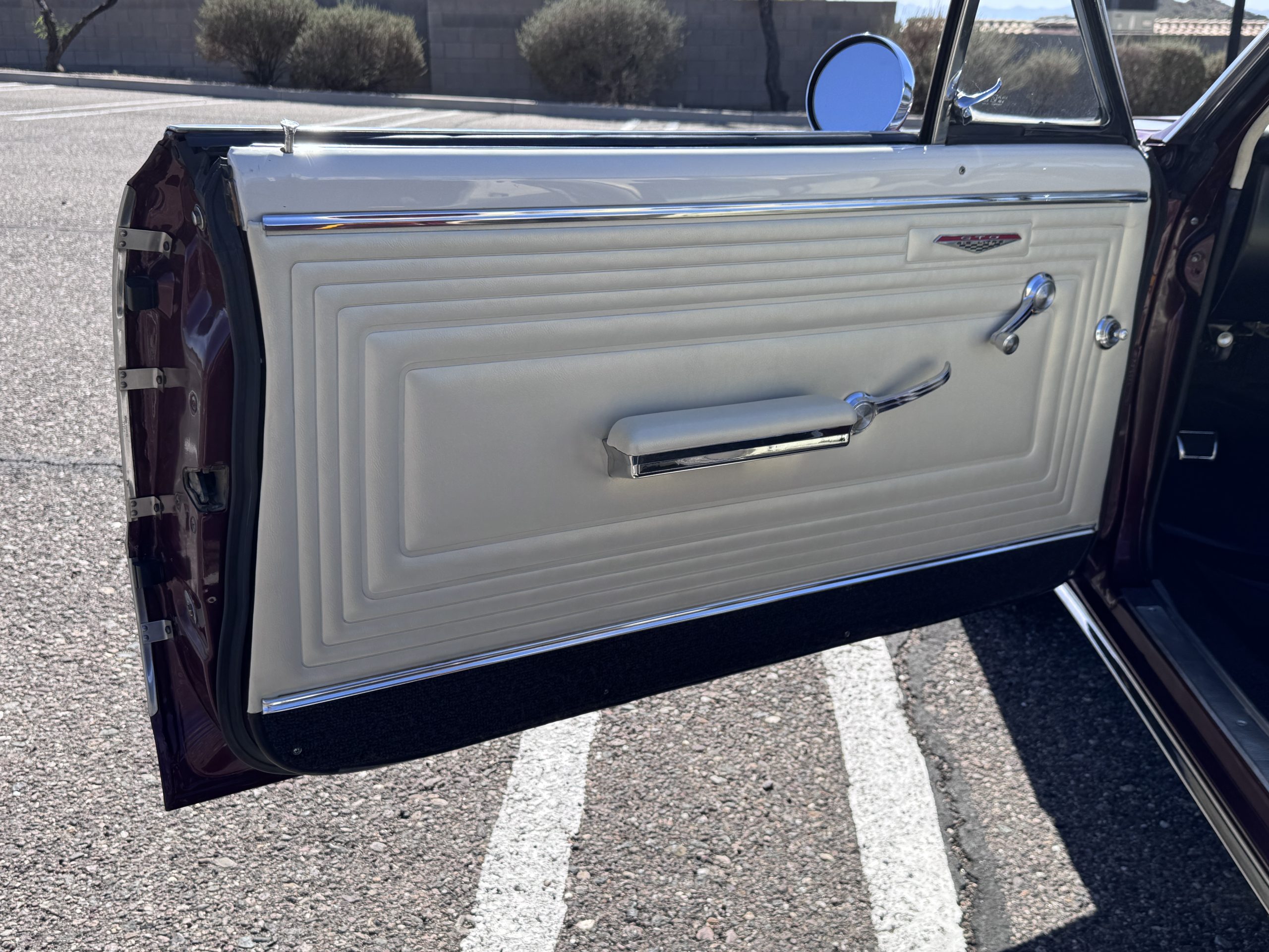 The Pontiac features Parchment front bucket seats and a rear bench in excellent condition, paired with black carpet and black rubber floor mats that are in excellent condition. The wood veneer dash and a period-correct Pontiac AM radio. The Pontiac is equipped with a power-adjustable driver’s seat, deluxe steering wheel, center console, dual horns, and fully functioning fan, heater, and courtesy lighting. The cohesive interior presentation supports the Pontiac’s dual appeal for show presentation and enjoyable open-air touring.