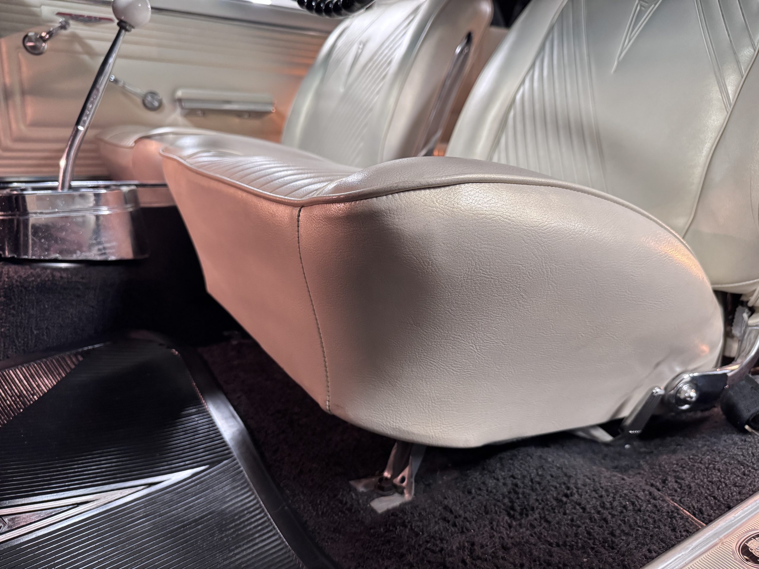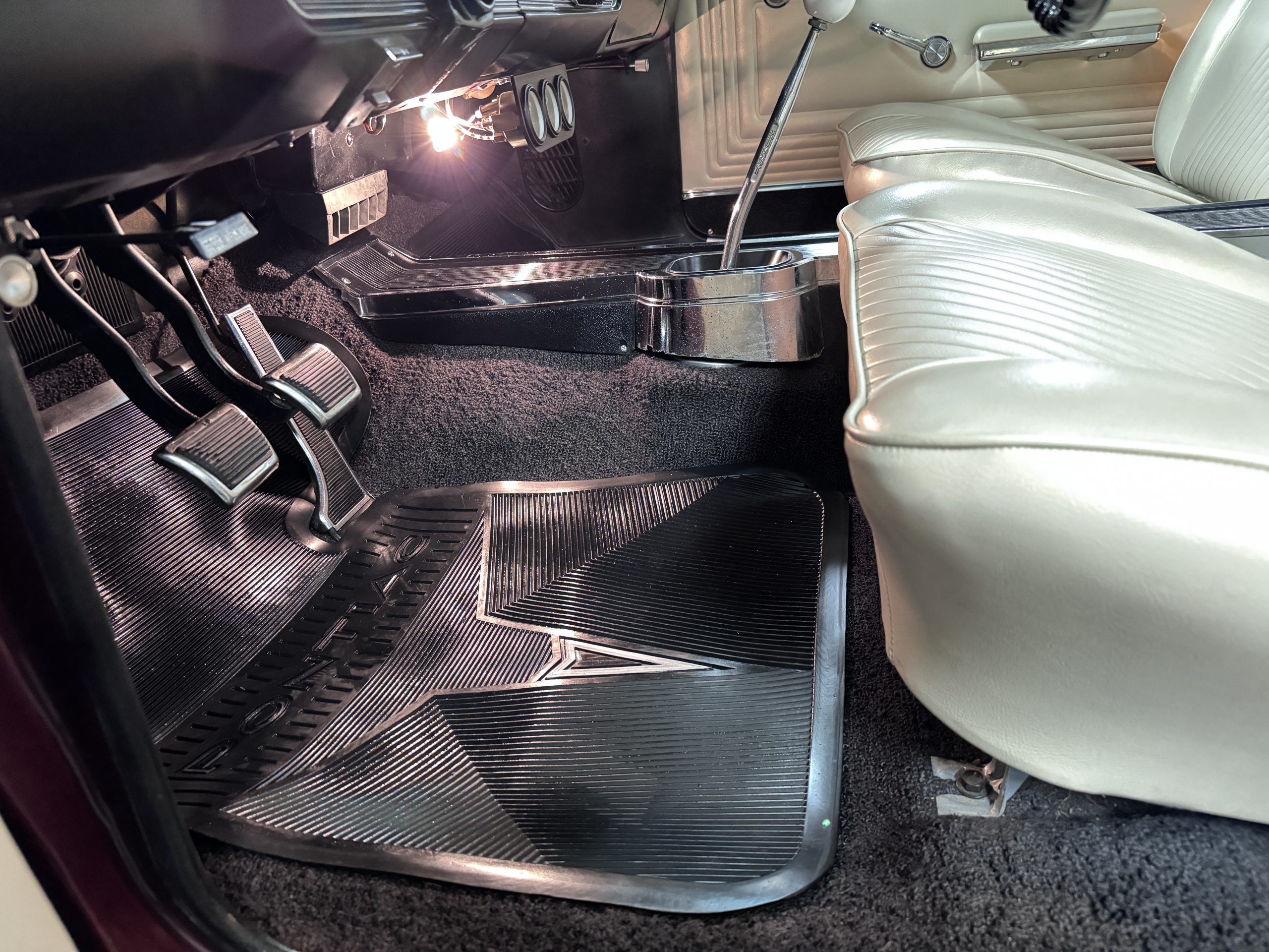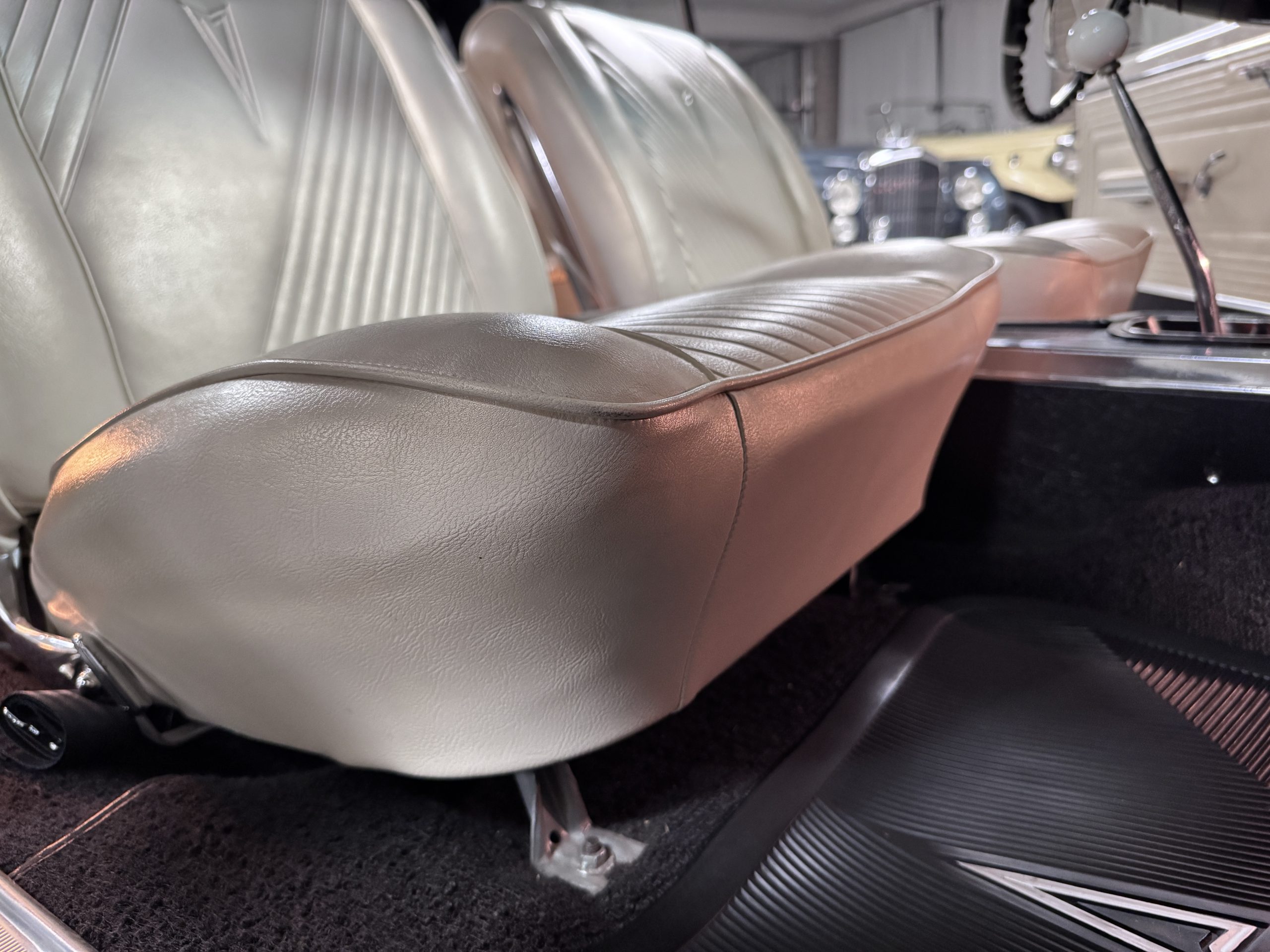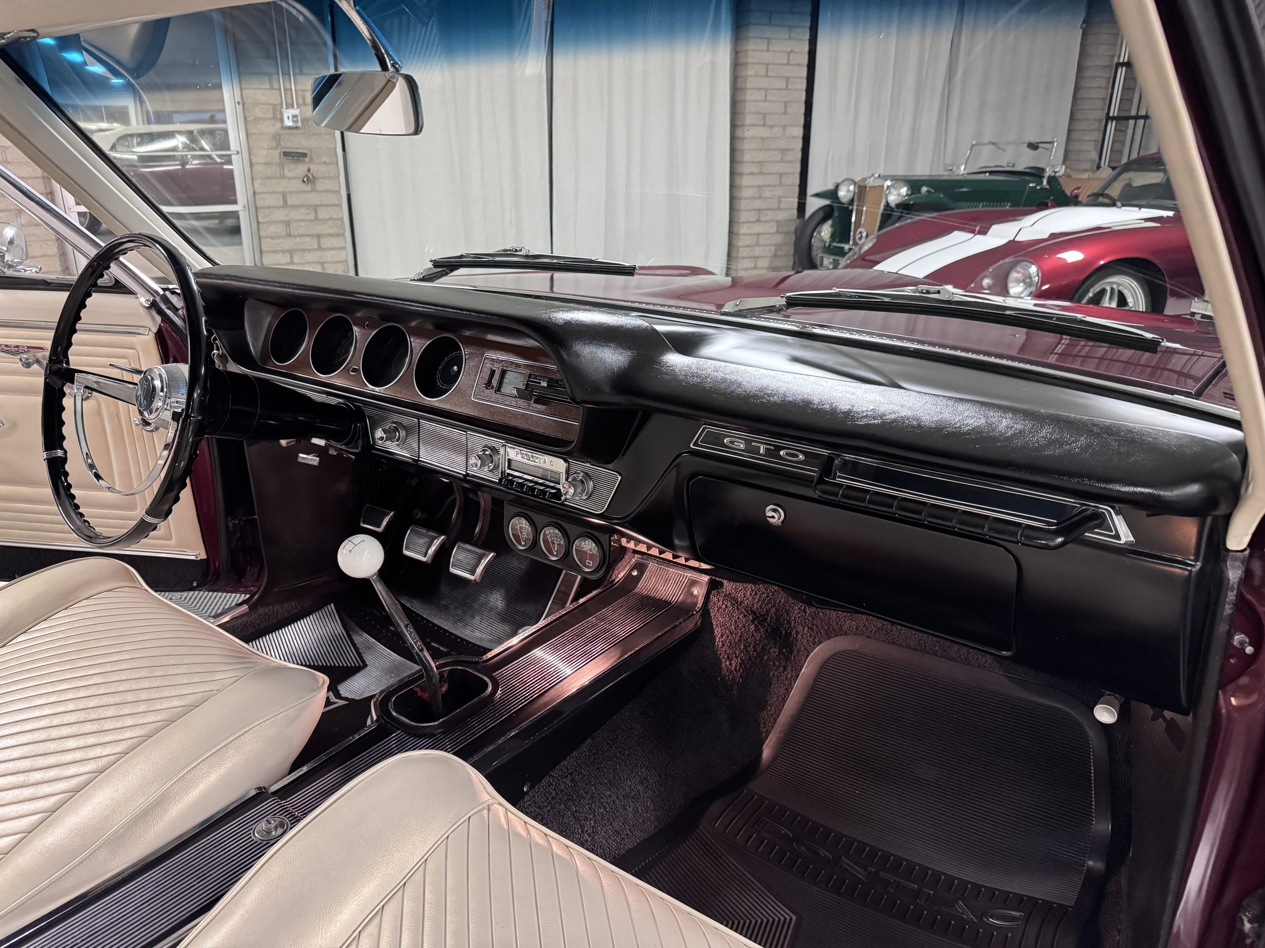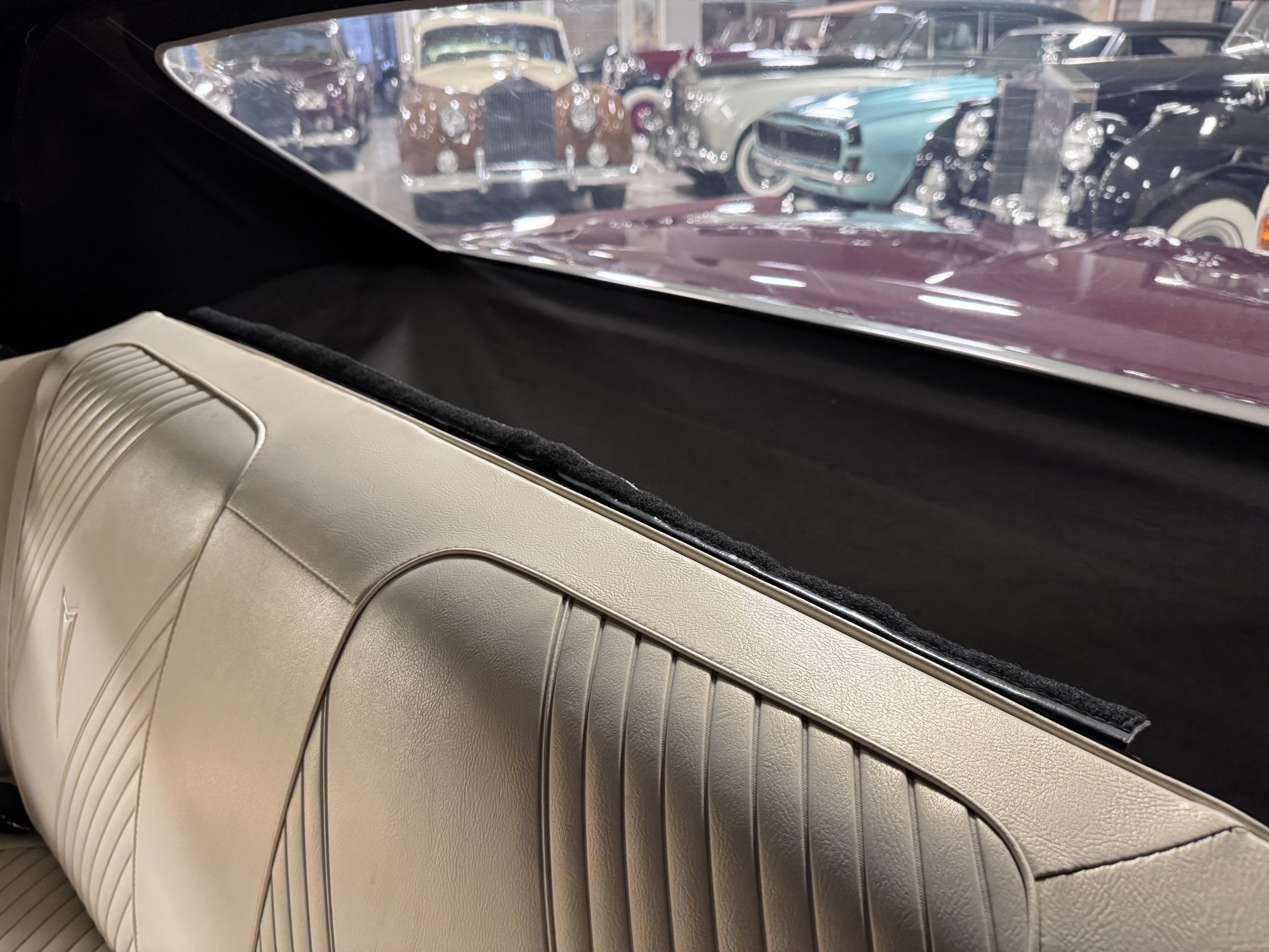 The Pontiac features Parchment front bucket seats and a rear bench in excellent condition, paired with black carpet and black rubber floor mats that are in excellent condition. The wood veneer dash and a period-correct Pontiac AM radio. The Pontiac is equipped with a power-adjustable driver’s seat, deluxe steering wheel, center console, dual horns, and fully functioning fan, heater, and courtesy lighting. The cohesive interior presentation supports the Pontiac’s dual appeal for show presentation and enjoyable open-air touring.