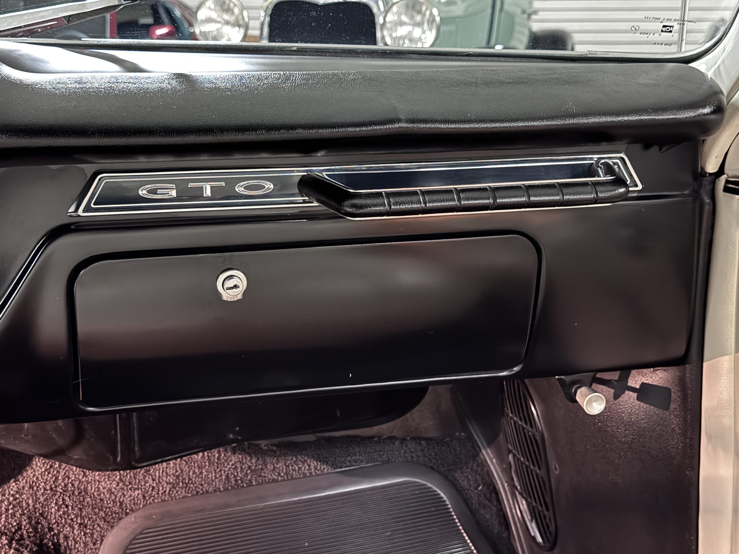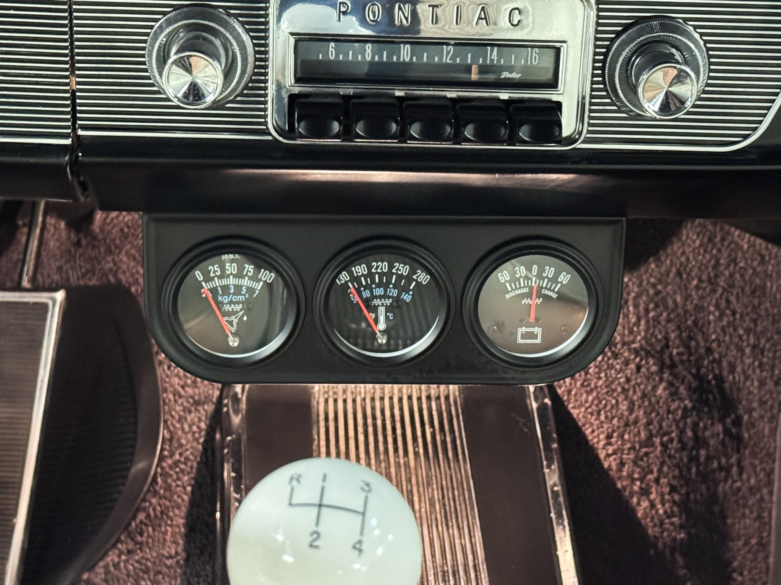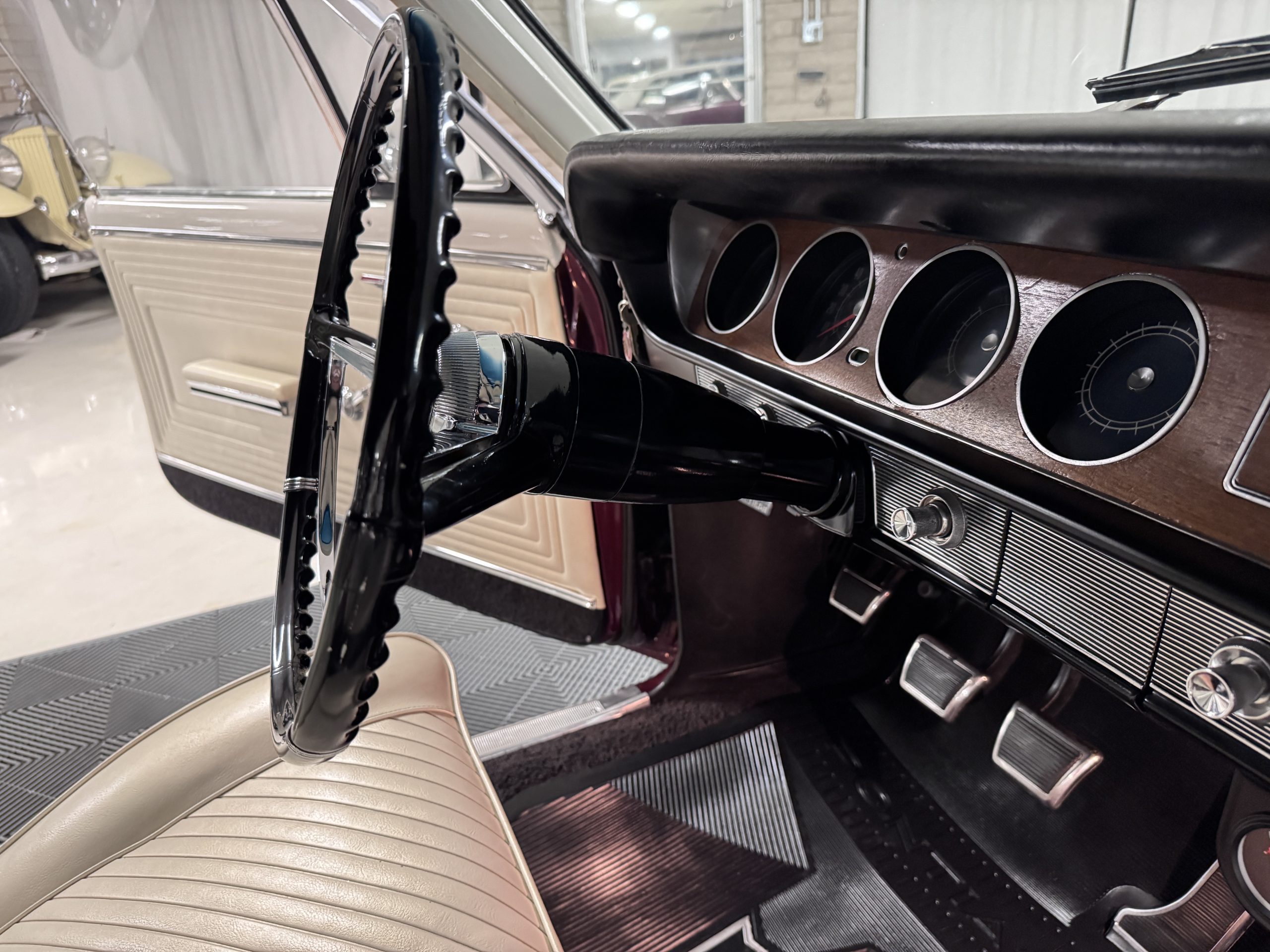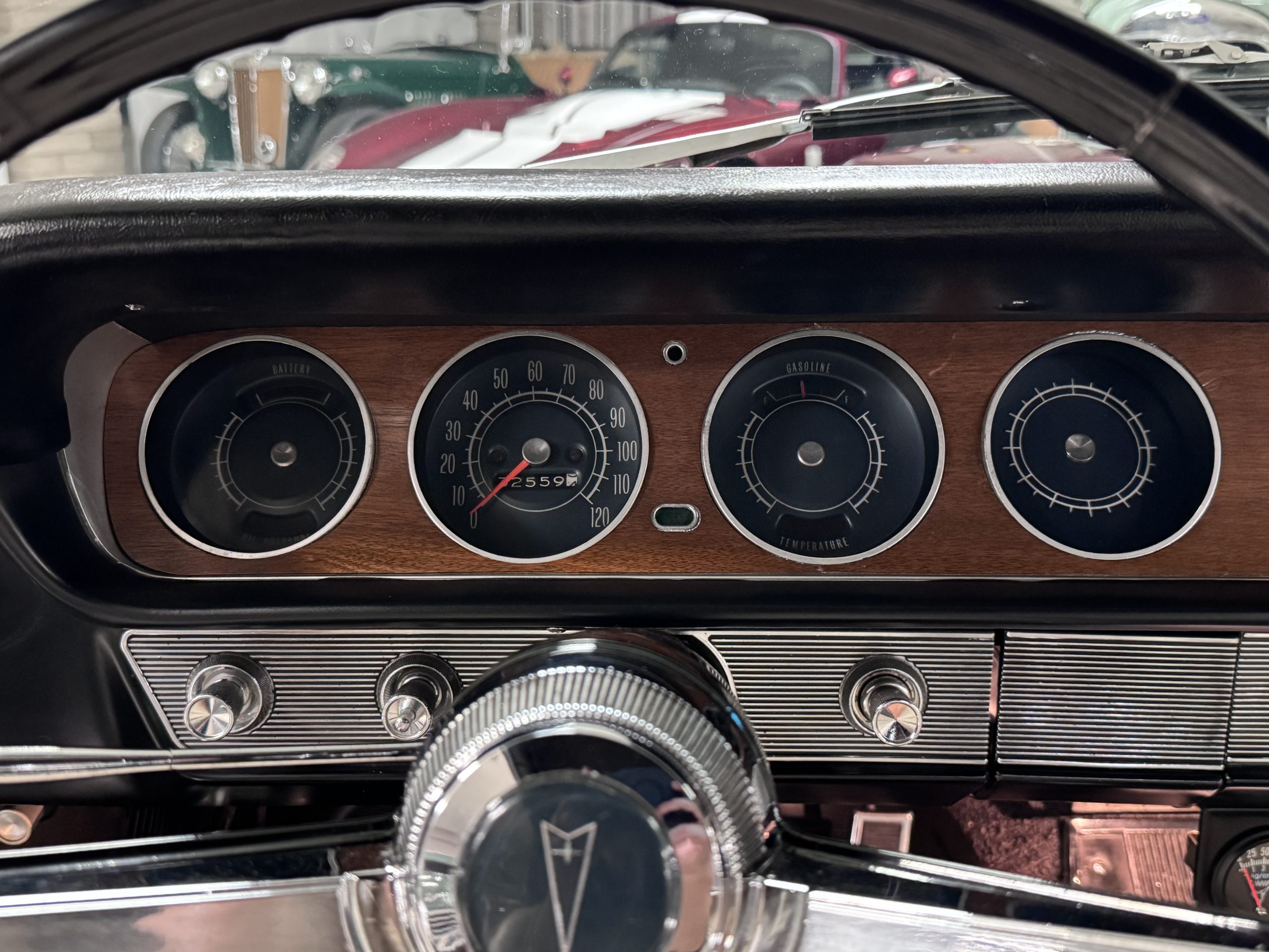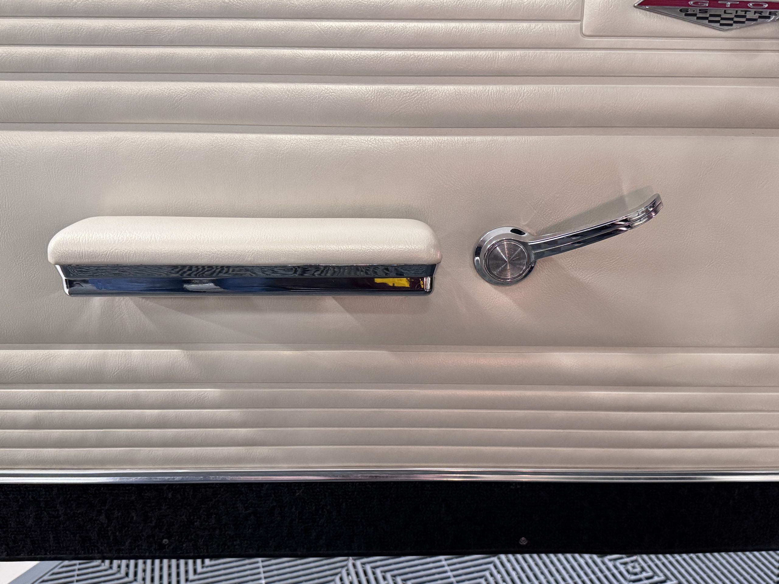 The Pontiac features Parchment front bucket seats and a rear bench in excellent condition, paired with black carpet and black rubber floor mats that are in excellent condition. The wood veneer dash and a period-correct Pontiac AM radio. The Pontiac is equipped with a power-adjustable driver’s seat, deluxe steering wheel, center console, dual horns, and fully functioning fan, heater, and courtesy lighting. The cohesive interior presentation supports the Pontiac’s dual appeal for show presentation and enjoyable open-air touring.