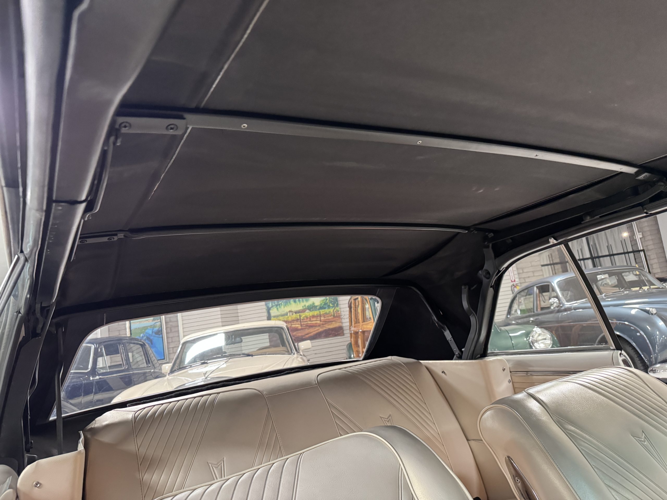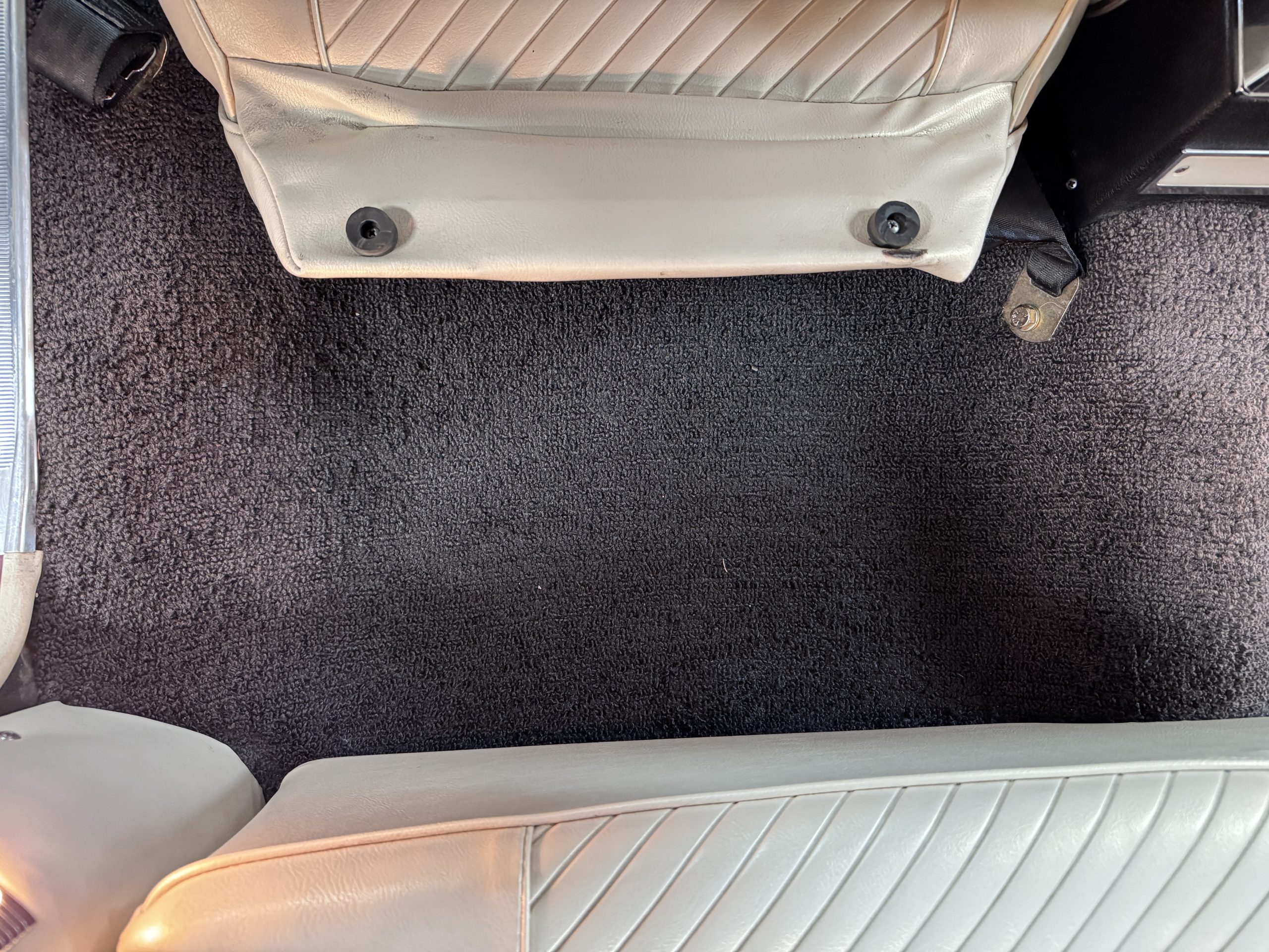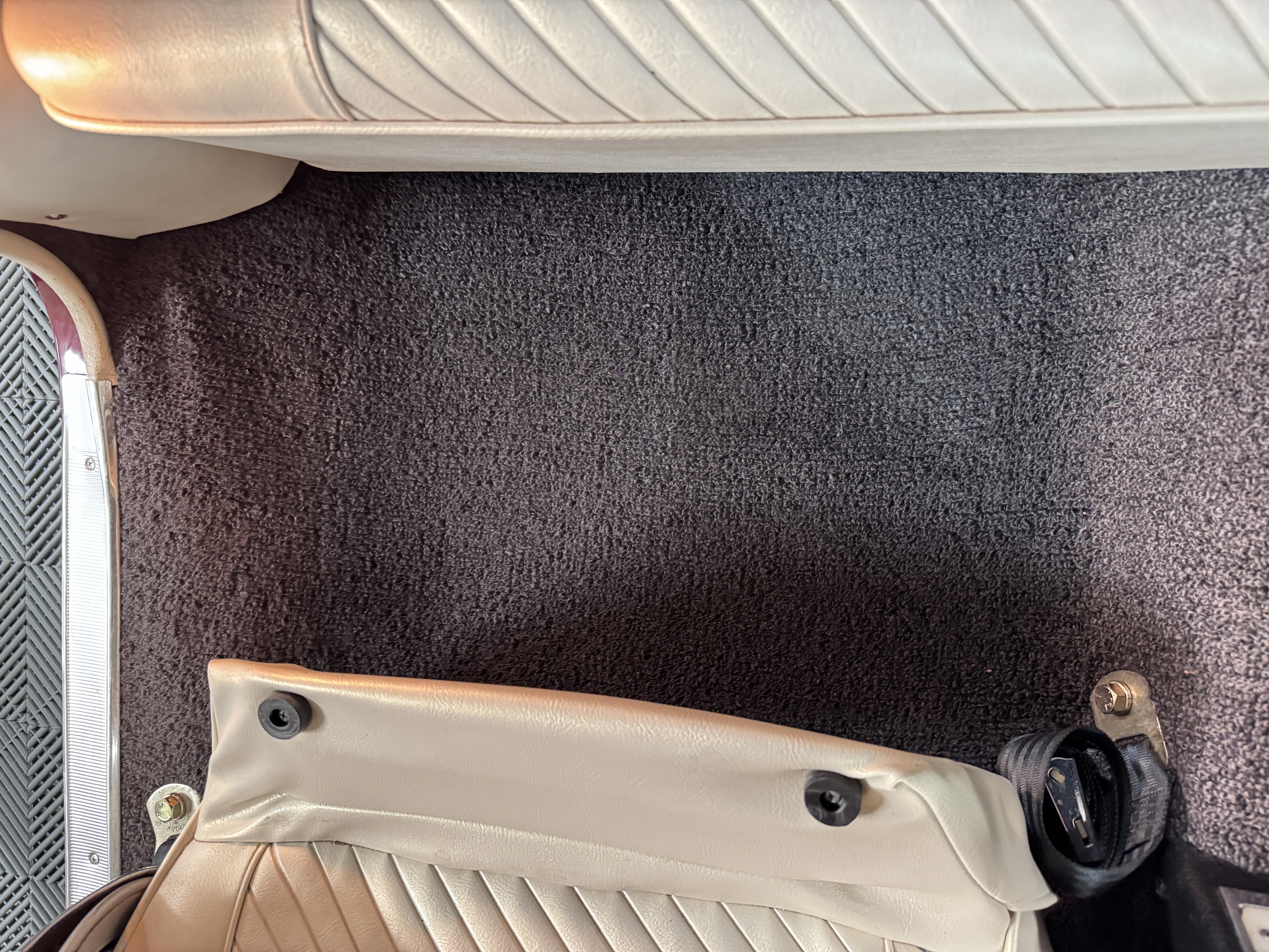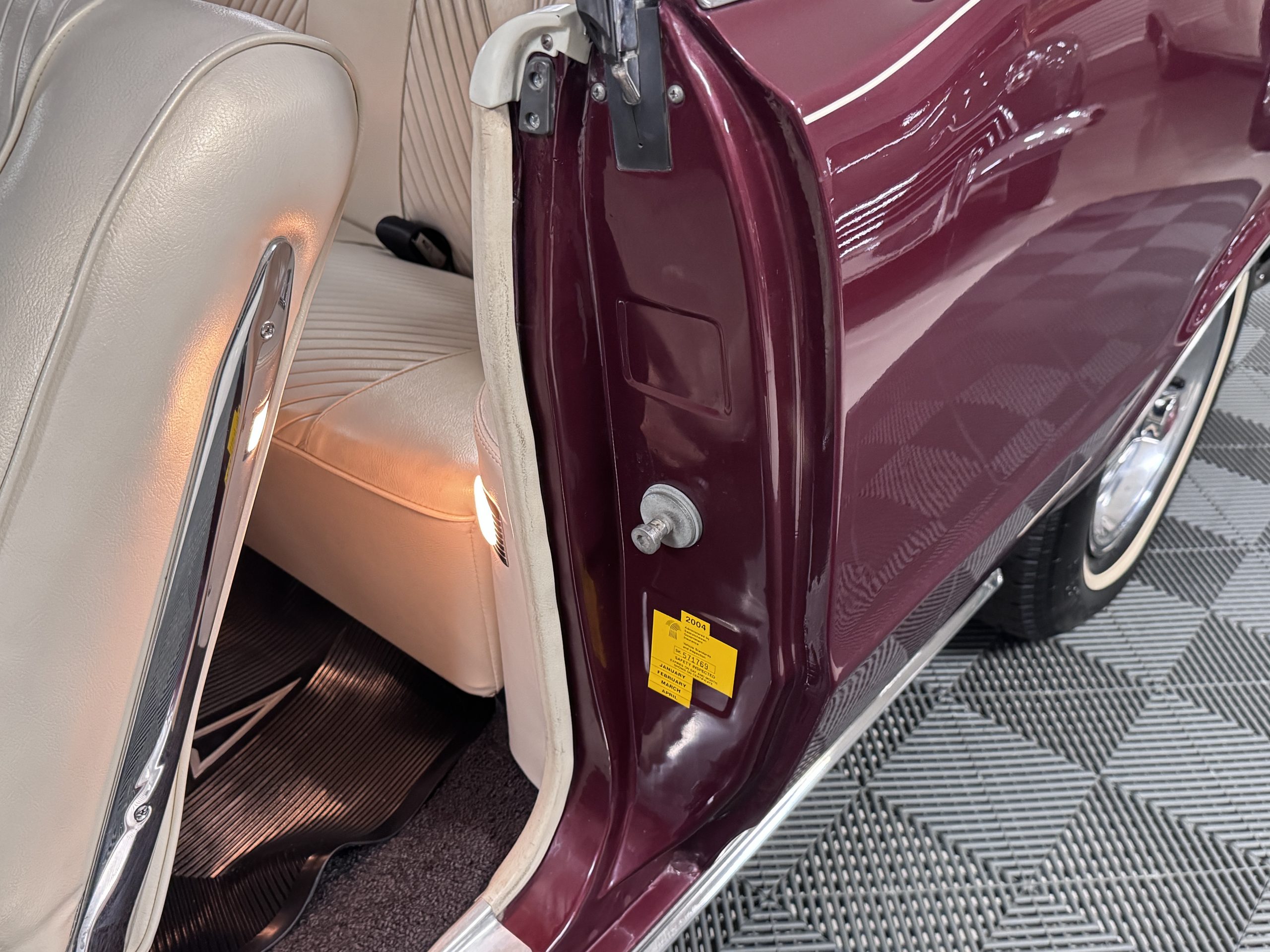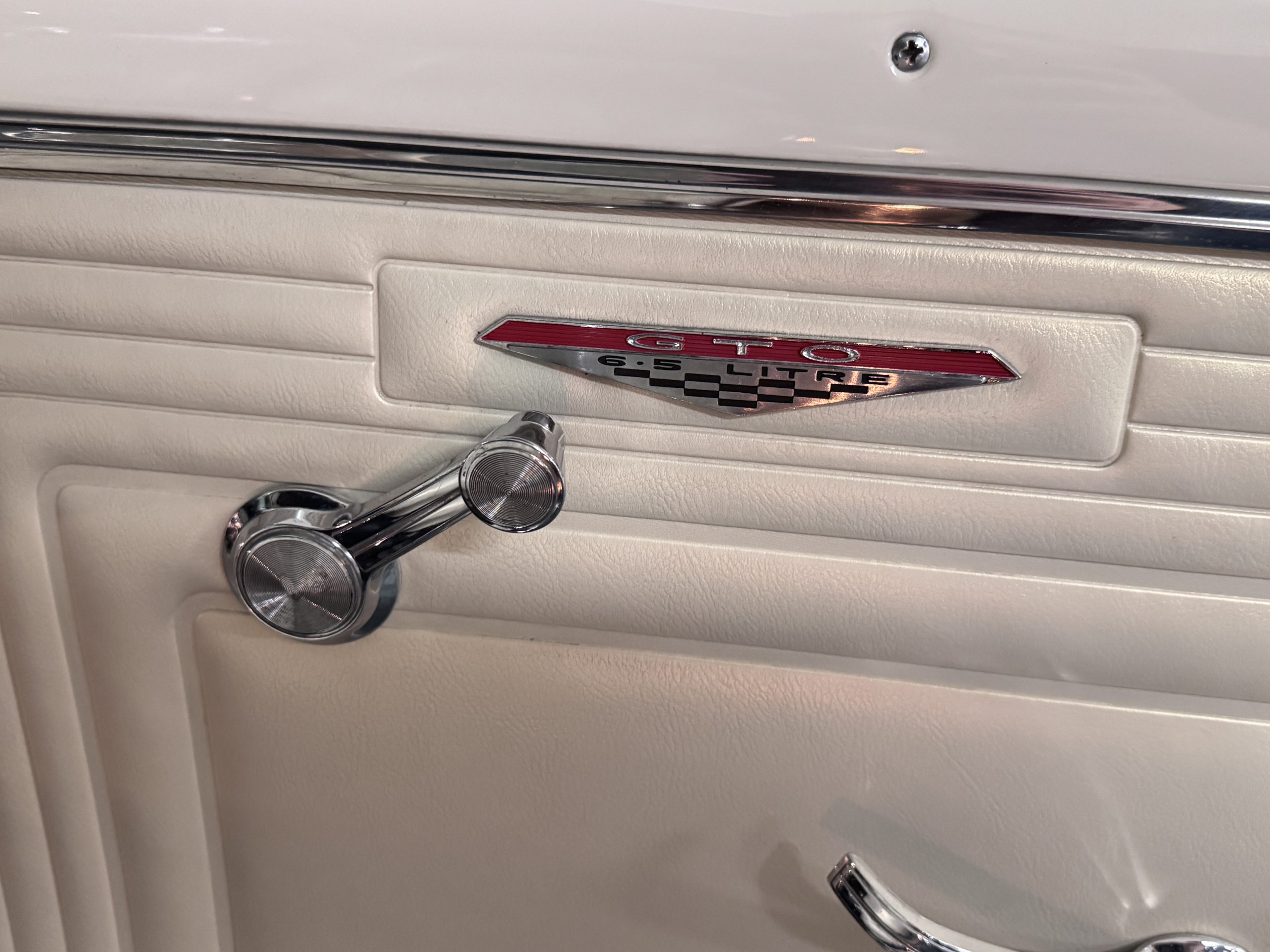 The Pontiac features Parchment front bucket seats and a rear bench in excellent condition, paired with black carpet and black rubber floor mats that are in excellent condition. The wood veneer dash and a period-correct Pontiac AM radio. The Pontiac is equipped with a power-adjustable driver’s seat, deluxe steering wheel, center console, dual horns, and fully functioning fan, heater, and courtesy lighting. The cohesive interior presentation supports the Pontiac’s dual appeal for show presentation and enjoyable open-air touring.