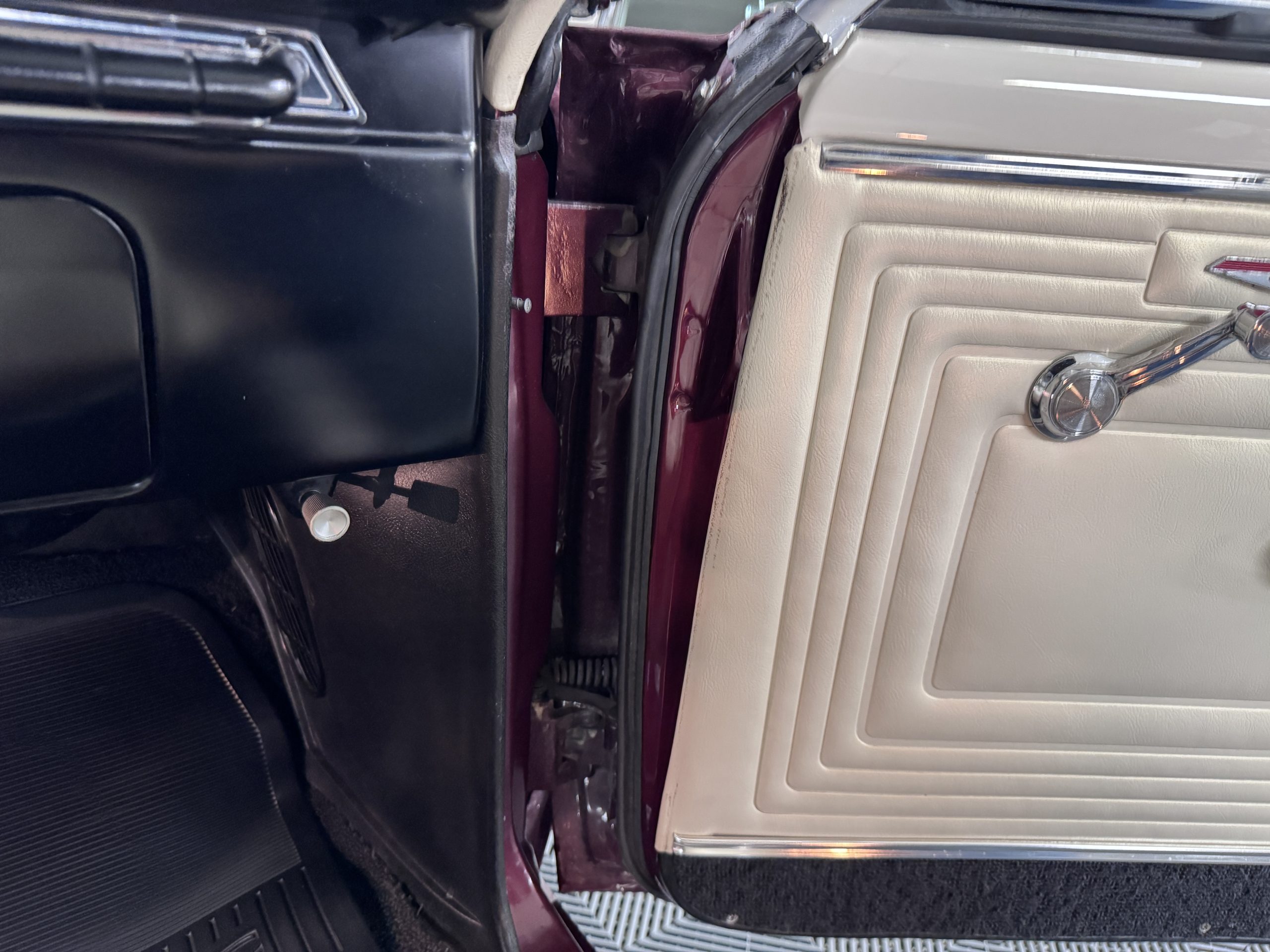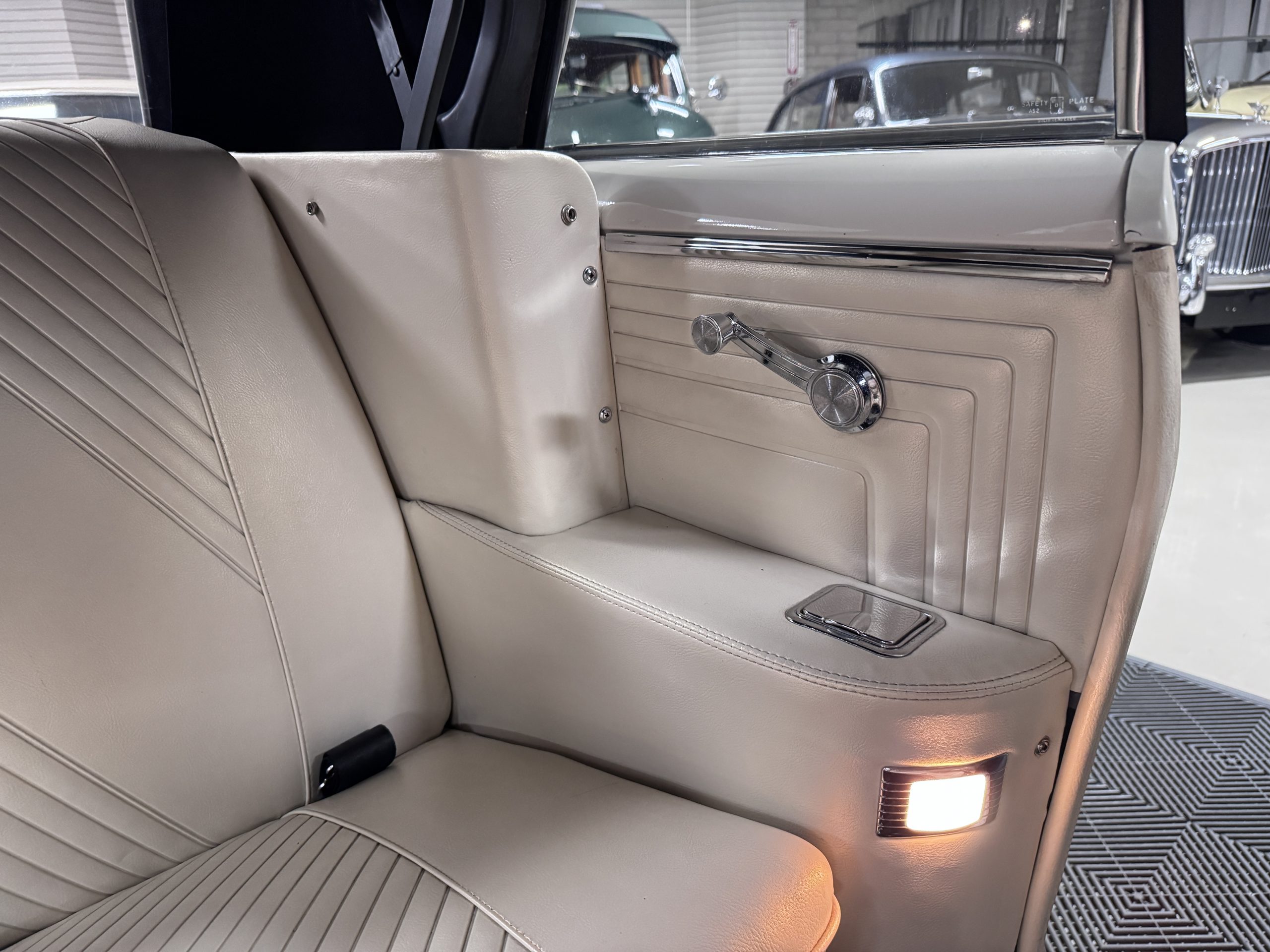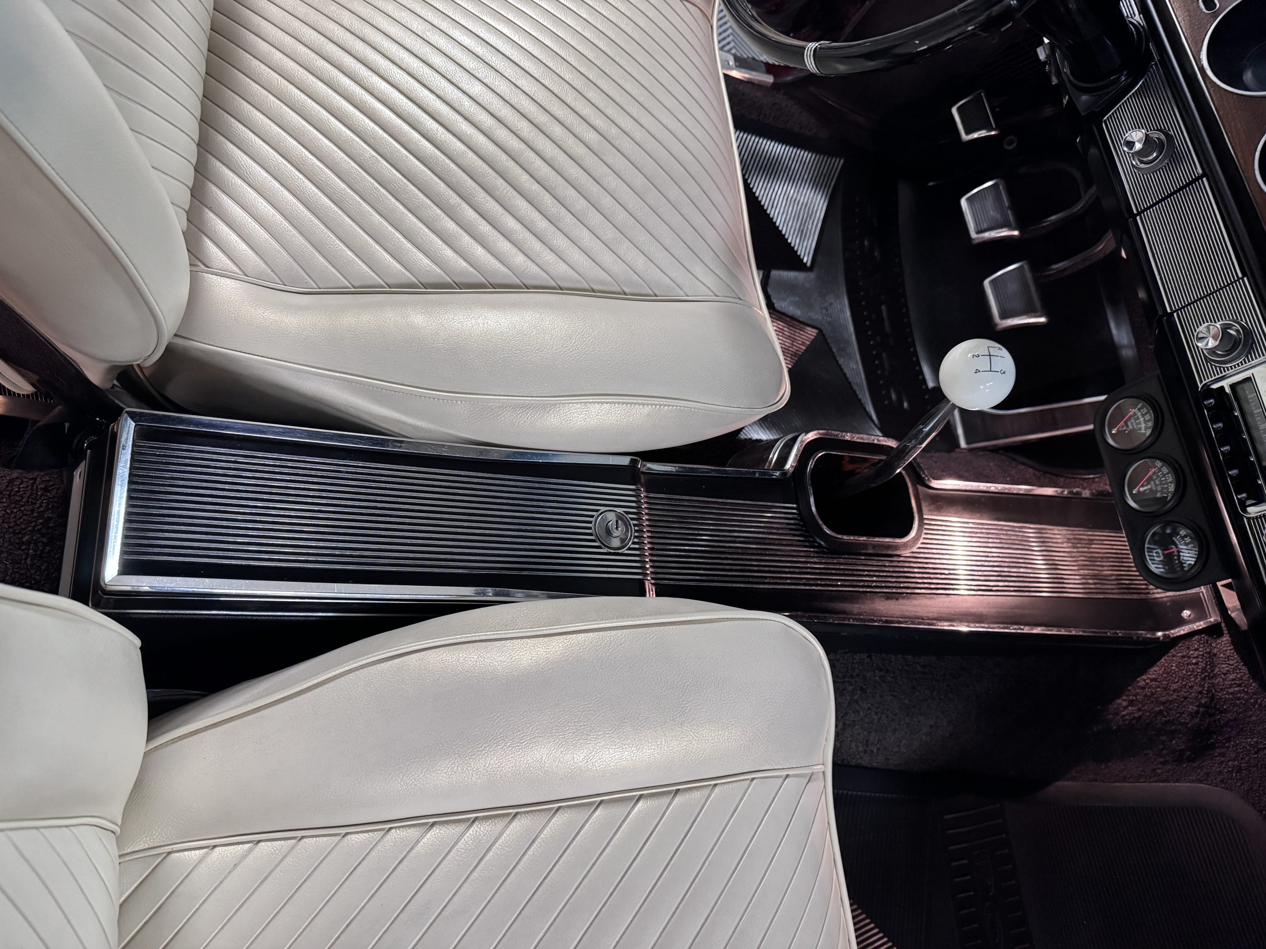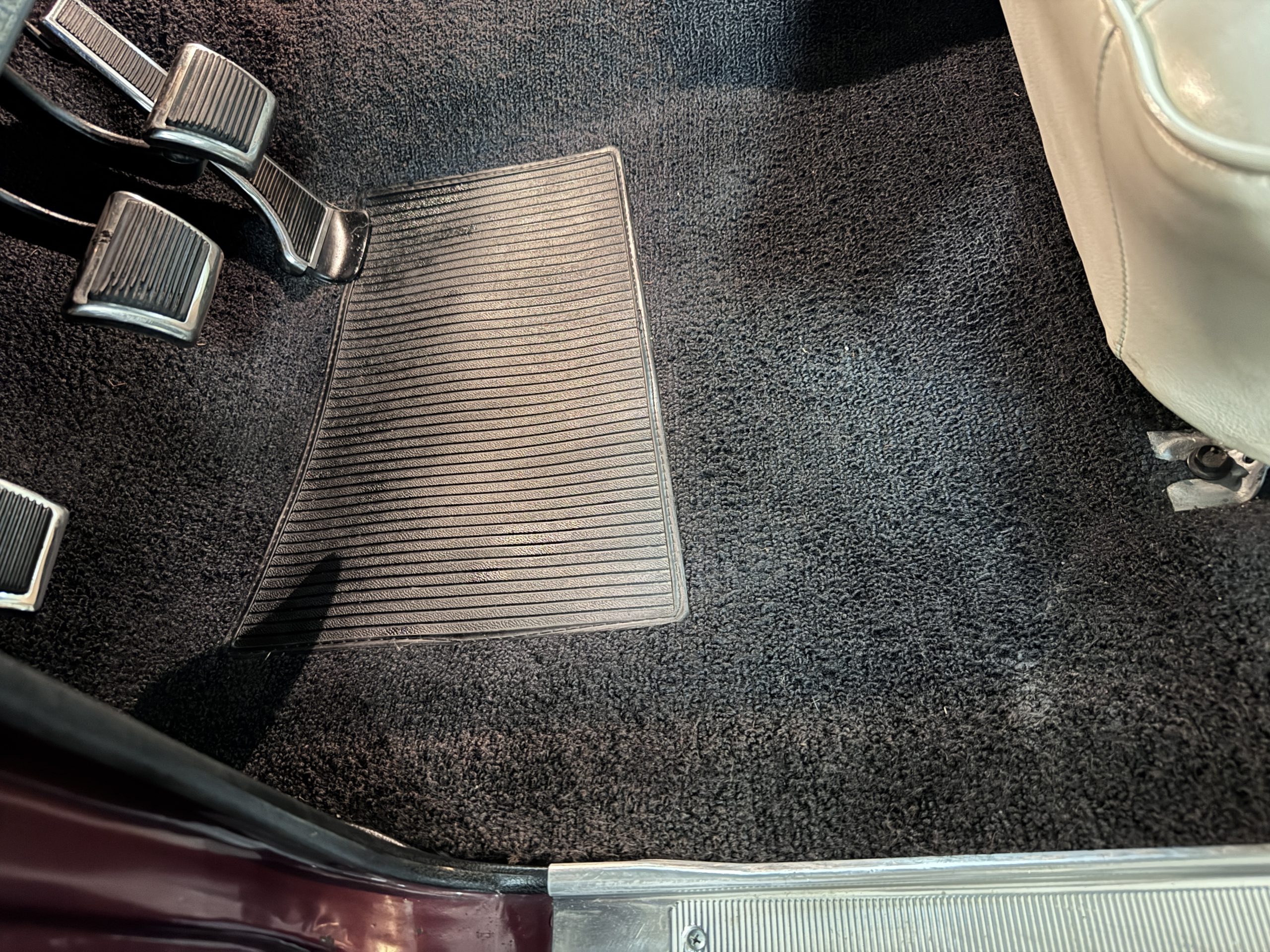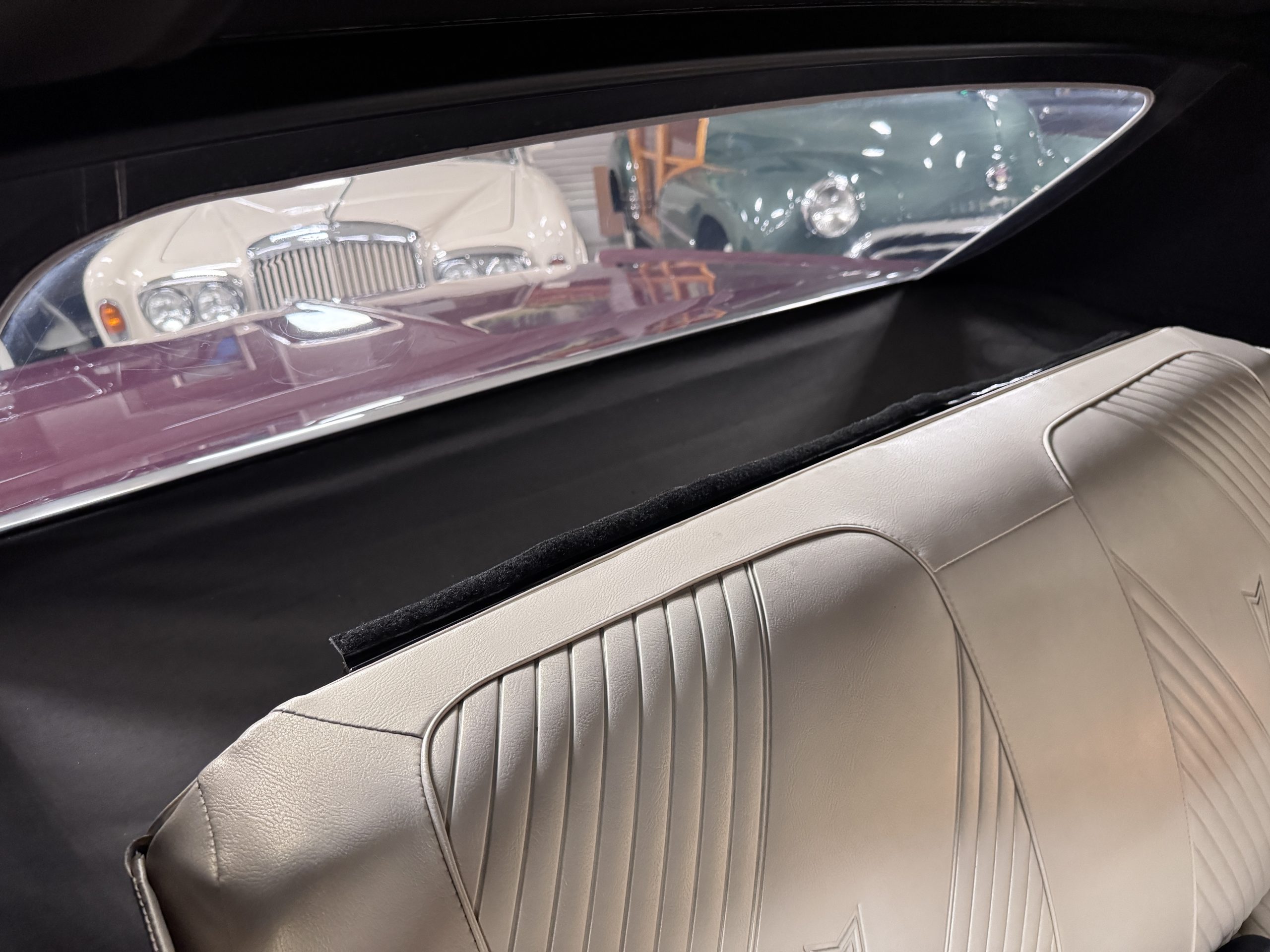The Pontiac features Parchment front bucket seats and a rear bench in excellent condition, paired with black carpet and black rubber floor mats that are in excellent condition. The wood veneer dash and a period-correct Pontiac AM radio. The Pontiac is equipped with a power-adjustable driver’s seat, deluxe steering wheel, center console, dual horns, and fully functioning fan, heater, and courtesy lighting. The cohesive interior presentation supports the Pontiac’s dual appeal for show presentation and enjoyable open-air touring.