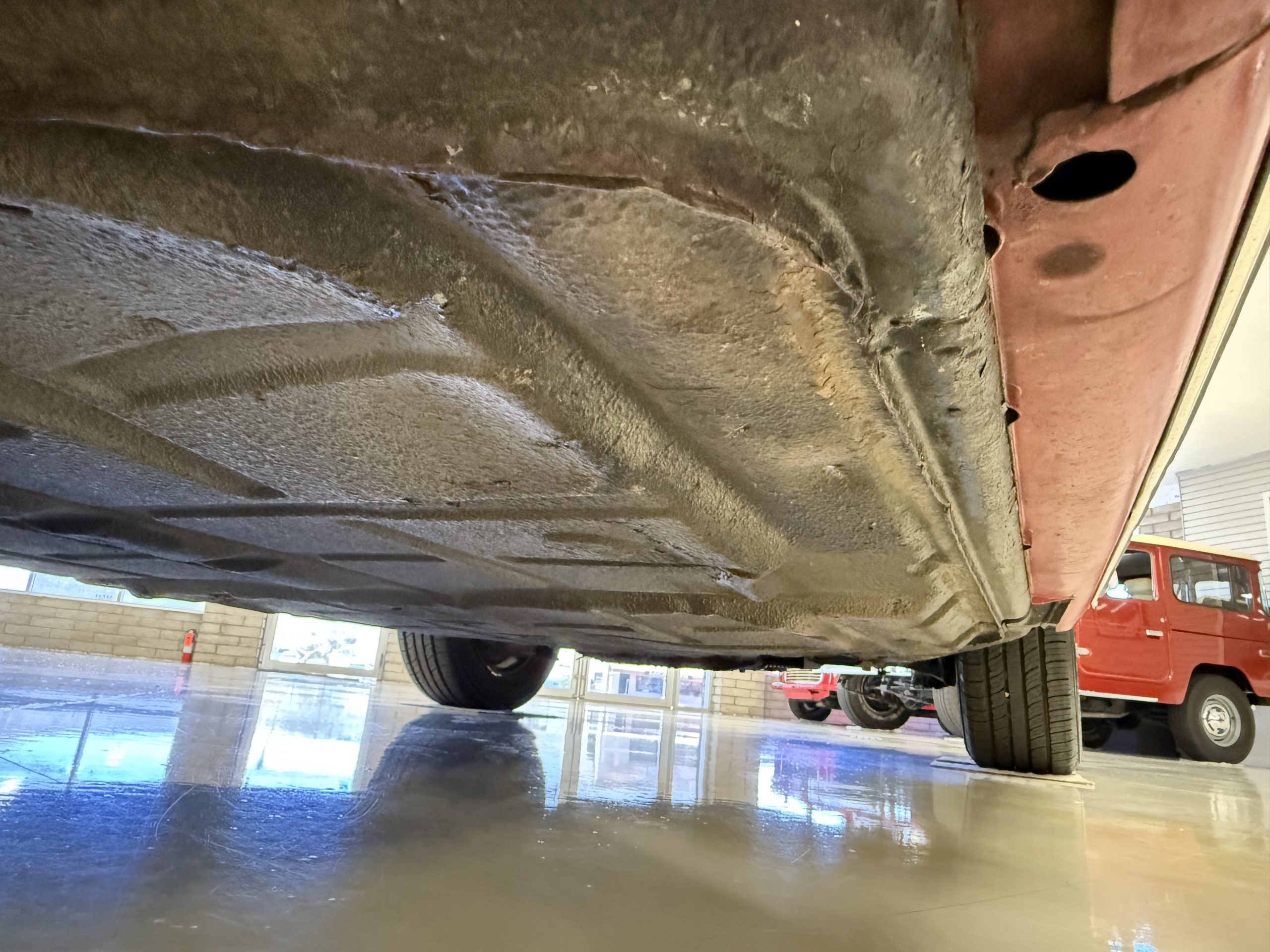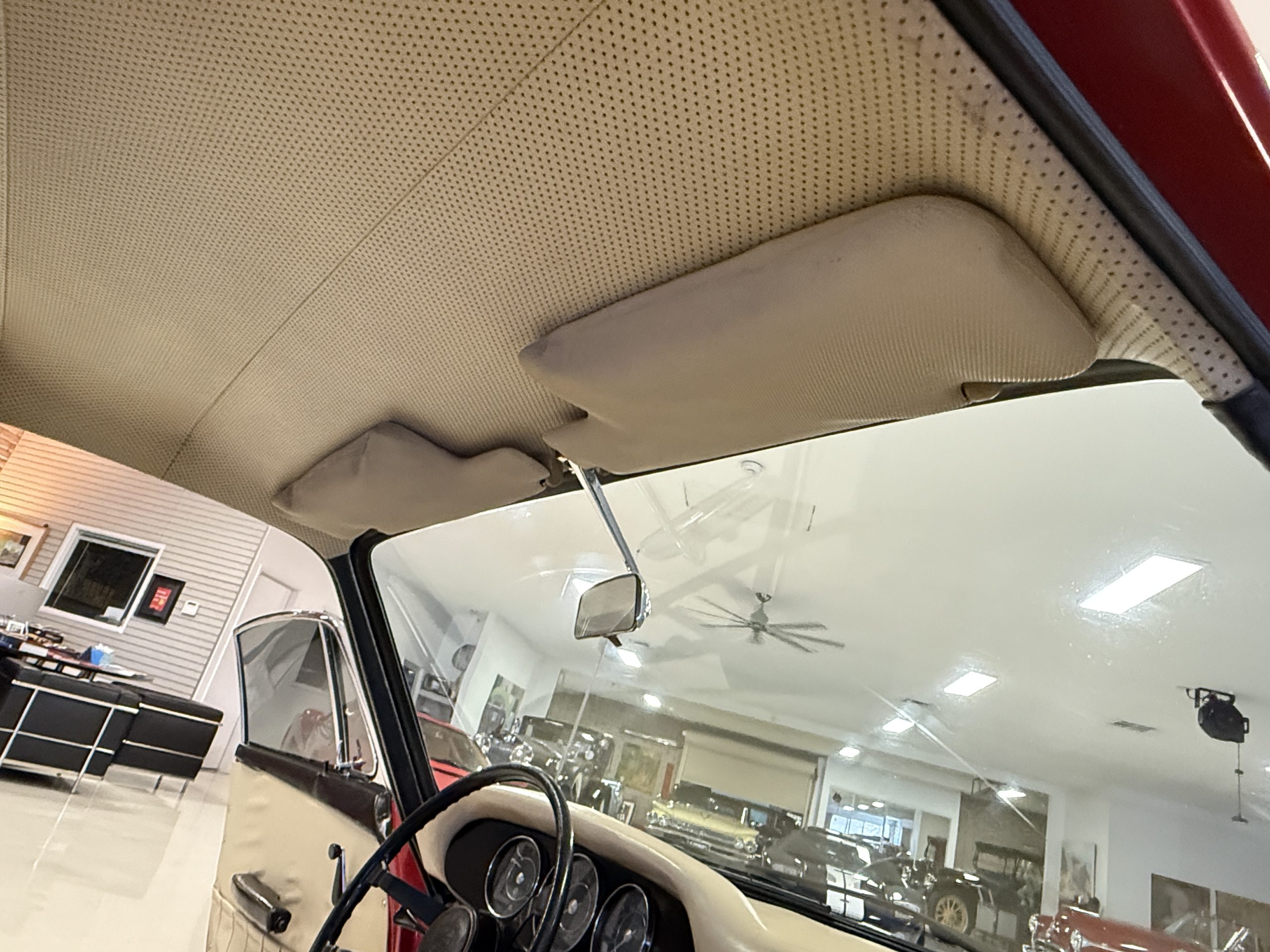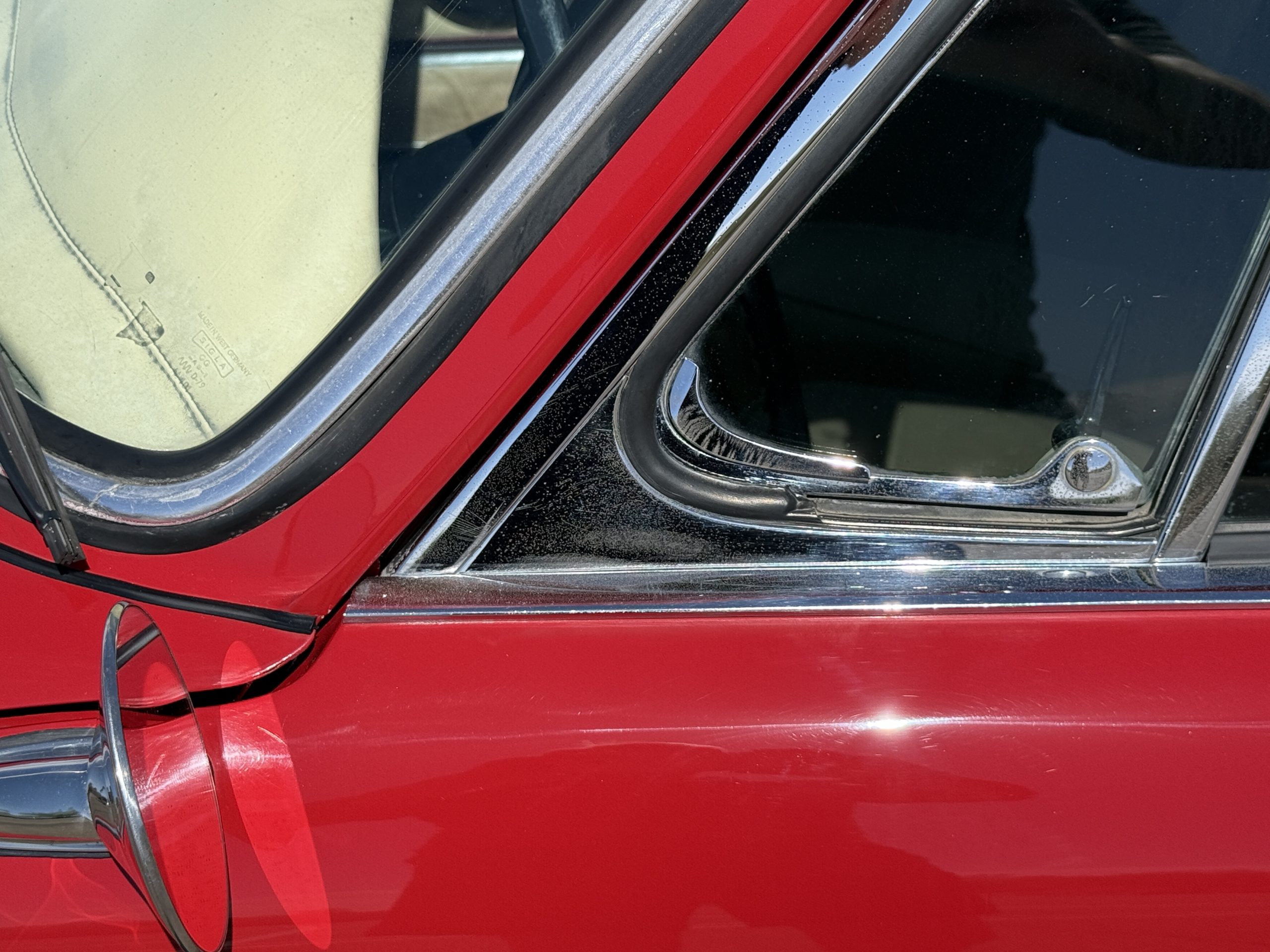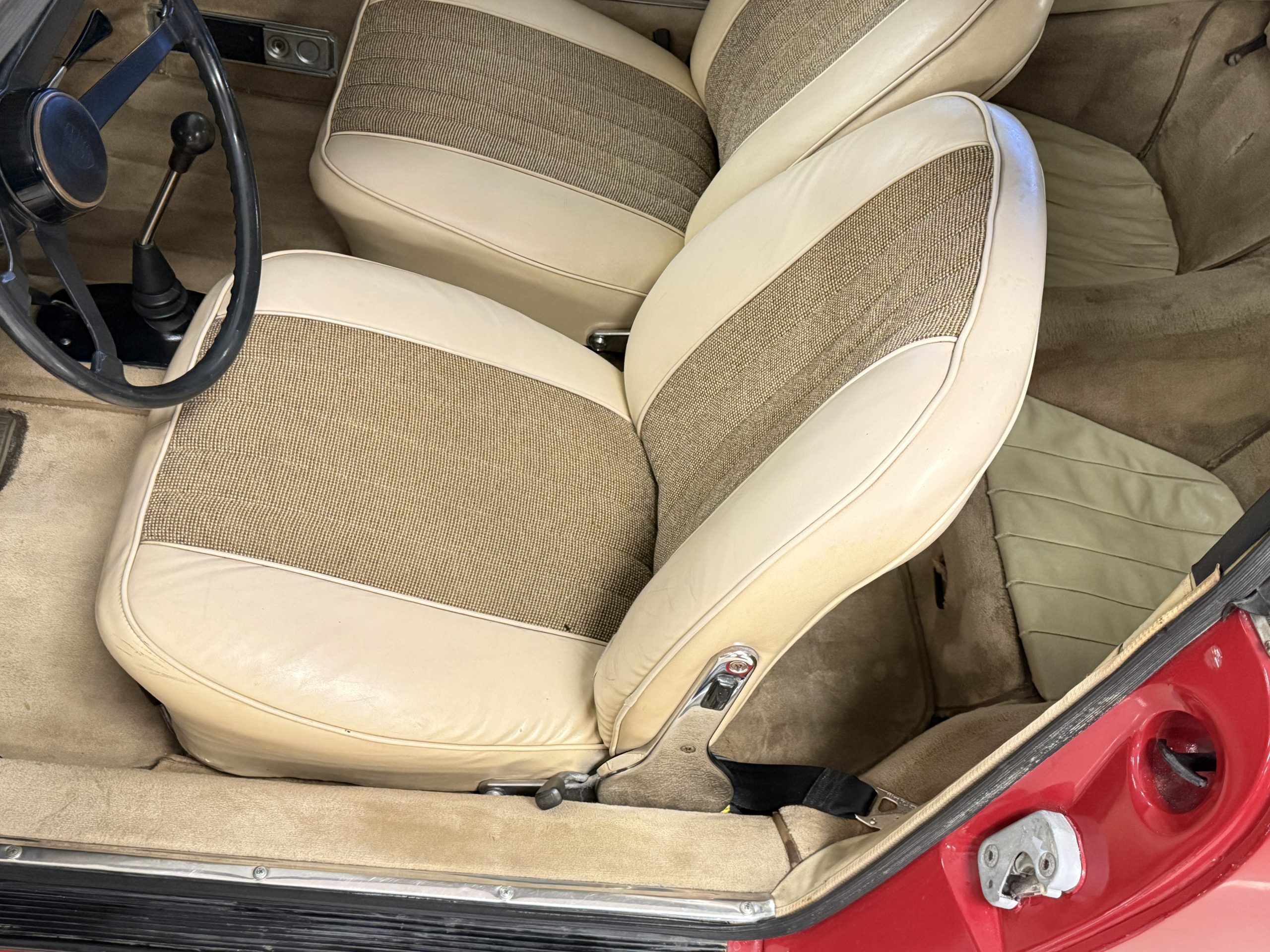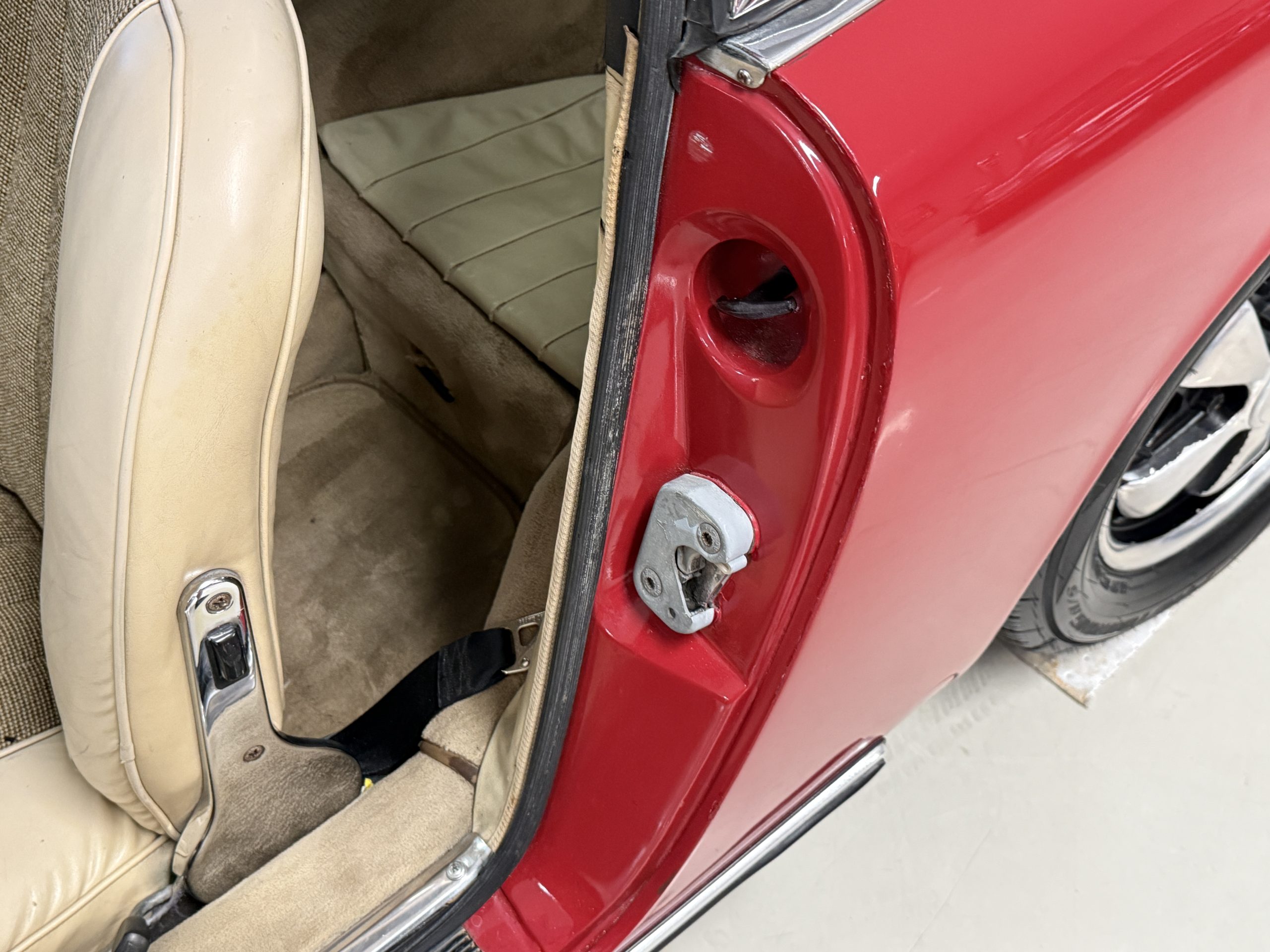 Originally this was Sand Beige and was repainted in red under prior ownership. Exterior features include bright bumpers with guards, bright windshield wipers, a retractable antenna, and a single exhaust outlet. There are spots of rust and various paint blemishes around the body, close-up photos of which are provided in the gallery.
