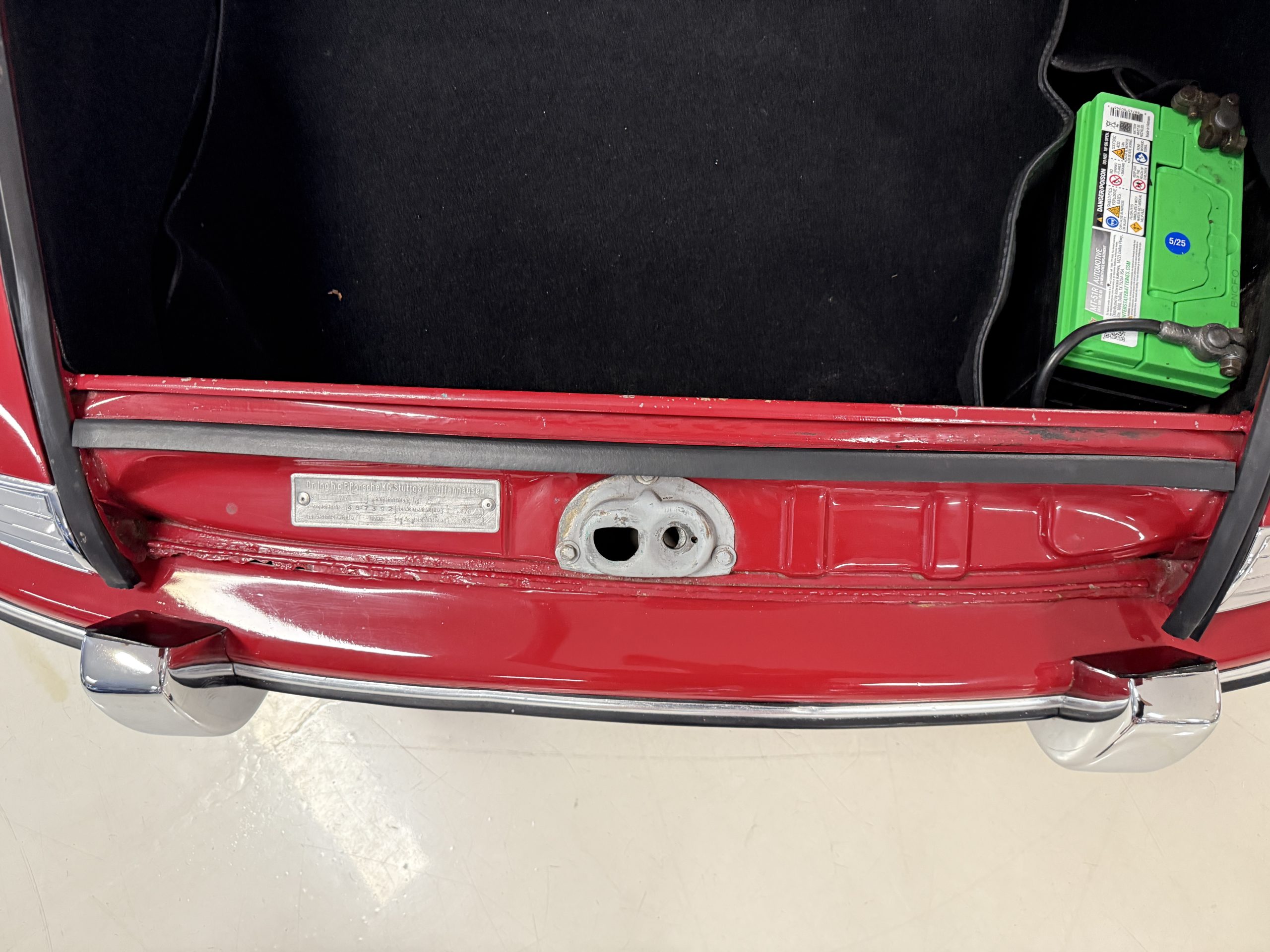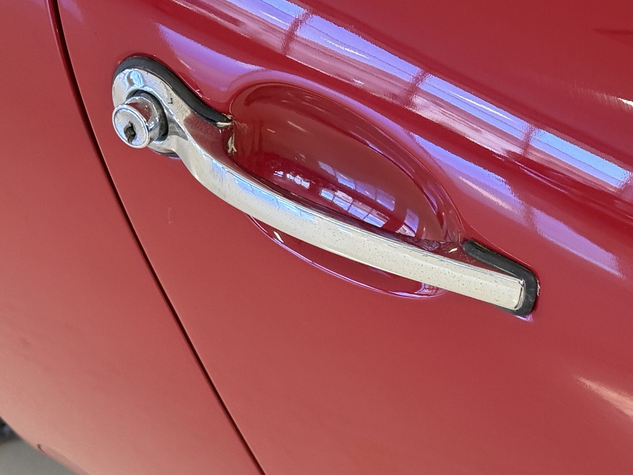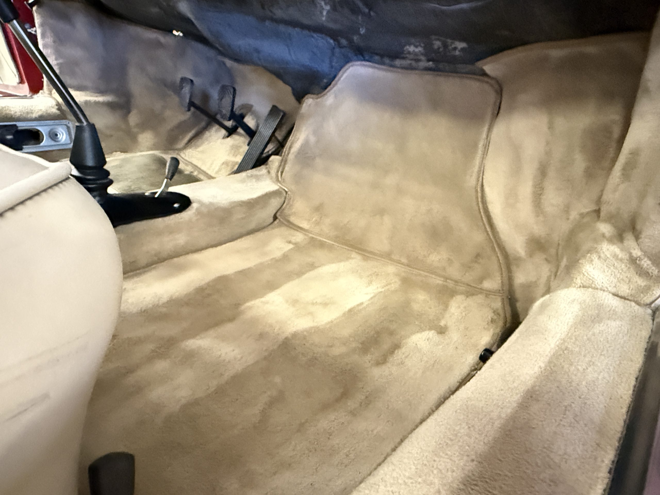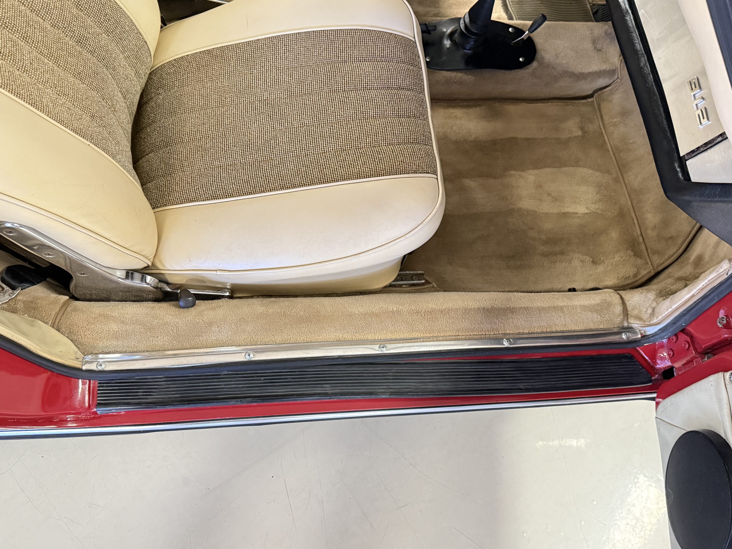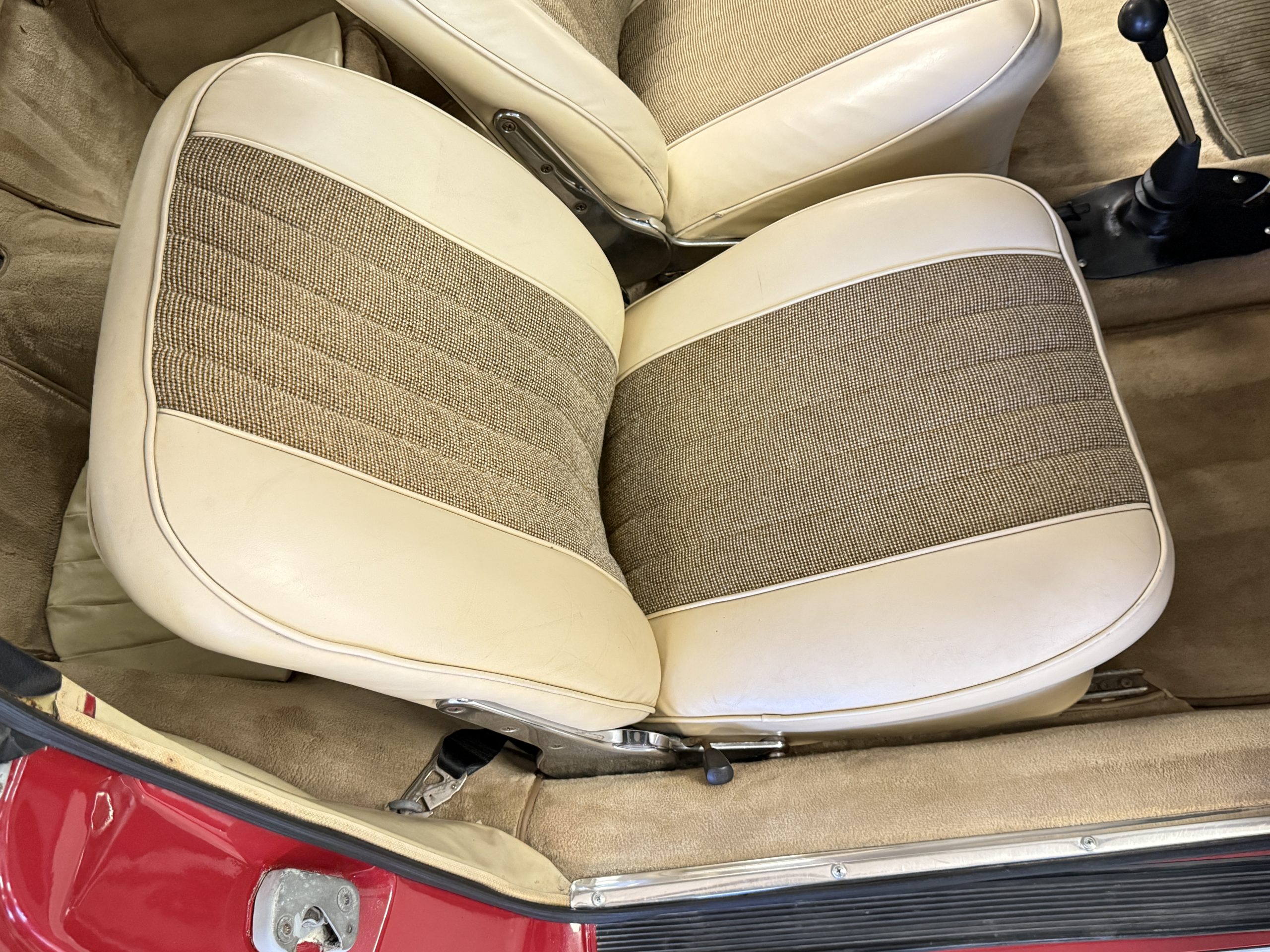Originally this was Sand Beige and was repainted in red under prior ownership. Exterior features include bright bumpers with guards, bright windshield wipers, a retractable antenna, and a single exhaust outlet. There are spots of rust and various paint blemishes around the body, close-up photos of which are provided in the gallery.