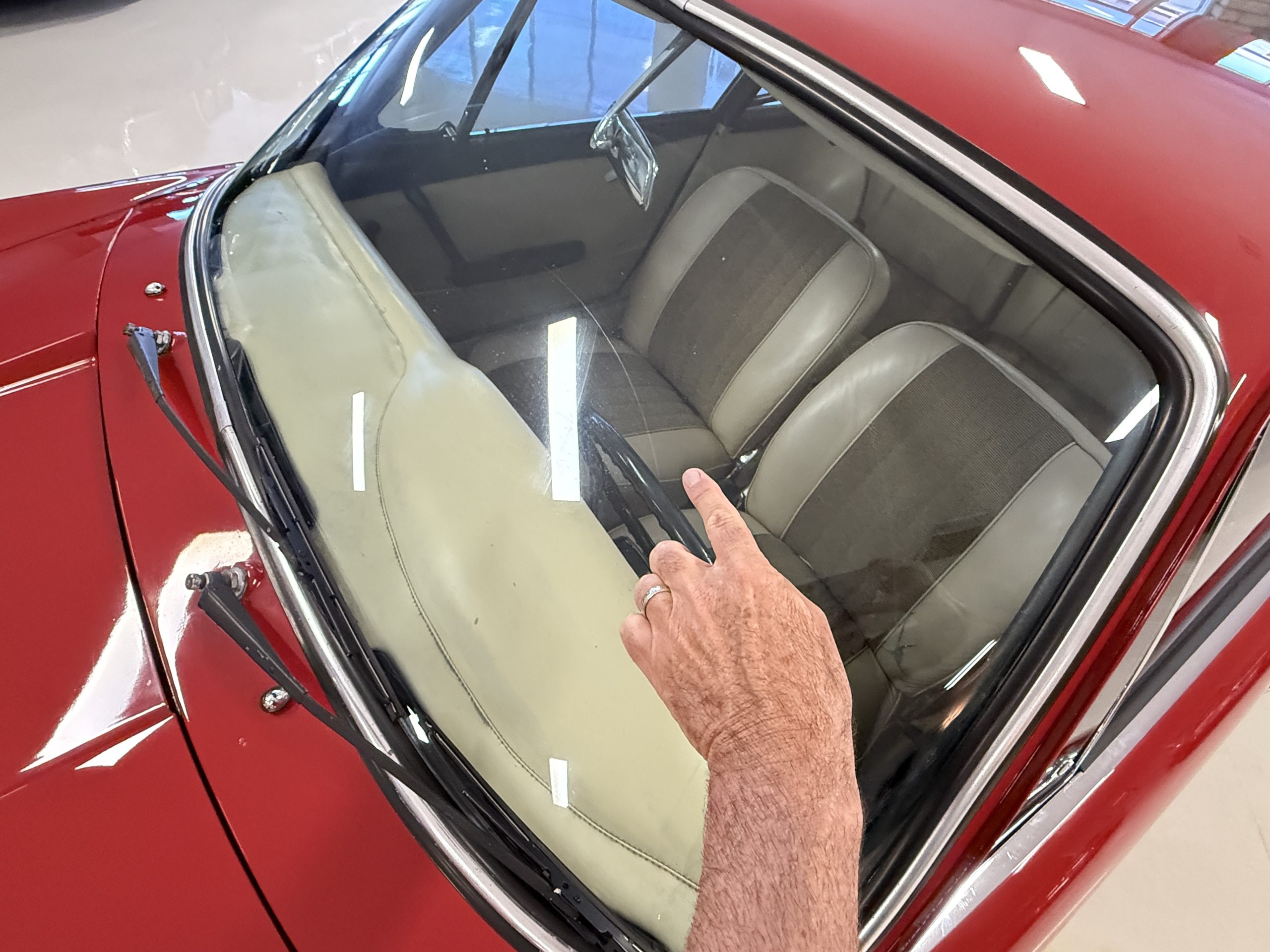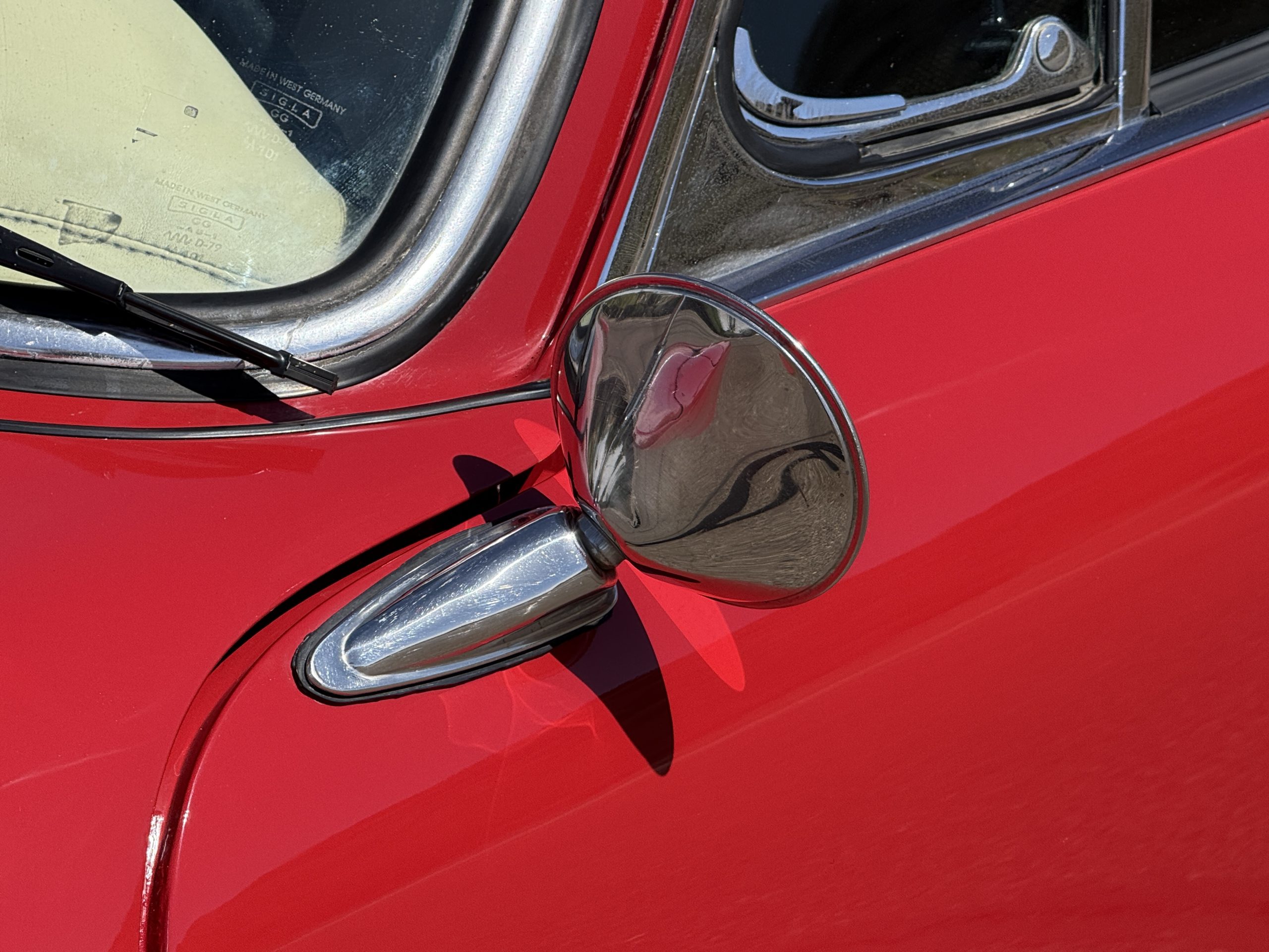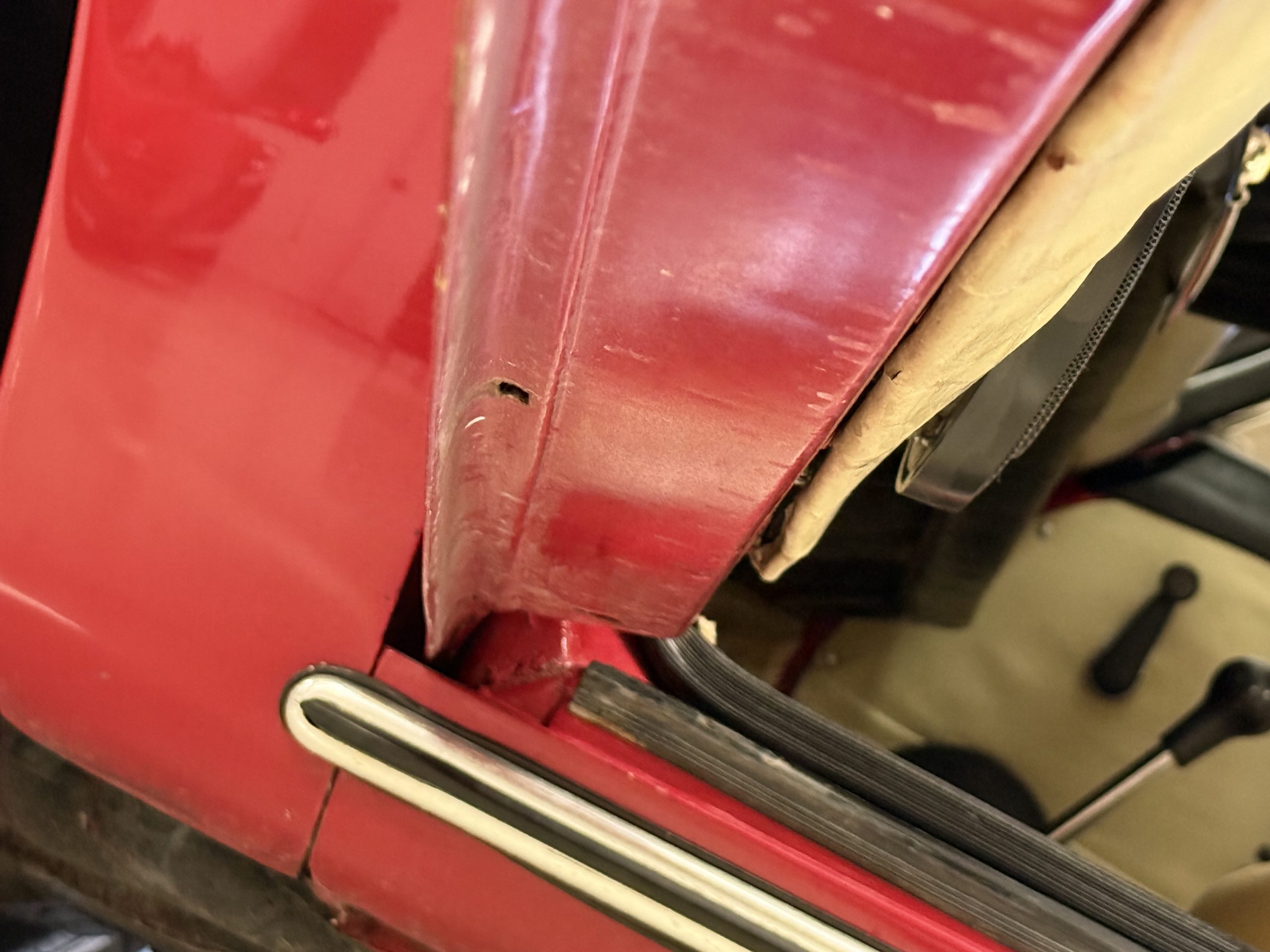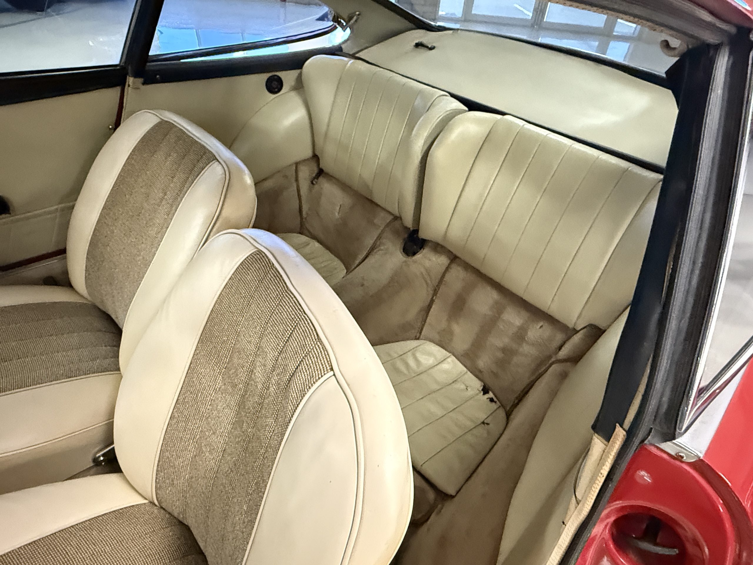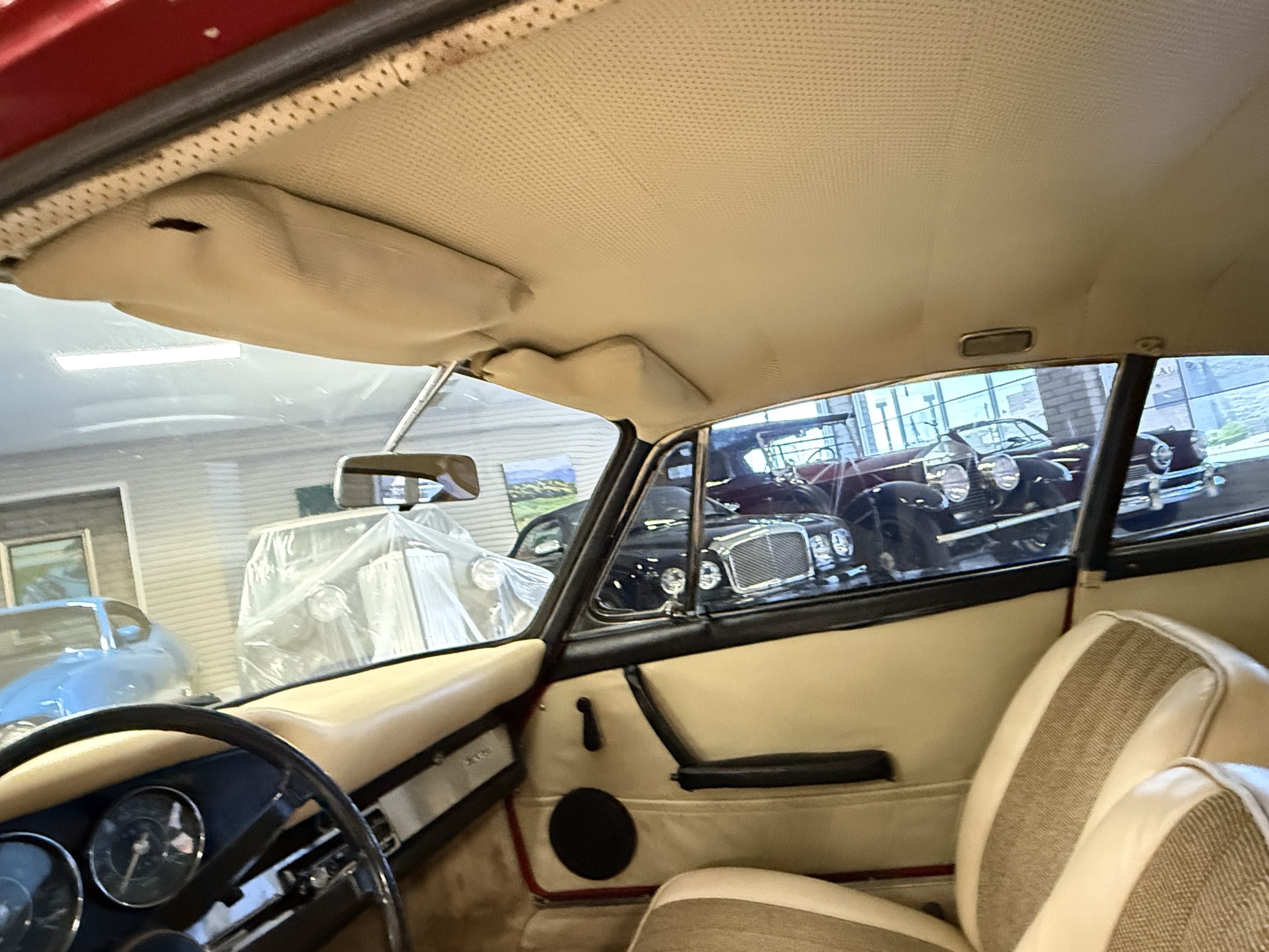 Originally this was Sand Beige and was repainted in red under prior ownership. Exterior features include bright bumpers with guards, bright windshield wipers, a retractable antenna, and a single exhaust outlet. There are spots of rust and various paint blemishes around the body, close-up photos of which are provided in the gallery.