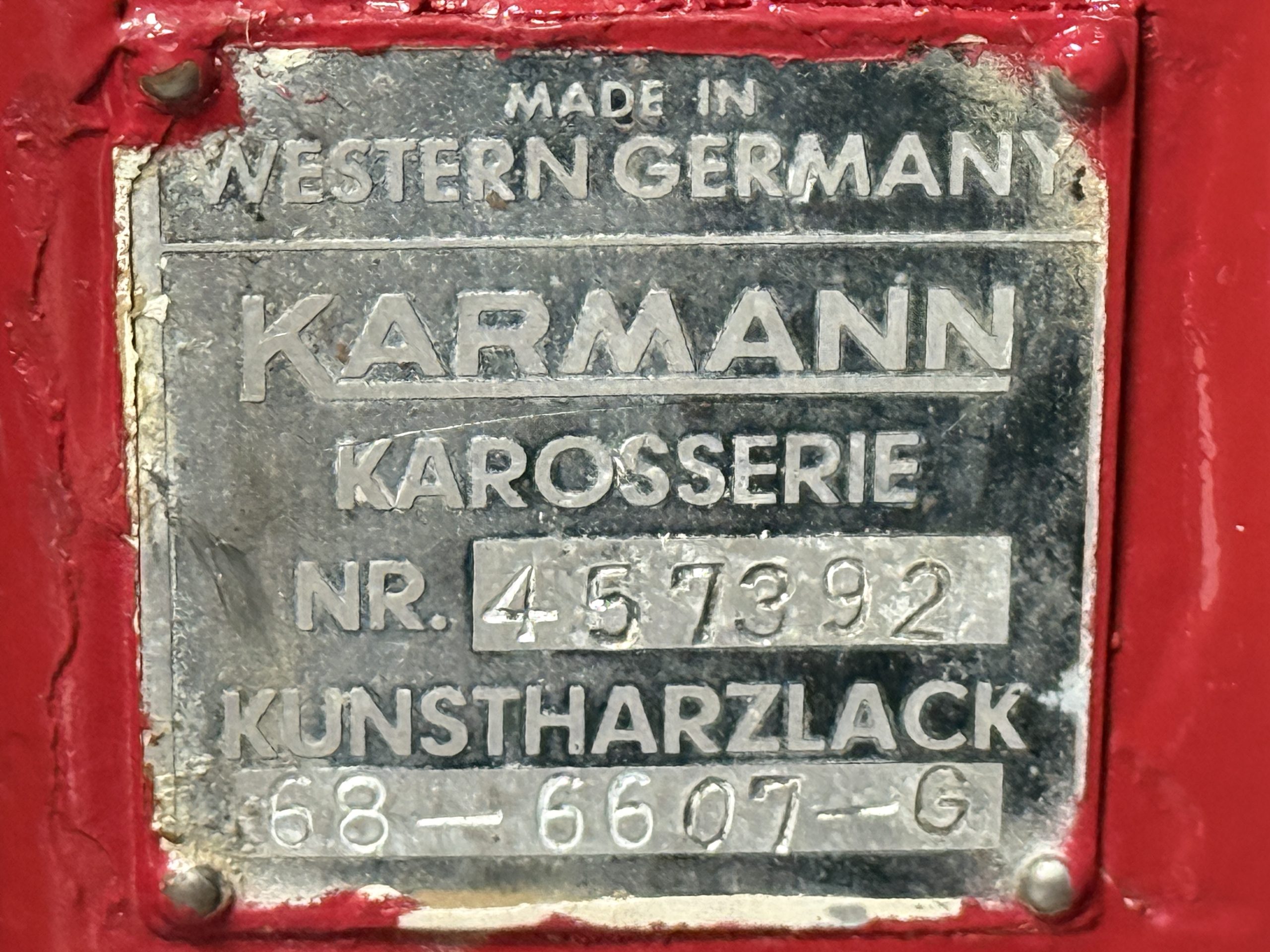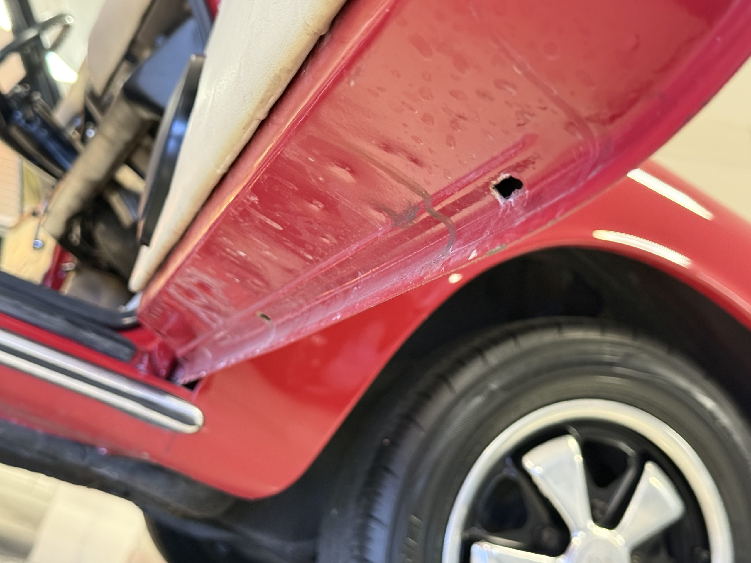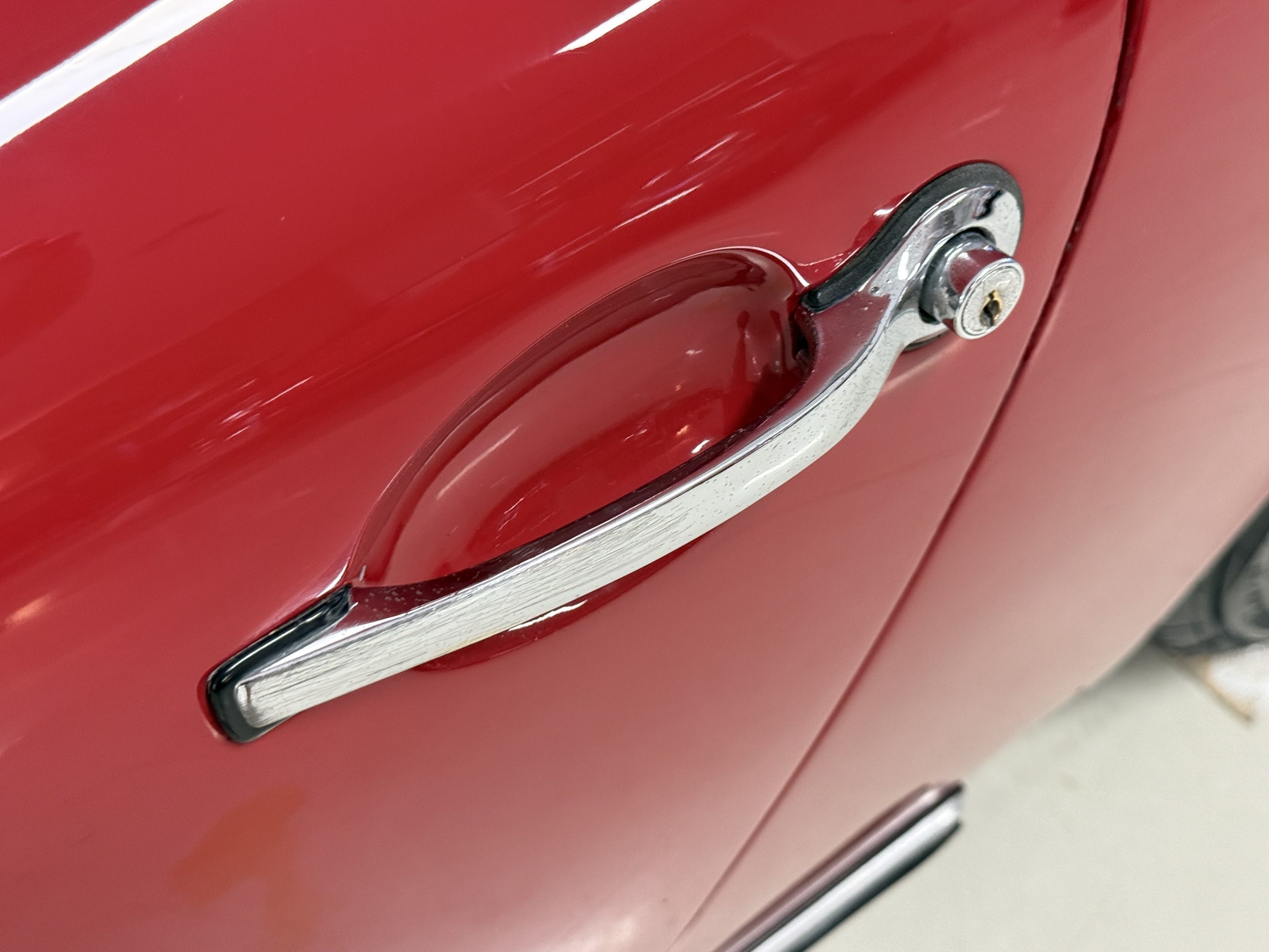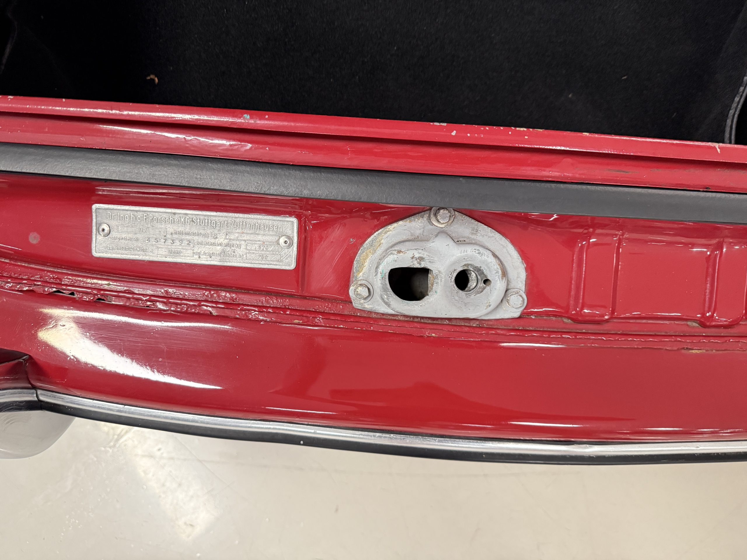 Originally this was Sand Beige and was repainted in red under prior ownership. Exterior features include bright bumpers with guards, bright windshield wipers, a retractable antenna, and a single exhaust outlet. There are spots of rust and various paint blemishes around the body, close-up photos of which are provided in the gallery.