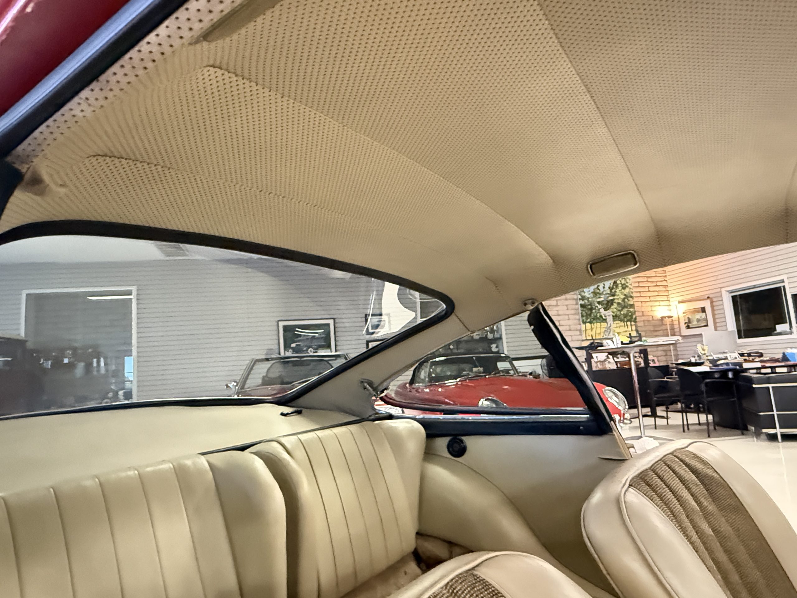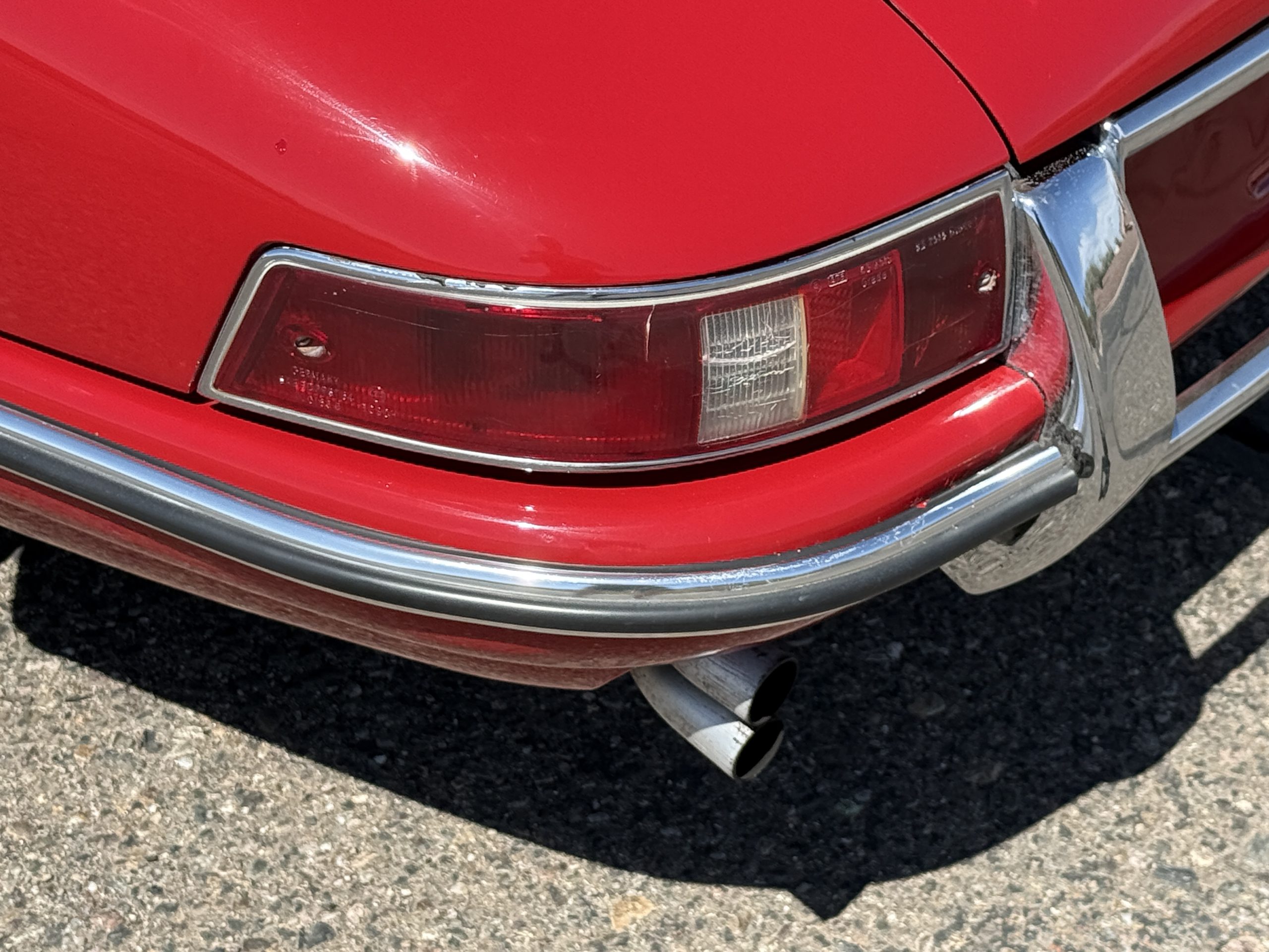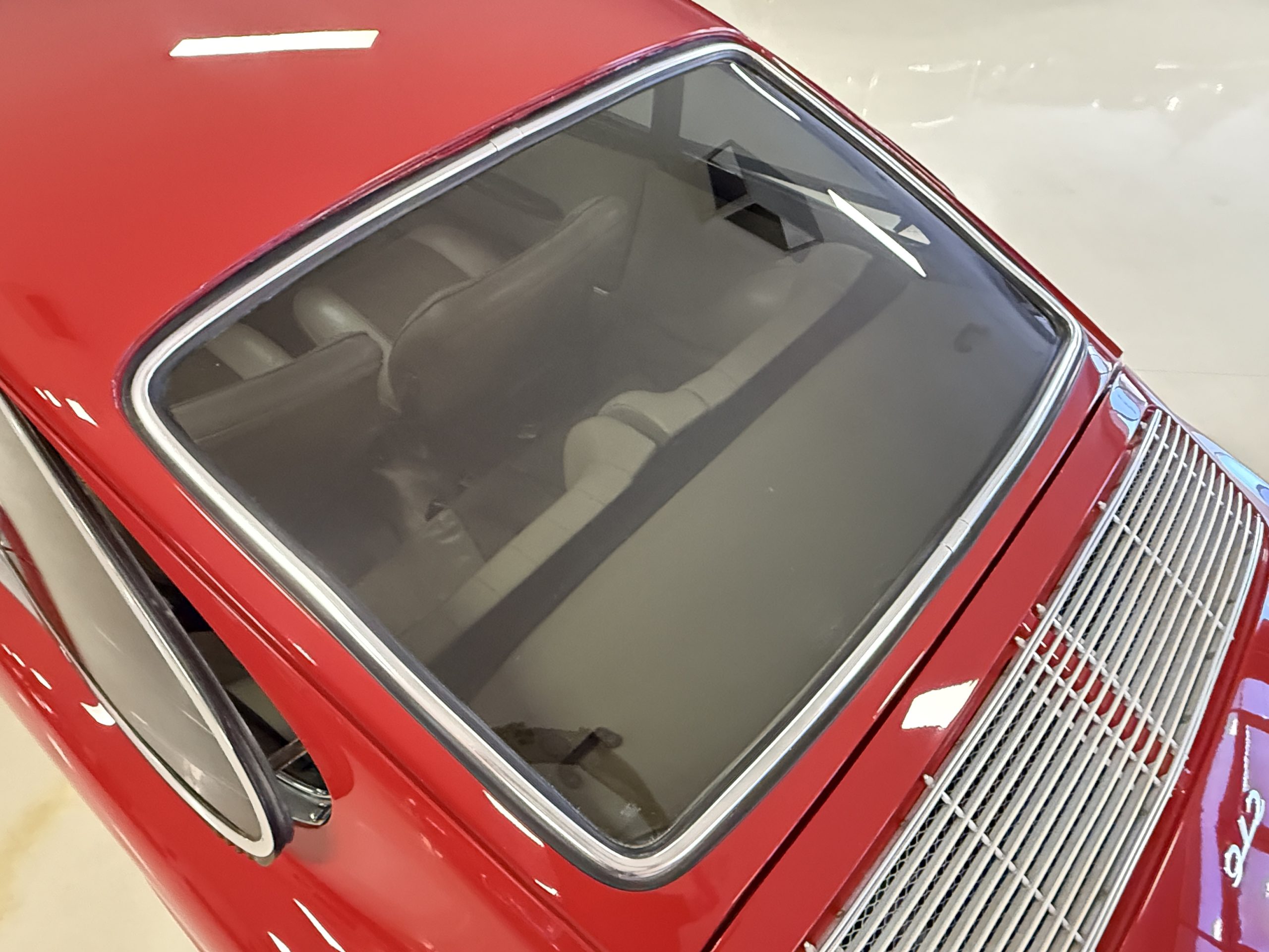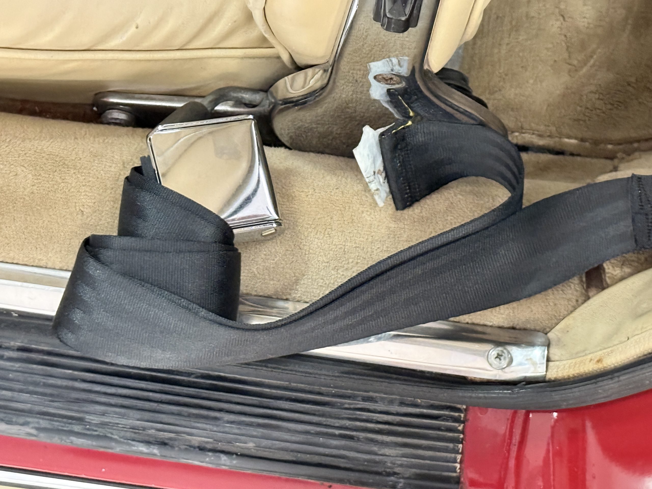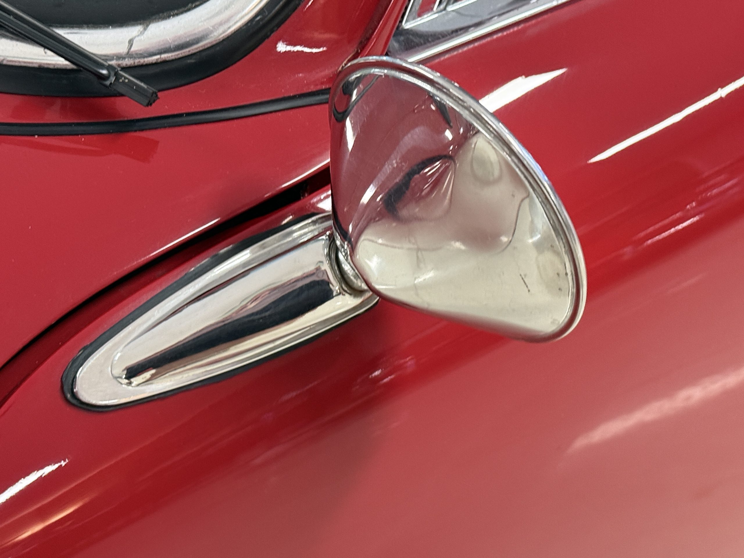 Originally this was Sand Beige and was repainted in red under prior ownership. Exterior features include bright bumpers with guards, bright windshield wipers, a retractable antenna, and a single exhaust outlet. There are spots of rust and various paint blemishes around the body, close-up photos of which are provided in the gallery.