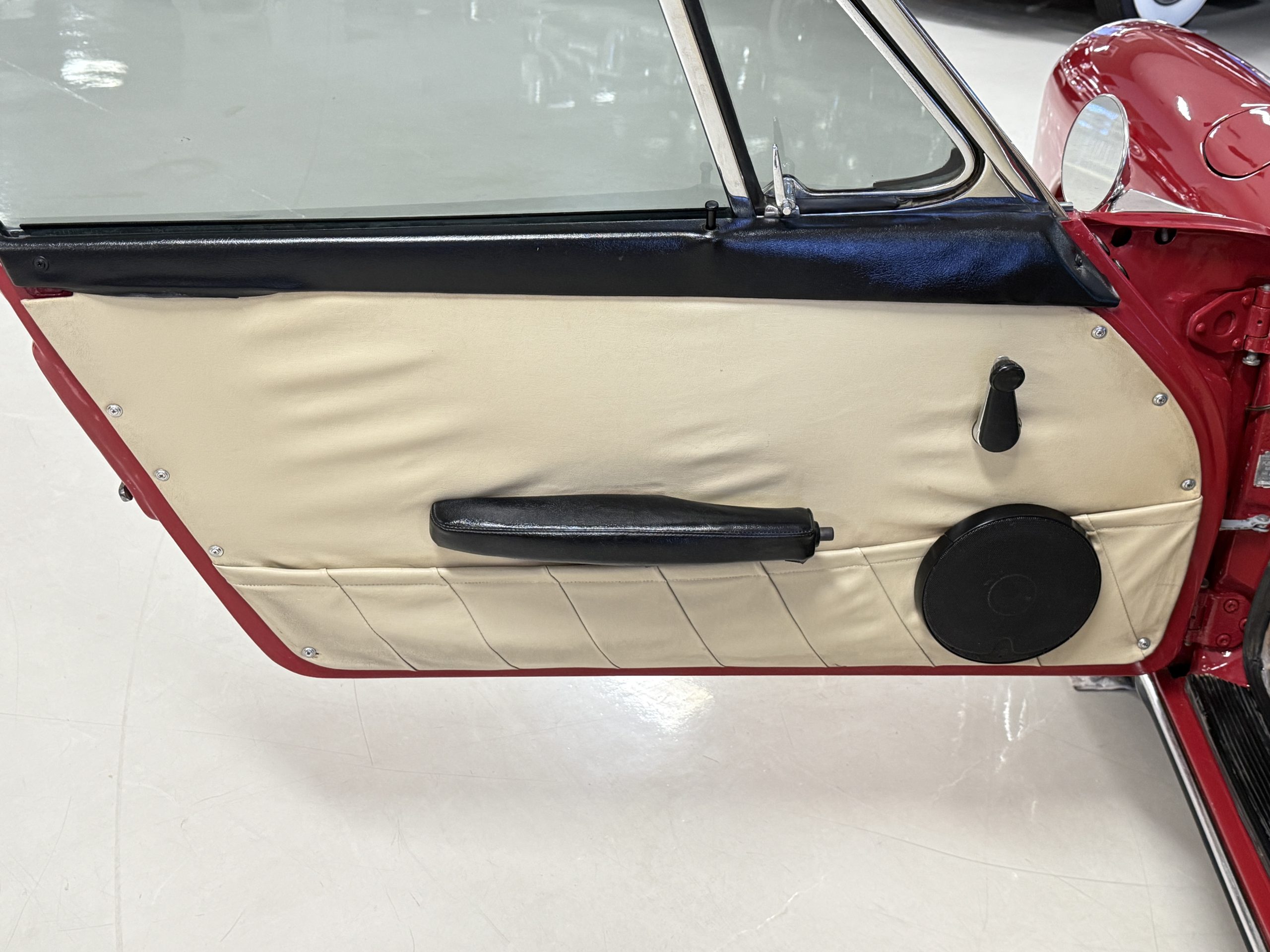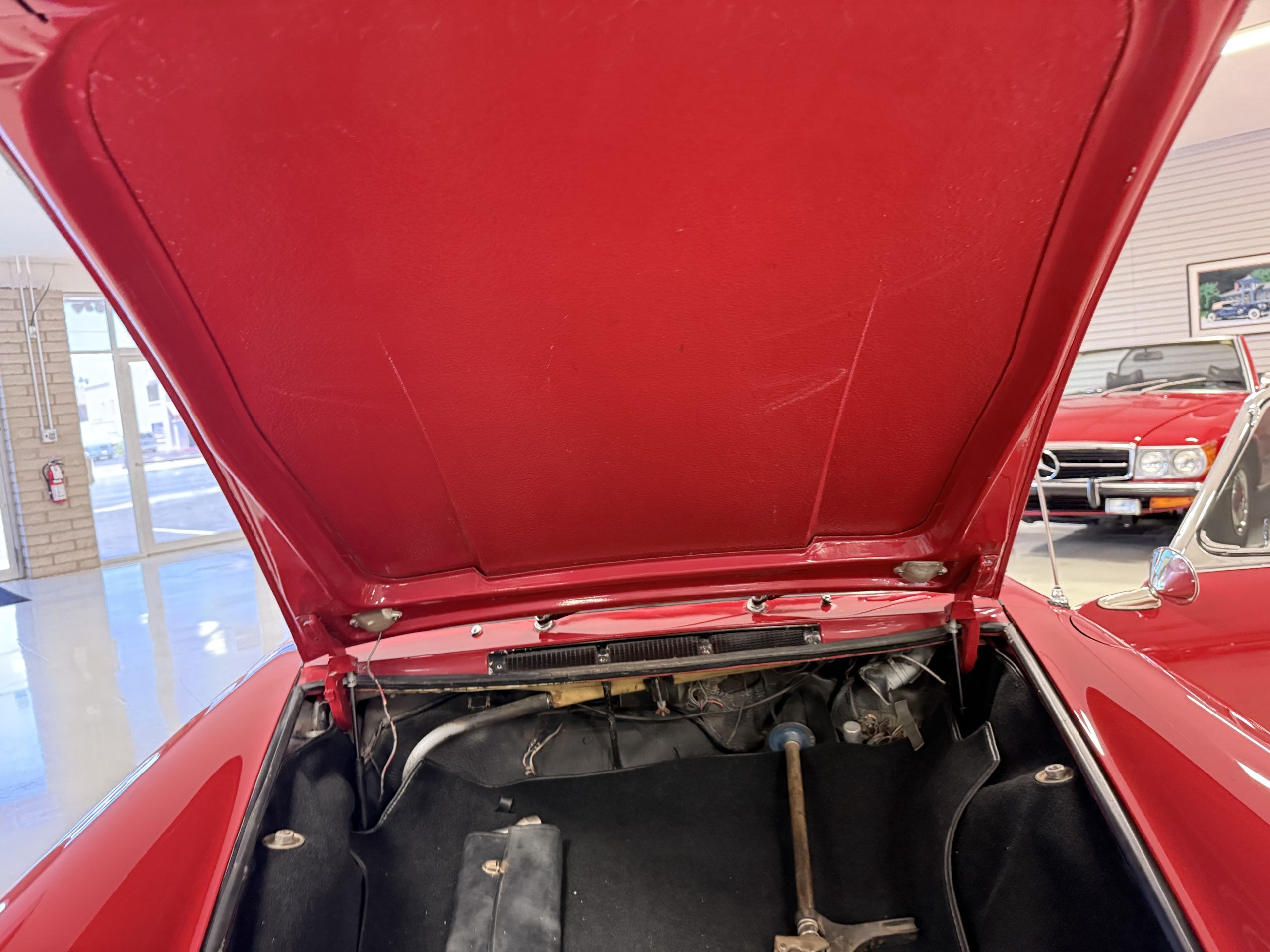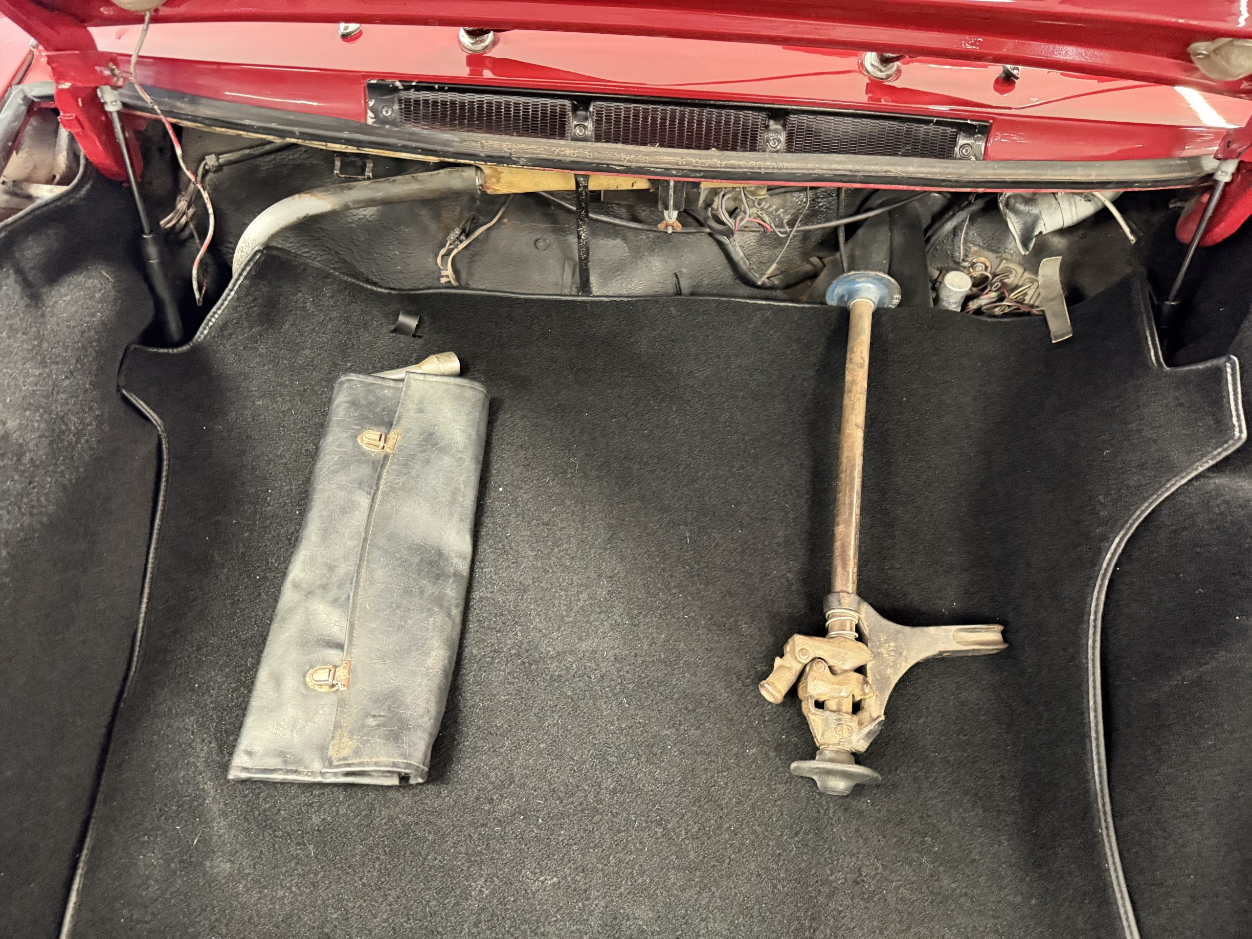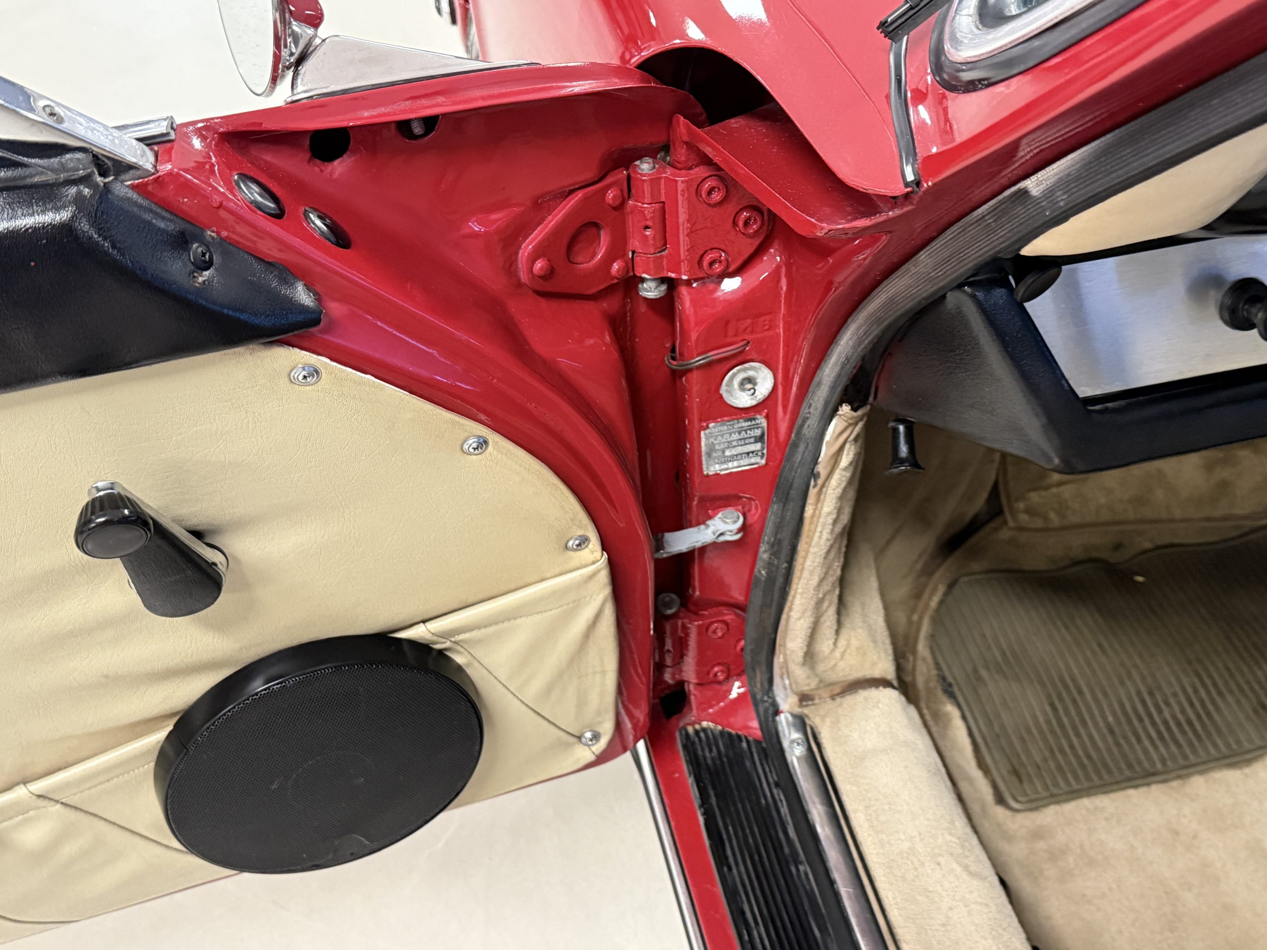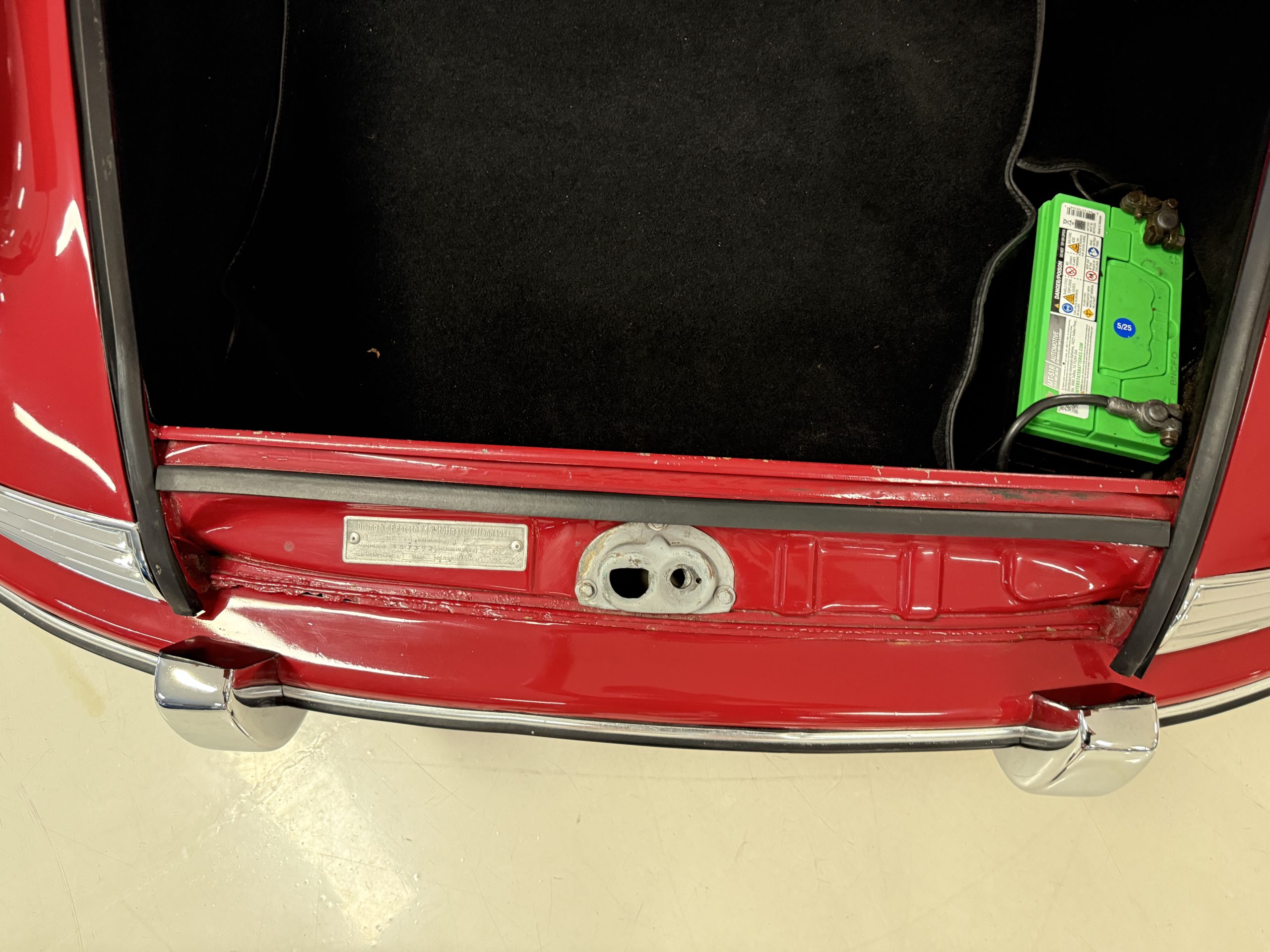 Originally this was Sand Beige and was repainted in red under prior ownership. Exterior features include bright bumpers with guards, bright windshield wipers, a retractable antenna, and a single exhaust outlet. There are spots of rust and various paint blemishes around the body, close-up photos of which are provided in the gallery.