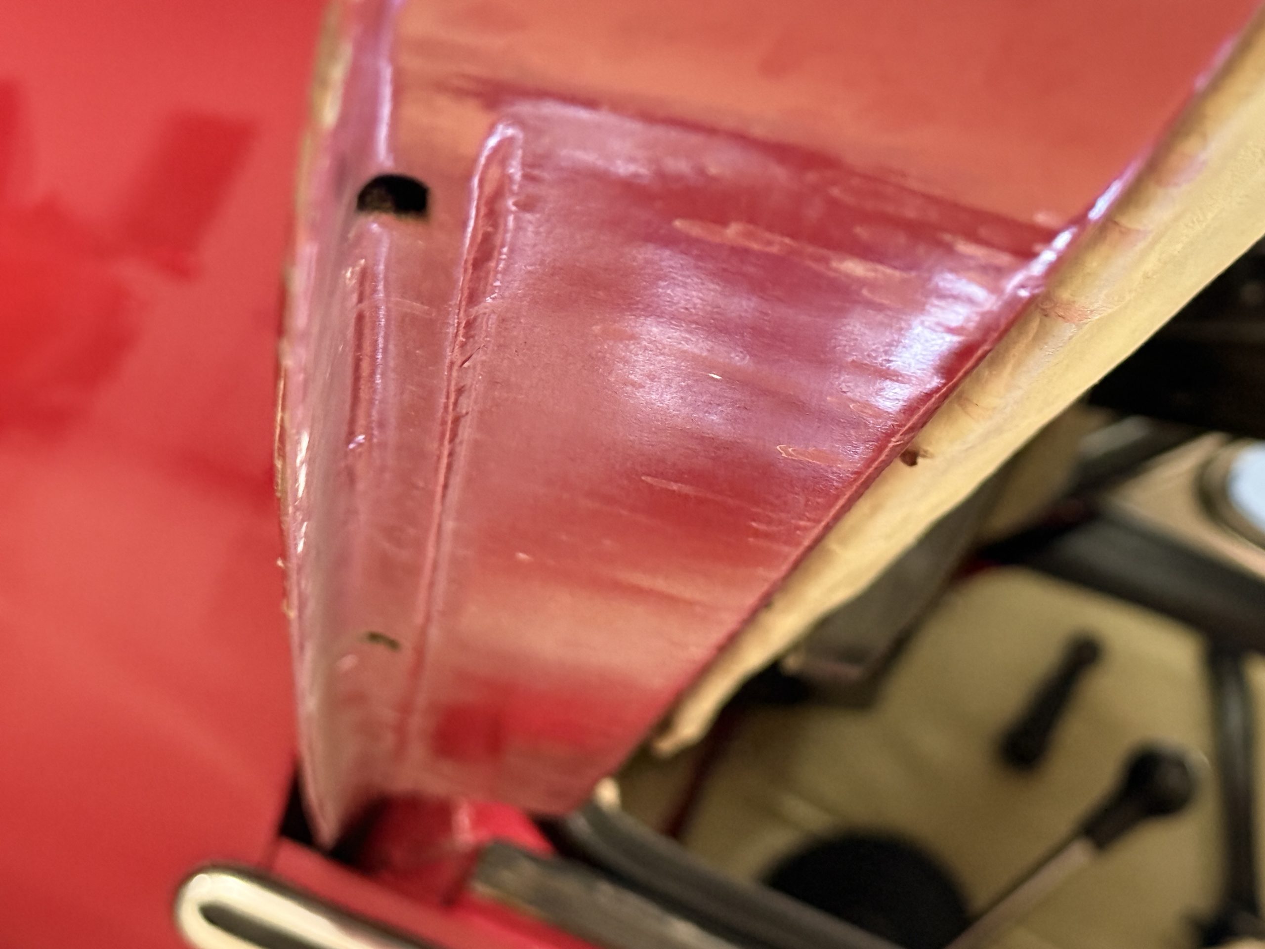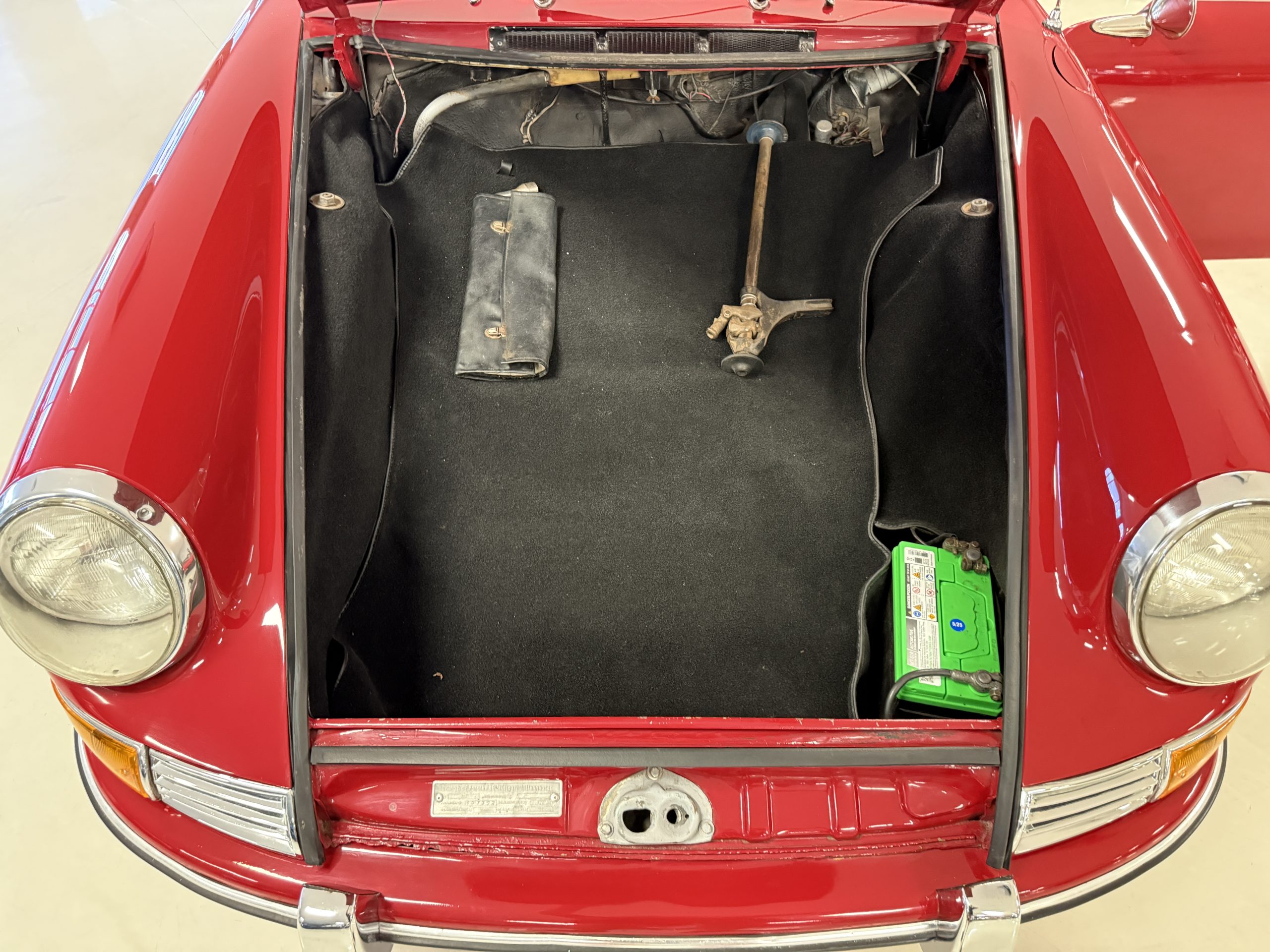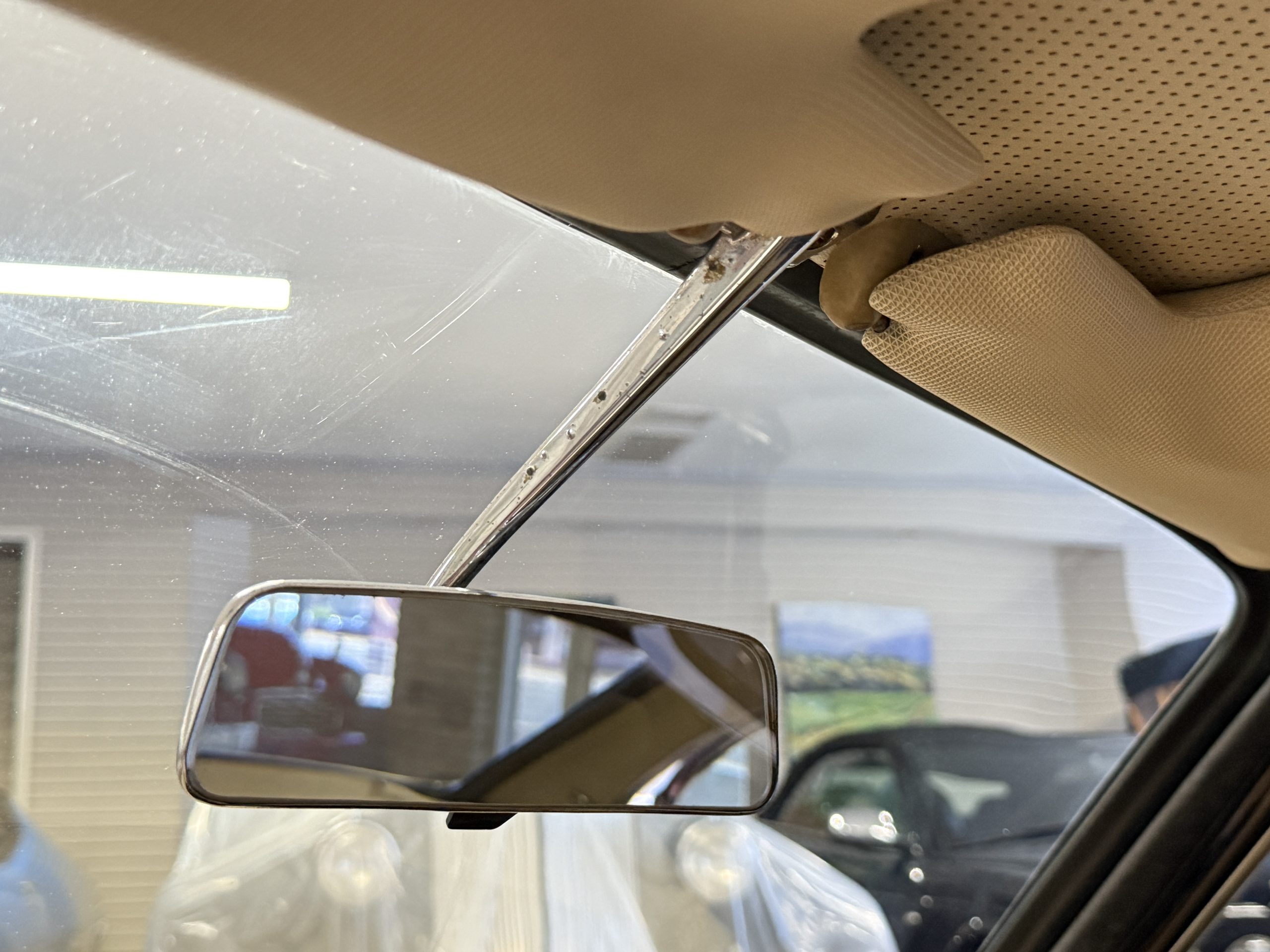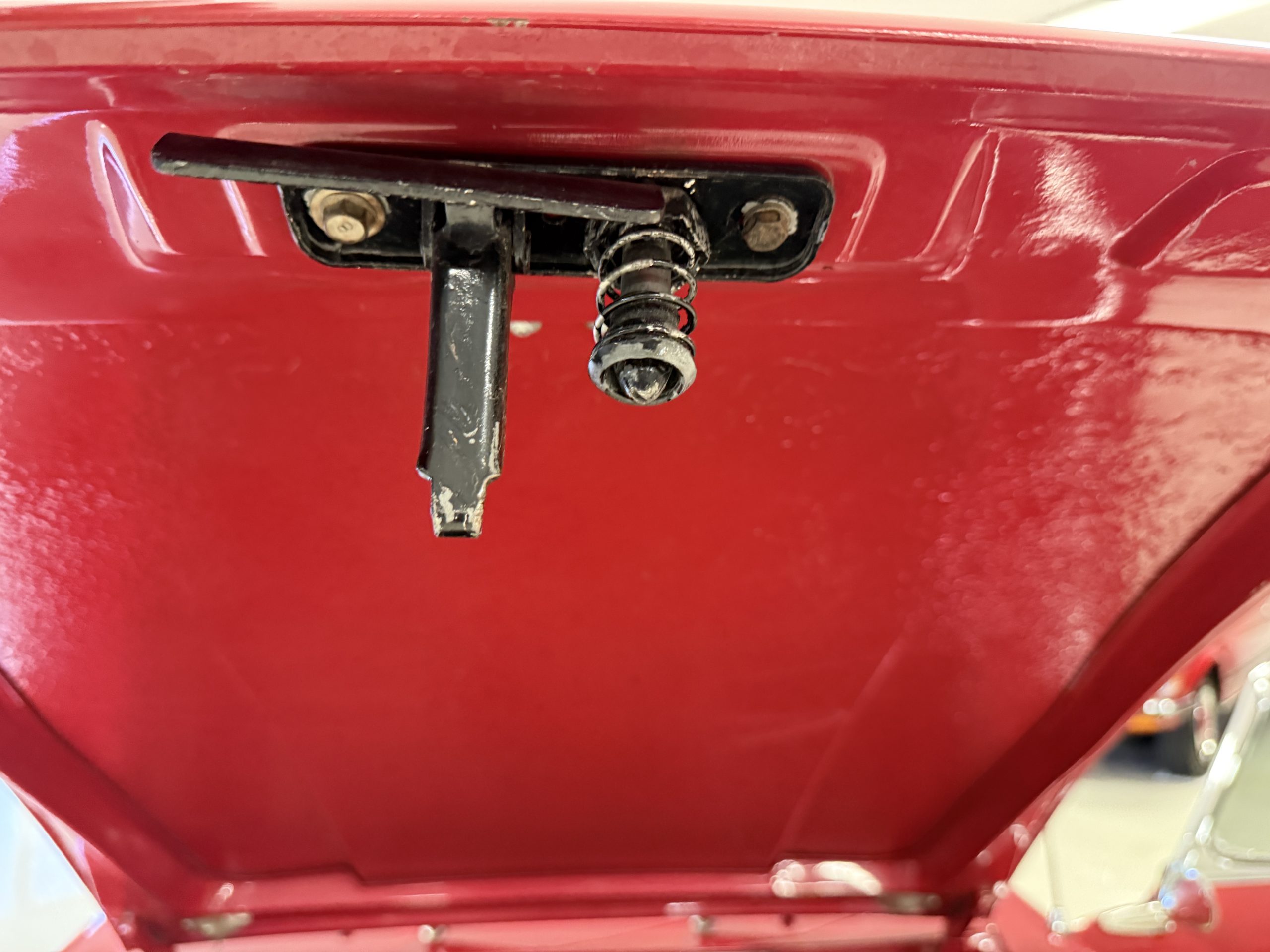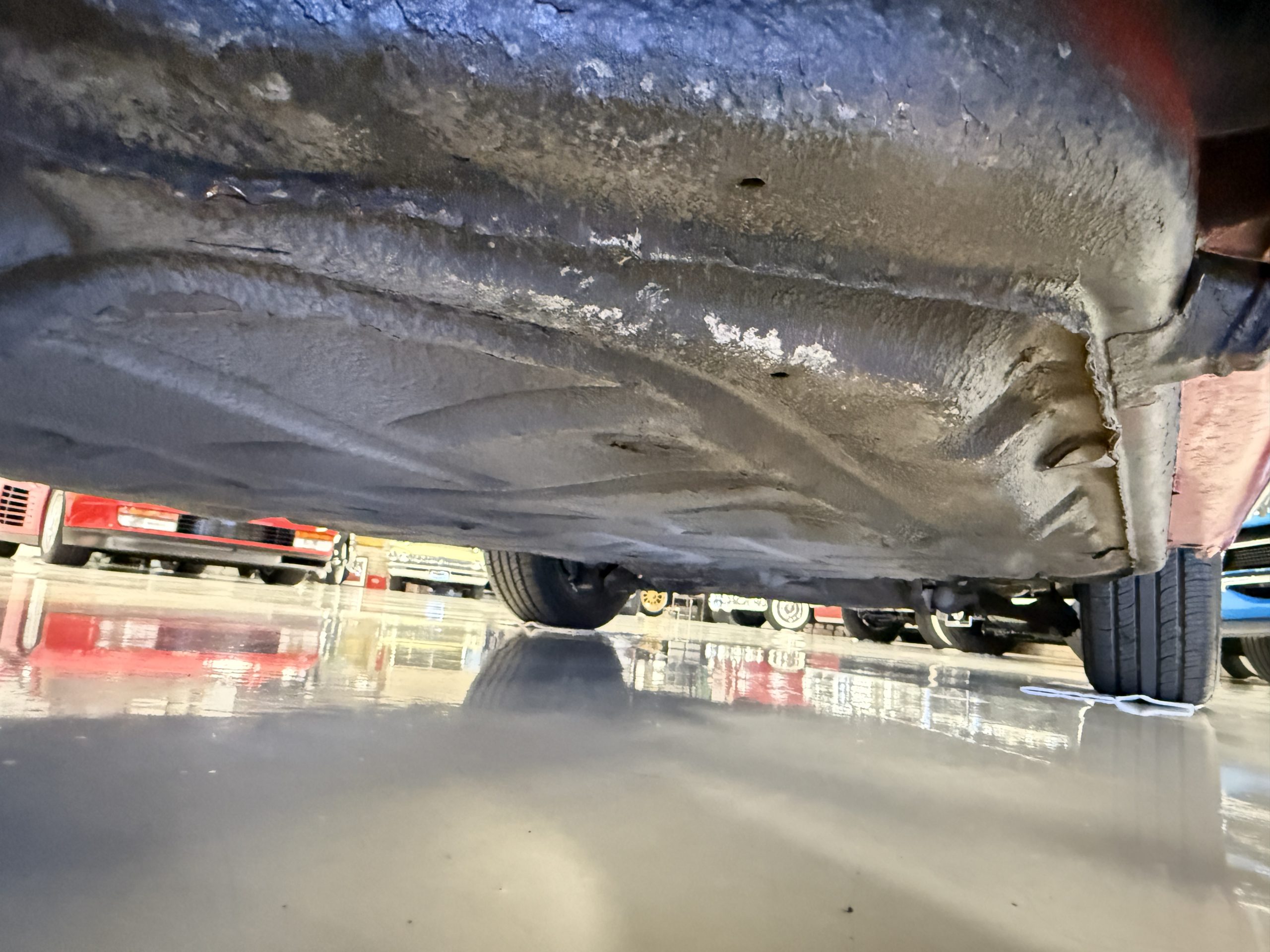 Originally this was Sand Beige and was repainted in red under prior ownership. Exterior features include bright bumpers with guards, bright windshield wipers, a retractable antenna, and a single exhaust outlet. There are spots of rust and various paint blemishes around the body, close-up photos of which are provided in the gallery.