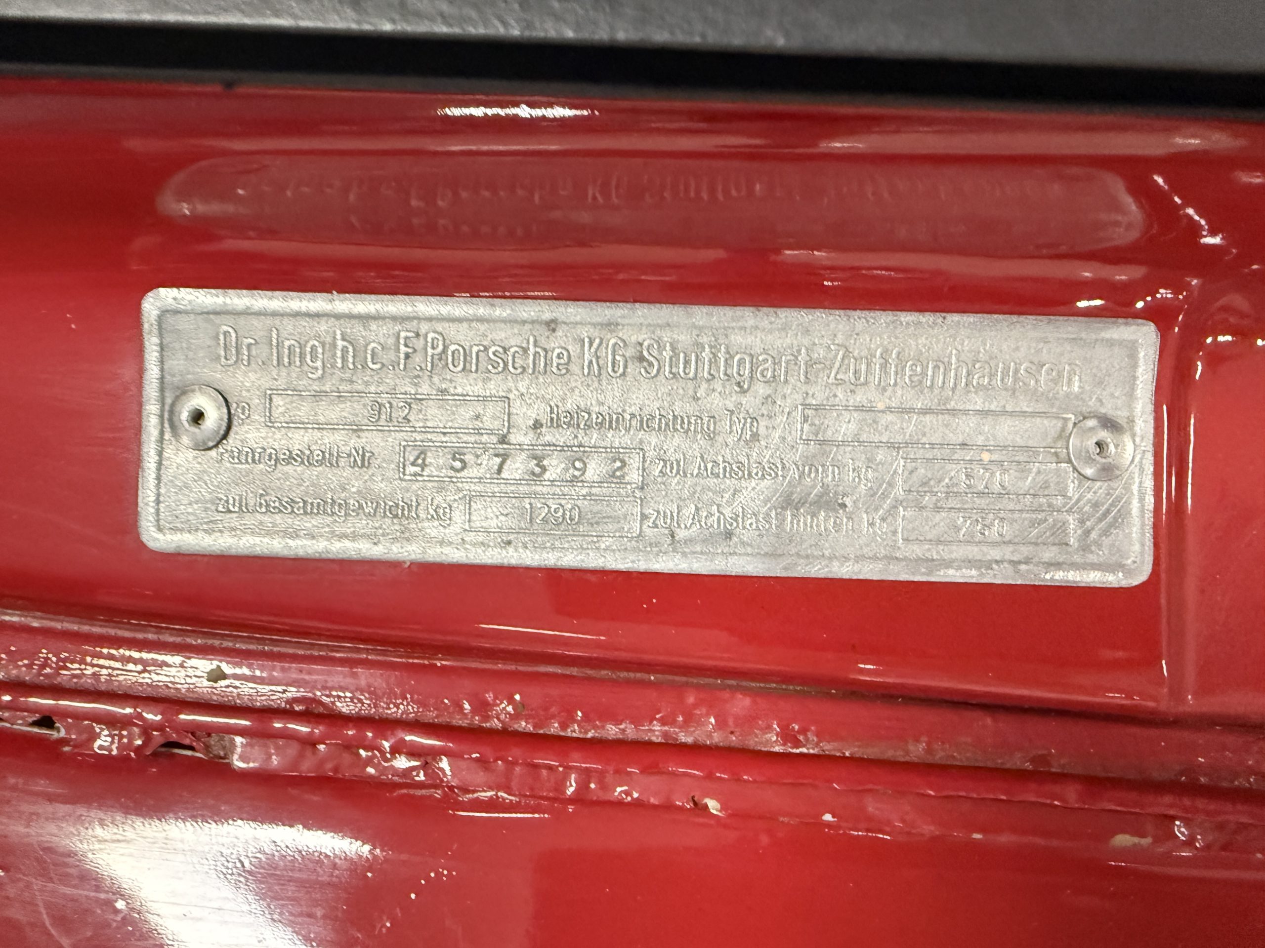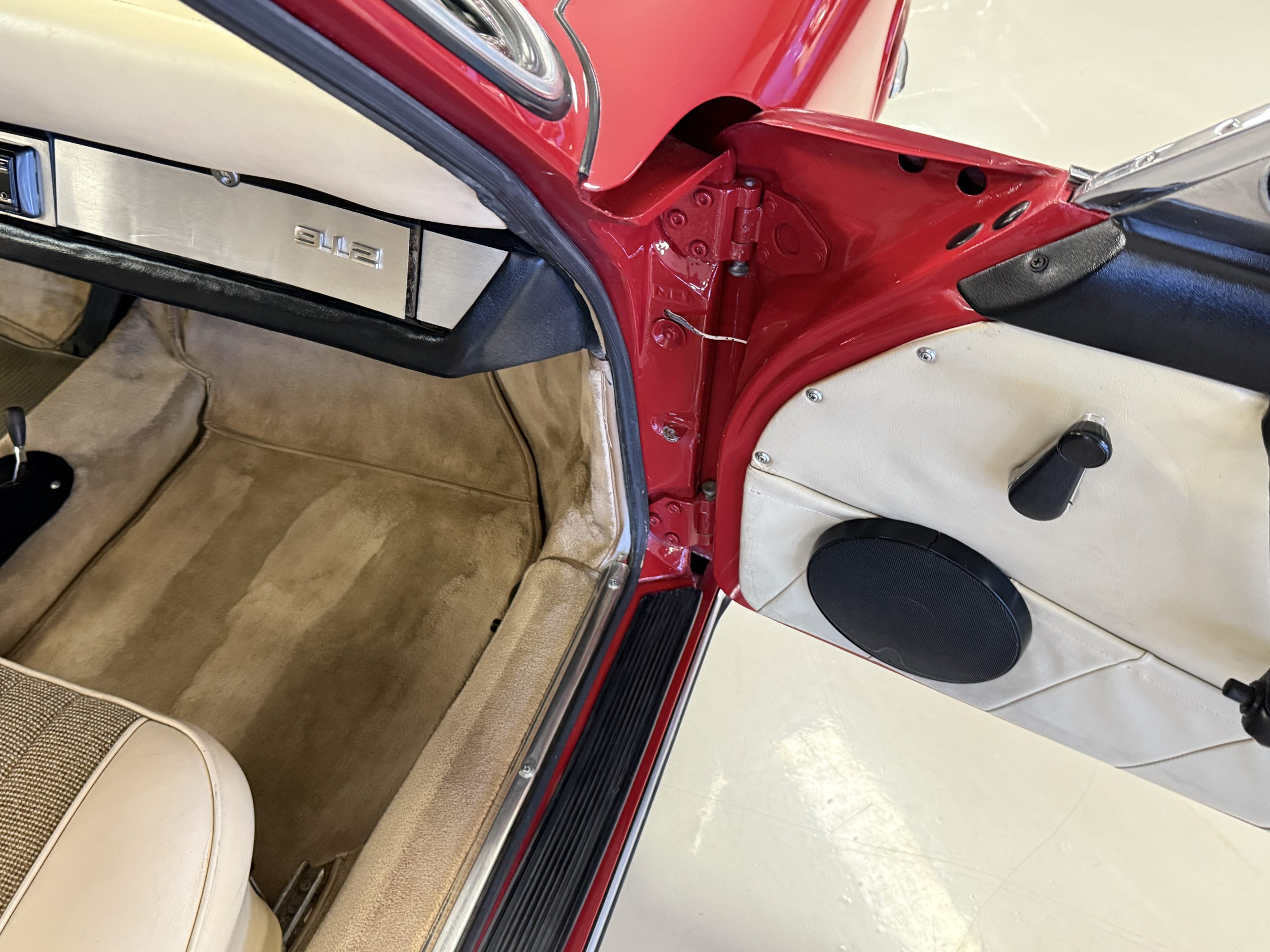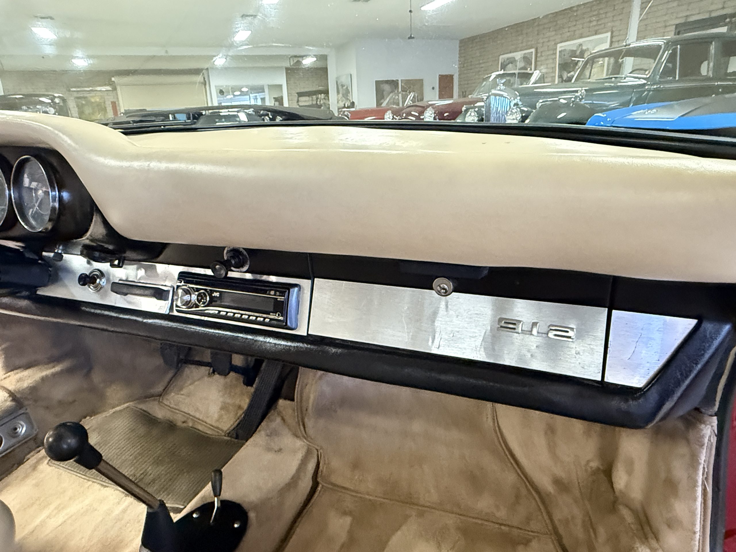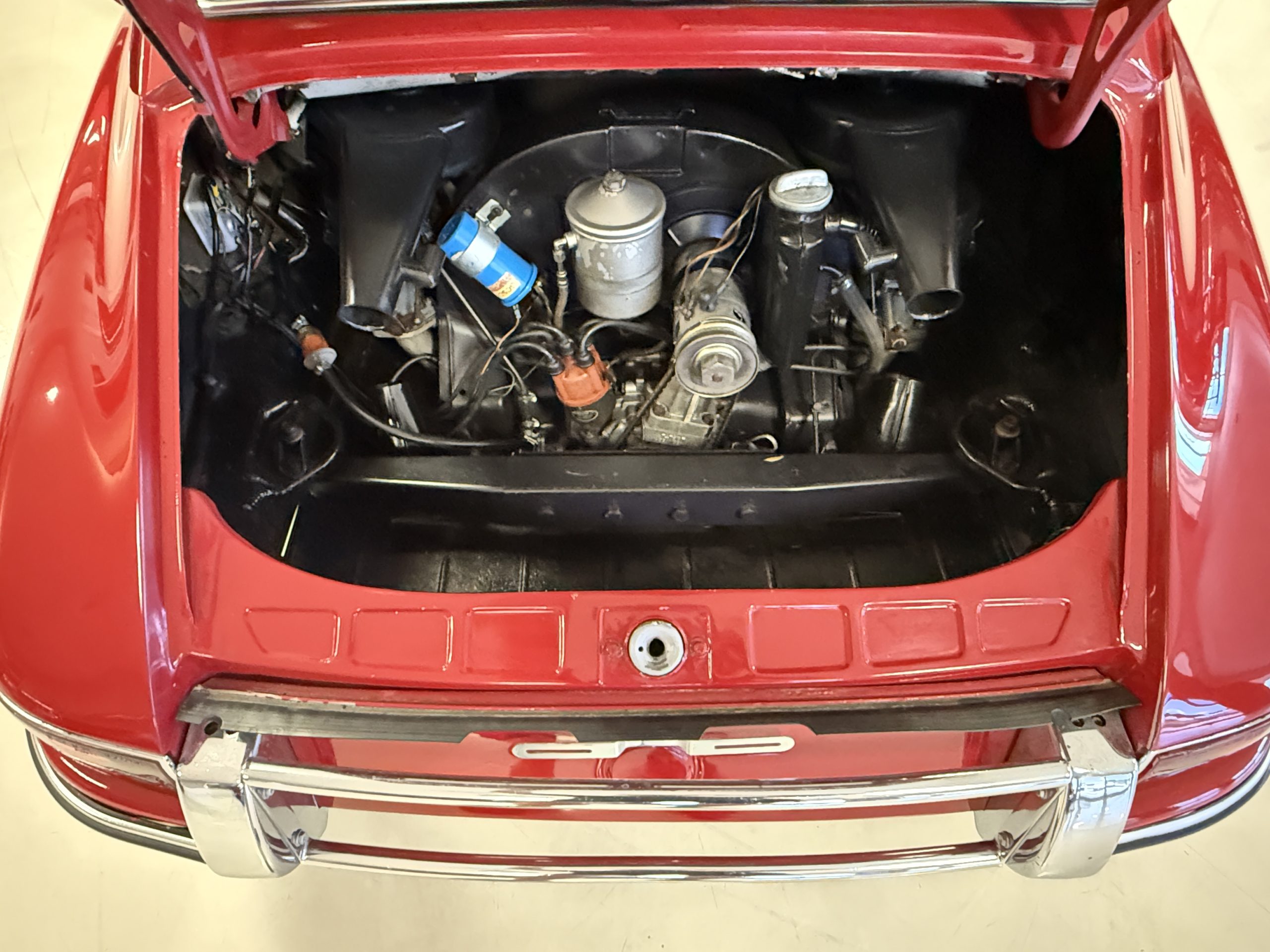 This 1966 Porsche 912 coupe was acquired by the current owner in 2013 and is powered by a 1.6-liter flat-four paired with a four-speed manual transaxle. The car is finished in red over beige leatherette and equipped with 15″ Fuchs forged alloy wheels, four-wheel disc brakes, bright bumper guards, bucket seats, lap and shoulder belts, and a heater. Work in 2023 included rebuilding the Solex carburetors and replacing the shift linkage components, while a new battery was installed and the carburetors were serviced in May 2025.