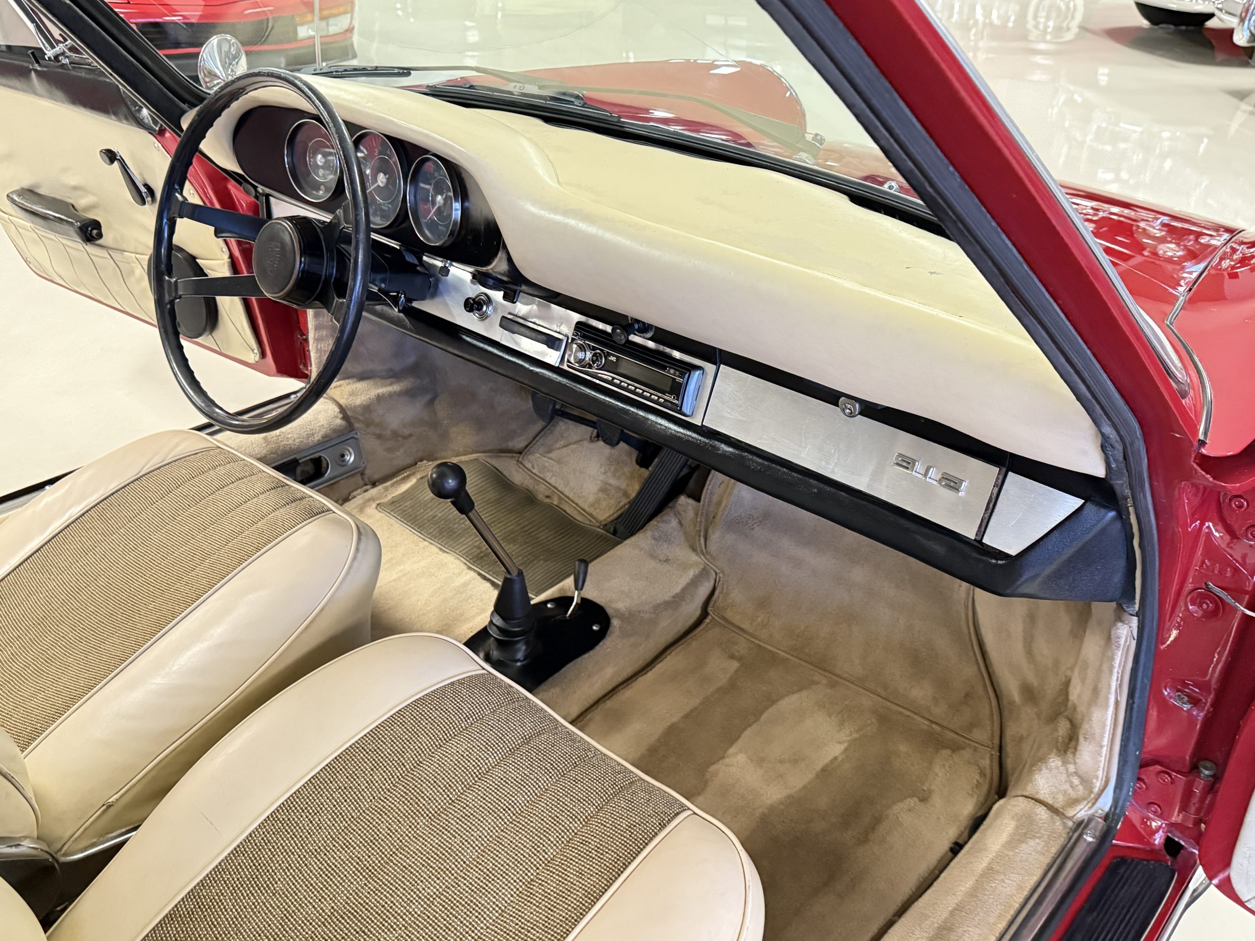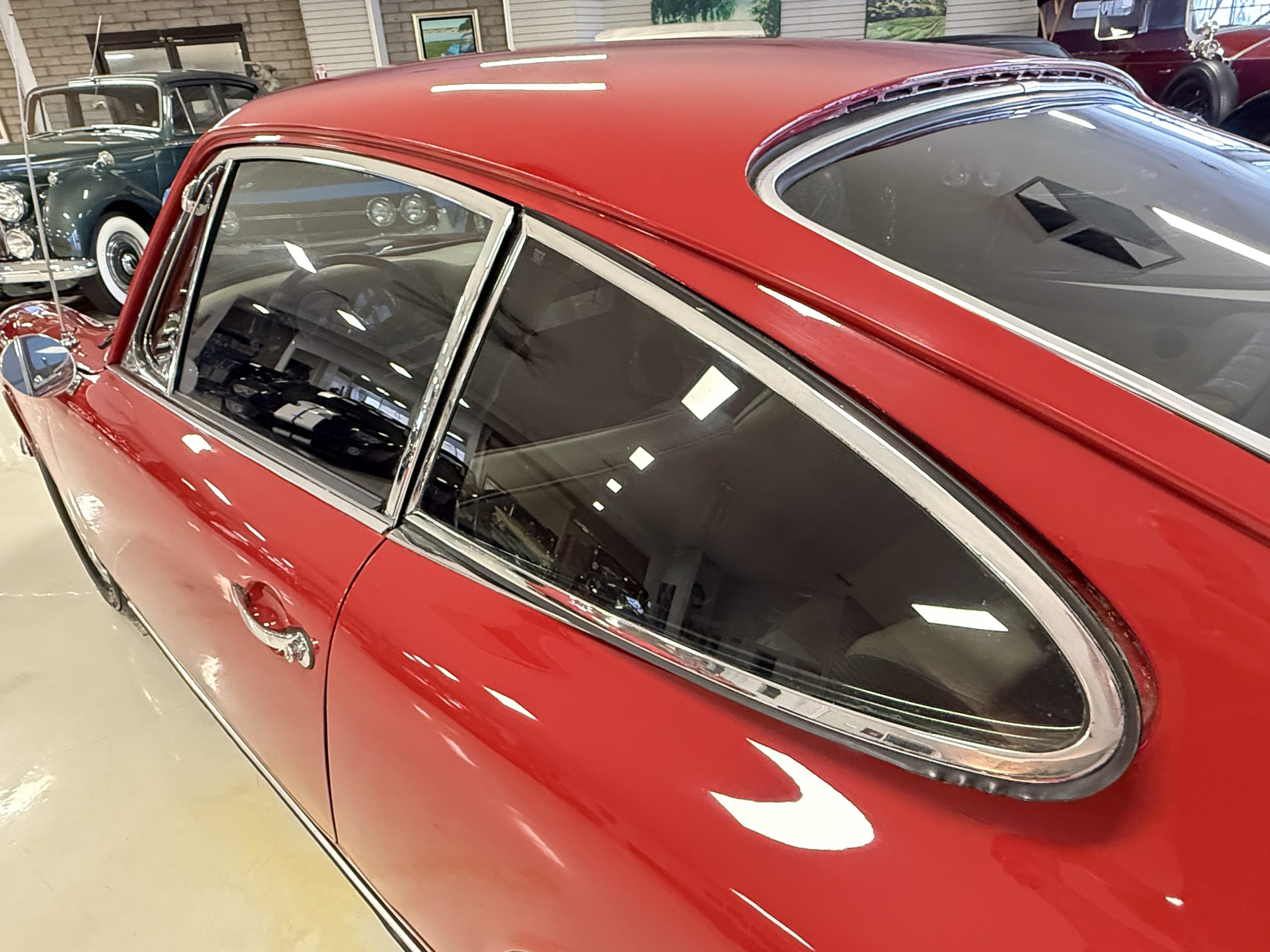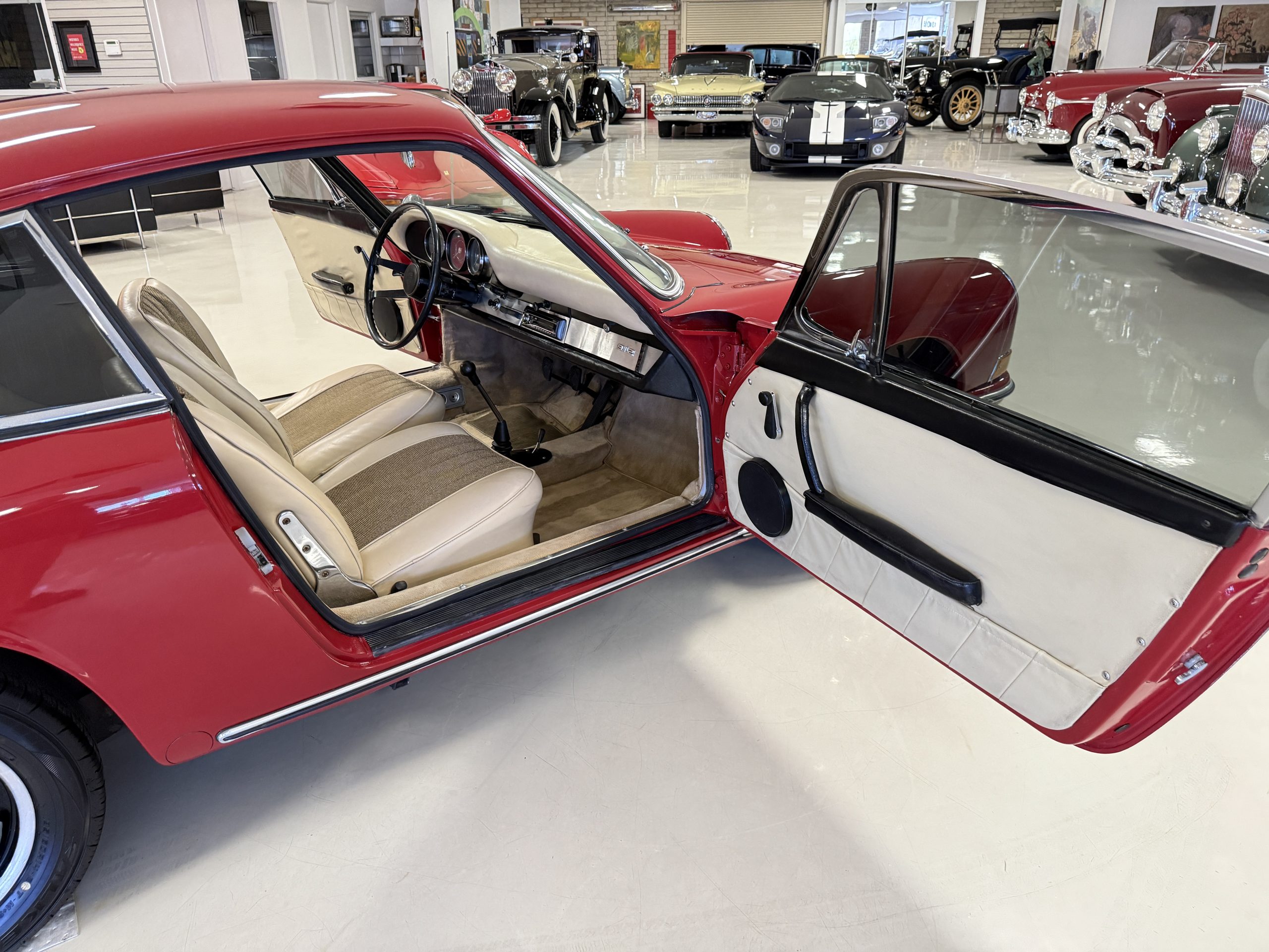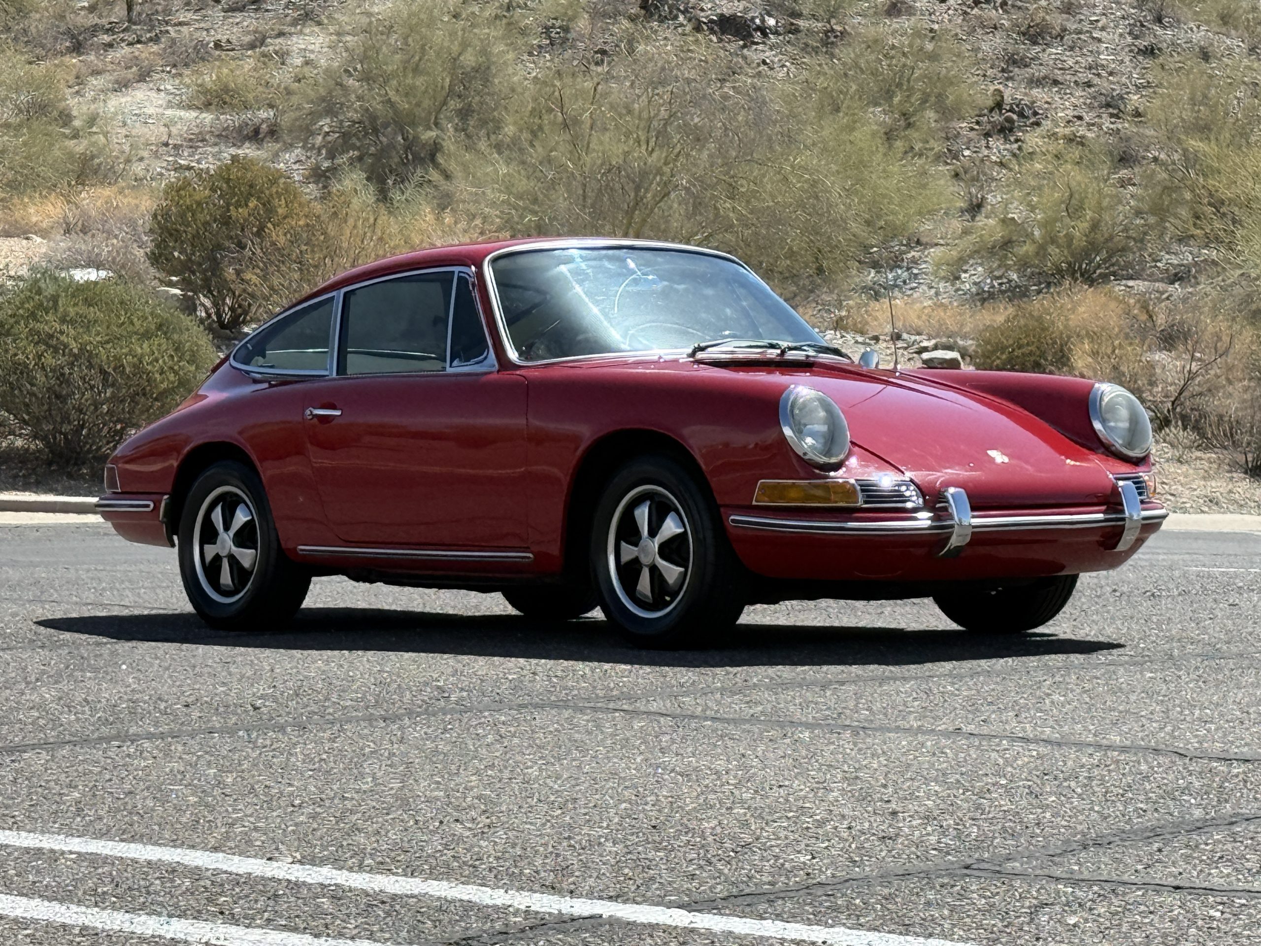This 1966 Porsche 912 coupe was acquired by the current owner in 2013 and is powered by a 1.6-liter flat-four paired with a four-speed manual transaxle. The car is finished in red over beige leatherette and equipped with 15″ Fuchs forged alloy wheels, four-wheel disc brakes, bright bumper guards, bucket seats, lap and shoulder belts, and a heater. Work in 2023 included rebuilding the Solex carburetors and replacing the shift linkage components, while a new battery was installed and the carburetors were serviced in May 2025.