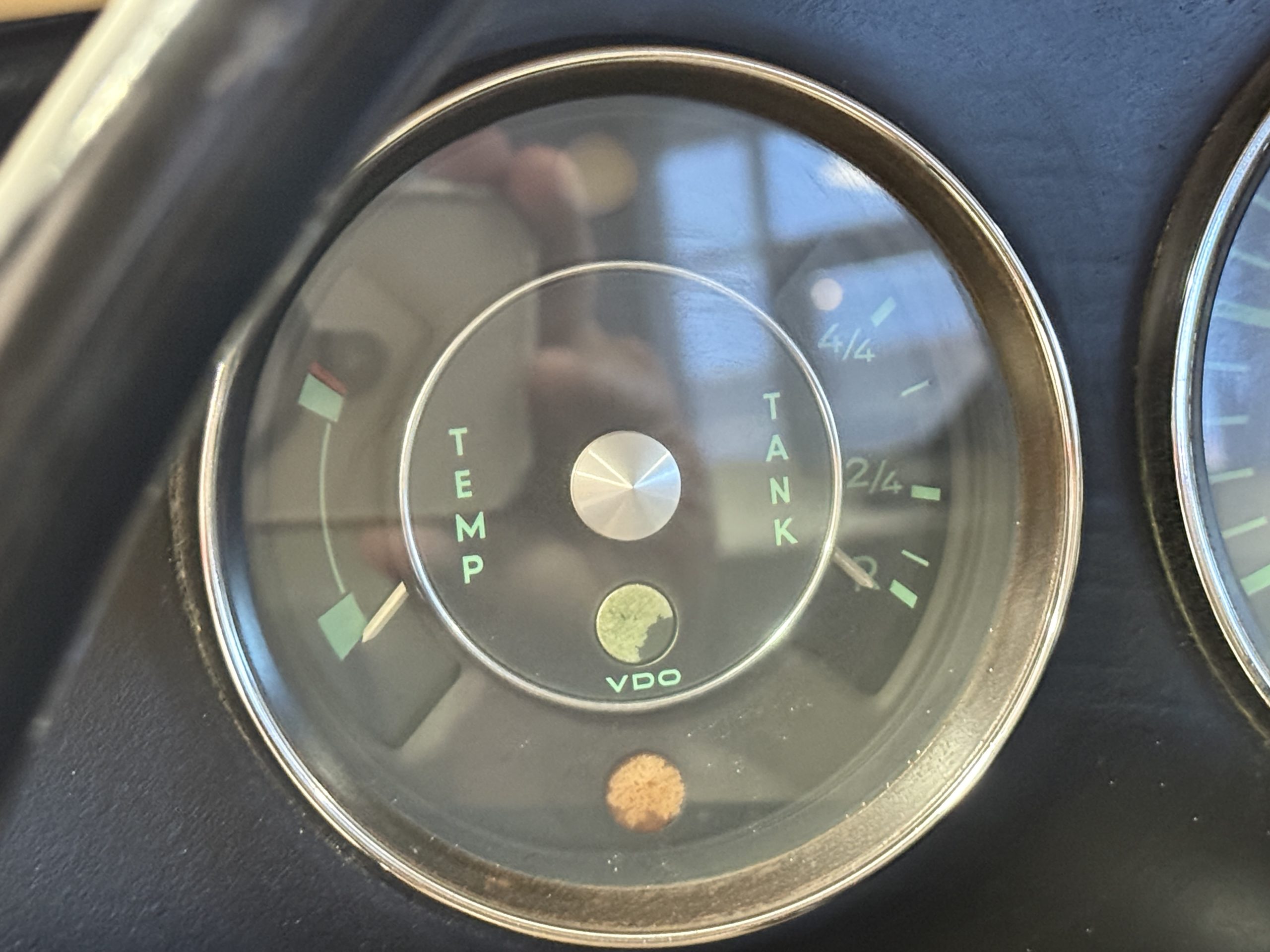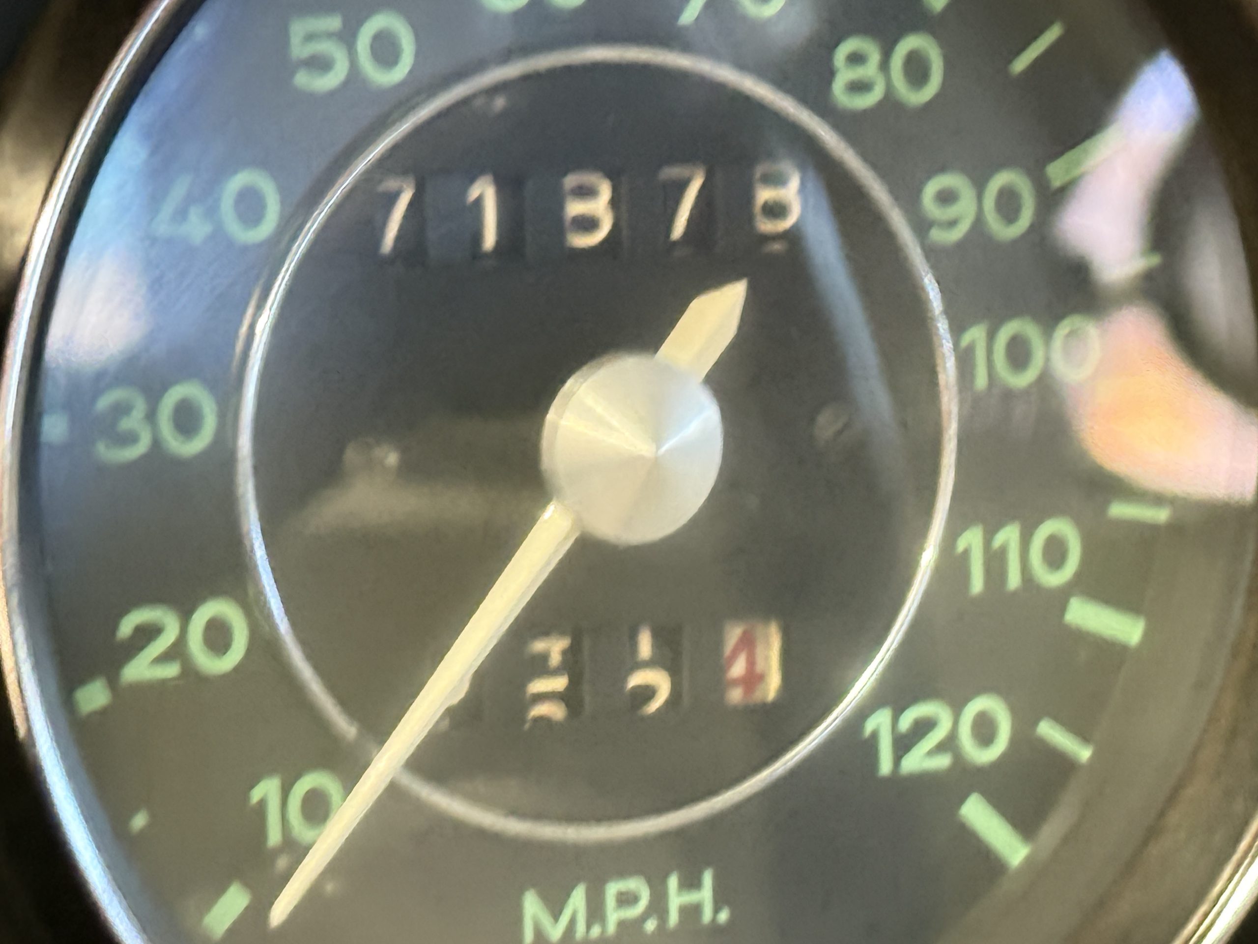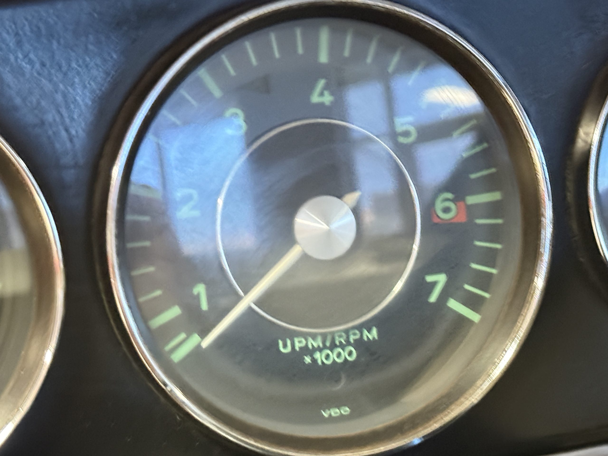 The four-spoke steering wheel sits ahead of green-script VDO instrumentation including a centrally mounted 7k-rpm tachometer, a 120-mph speedometer, and a combination gauge for fuel level and oil temperature. The five-digit odometer shows approximately 72k miles, about 4,500 of which were added under current ownership.