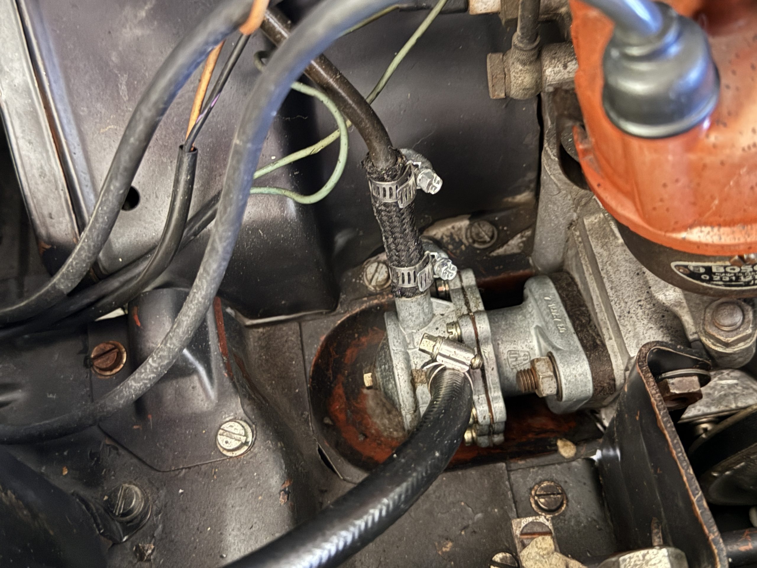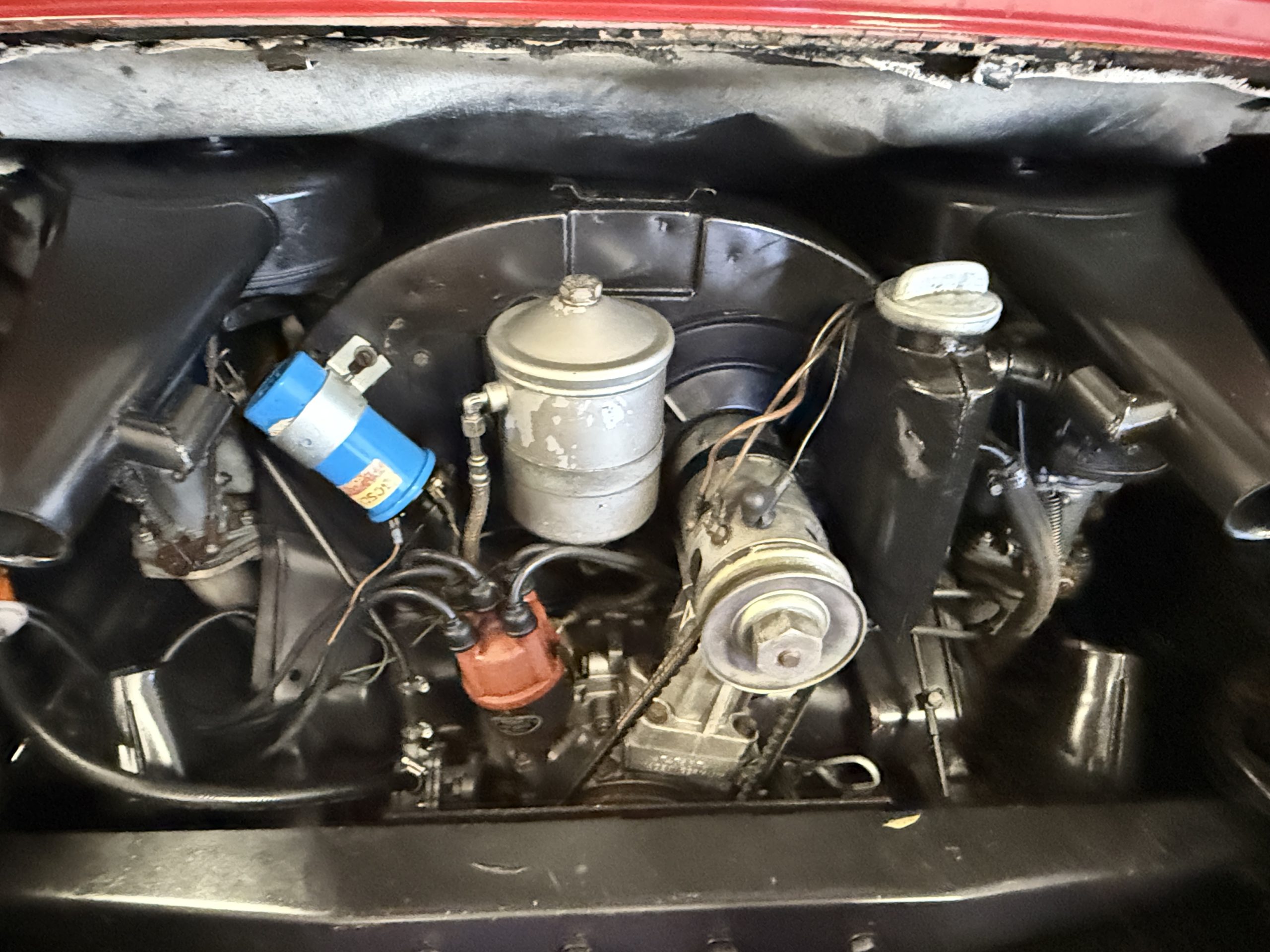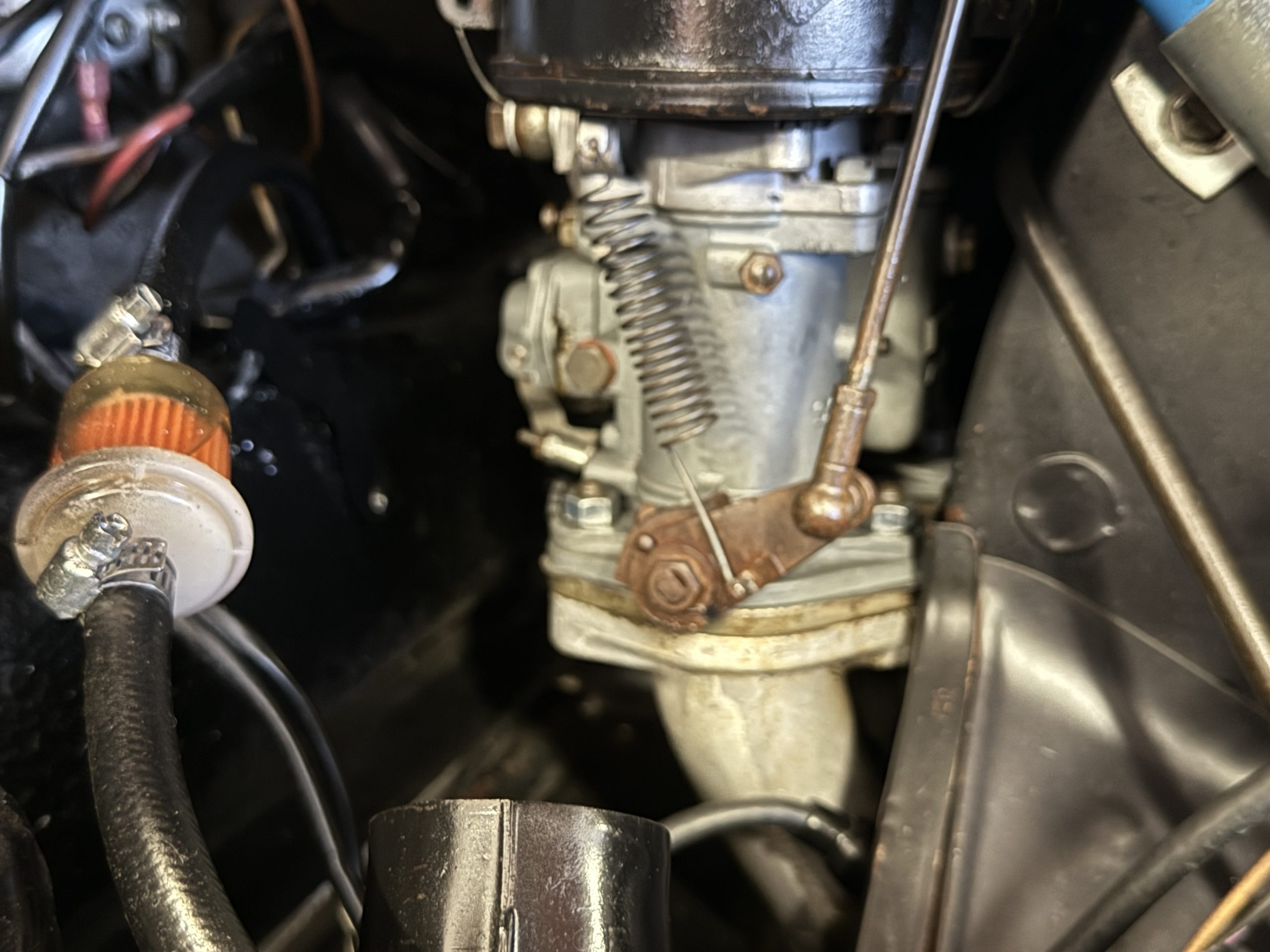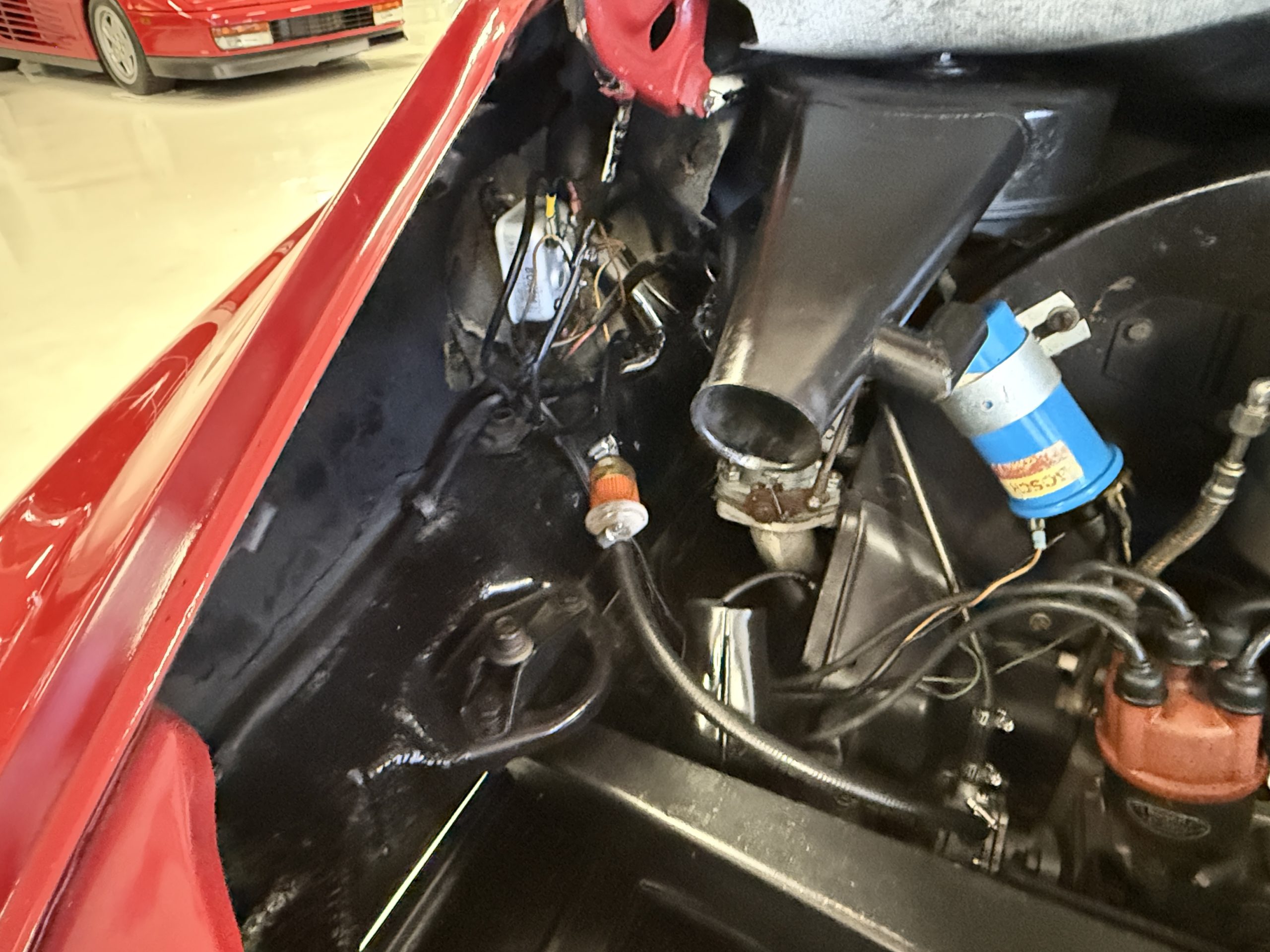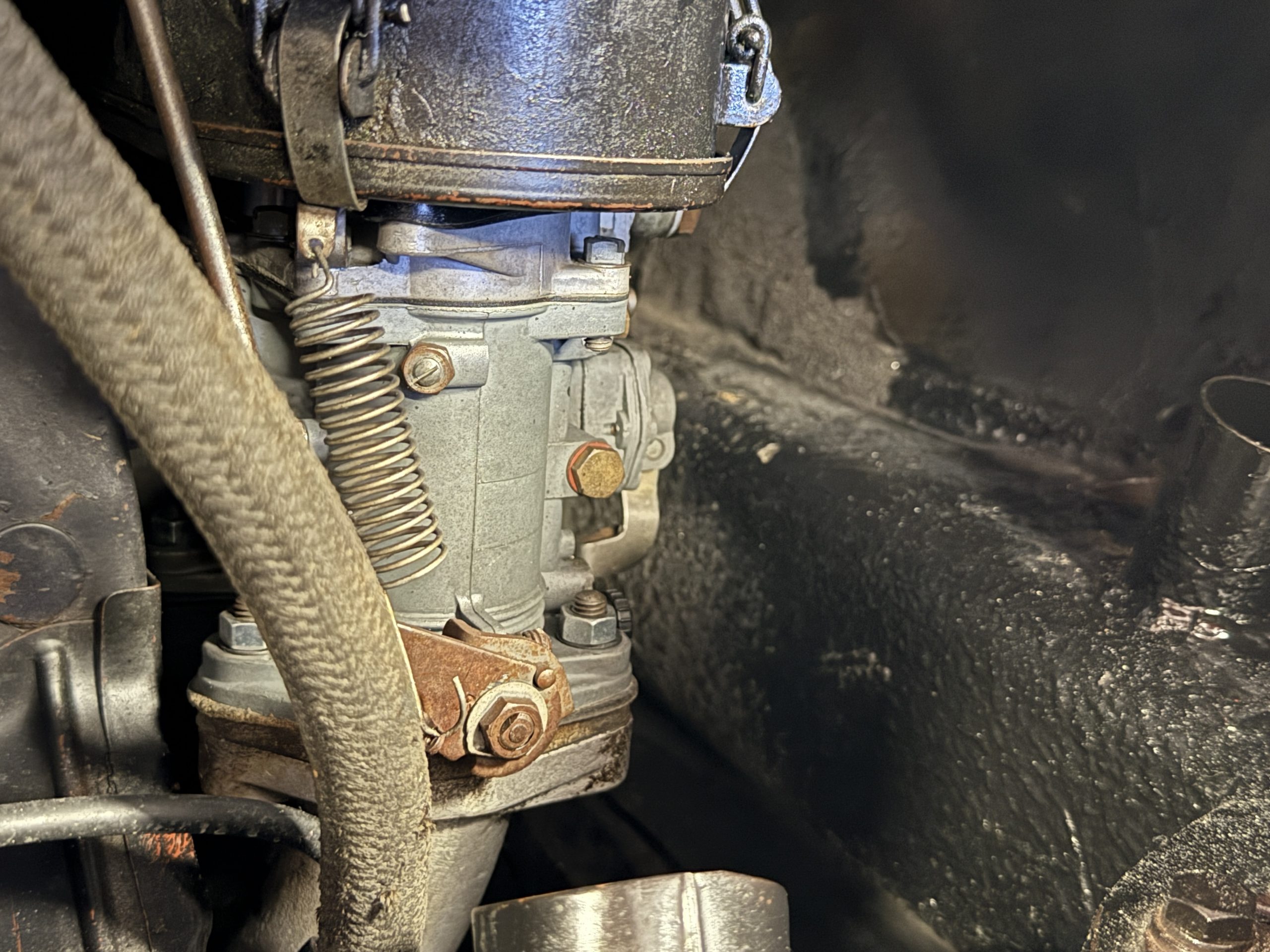 The 1.6-liter flat-four was factory rated at 90 horsepower and is equipped with dual Solex carburetors. In May 2023, the carburetors were rebuilt, the fuel lines were replaced, the valves were adjusted, and an oil change was performed. Service in May 2025 included replacing the battery, cleaning the idle jets, and setting the carburetors. Power is sent to the rear wheels through a four-speed manual transaxle. The shift coupler and bushings were replaced in May 2023.