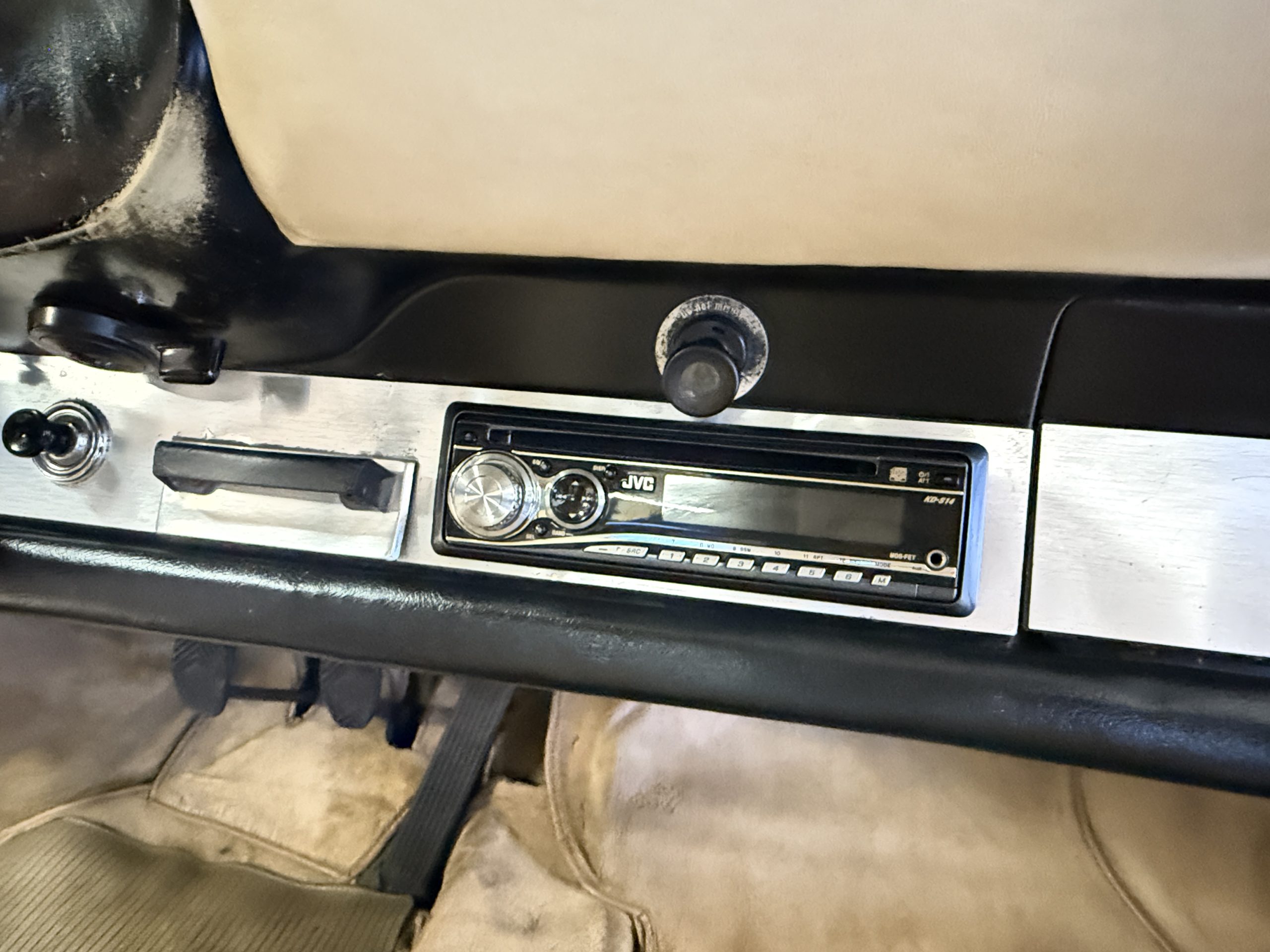 The 2+2 cabin features front bucket seats and rear jump seats trimmed in beige leatherette, complemented by color-coordinated door panels and carpets. A JVC CD player and aftermarket speakers are installed. The seller notes the interior shows general wear.