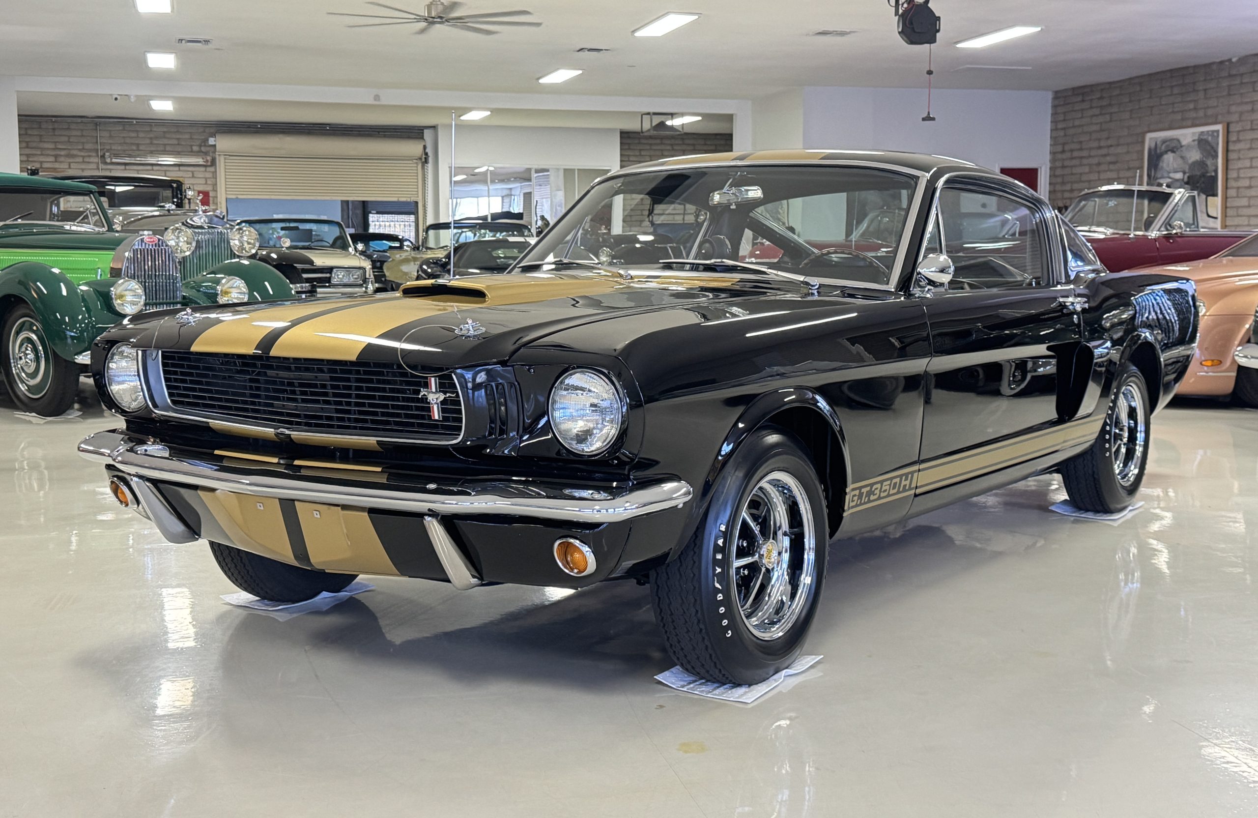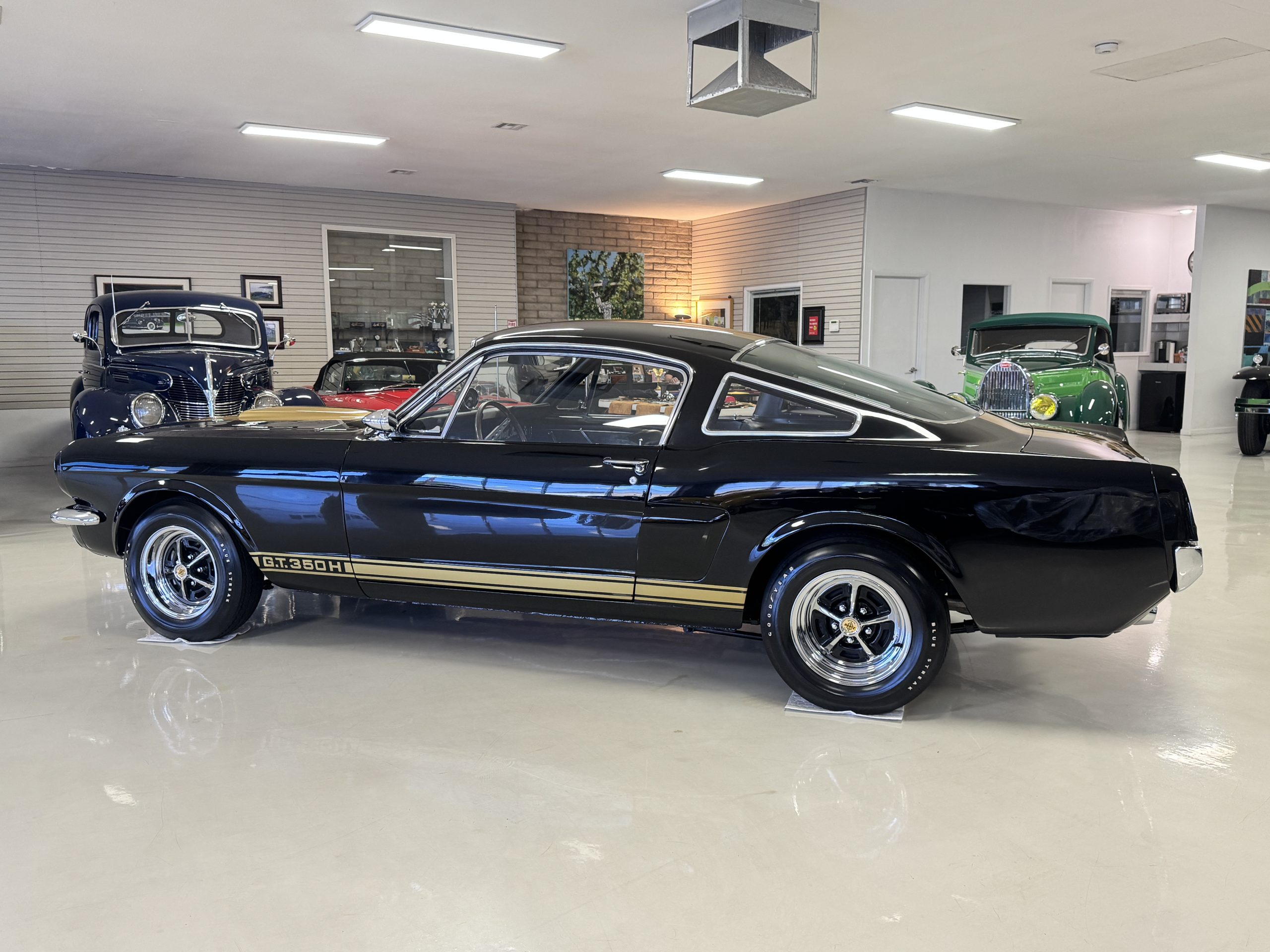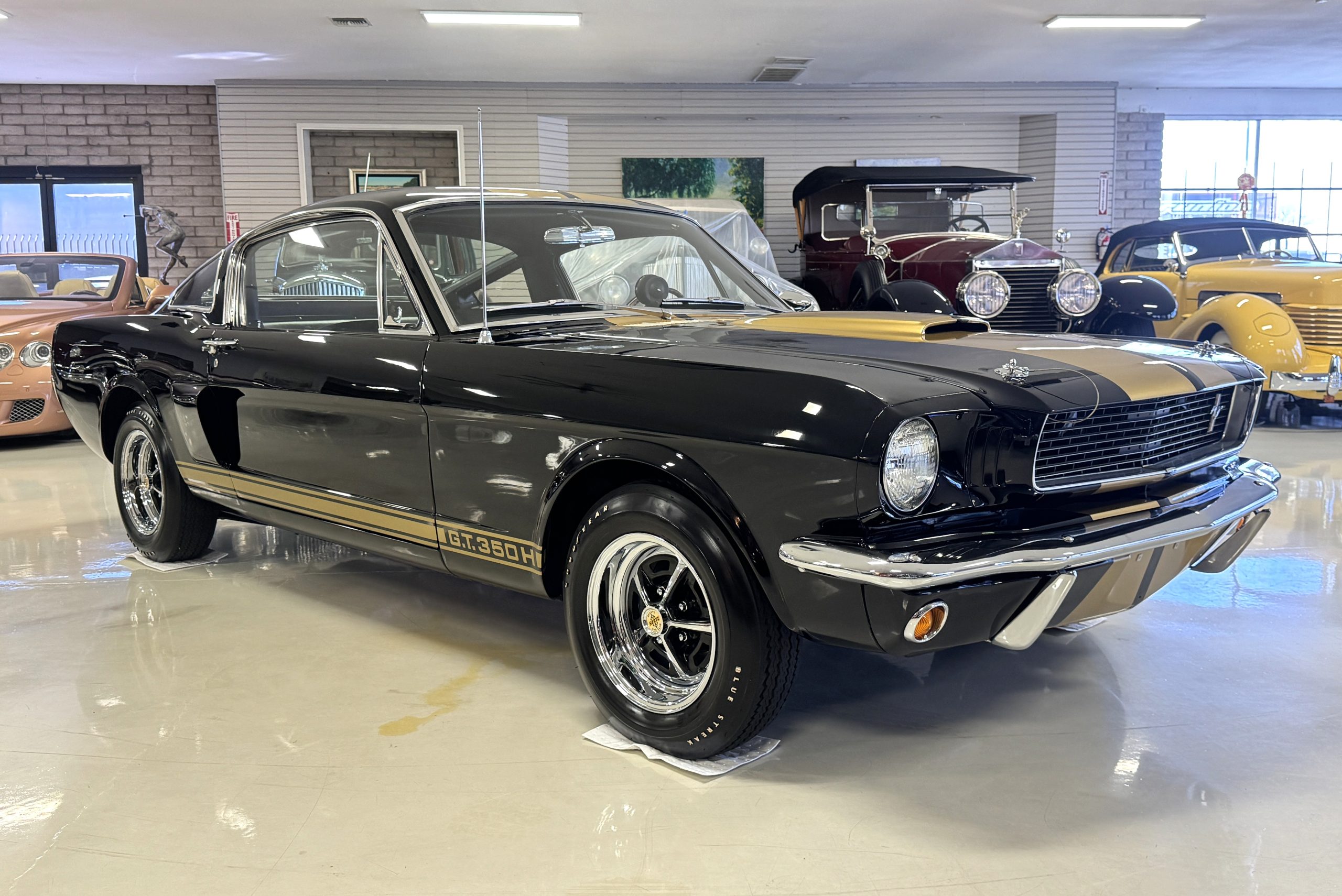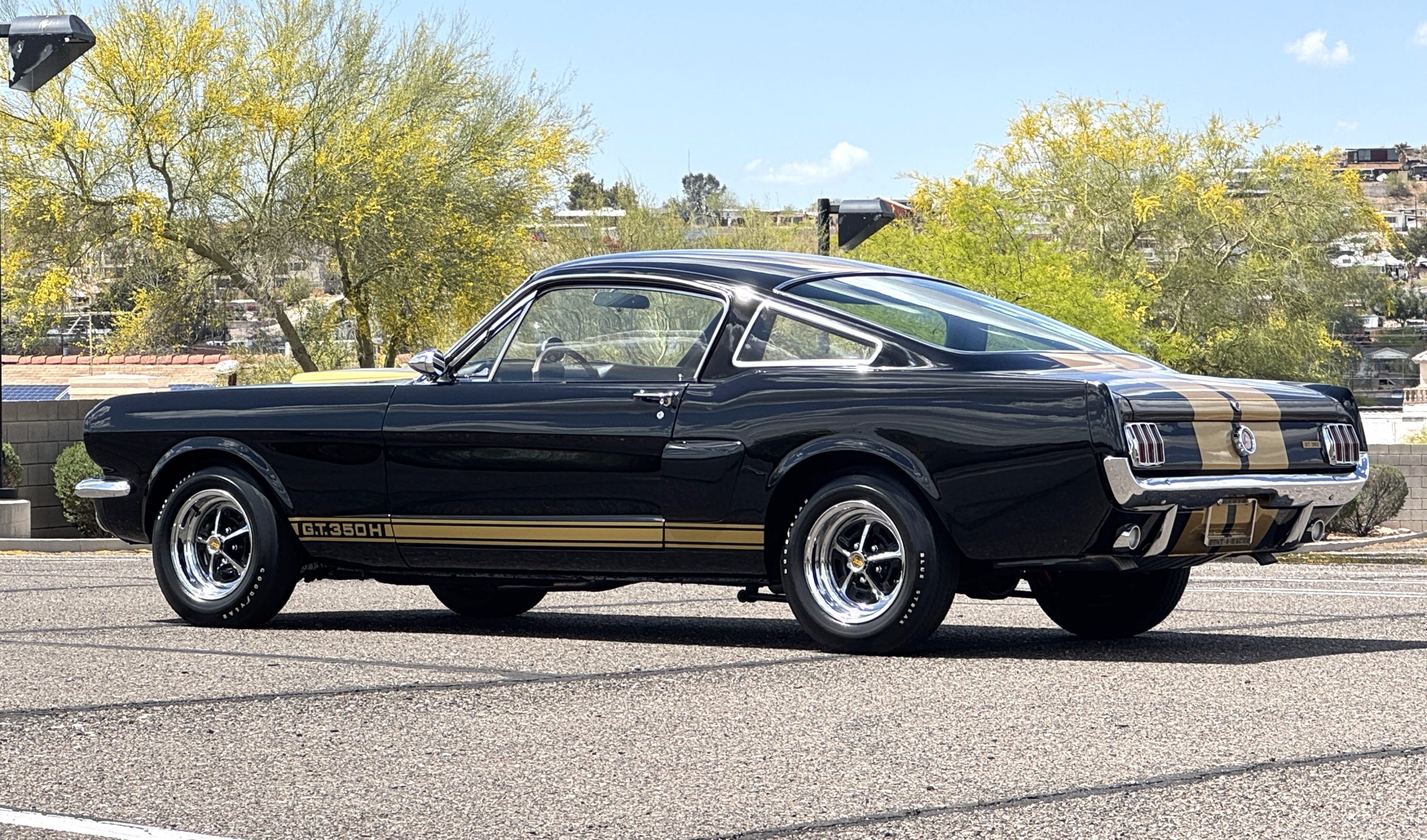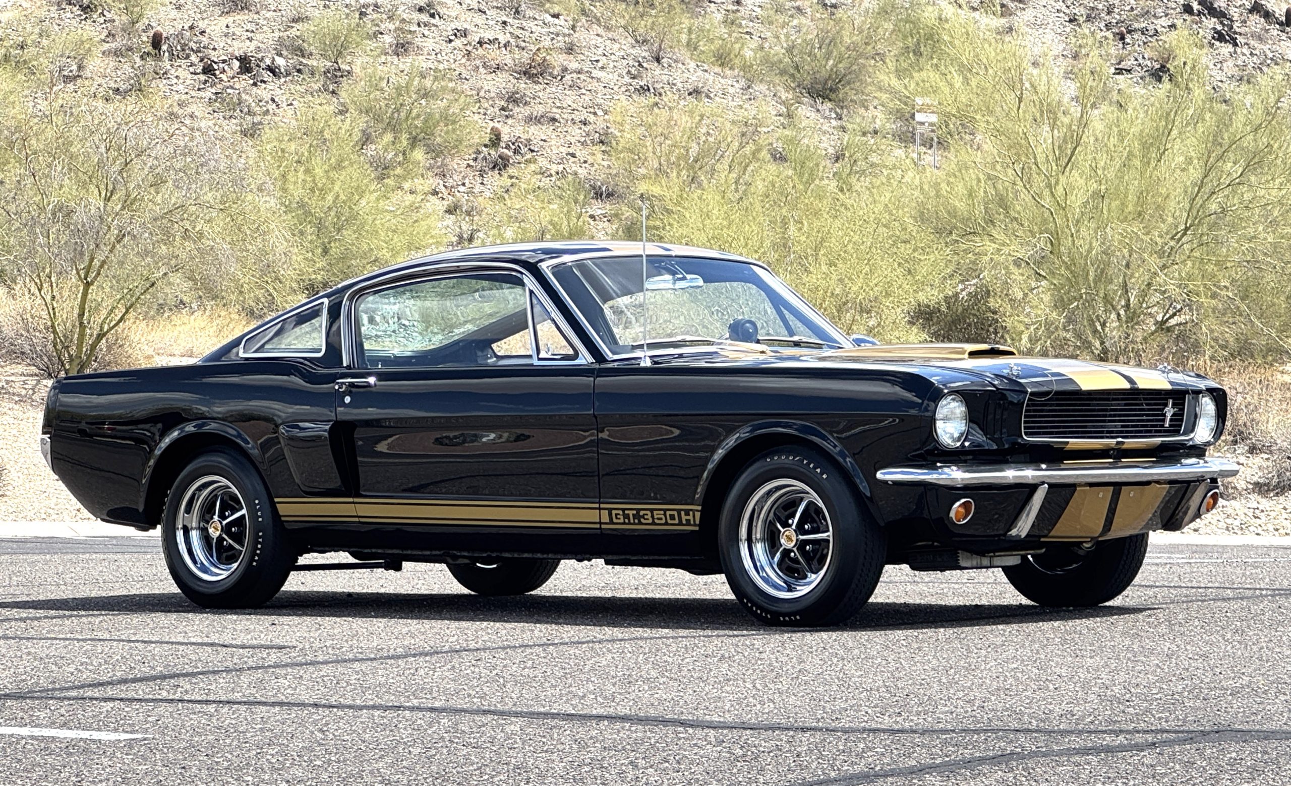 This 1966 Shelby Mustang GT350H was shipped new by Shelby American Inc. from their Los Angeles, California, facility in April 1966. The 289ci HiPo V8 was fitted with a Paxton supercharger and the car was refurbished under previous ownership before being acquired by the current owner in 2021. Finished in black with gold graphics, the car rides on 14″ Magnum 500 wheels and is equipped with power-assisted front disc brakes as well as a three-speed automatic transmission. Inside, black vinyl–trimmed seats are accompanied by latch-and-link front belts along with a simulated wood-rimmed steering wheel.
