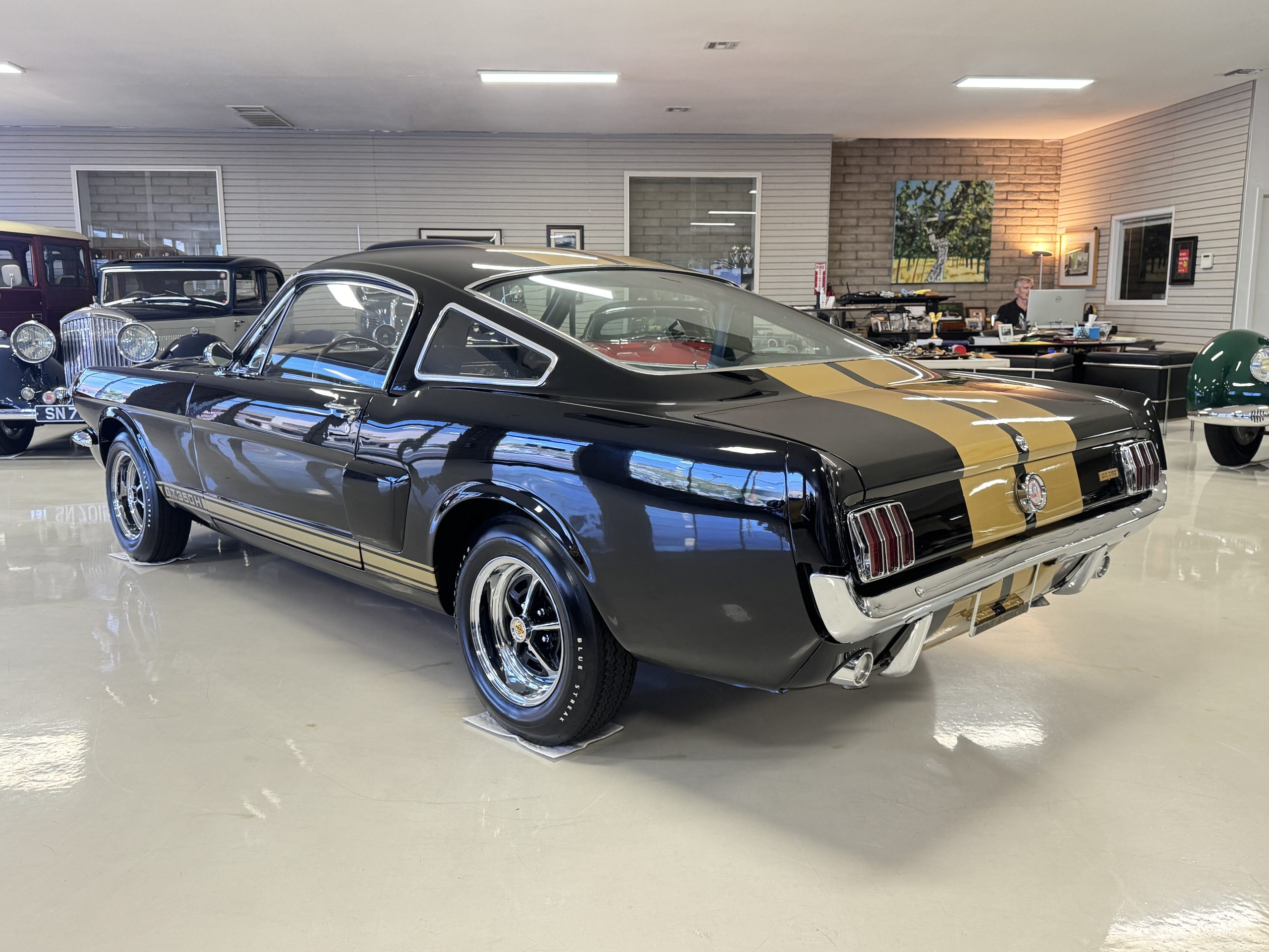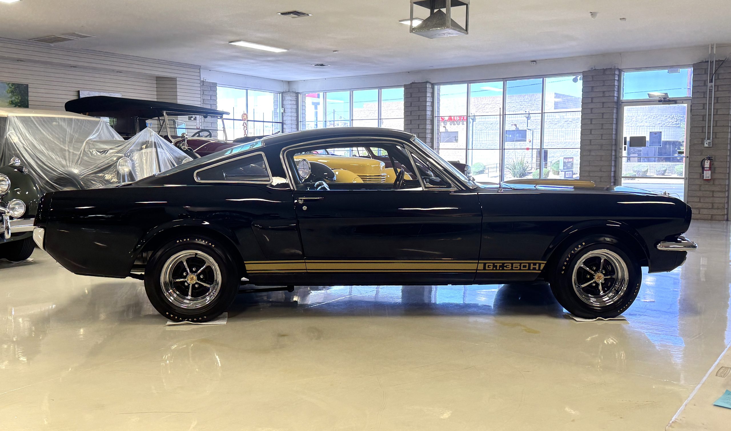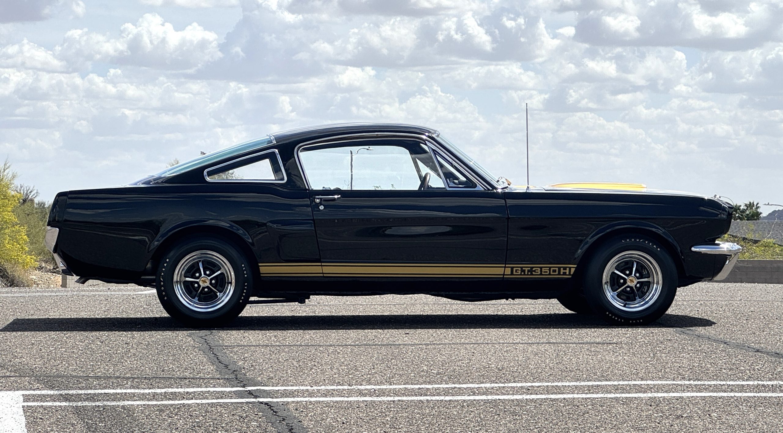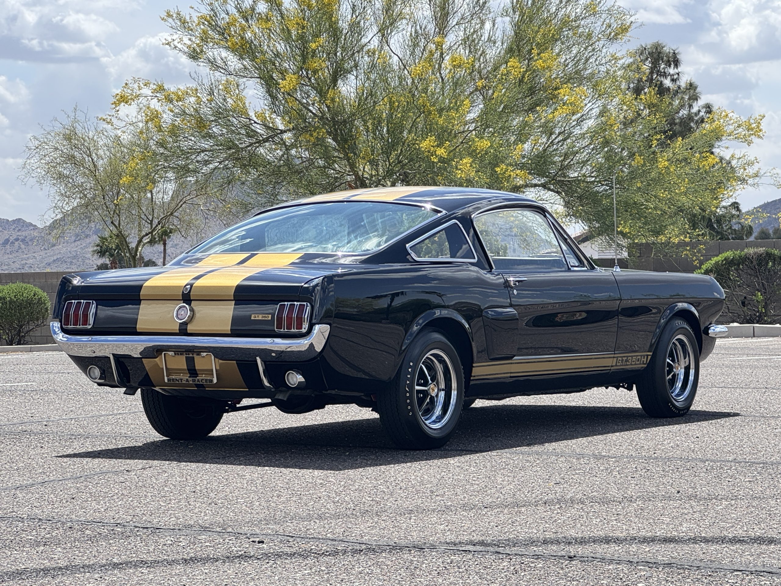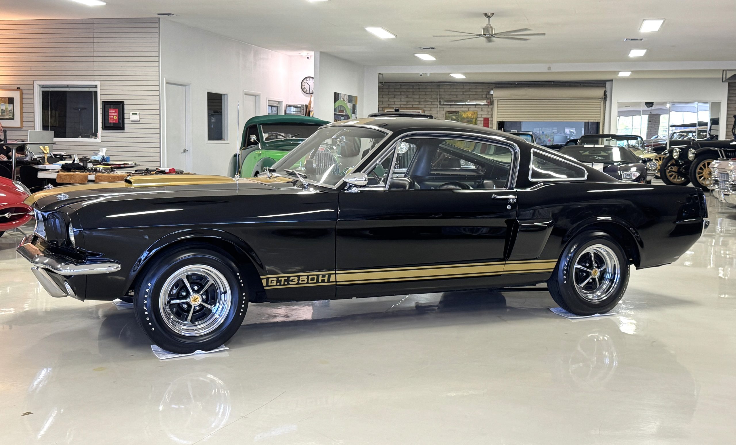 This 1966 Shelby Mustang GT350H was shipped new by Shelby American Inc. from their Los Angeles, California, facility in April 1966. The 289ci HiPo V8 was fitted with a Paxton supercharger and the car was refurbished under previous ownership before being acquired by the current owner in 2021. Finished in black with gold graphics, the car rides on 14″ Magnum 500 wheels and is equipped with power-assisted front disc brakes as well as a three-speed automatic transmission. Inside, black vinyl–trimmed seats are accompanied by latch-and-link front belts along with a simulated wood-rimmed steering wheel.