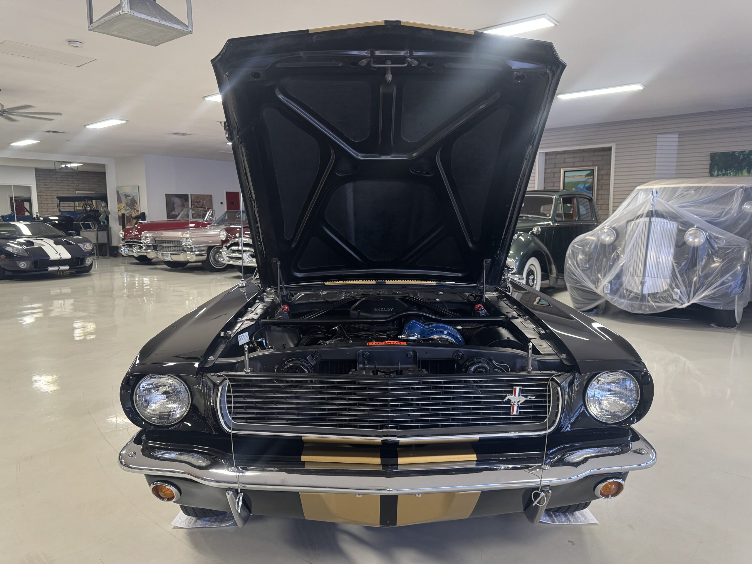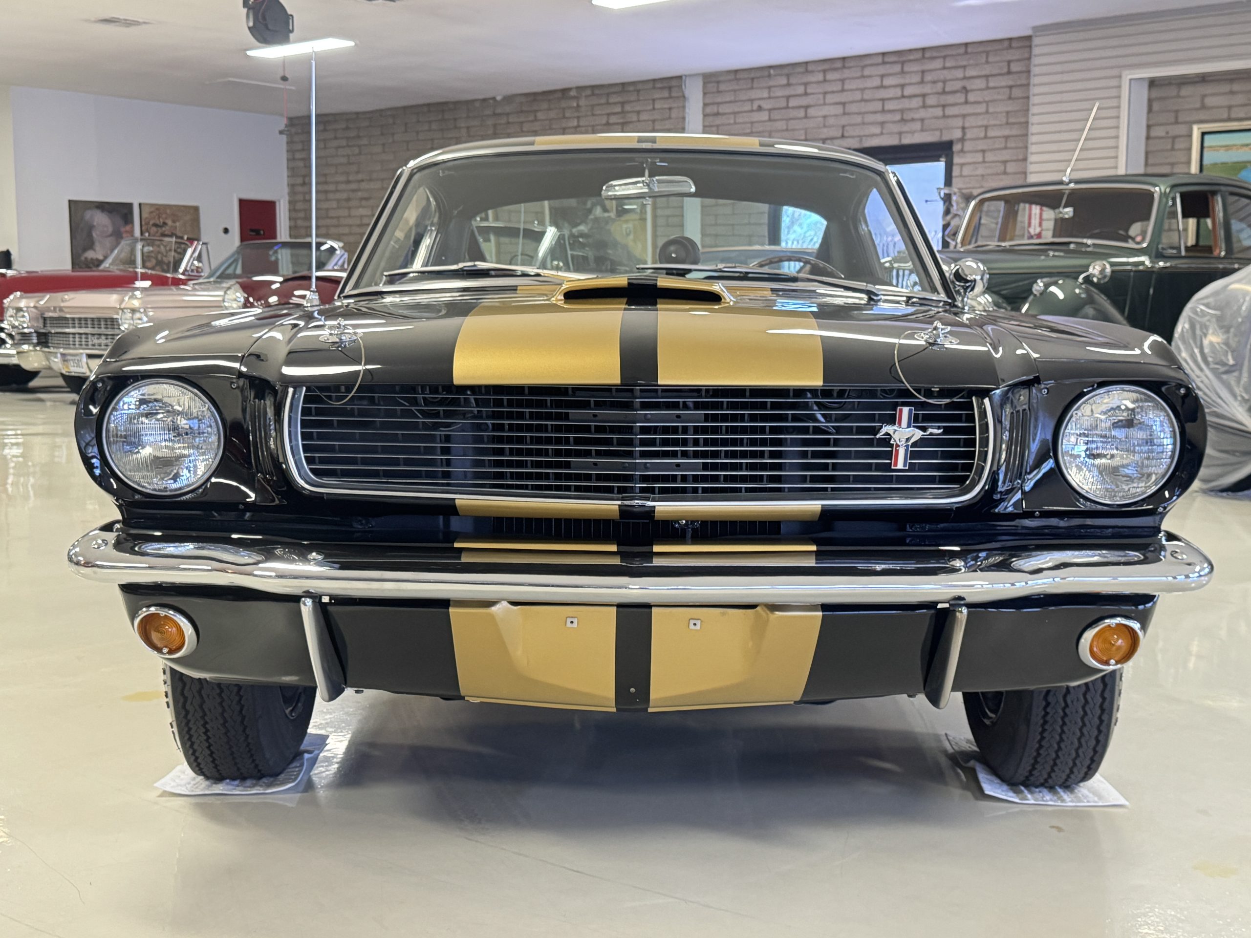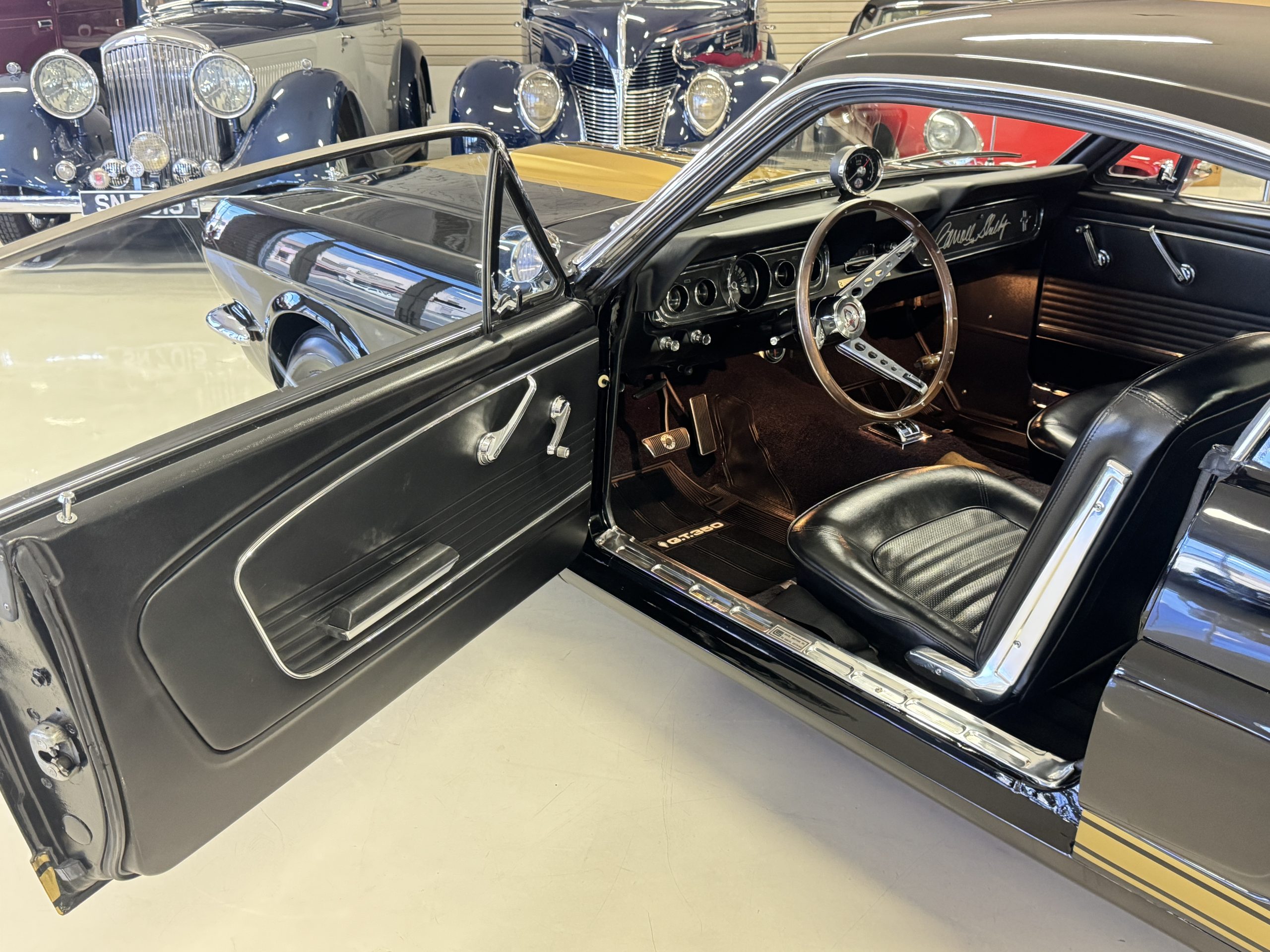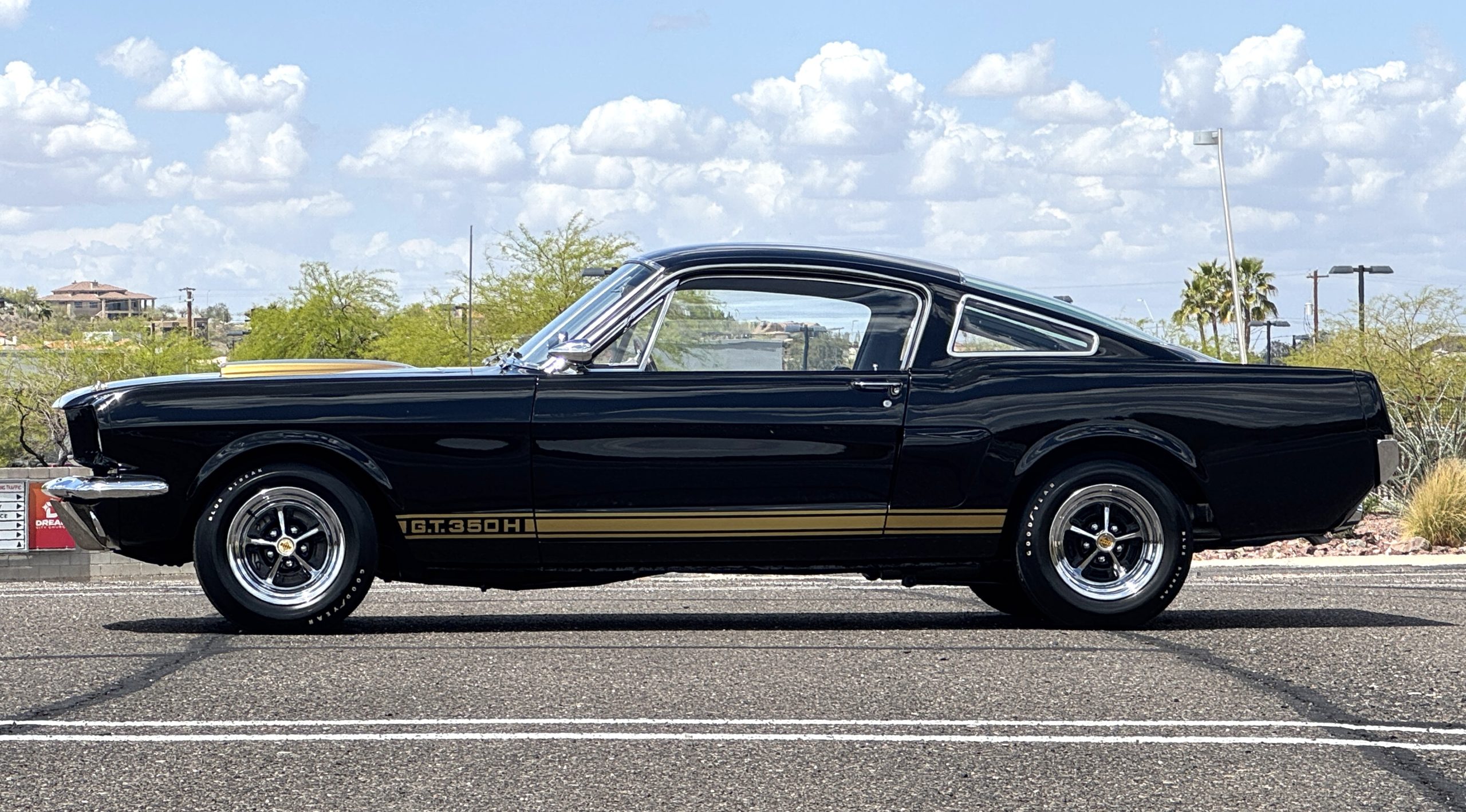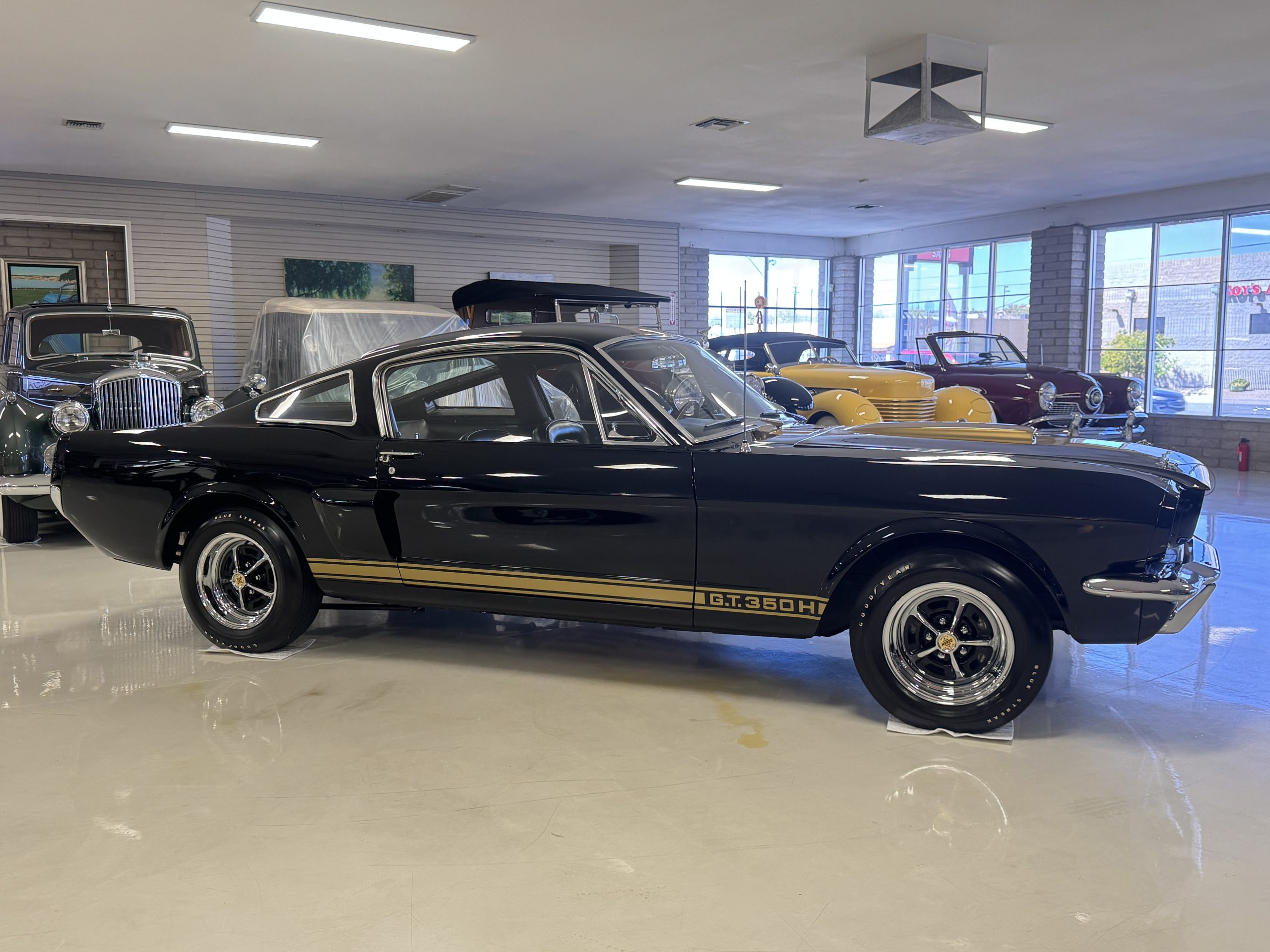 This 1966 Shelby Mustang GT350H was shipped new by Shelby American Inc. from their Los Angeles, California, facility in April 1966. The 289ci HiPo V8 was fitted with a Paxton supercharger and the car was refurbished under previous ownership before being acquired by the current owner in 2021. Finished in black with gold graphics, the car rides on 14″ Magnum 500 wheels and is equipped with power-assisted front disc brakes as well as a three-speed automatic transmission. Inside, black vinyl–trimmed seats are accompanied by latch-and-link front belts along with a simulated wood-rimmed steering wheel.