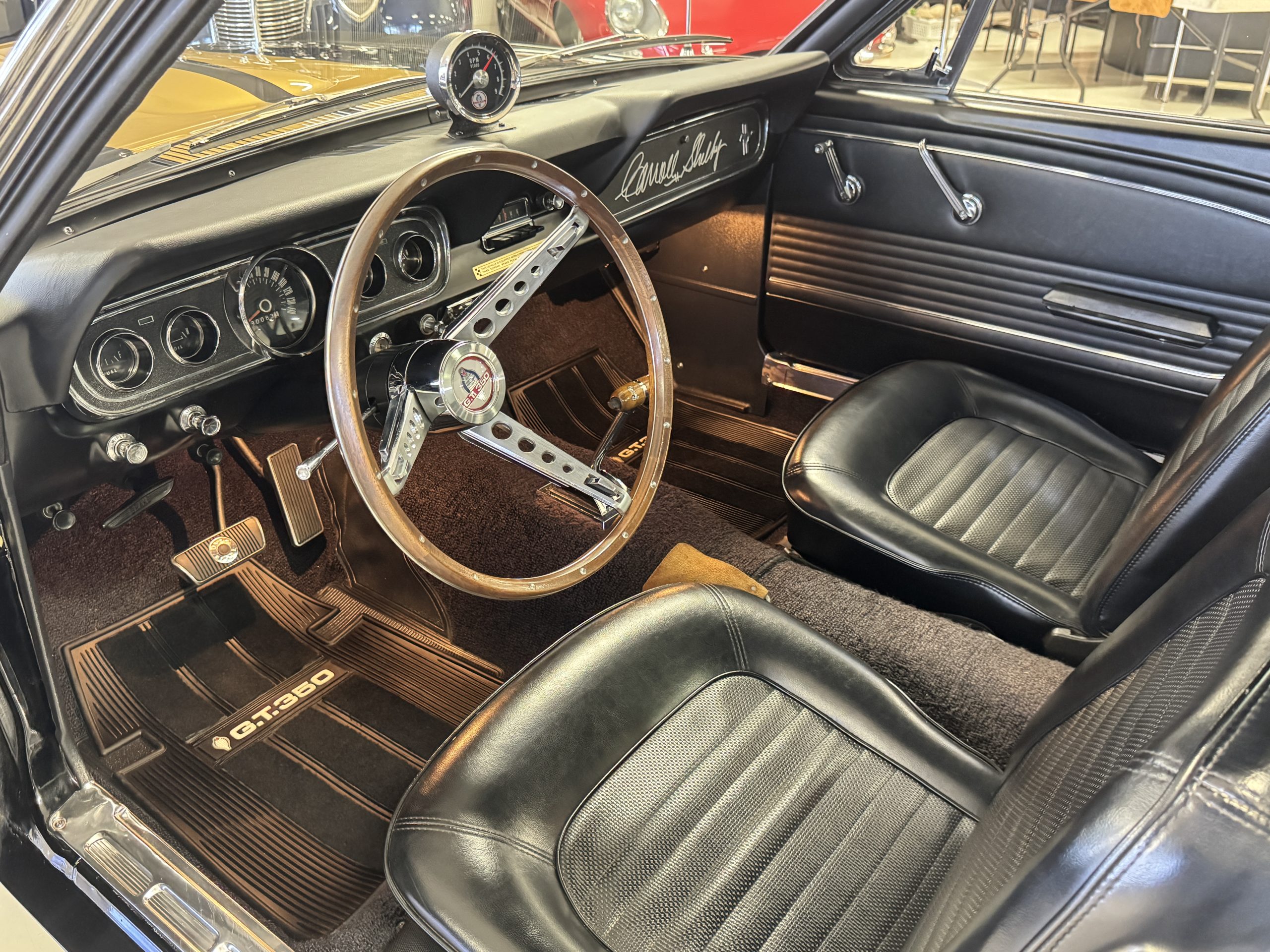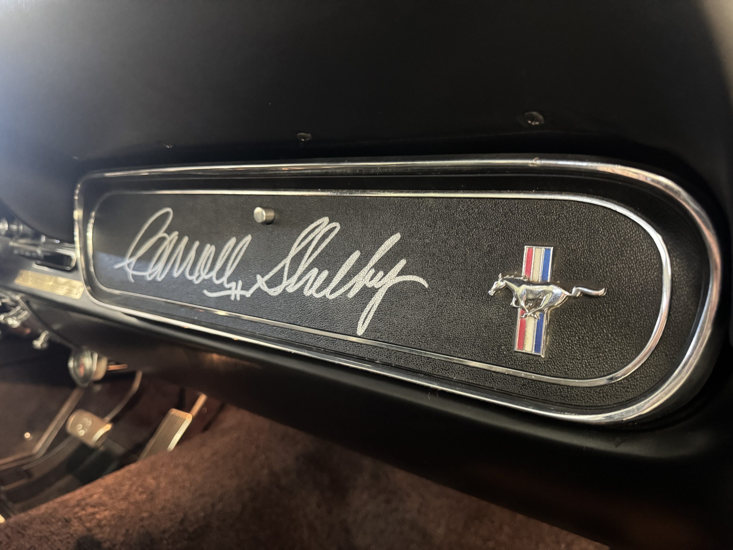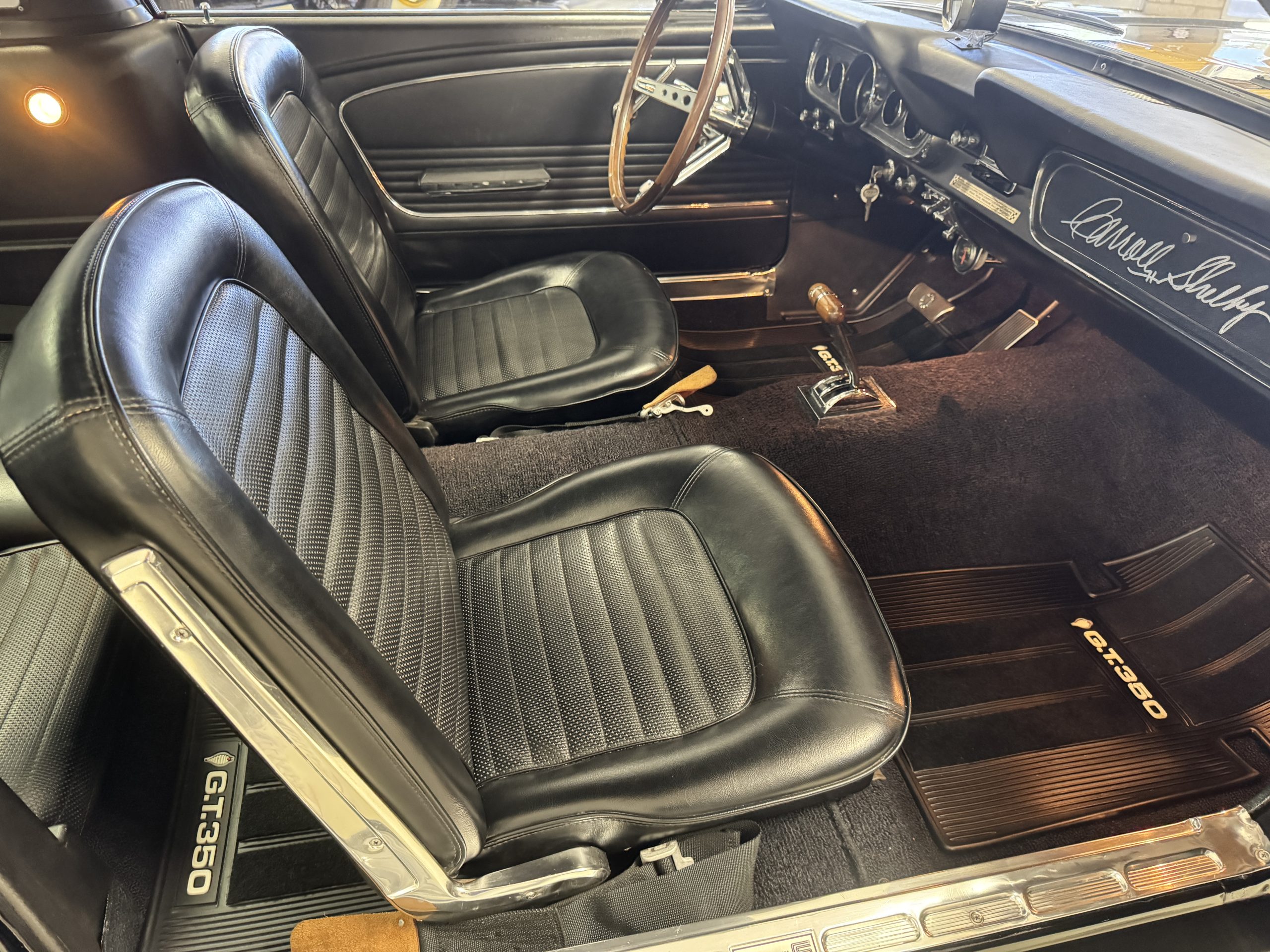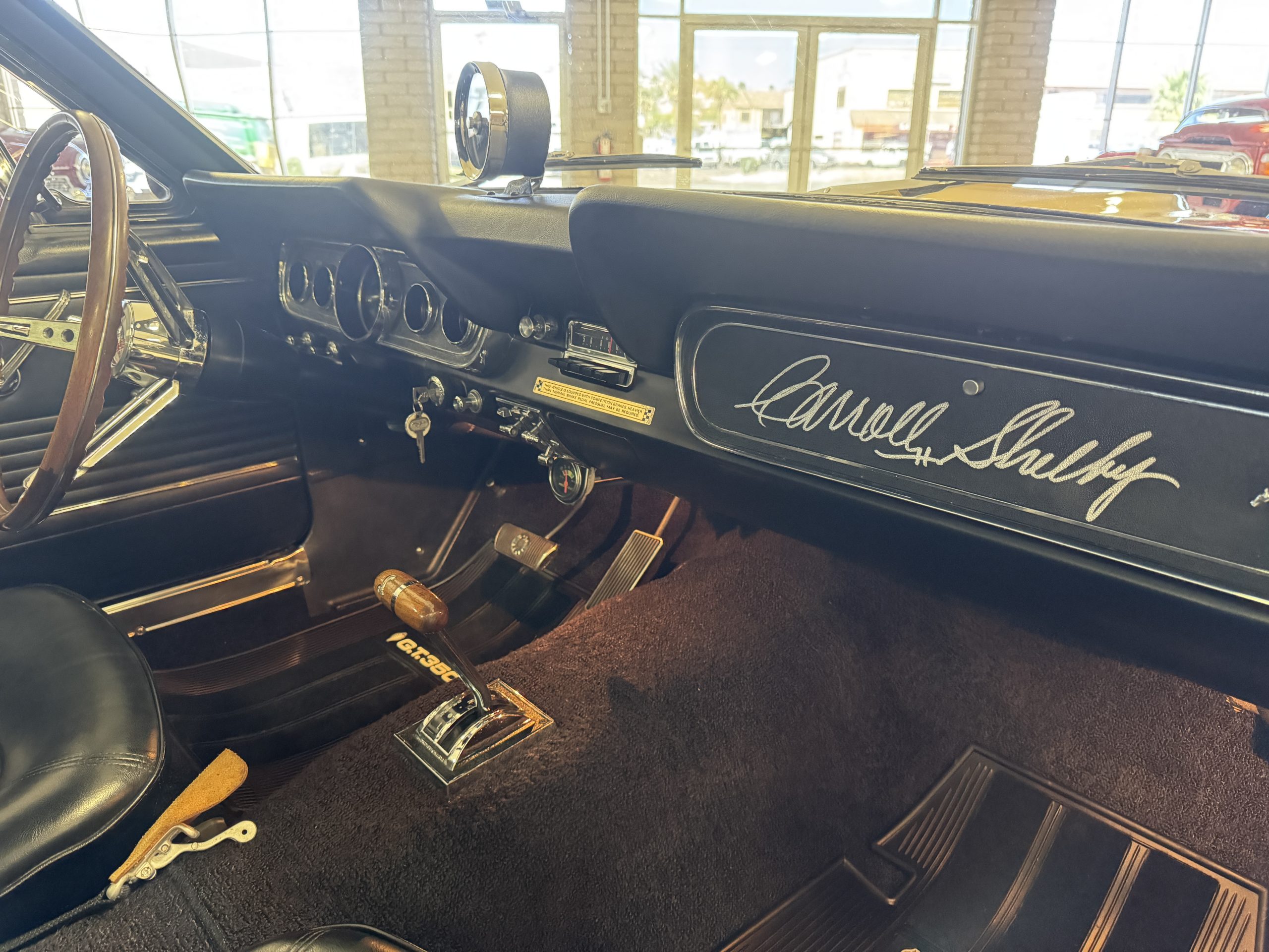 The cabin features low-back bucket seats trimmed in black vinyl, which extends to the split rear bench as well as the door panels. A Carroll Shelby signature appears on the glovebox door, and further details include an AM radio, a heater, and latch-and-link front belts.