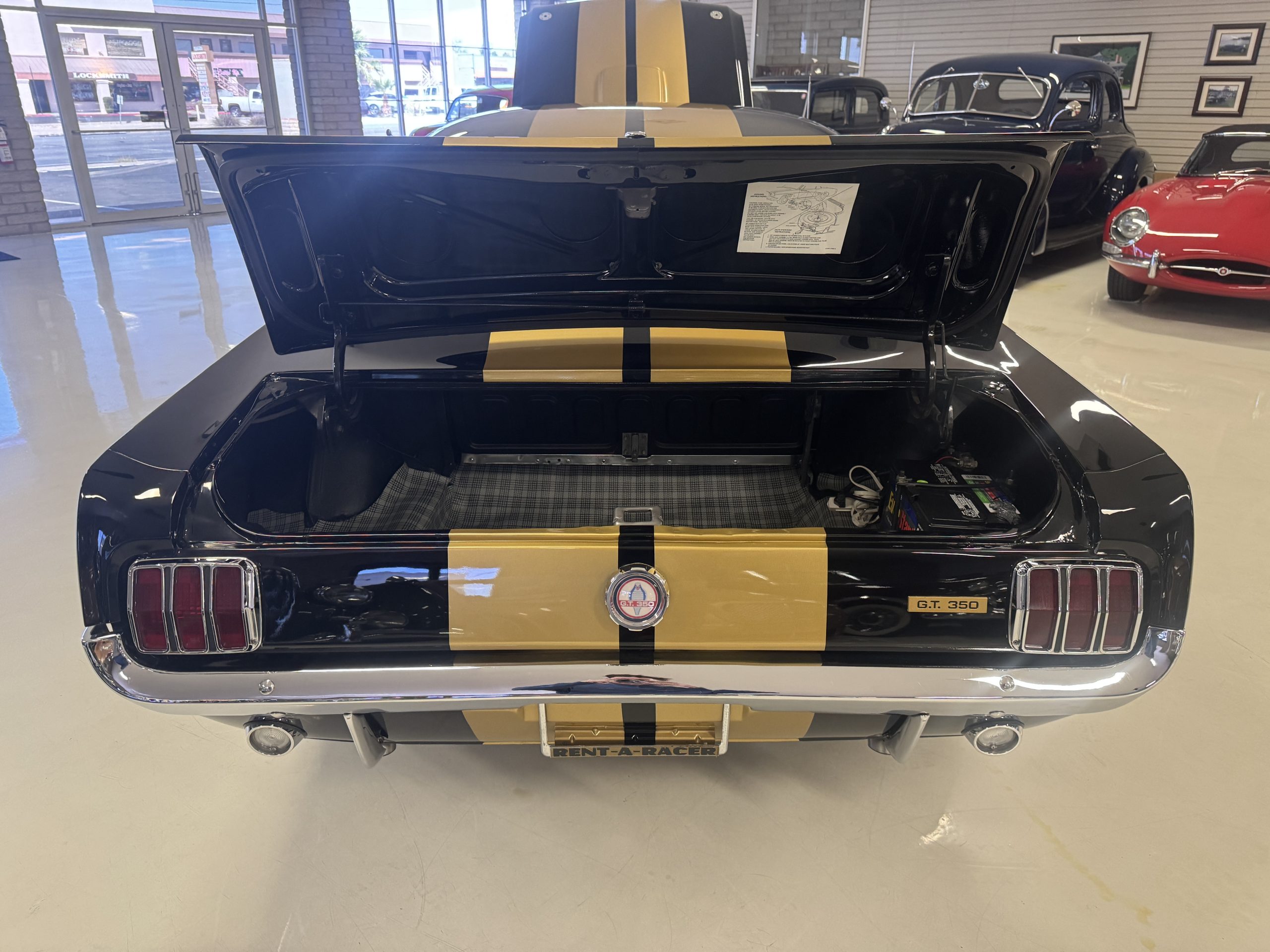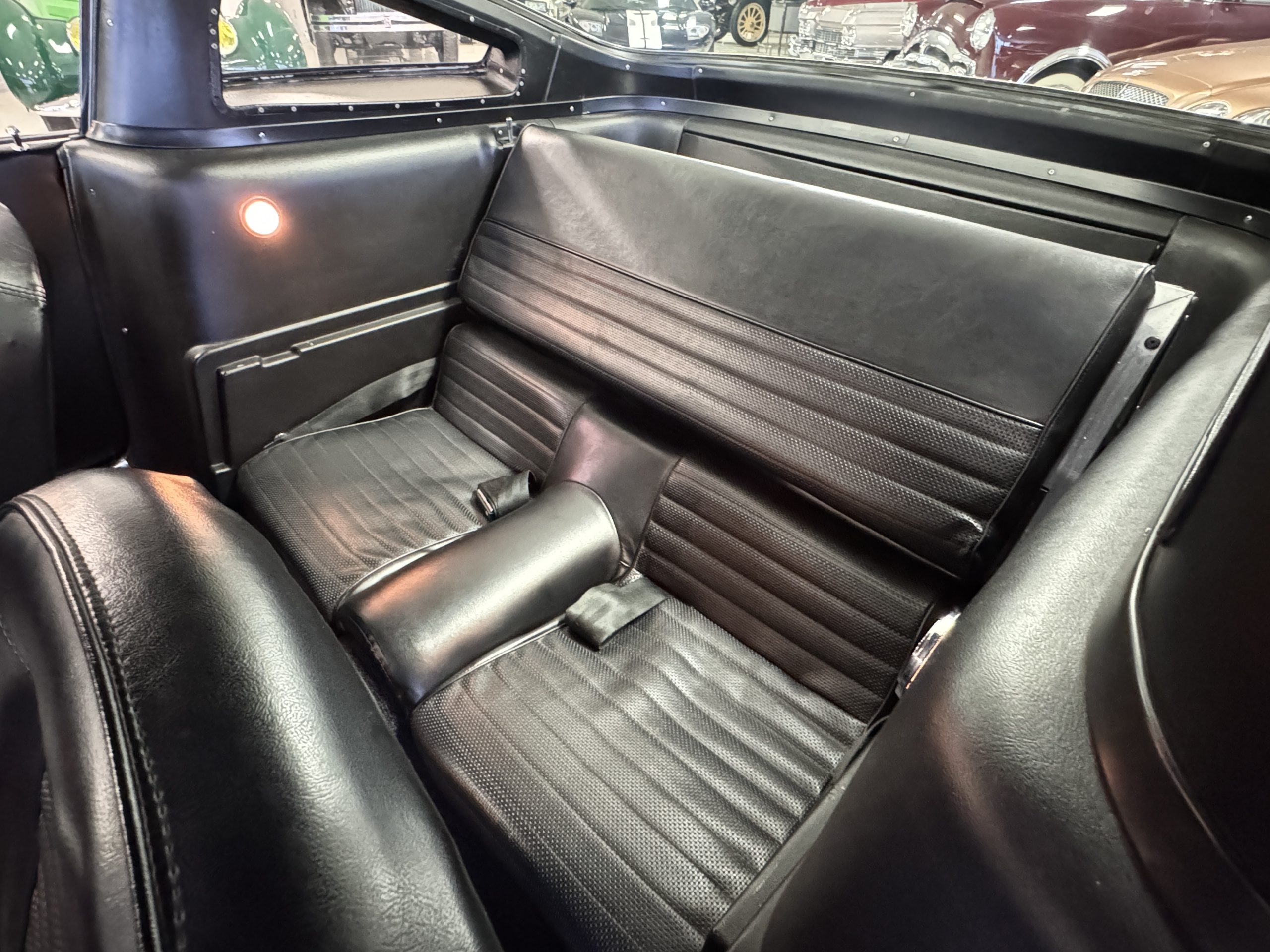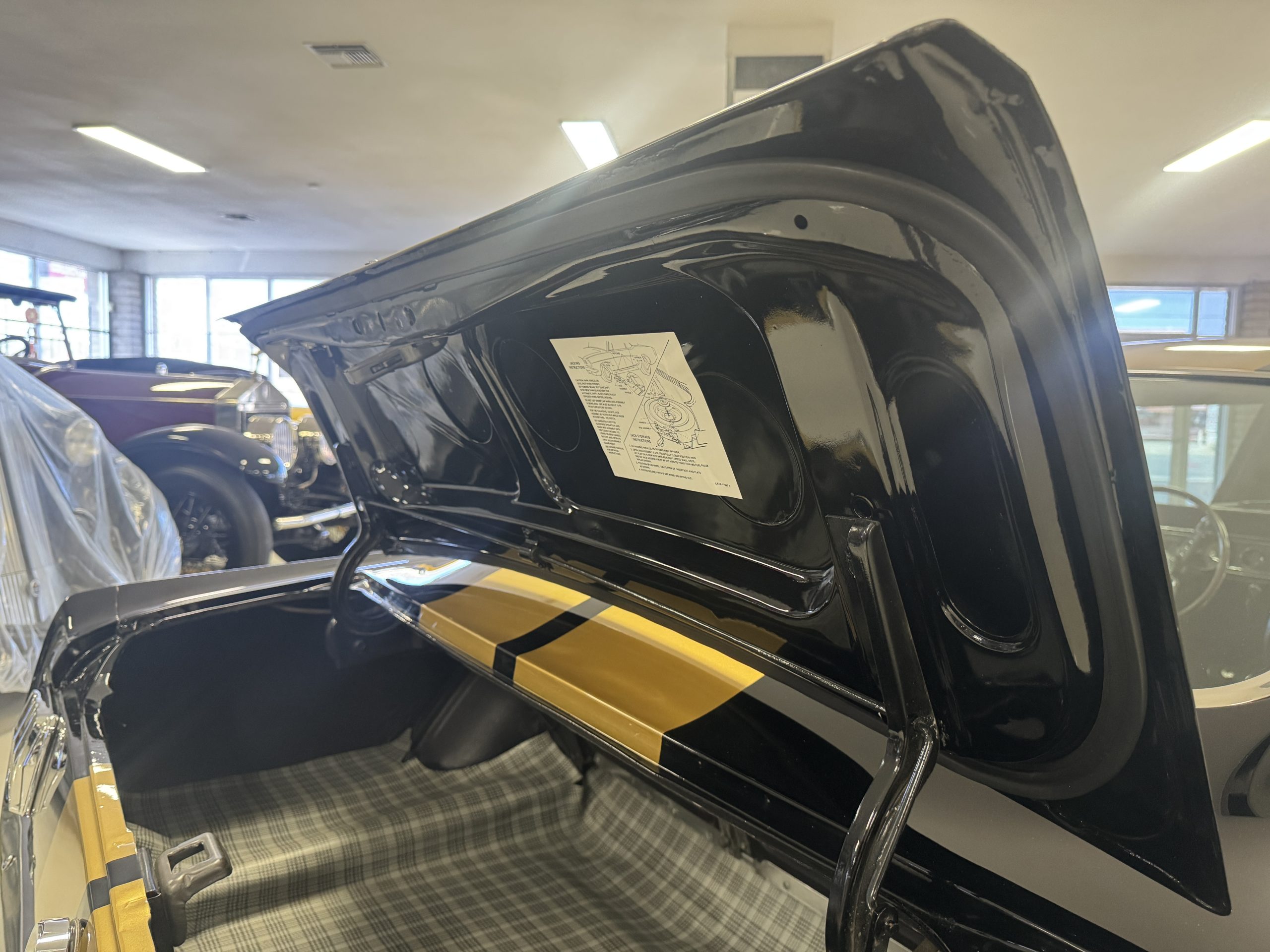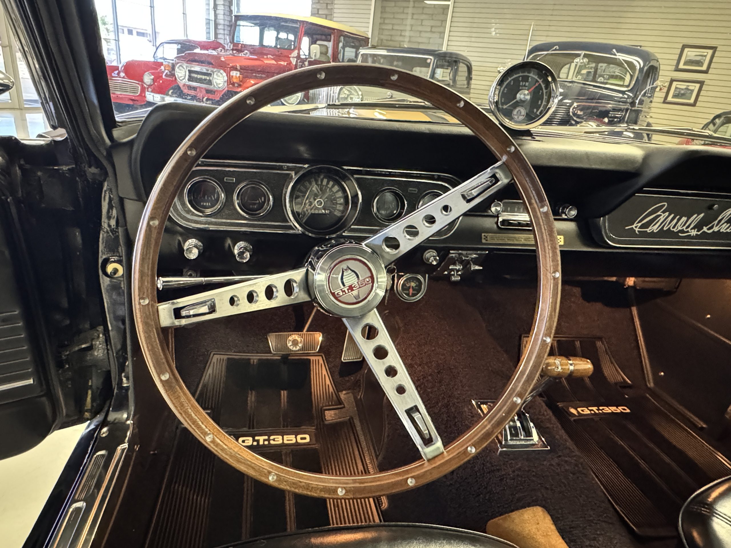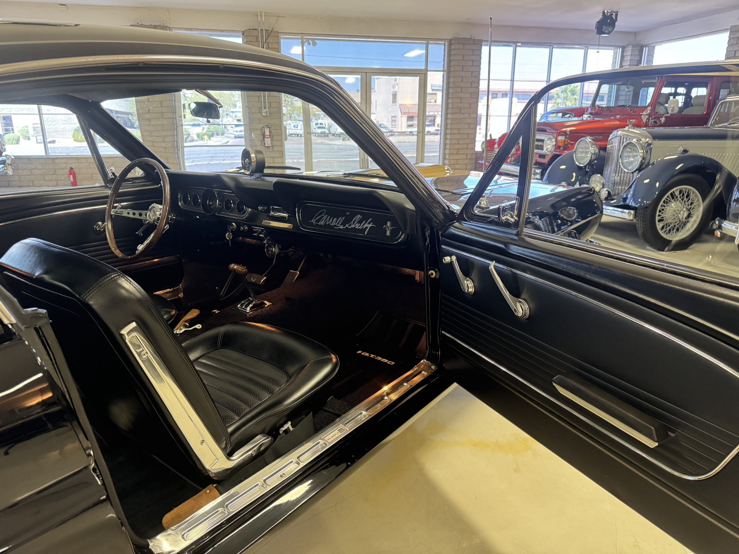The cabin features low-back bucket seats trimmed in black vinyl, which extends to the split rear bench as well as the door panels. A Carroll Shelby signature appears on the glovebox door, and further details include an AM radio, a heater, and latch-and-link front belts.