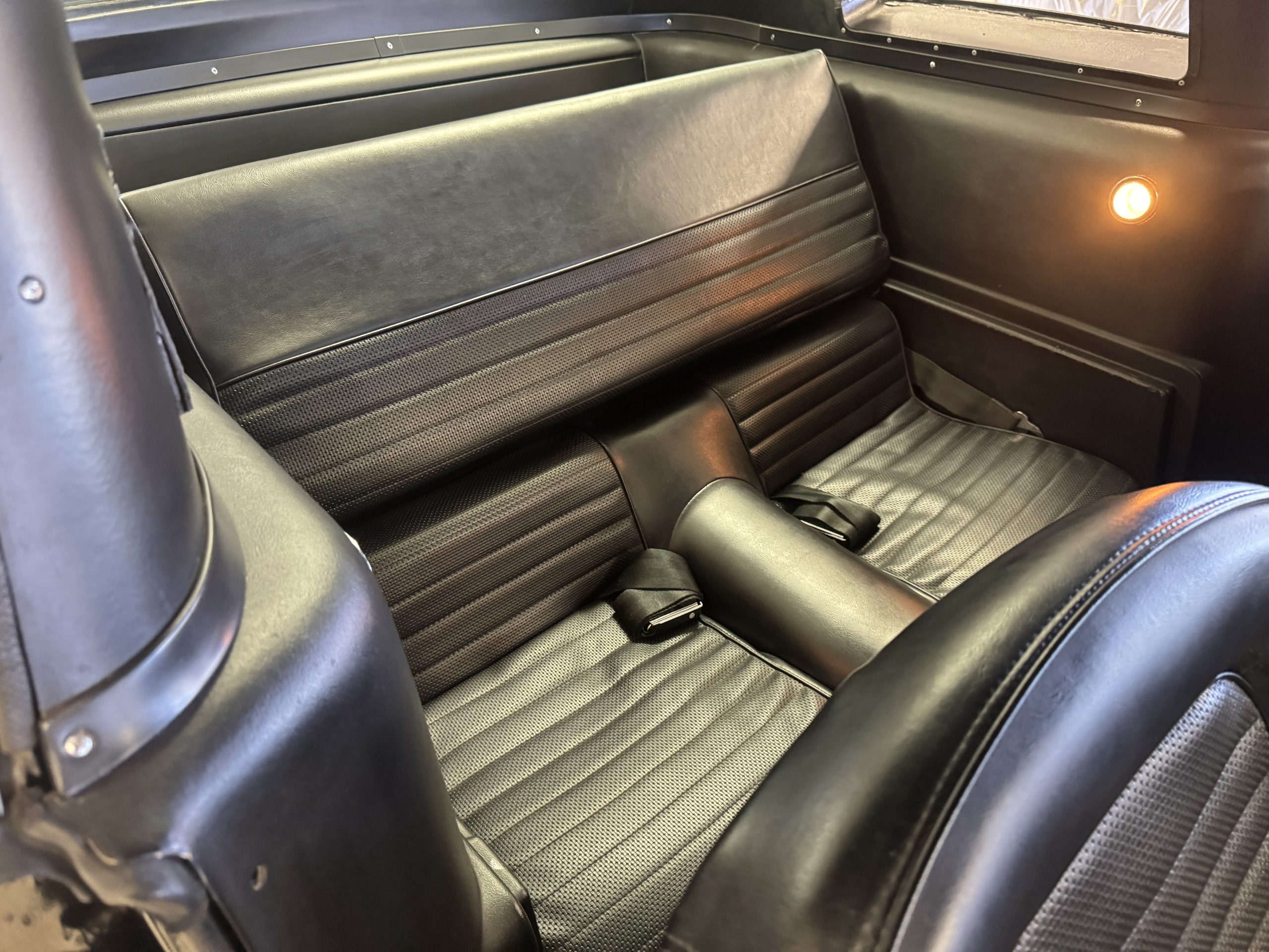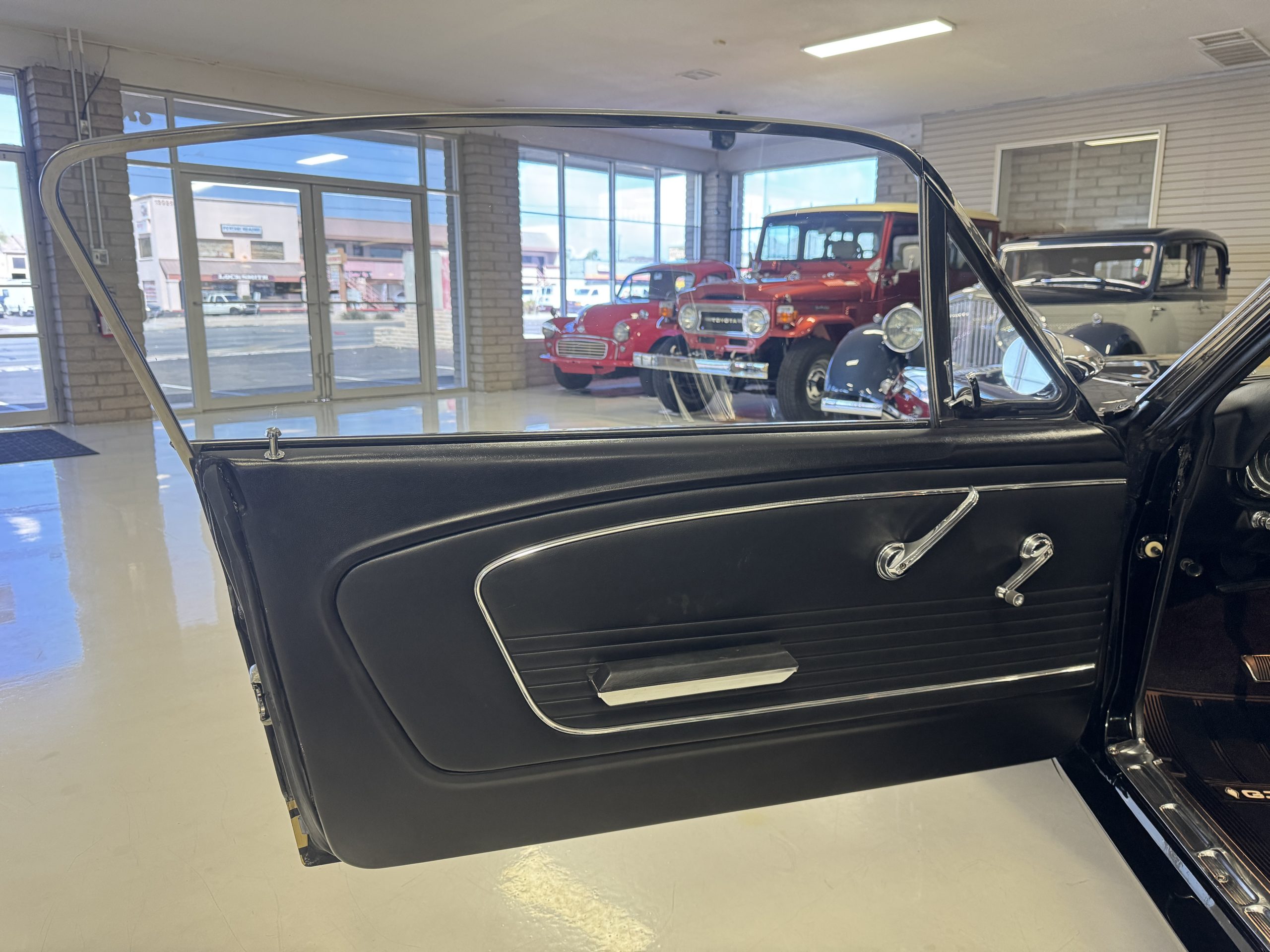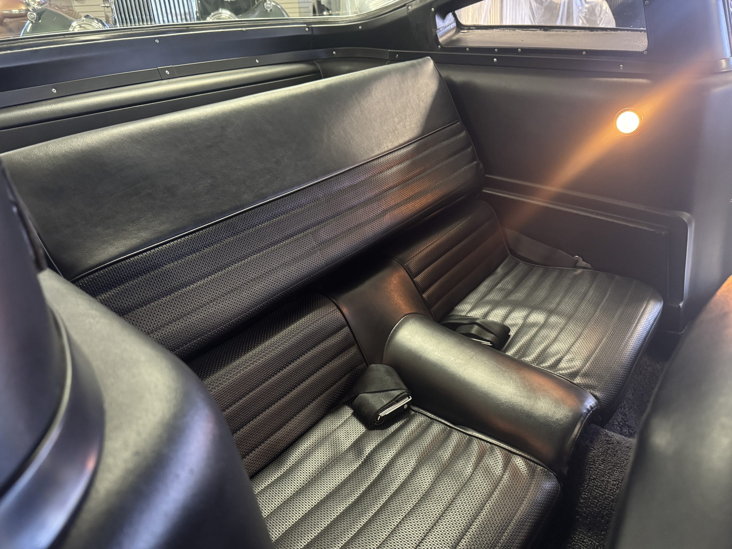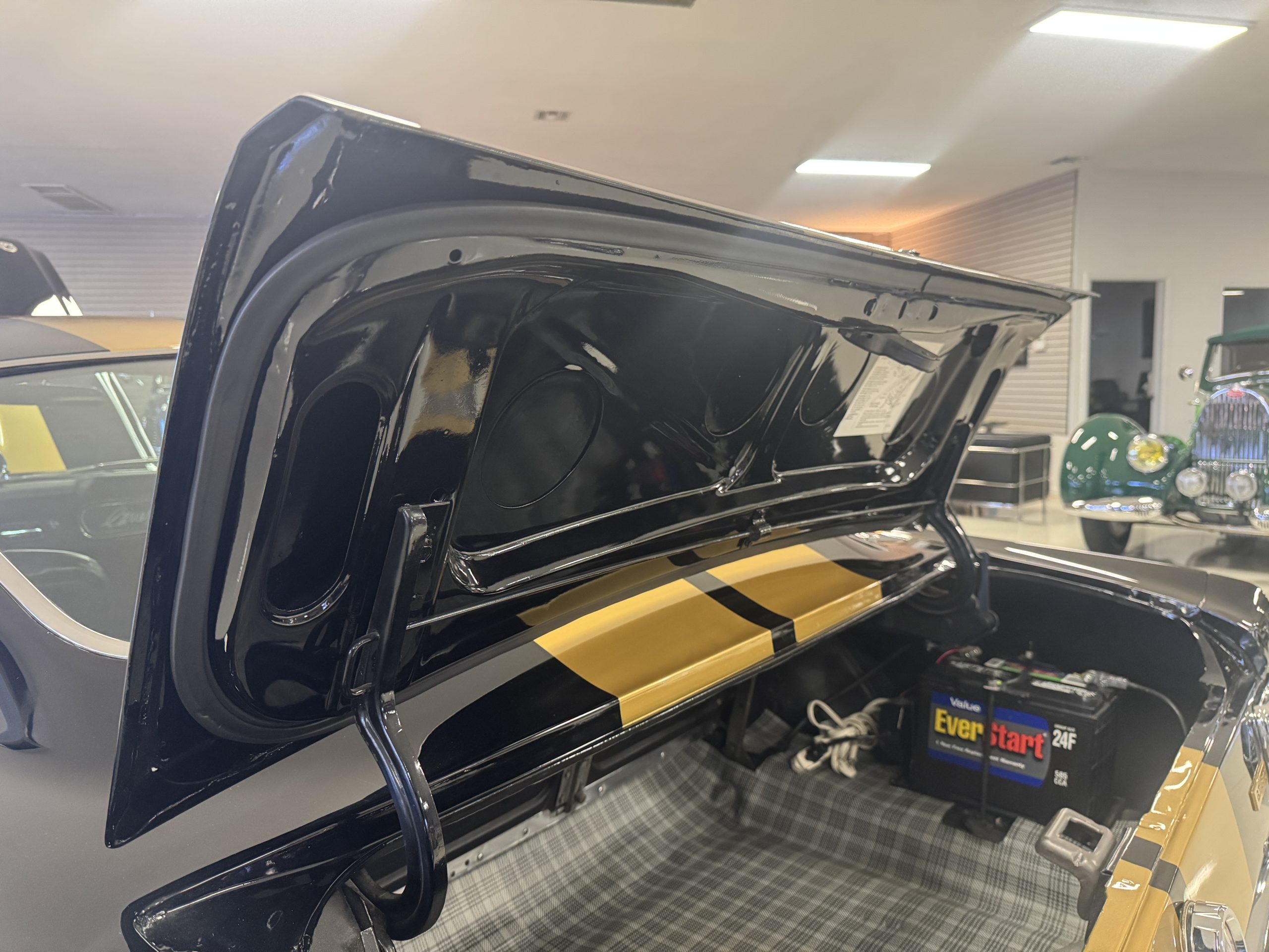 The cabin features low-back bucket seats trimmed in black vinyl, which extends to the split rear bench as well as the door panels. A Carroll Shelby signature appears on the glovebox door, and further details include an AM radio, a heater, and latch-and-link front belts.