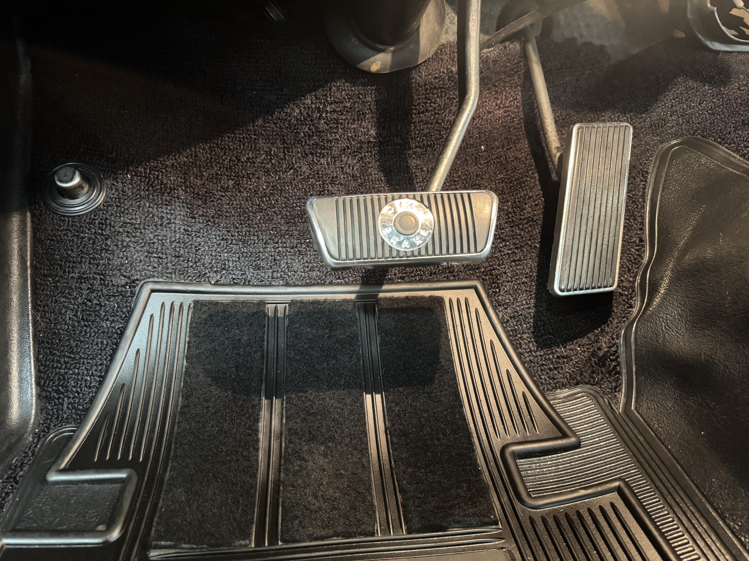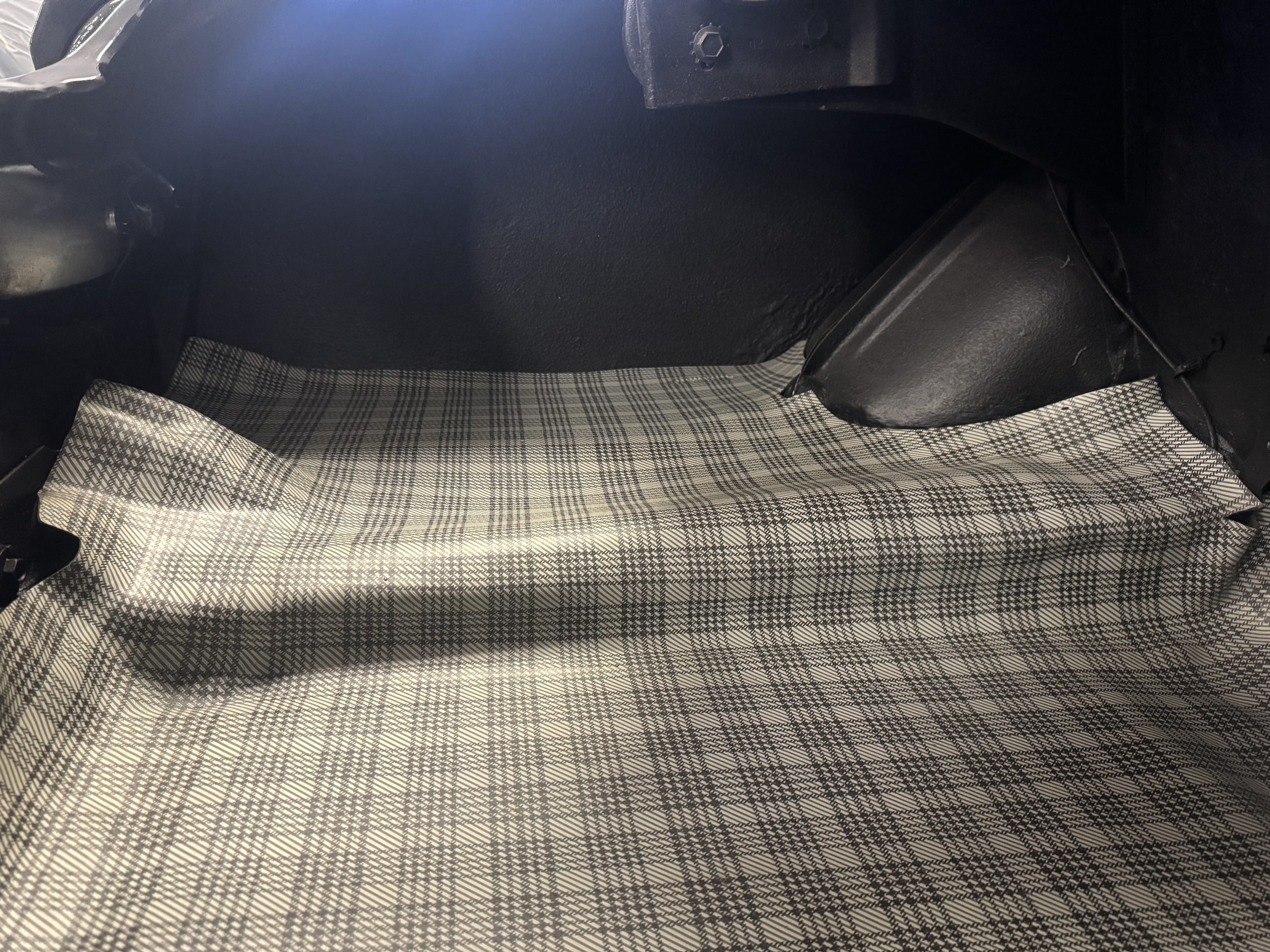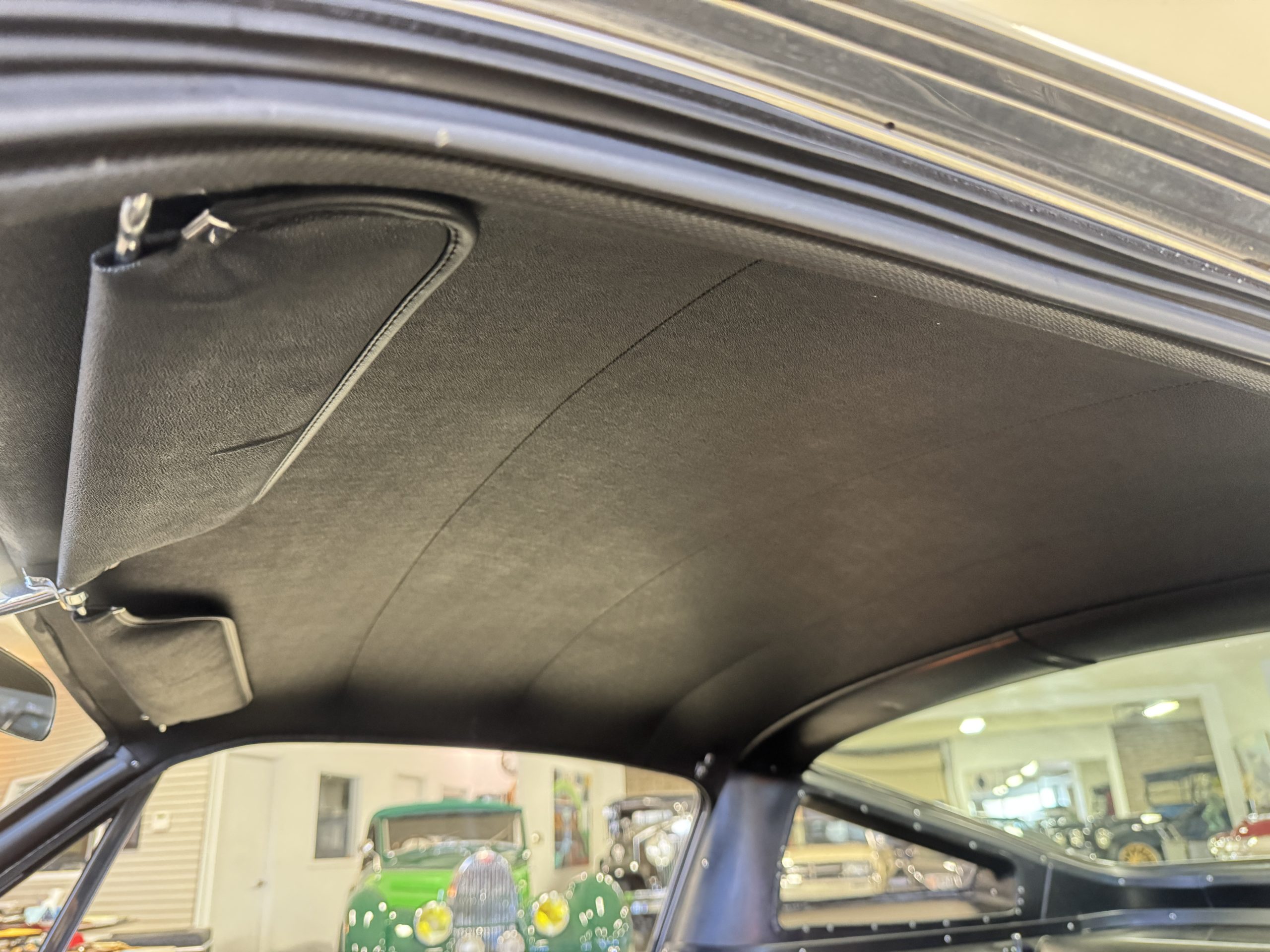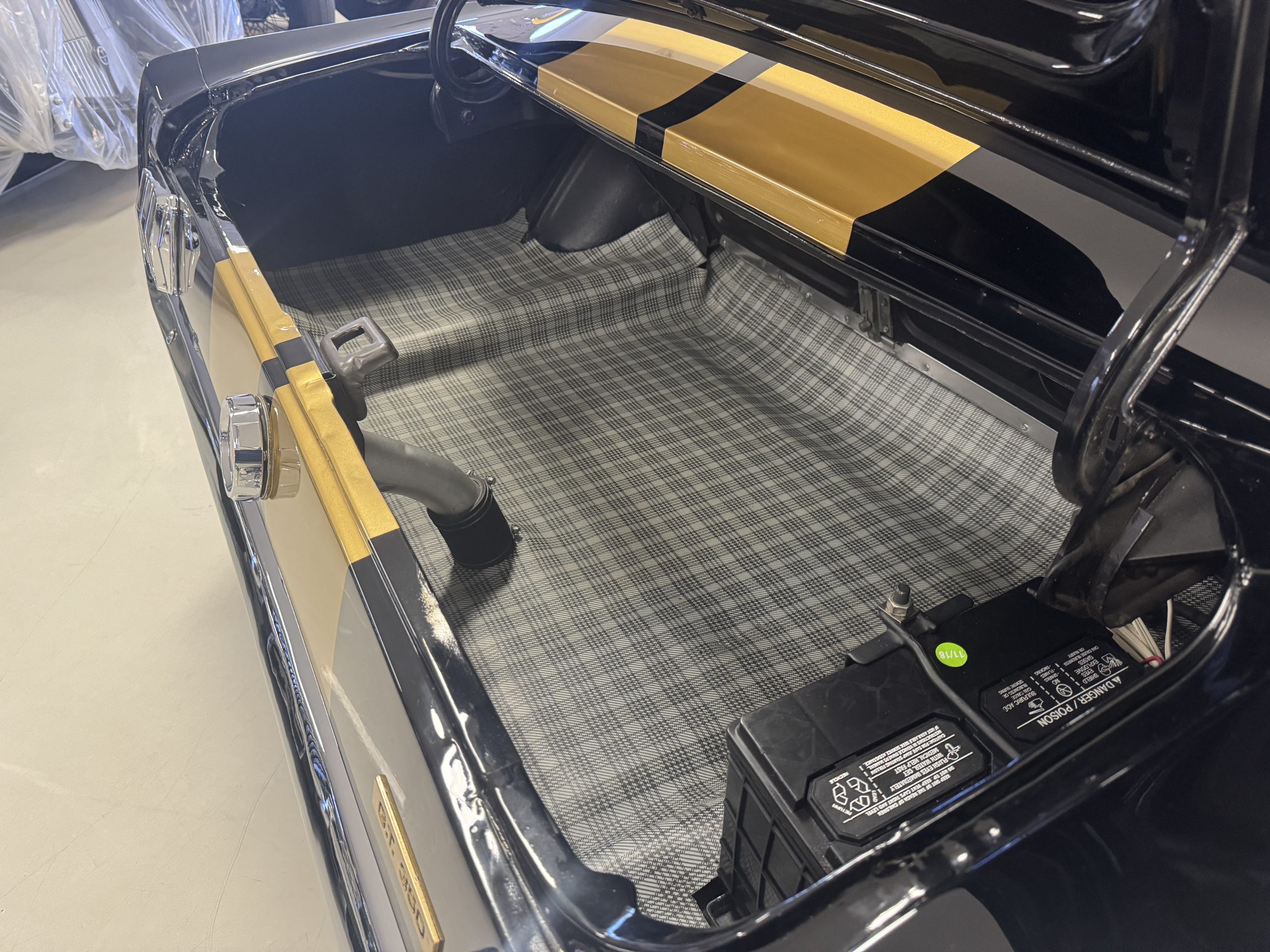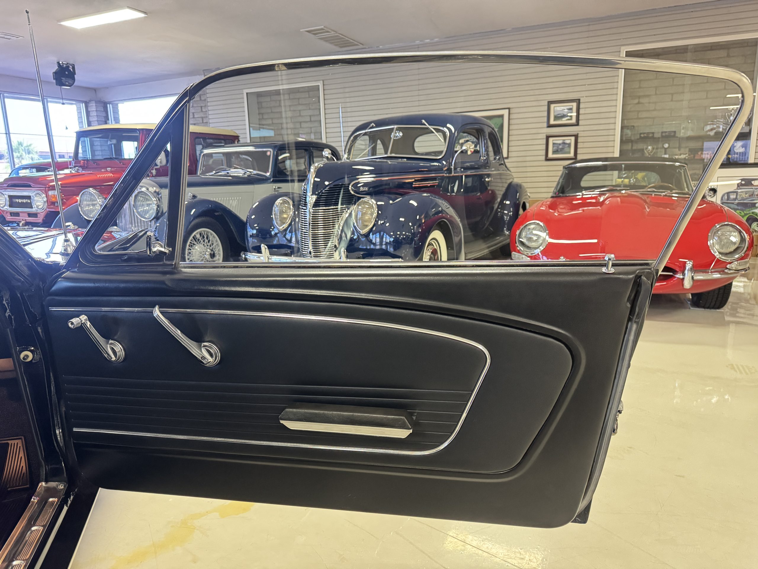 The cabin features low-back bucket seats trimmed in black vinyl, which extends to the split rear bench as well as the door panels. A Carroll Shelby signature appears on the glovebox door, and further details include an AM radio, a heater, and latch-and-link front belts.