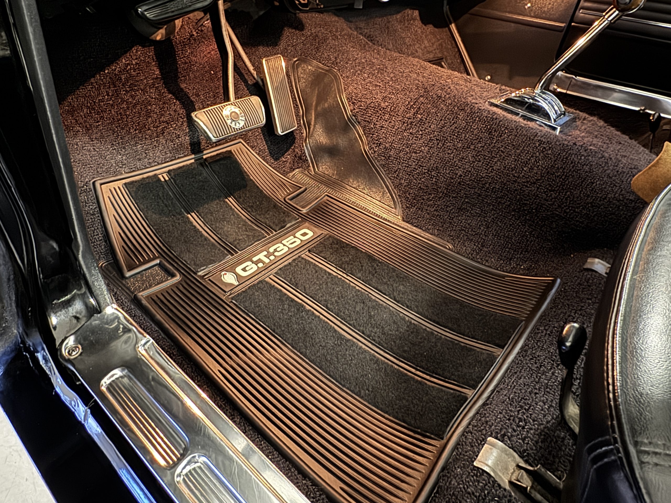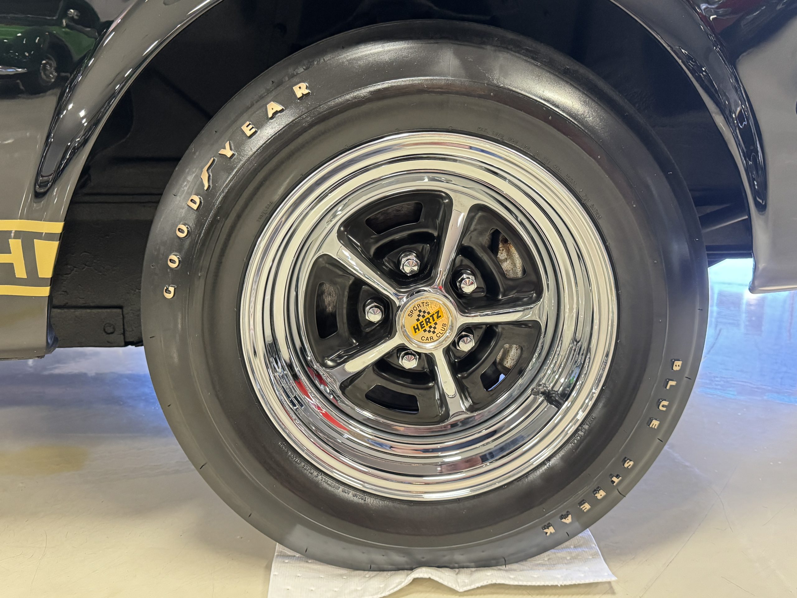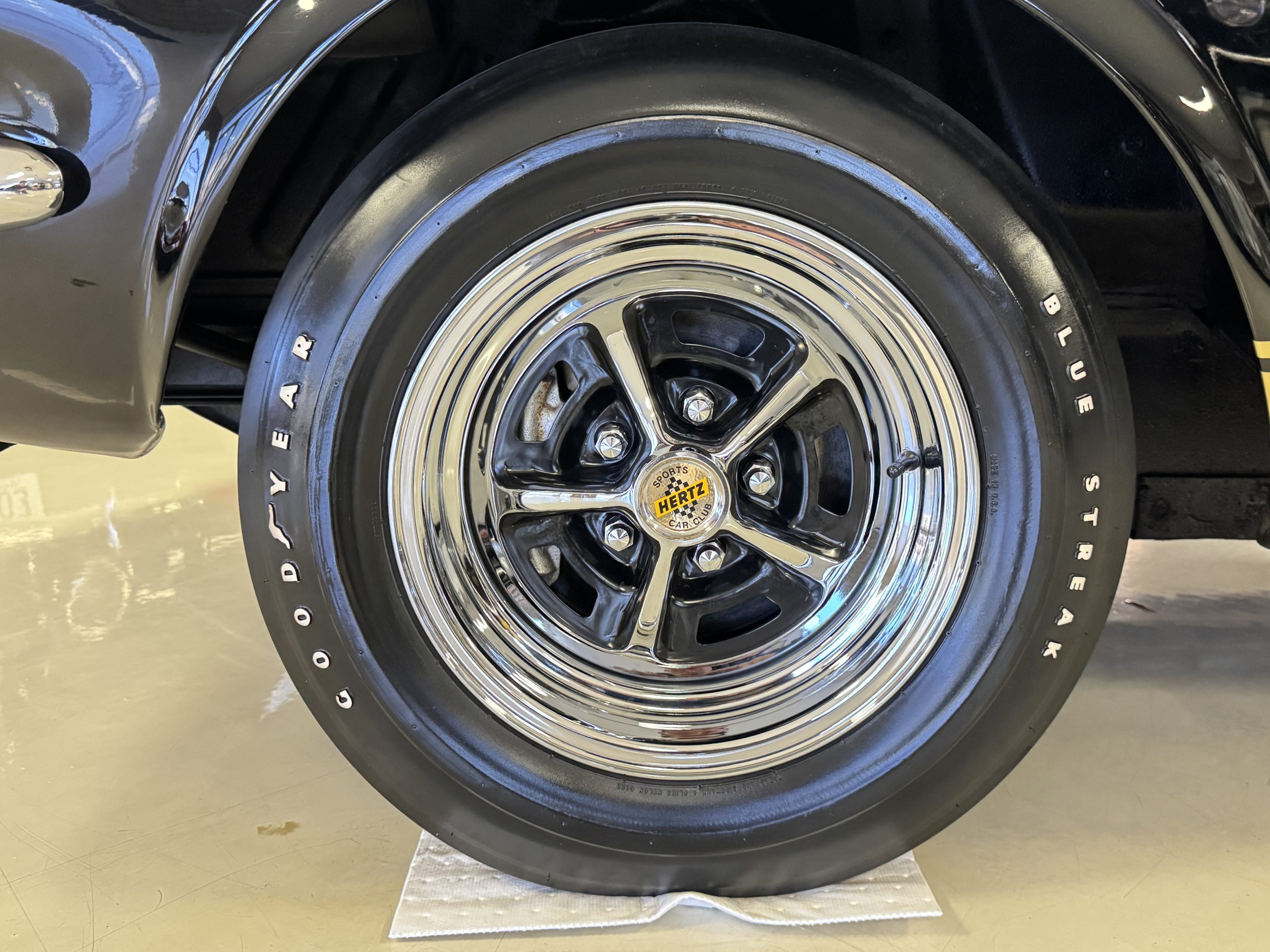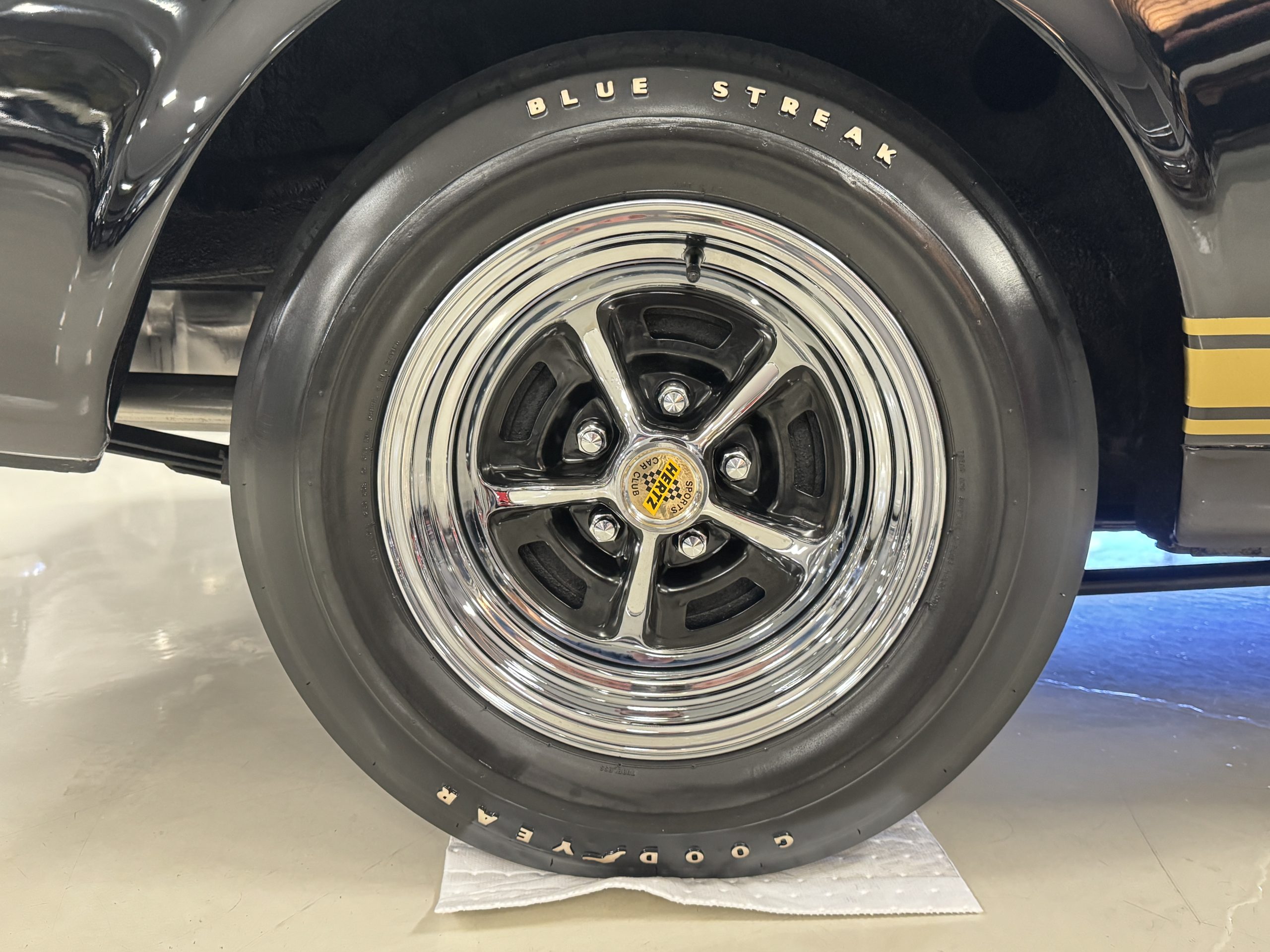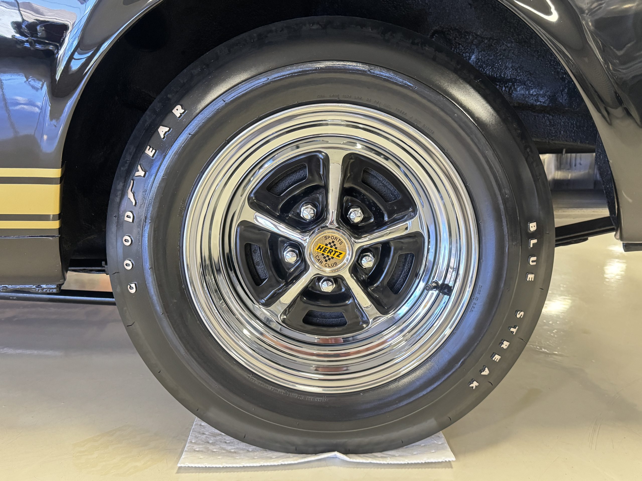 Chrome-plated 14″ Magnum 500 wheels are mounted with Goodyear Blue Streak tires. GT350s were factory-equipped with Kelsey-Hayes front disc brakes as well as larger rear drums than standard Mustangs.