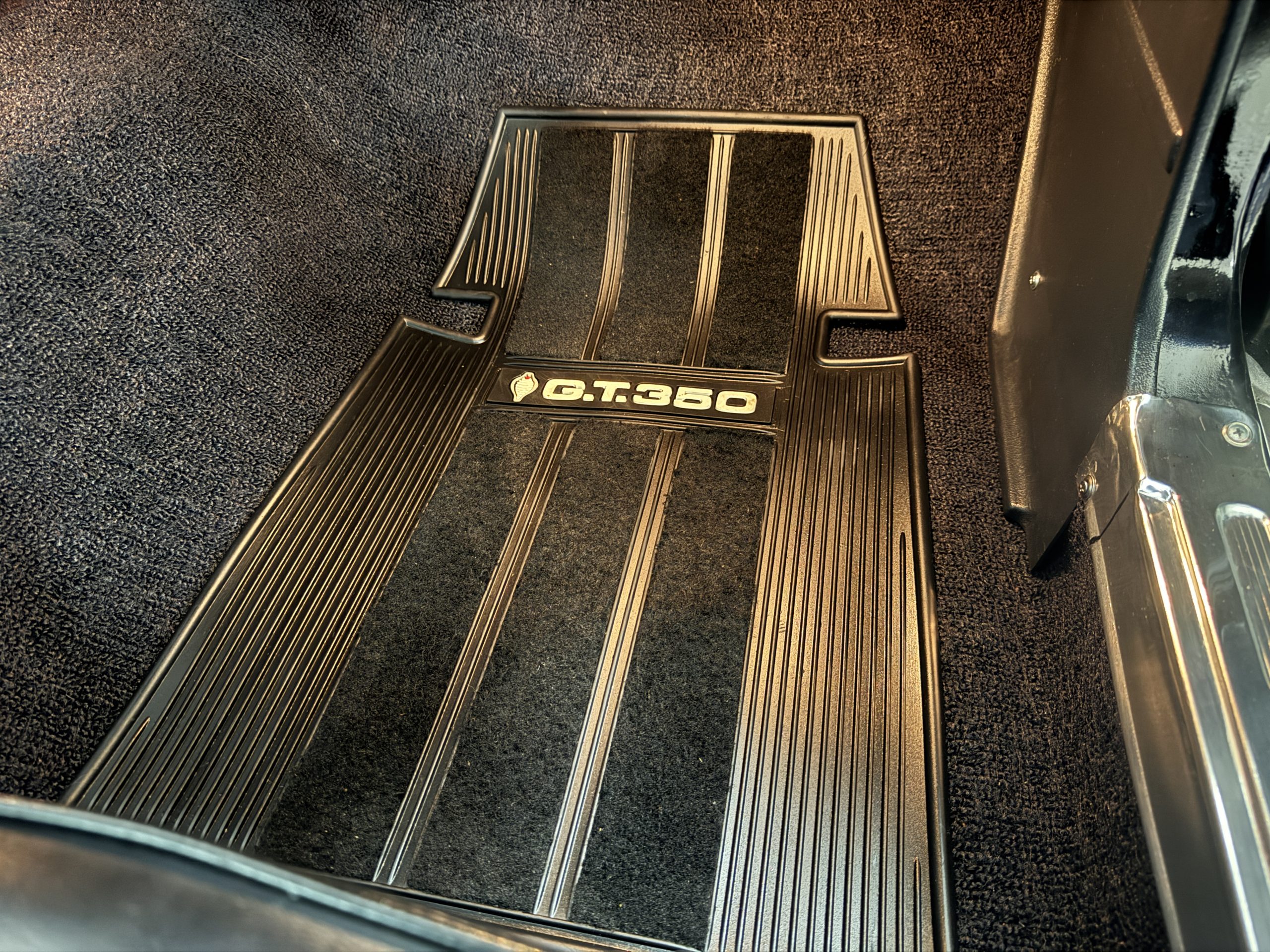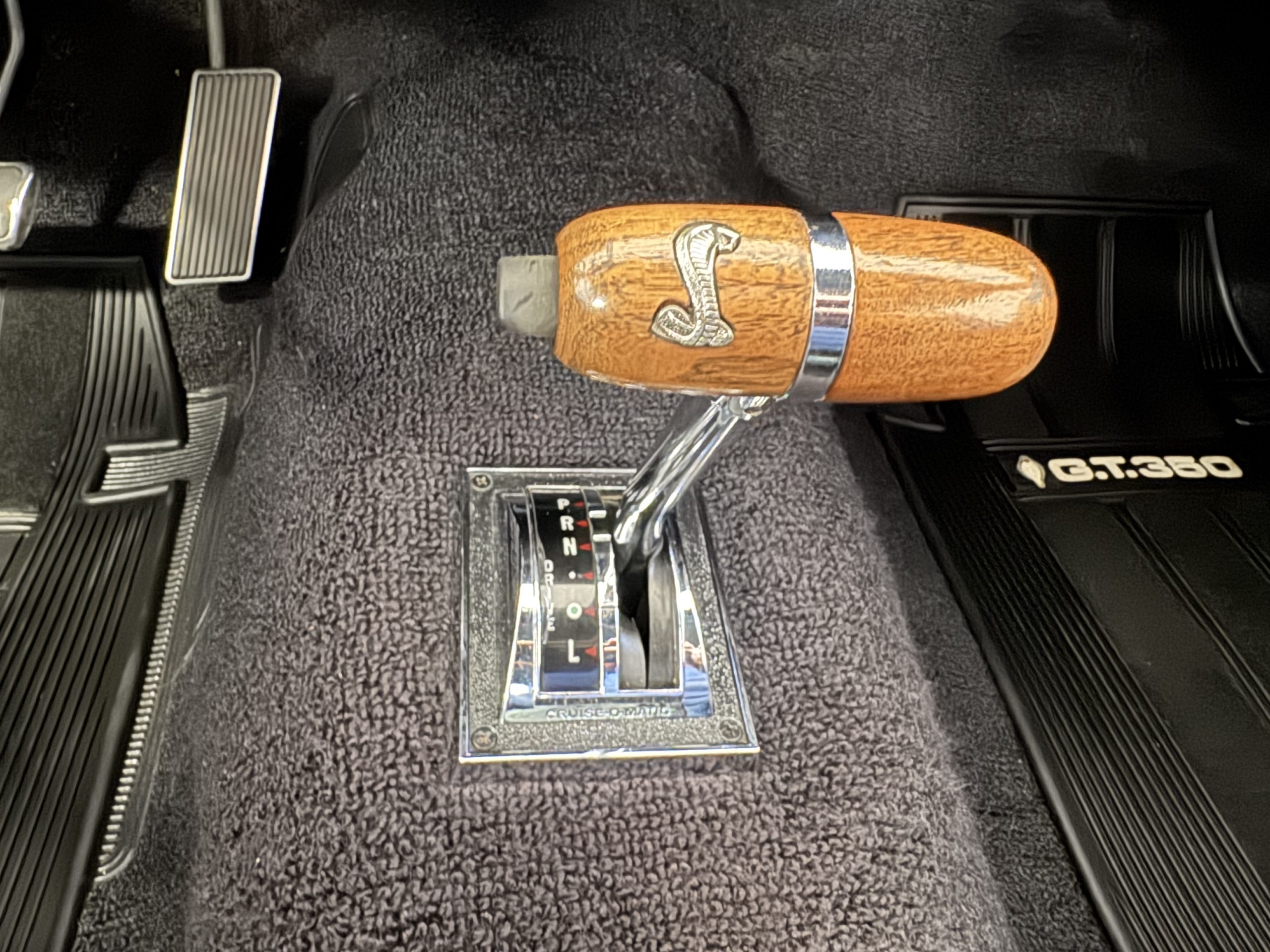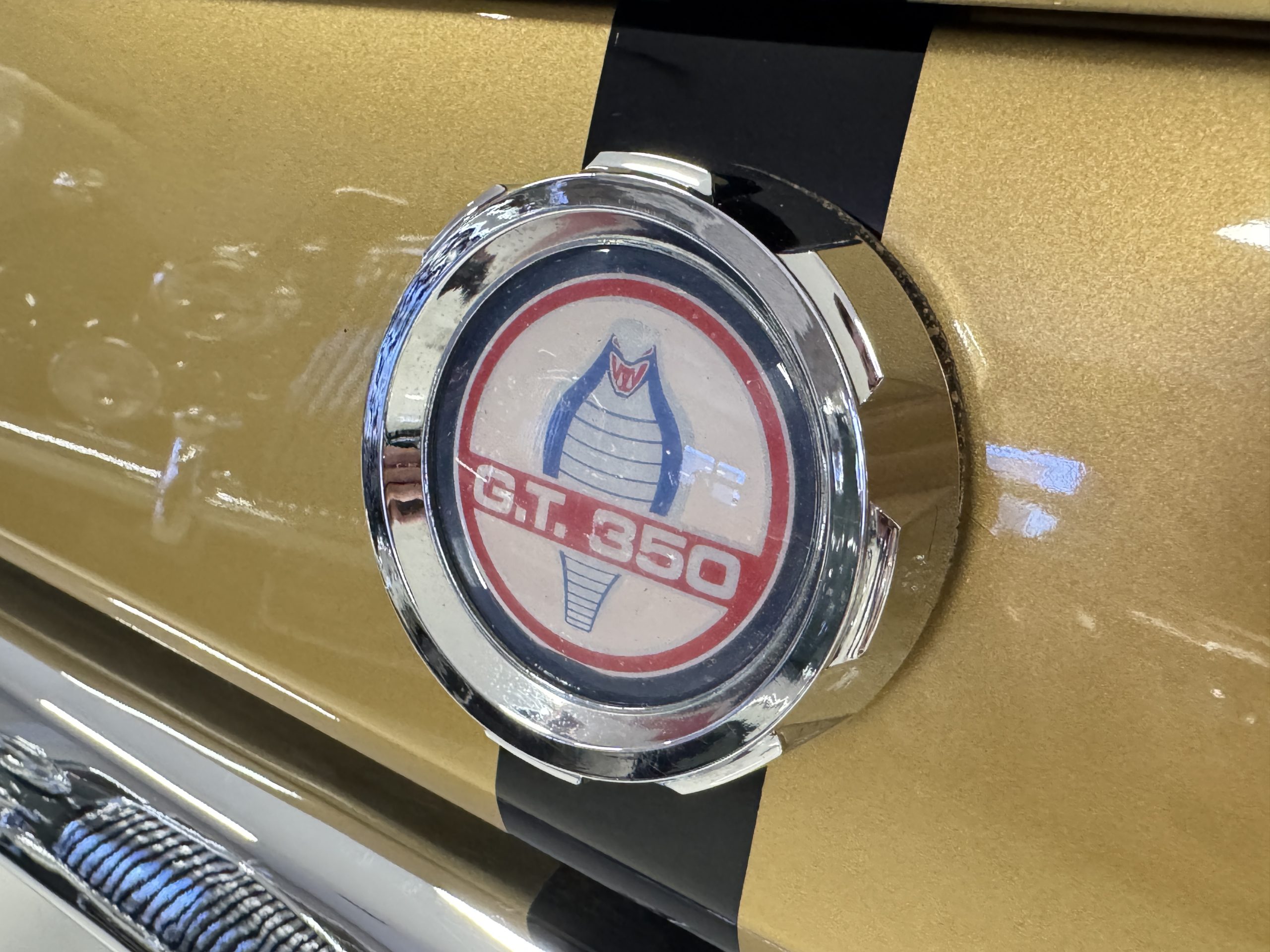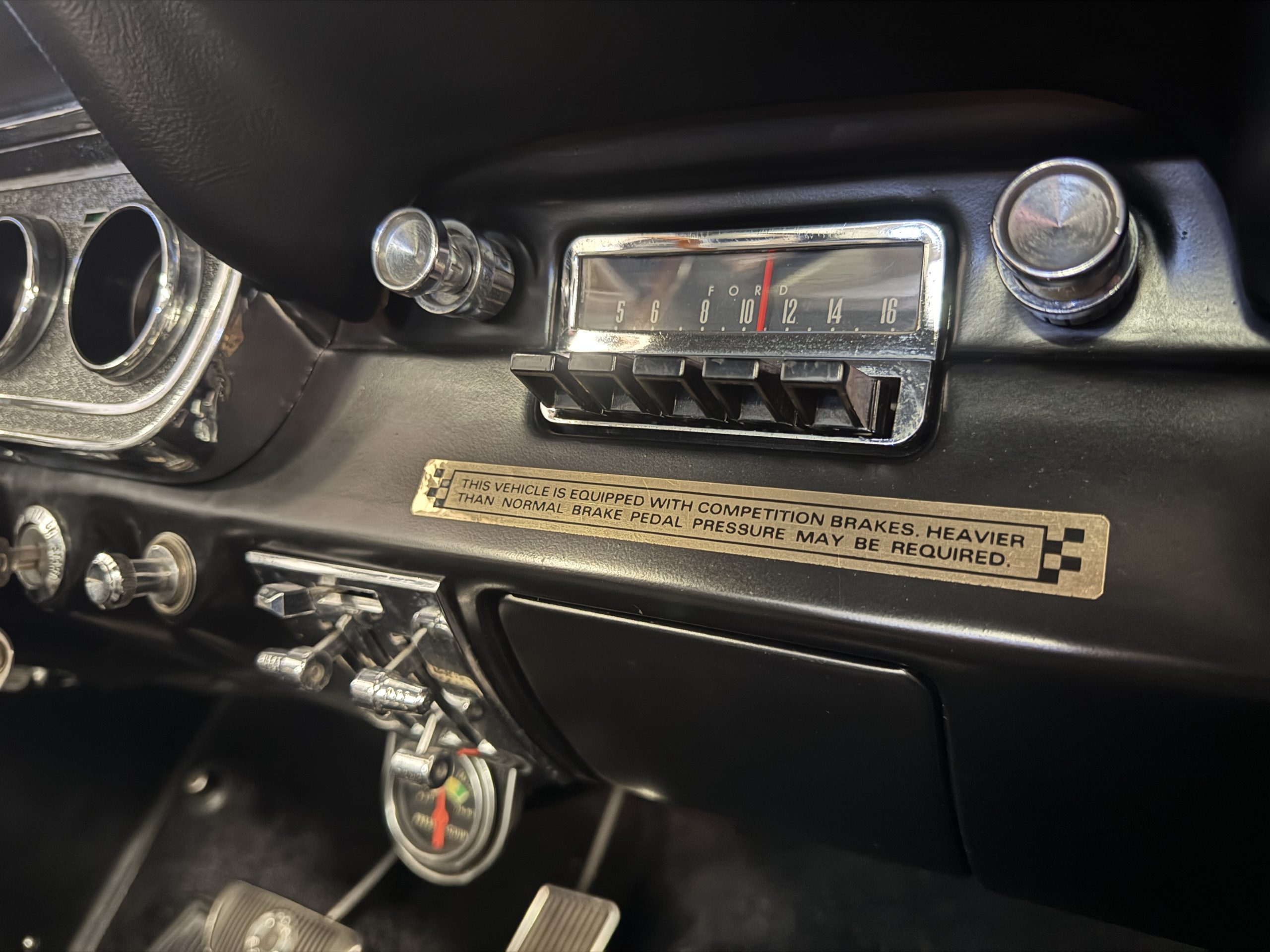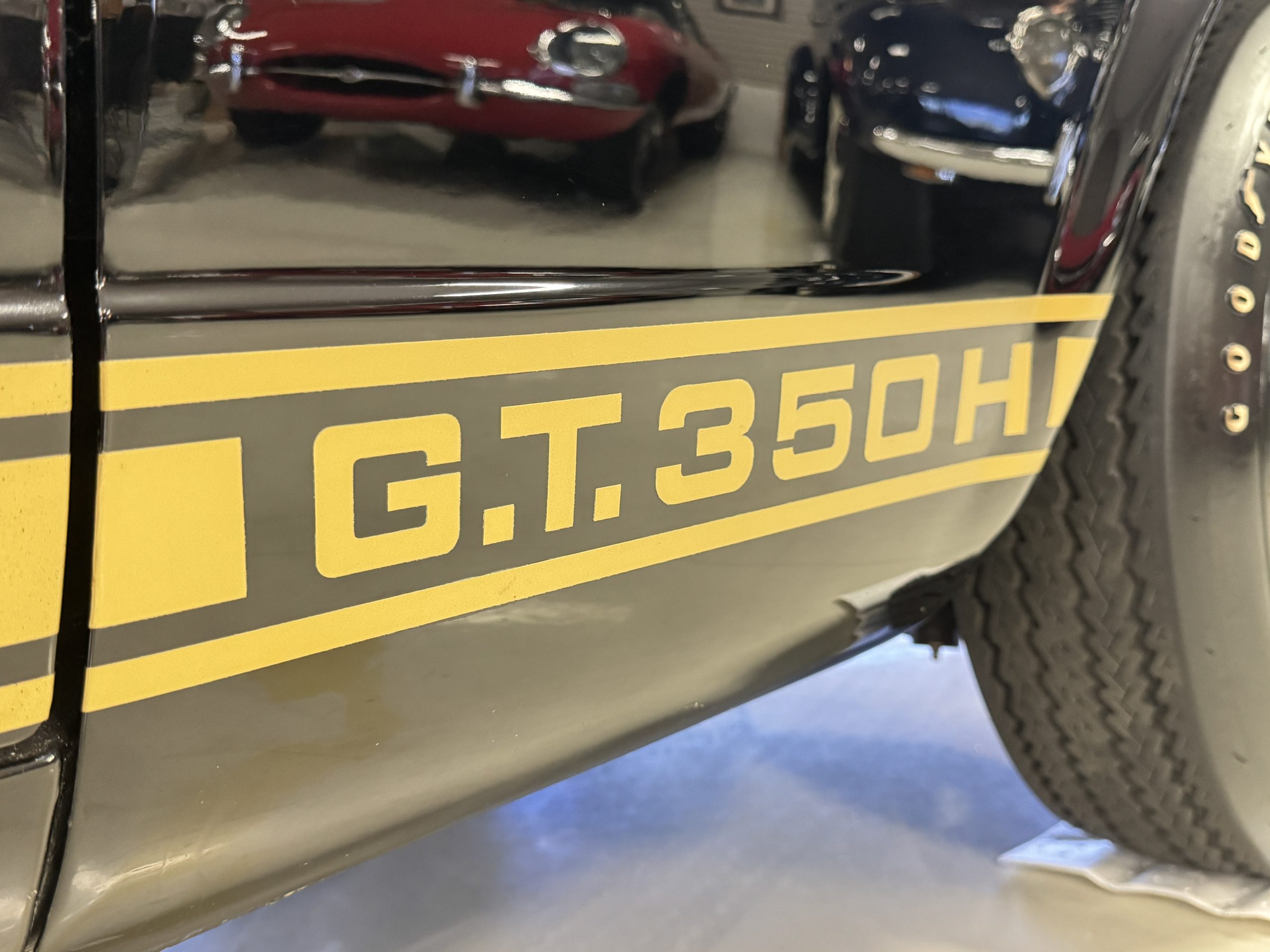 Chrome-plated 14″ Magnum 500 wheels are mounted with Goodyear Blue Streak tires. GT350s were factory-equipped with Kelsey-Hayes front disc brakes as well as larger rear drums than standard Mustangs.