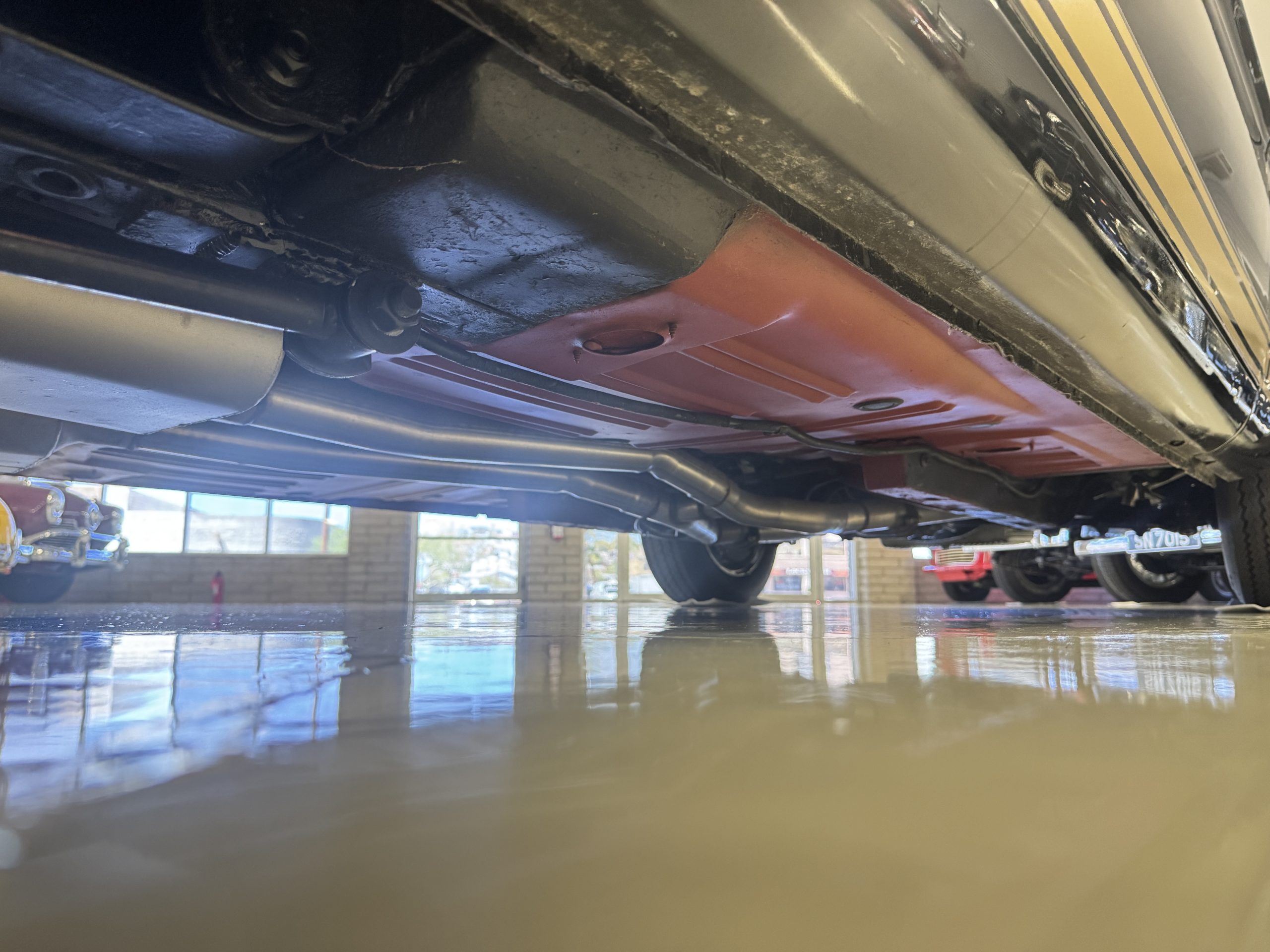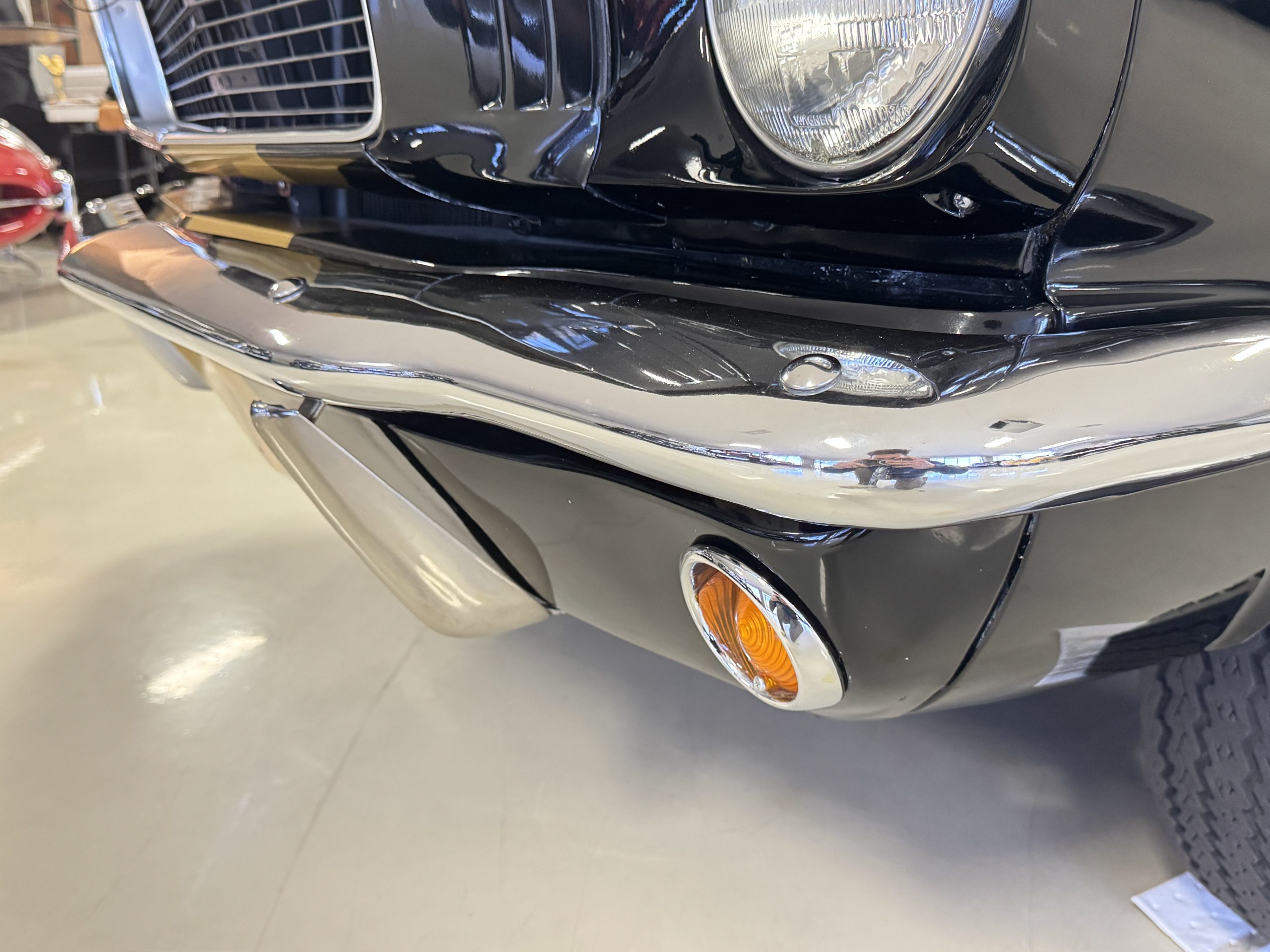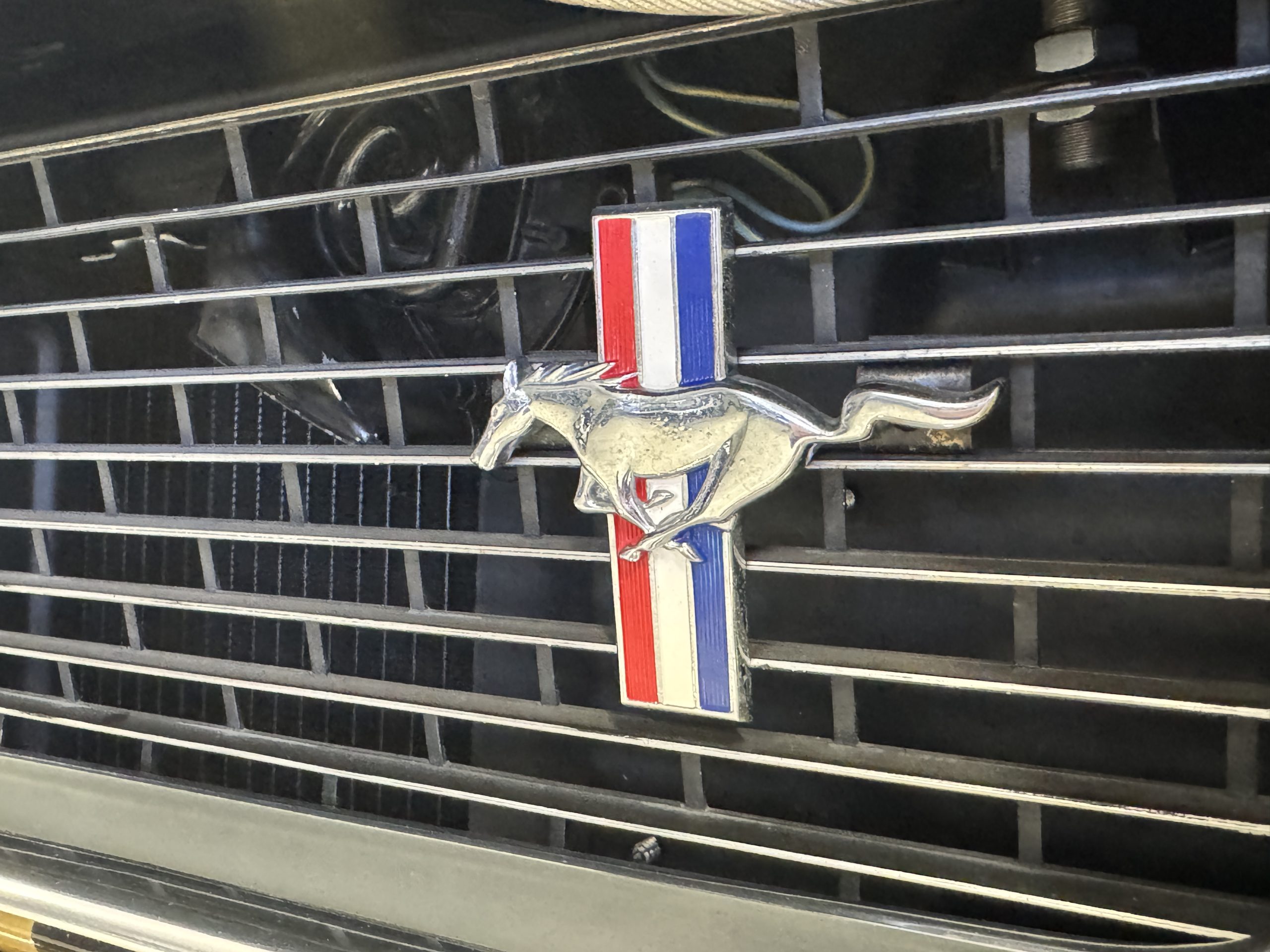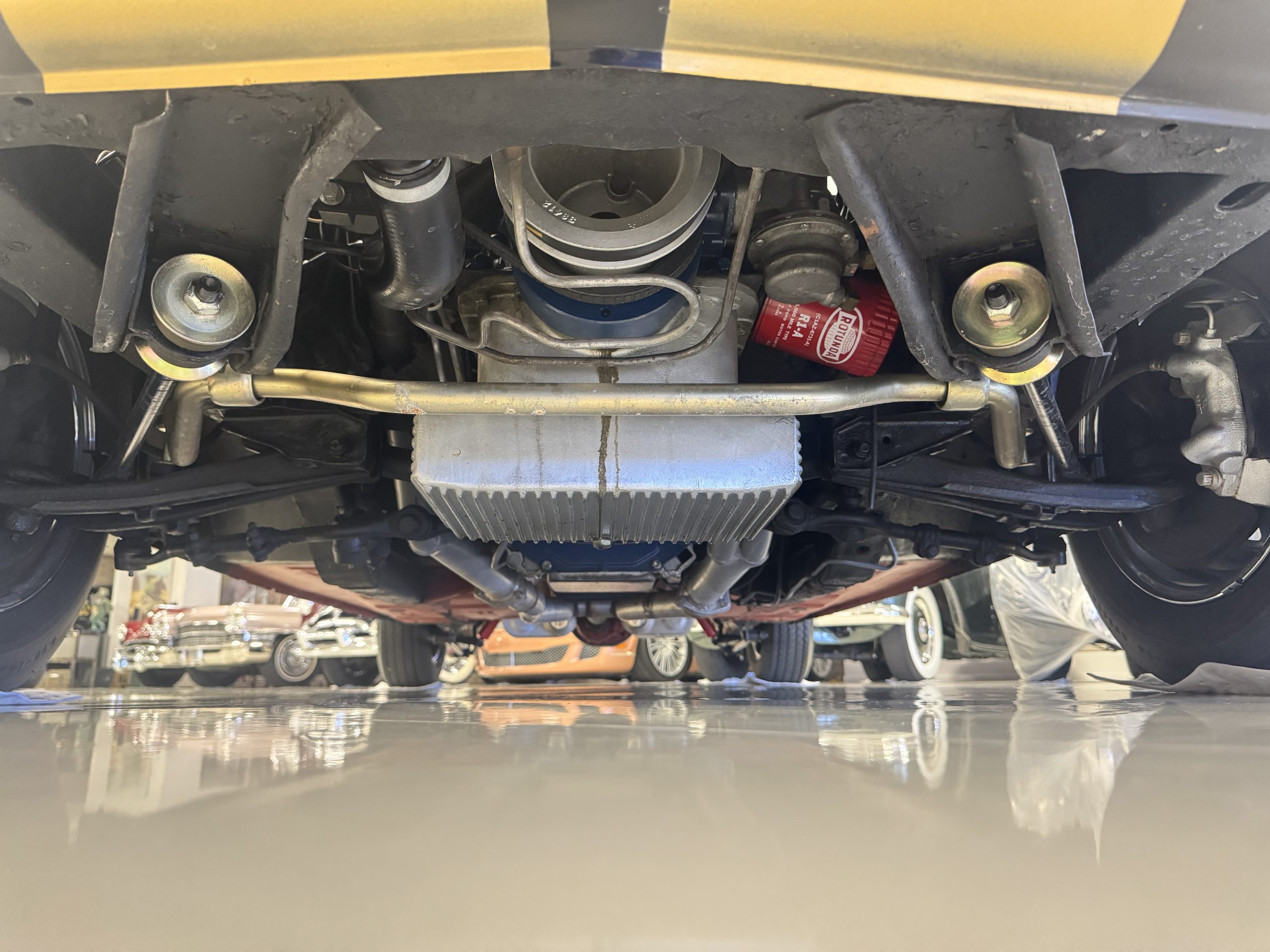 Chrome-plated 14″ Magnum 500 wheels are mounted with Goodyear Blue Streak tires. GT350s were factory-equipped with Kelsey-Hayes front disc brakes as well as larger rear drums than standard Mustangs.