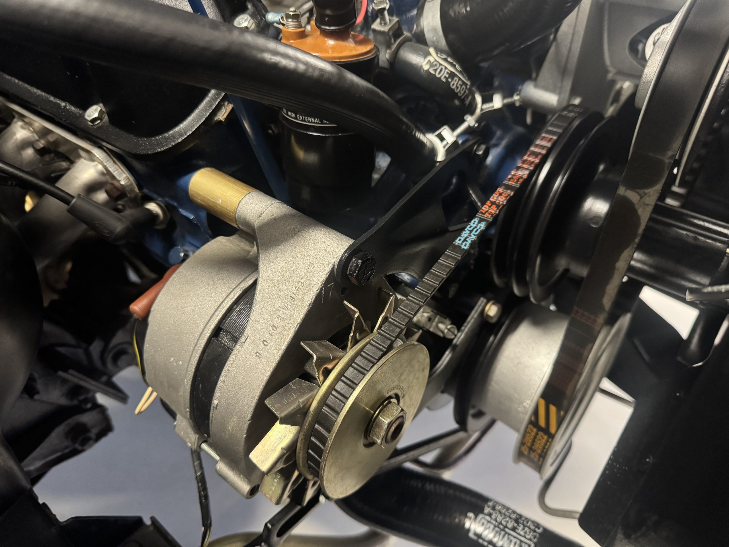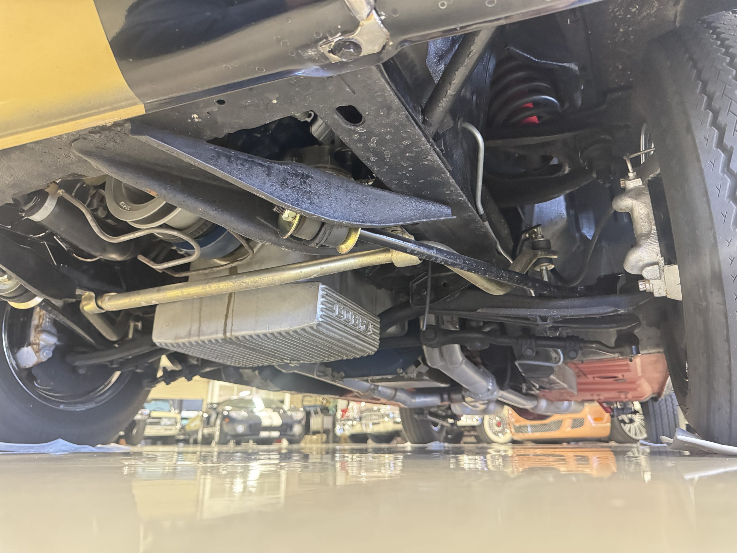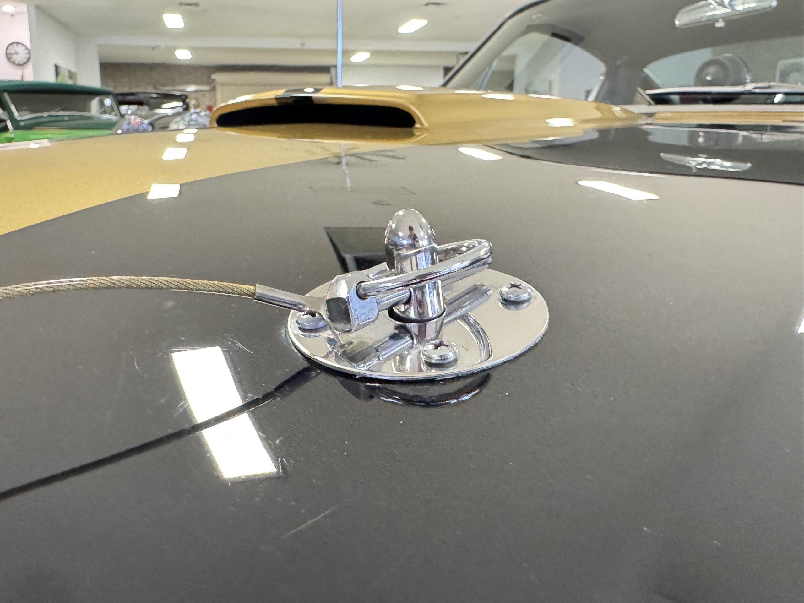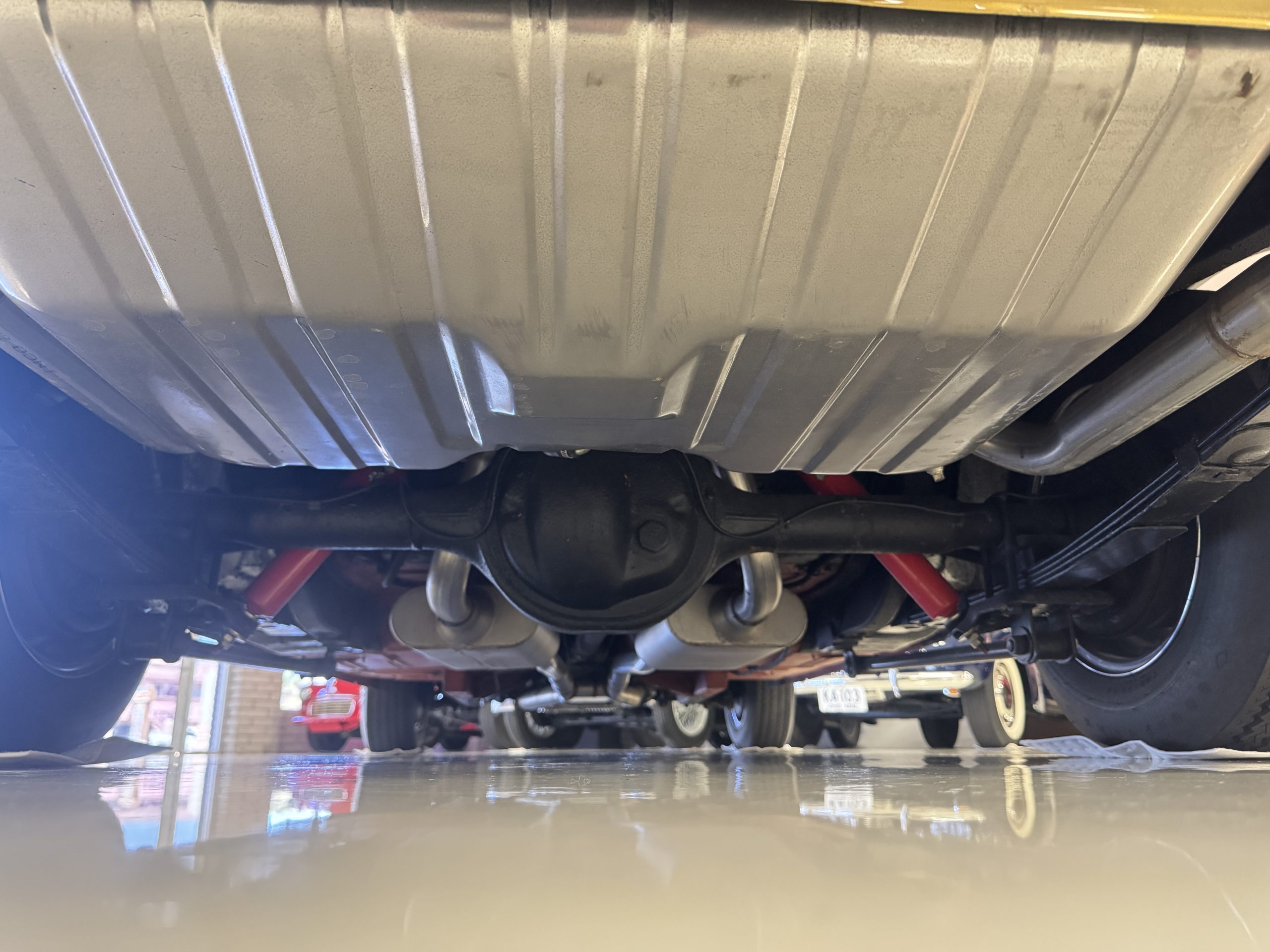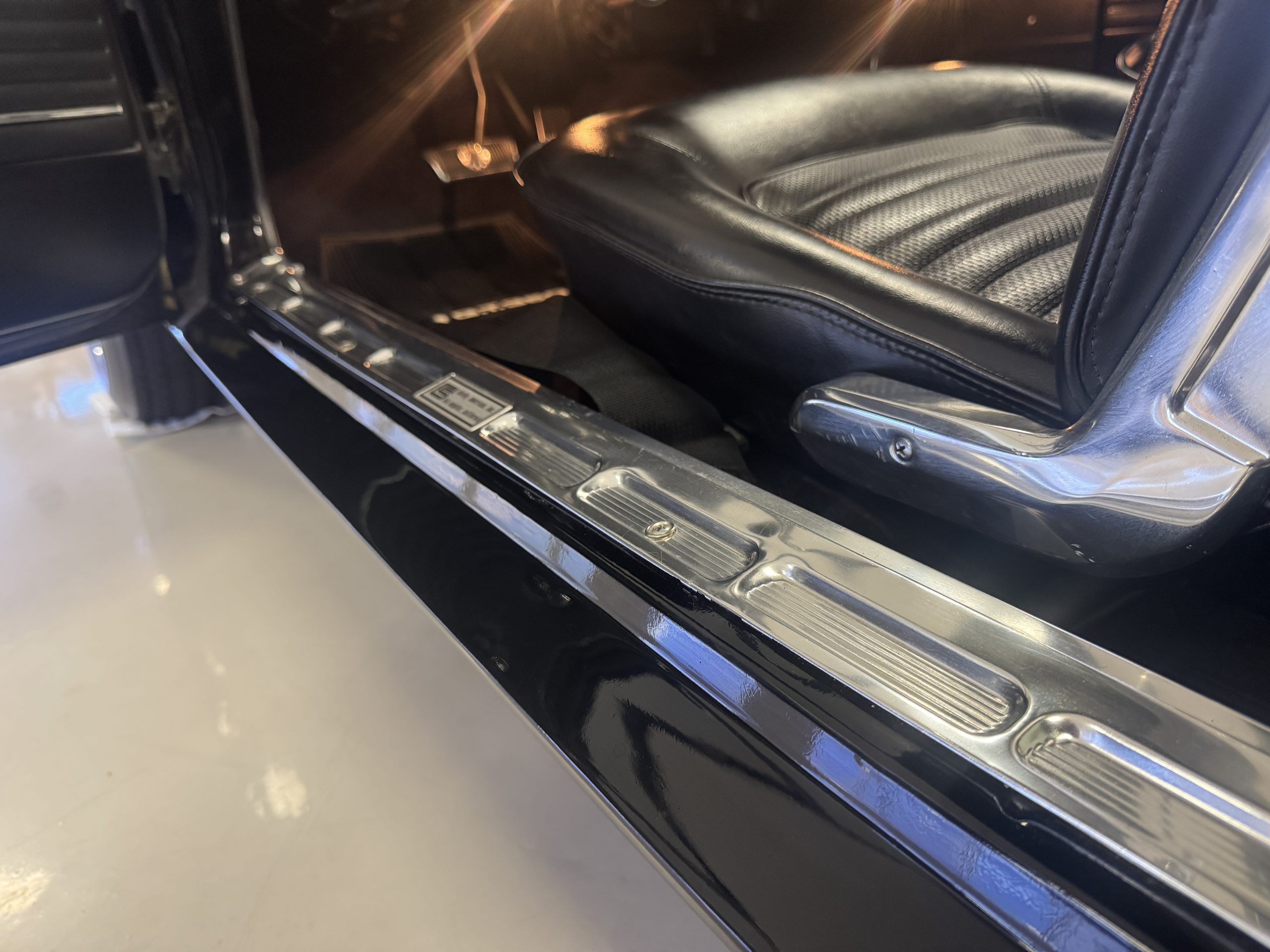 Chrome-plated 14″ Magnum 500 wheels are mounted with Goodyear Blue Streak tires. GT350s were factory-equipped with Kelsey-Hayes front disc brakes as well as larger rear drums than standard Mustangs.